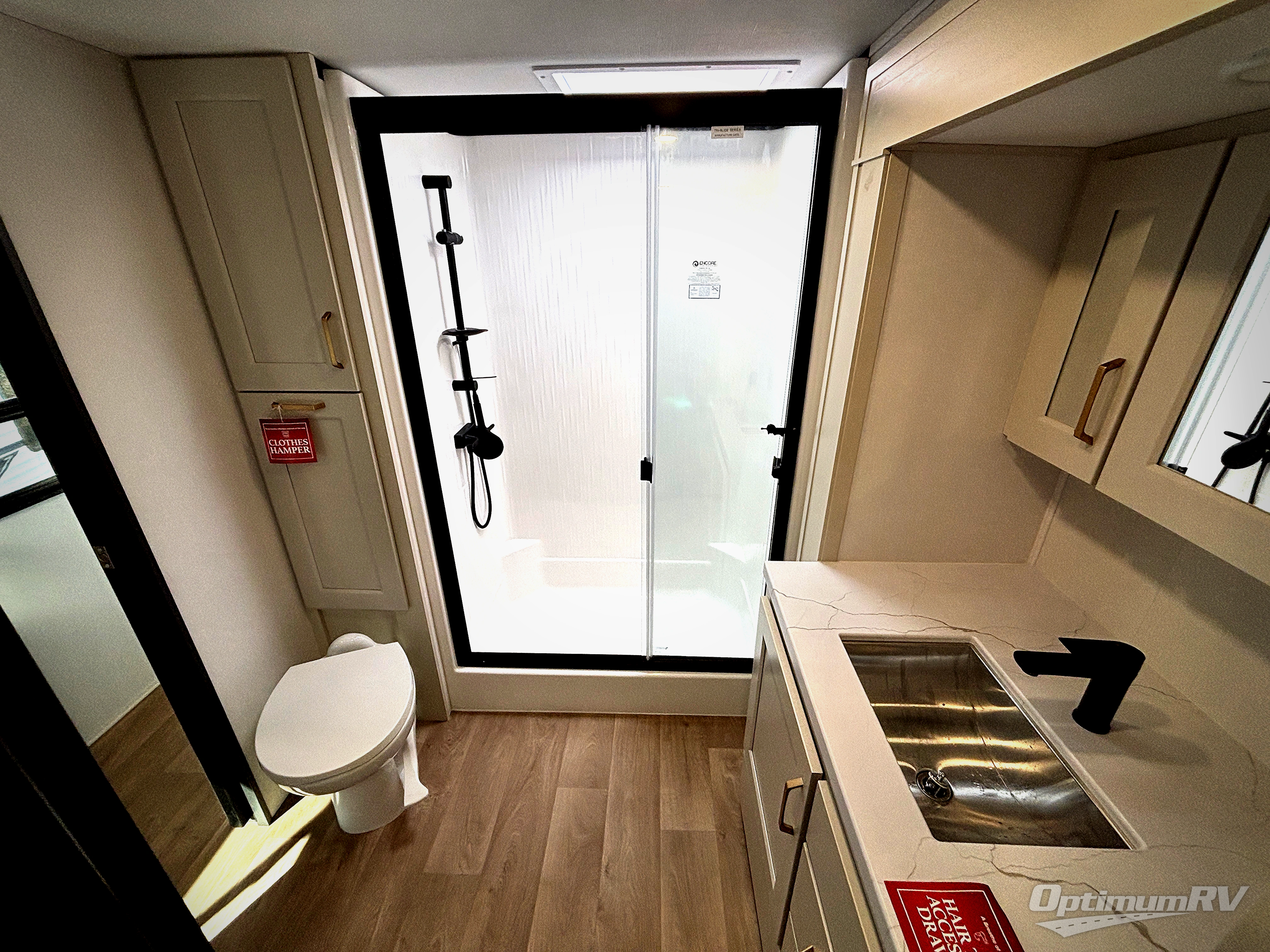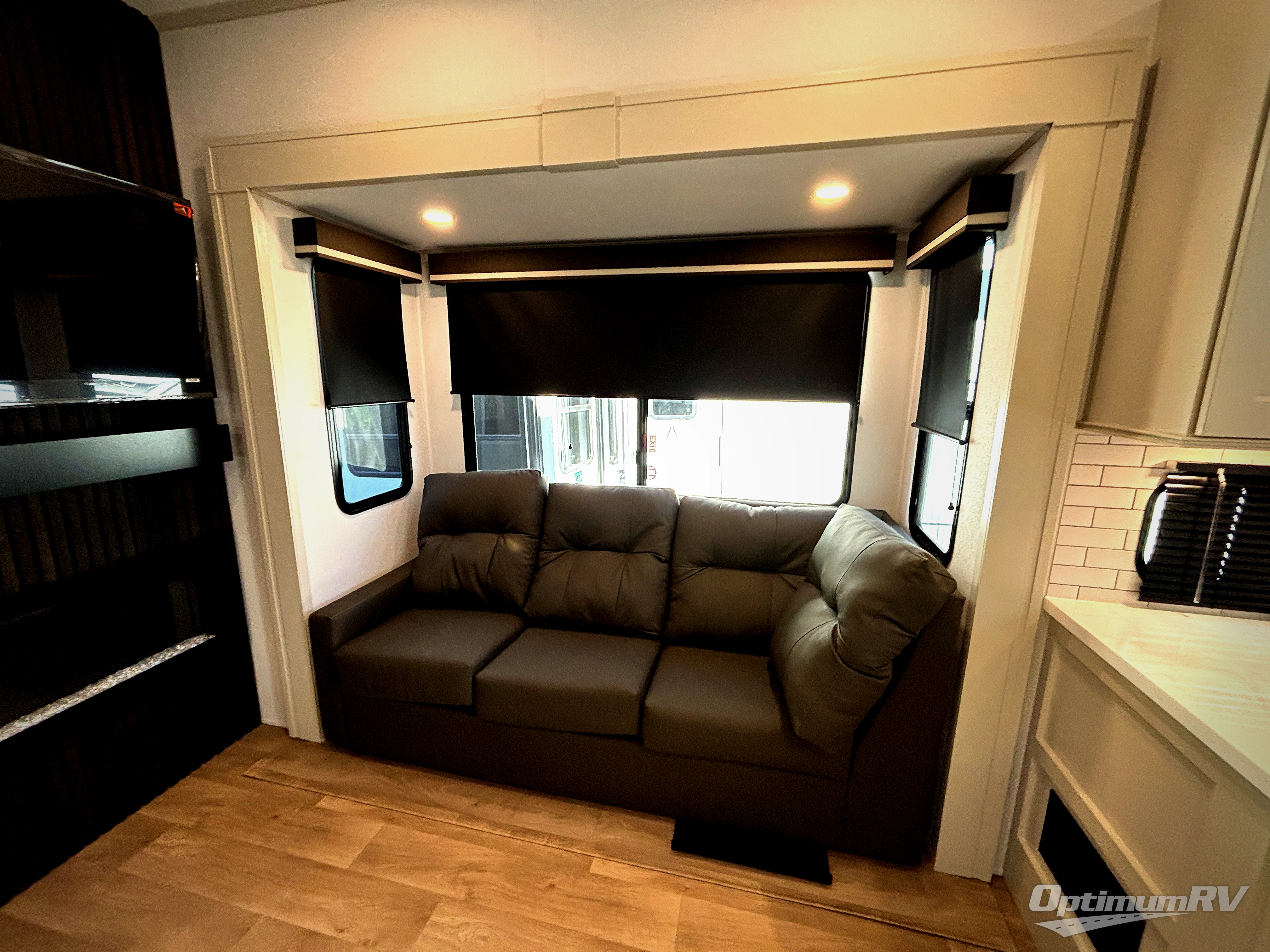 Grab the whole gang and head out in this fifth wheel featuring two private bedrooms, two full baths, and quad slides for even more space in this widebody layout. The living area featuring dual opposing slides offers space to dine and relax including an L-shaped sofa with recliners opposite the entertainment center and fireplace. You'll also love the full kitchen with ample counter space, a spice rack above the microwave, a pull-out pet dish, and more convenient features. The front master bedroom includes a queen bed with an optional king bed, a private entrance into the dual entry bath, plus a slide out with the wardrobe and bath sink. And your guests can take the second master bedroom with a folding queen bed slide, washer and dryer prep, a full rear bath, and even a loft above for more sleeping space!