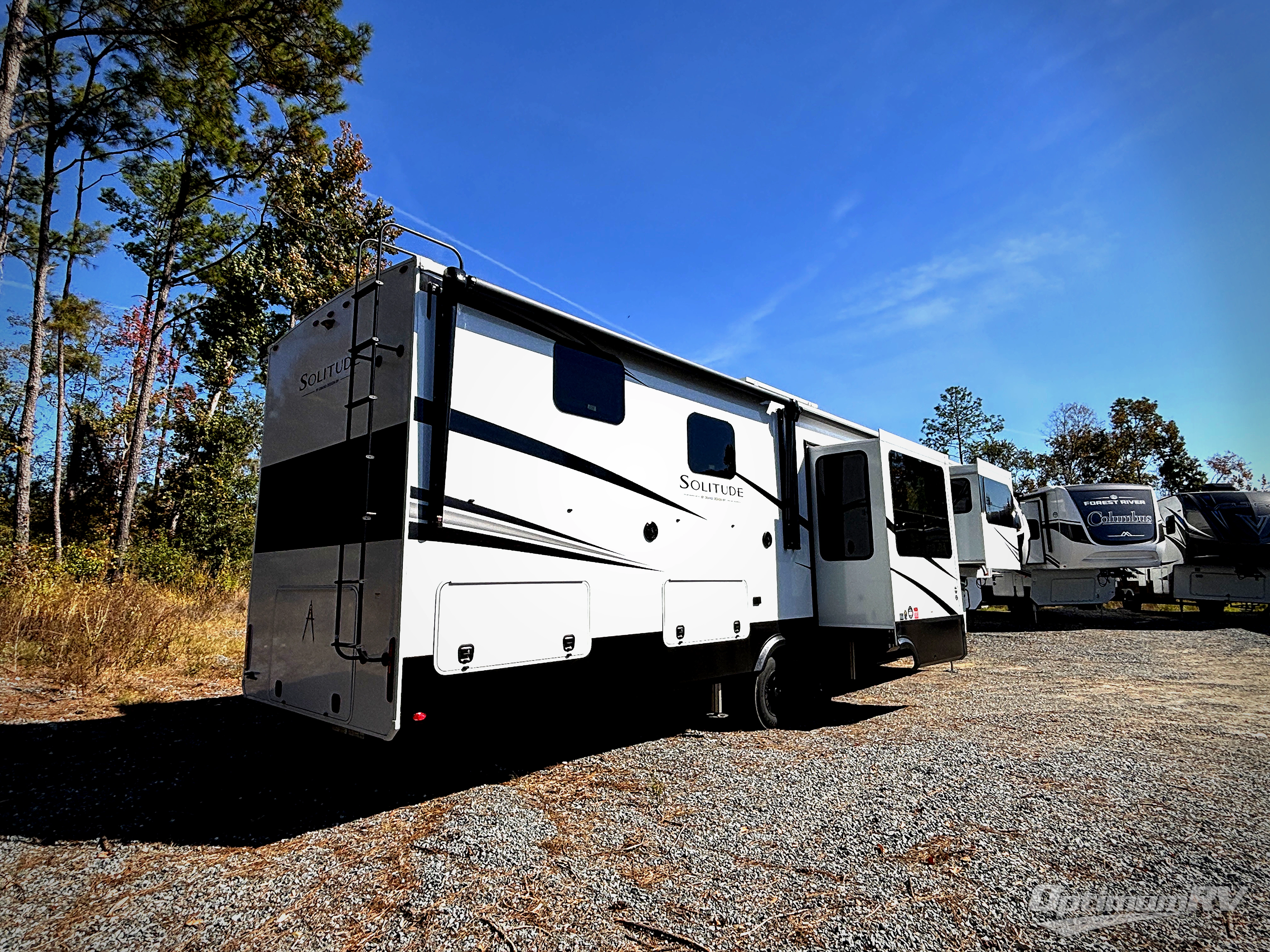 Each Solitude fifth wheel by Grand Design features a 101" wide-body construction, heavy duty 8,000 lb. axles, frameless tinted windows, and high-gloss gel coat sidewalls. You can camp year around thanks to the Weather-Tek Package that includes a 35K BTU high-capacity furnace, an all-in-one enclosed and heated utility center, and a fully enclosed underbelly with heated tanks and storage. Inside, you'll love the premium roller shades, hardwood cabinet doors, solid surface countertops, plus residential finishes throughout to make you truly feel at home. Each model also includes a MORryde CRE3000 suspension system, self adjusting brakes, and a MORryde pin box that will provide smooth towing from home to campground. Affordable luxury is possible with the Solitude fifth wheels; choose yours today!