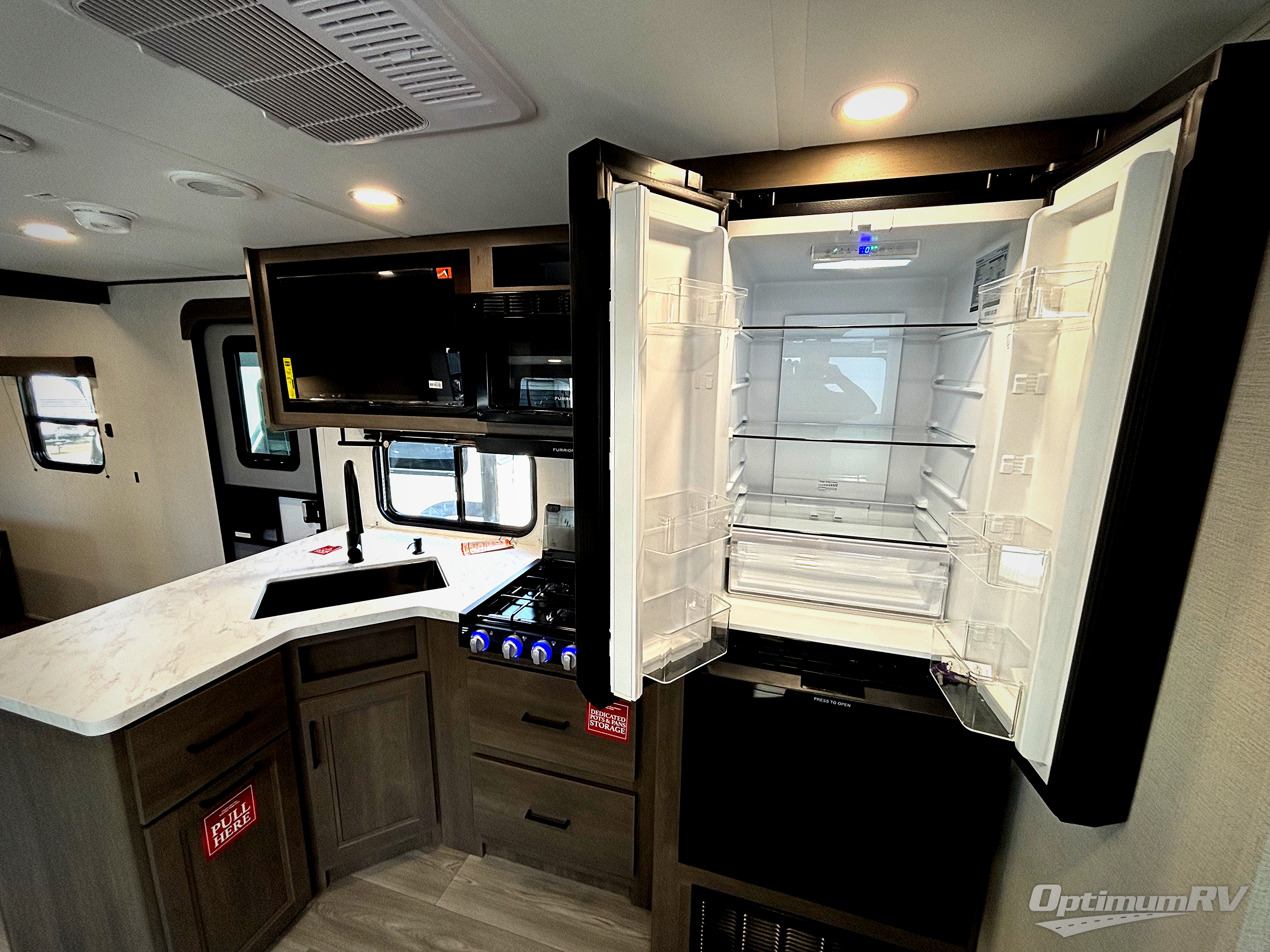 If you're looking for a travel trailer that can house your whole gang, this unit is the one! The rear private bunkhouse can sleep up to five since there is a sleeper sofa and three bunks, plus there are storage drawers for your guests' things. A front private bedroom will be perfect for the owners with a queen bed, storage space, and a convenient laundry chute! Whether you cook outside on the exterior griddle or inside on the three burner range, you'll be able to make your best meals. There is also a 12V French door refrigerator with a glass front and bottom freezer and a convection microwave/combo air fryer for easy meals! A U-shaped dinette and 60" sleeper sofa within the living room slide provides even more seating and sleeping space, or you can choose the optional theater seat in place of the sofa if you're not needing the extra sleeping space!