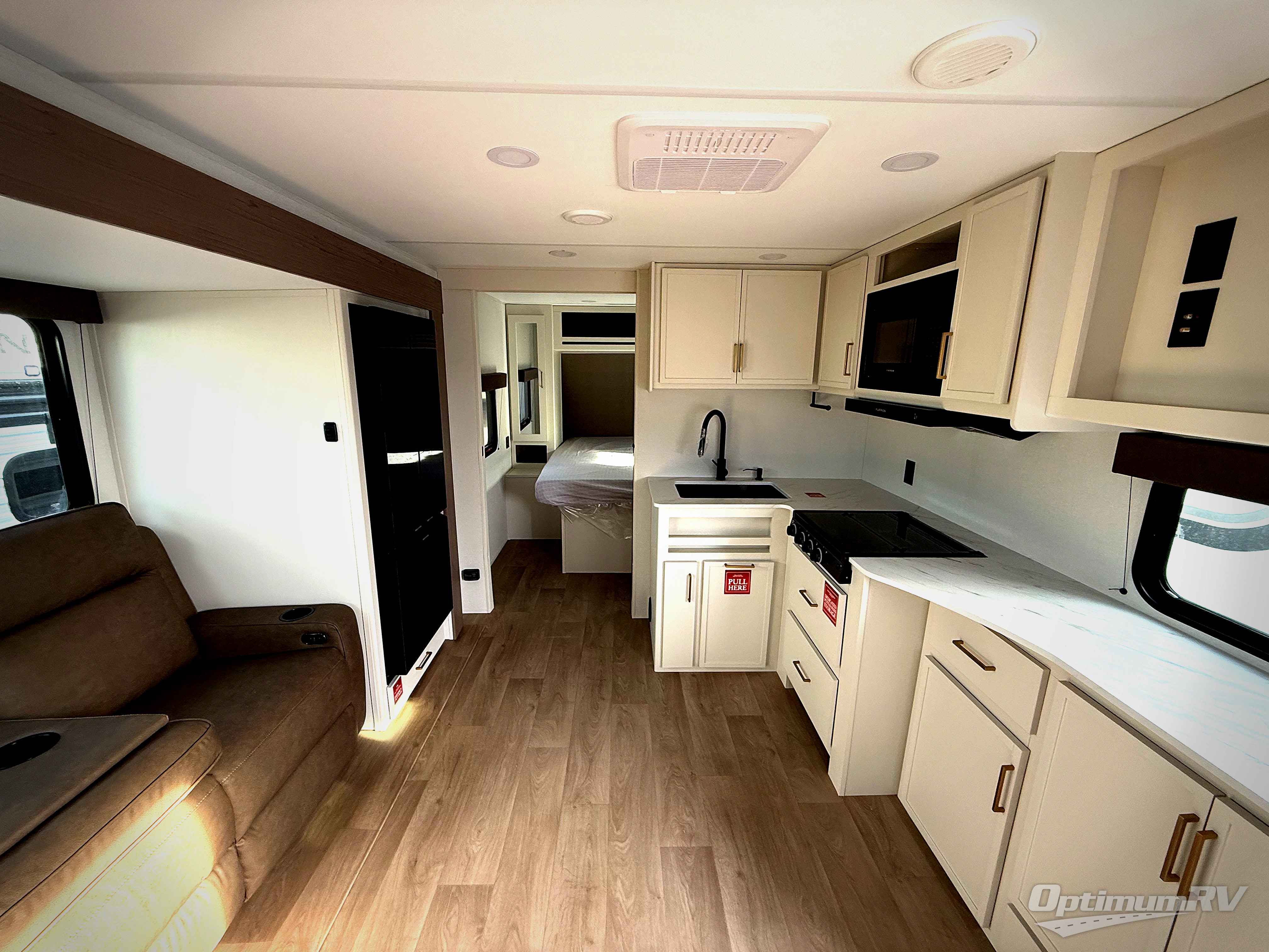 Pack your bags and head for the campground in this spacious travel trailer! Once you arrive, you can unload the pass-thru storage, then make lunch on the exterior griddle with a 1.7 cu. ft. exterior refrigerator. The U-shaped dinette slide will provide a place to dine if you decide not to stay outside under the 16' power awning. Optional theater seats can be chosen in place of the dinette for even more comfort! You'll sleep soundly on the queen bed in the front bedroom, and the full rear bath lets you freshen up each day.