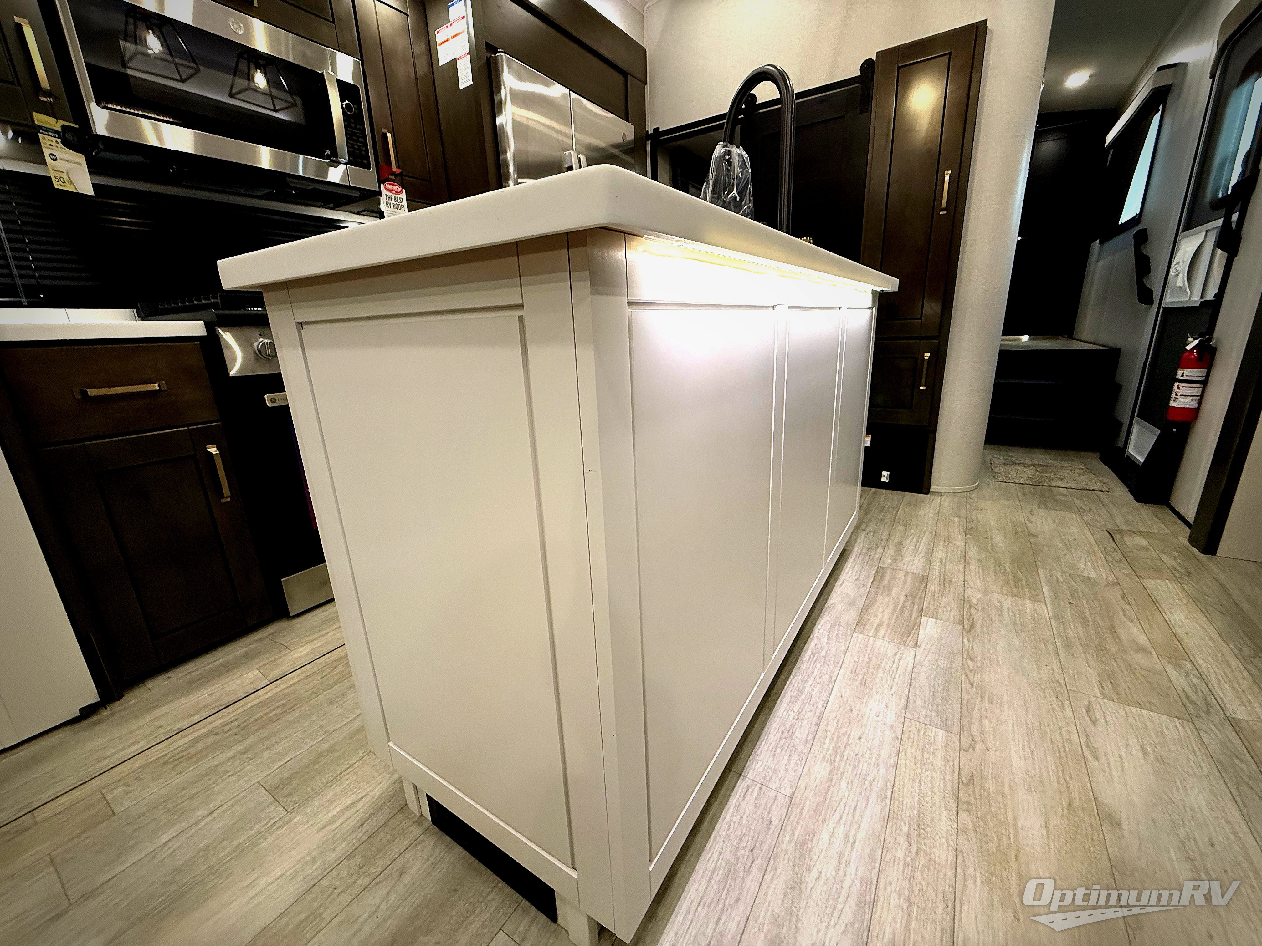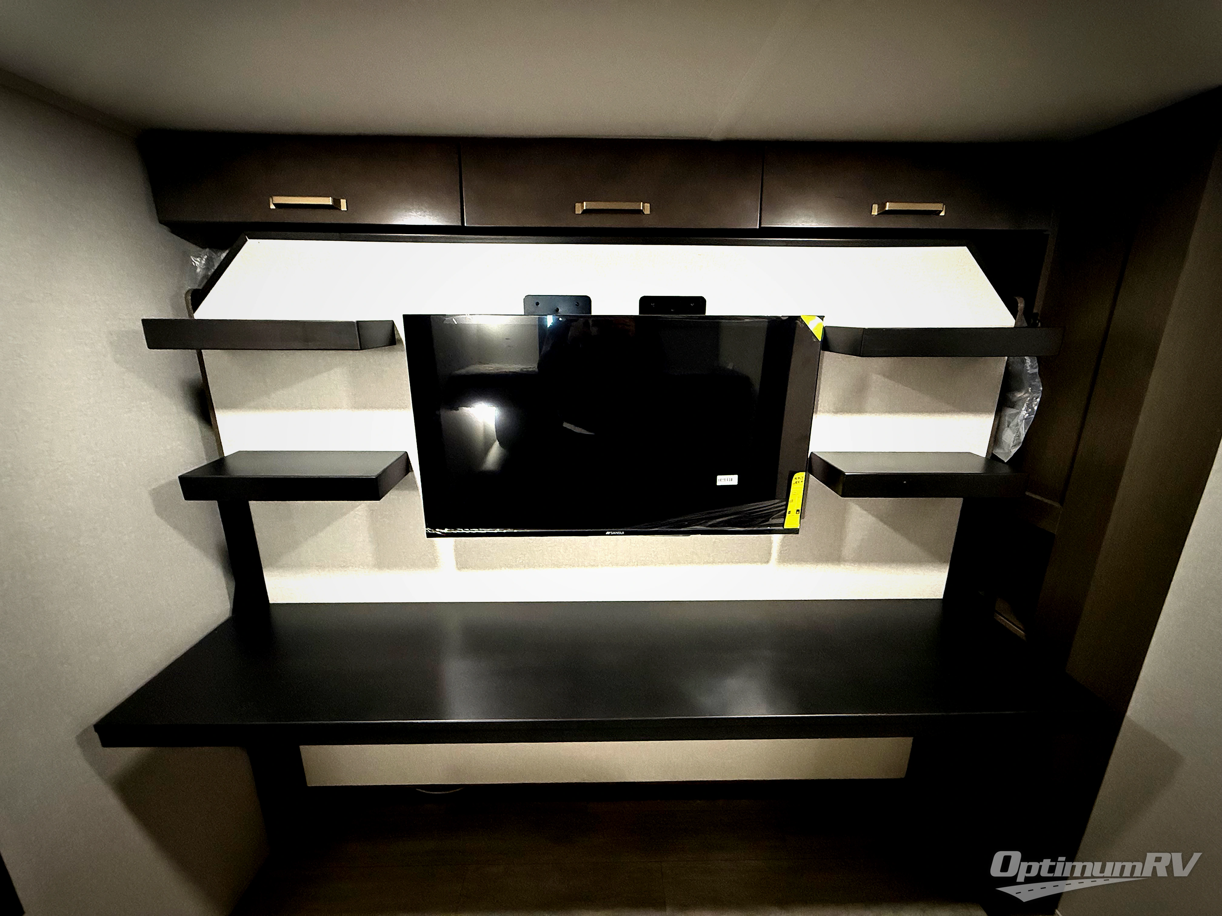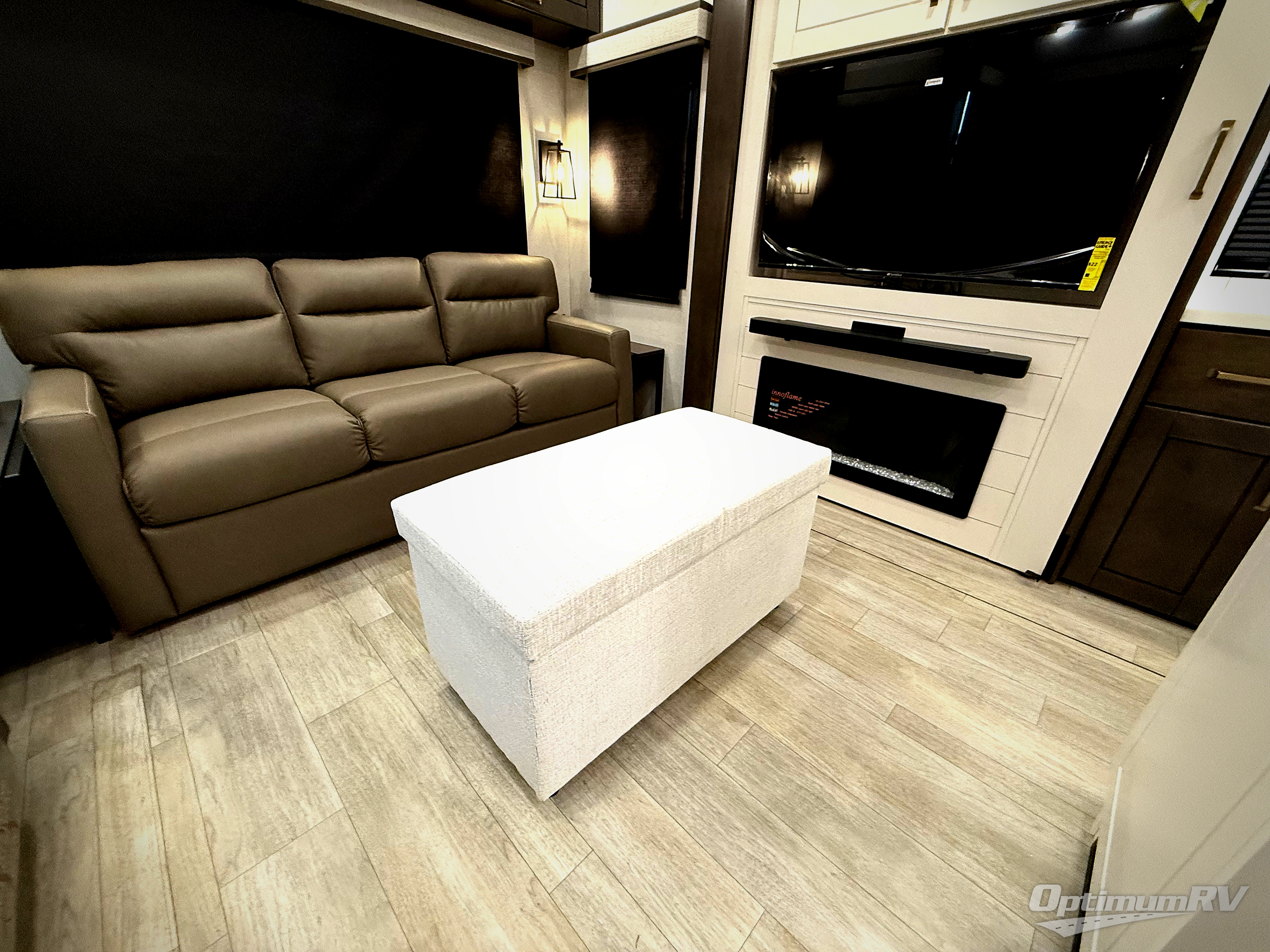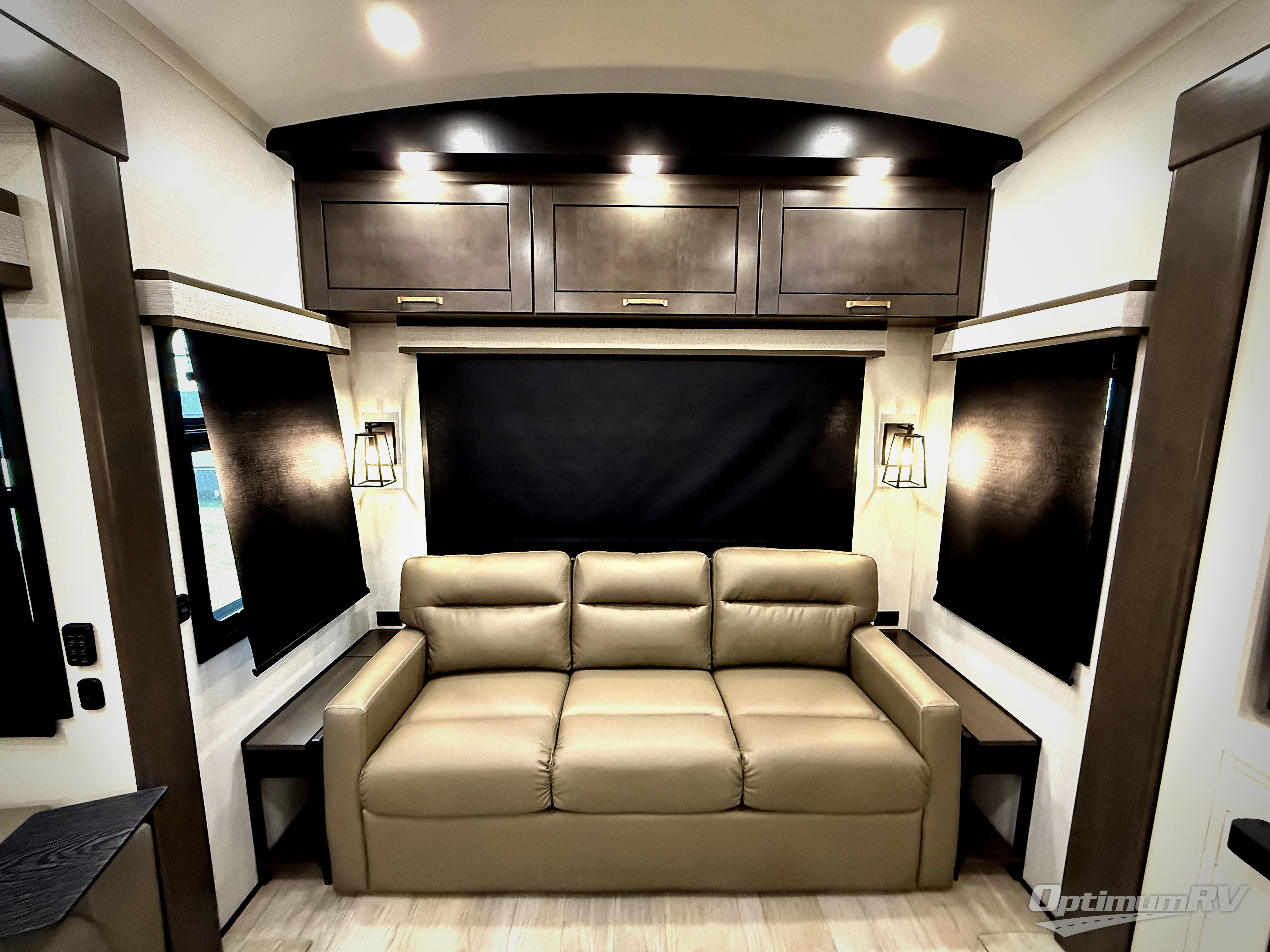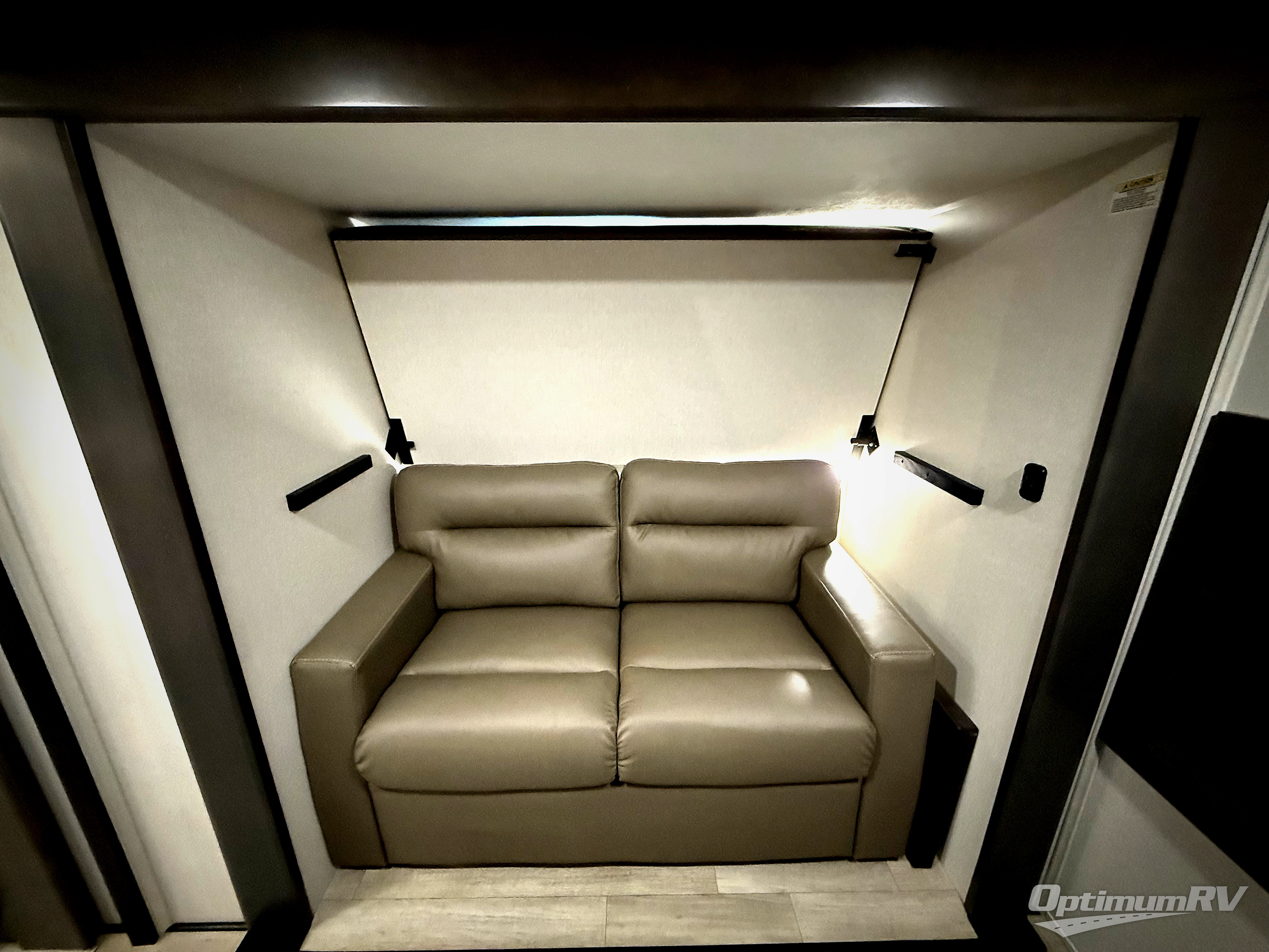 At the front of the unit, the private bedroom offers a retreat with a spacious 72" x 80" king bed, a wardrobe with drawers and a built-in hamper, and a dresser with a TV above, providing ample storage for clothing and essentials. Down the hall, the full bathroom features a 36" x 48" shower with a comfortable seat for added accessibility and relaxation. At the center of the unit, the versatile den serves perfectly as both an office and an additional sleeping area. It includes a 60" tri-fold sofa with a flip-up bunk above, a removable table for work or leisure, and across the room, a 60" x 74" Murphy bed complemented by a desk, shelves, and even a loft above, ideal for accommodating guests or creating a productive workspace on the road. Toward the rear, the open concept living area expands with dual opposing slides for a spacious and inviting atmosphere. One slide features the fully equipped kitchen with a hidden pantry, shelving for dry goods, a convection microwave with a built-in air fryer, a 21-cu. ft. refrigerator, and a 24" range. At the center, the kitchen island includes a sink and a pull-out cutting board, making meal prep both easy and enjoyable. Opposite the kitchen, you’ll find a theater seat and a roll-top dining table perfect for lounging or dining, while at the very back, a 78" sofa provides extra seating or converts into additional sleeping space when needed.