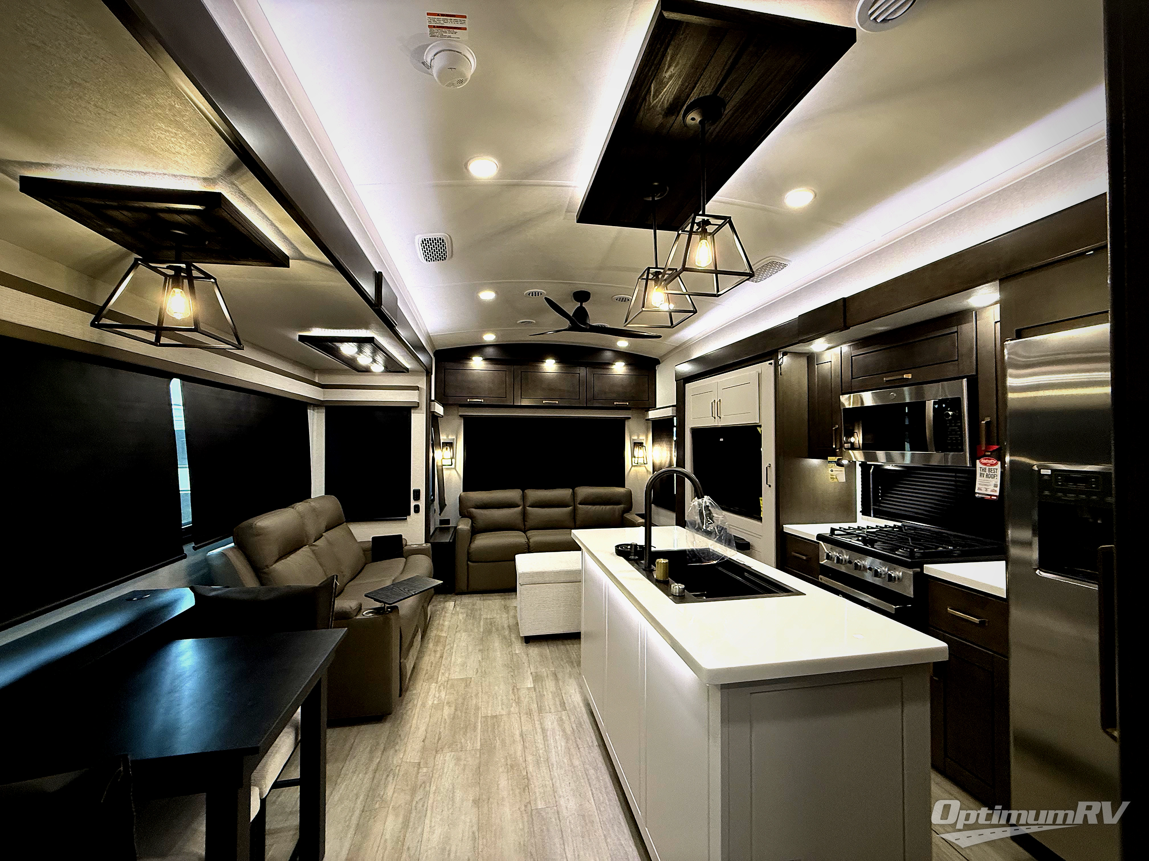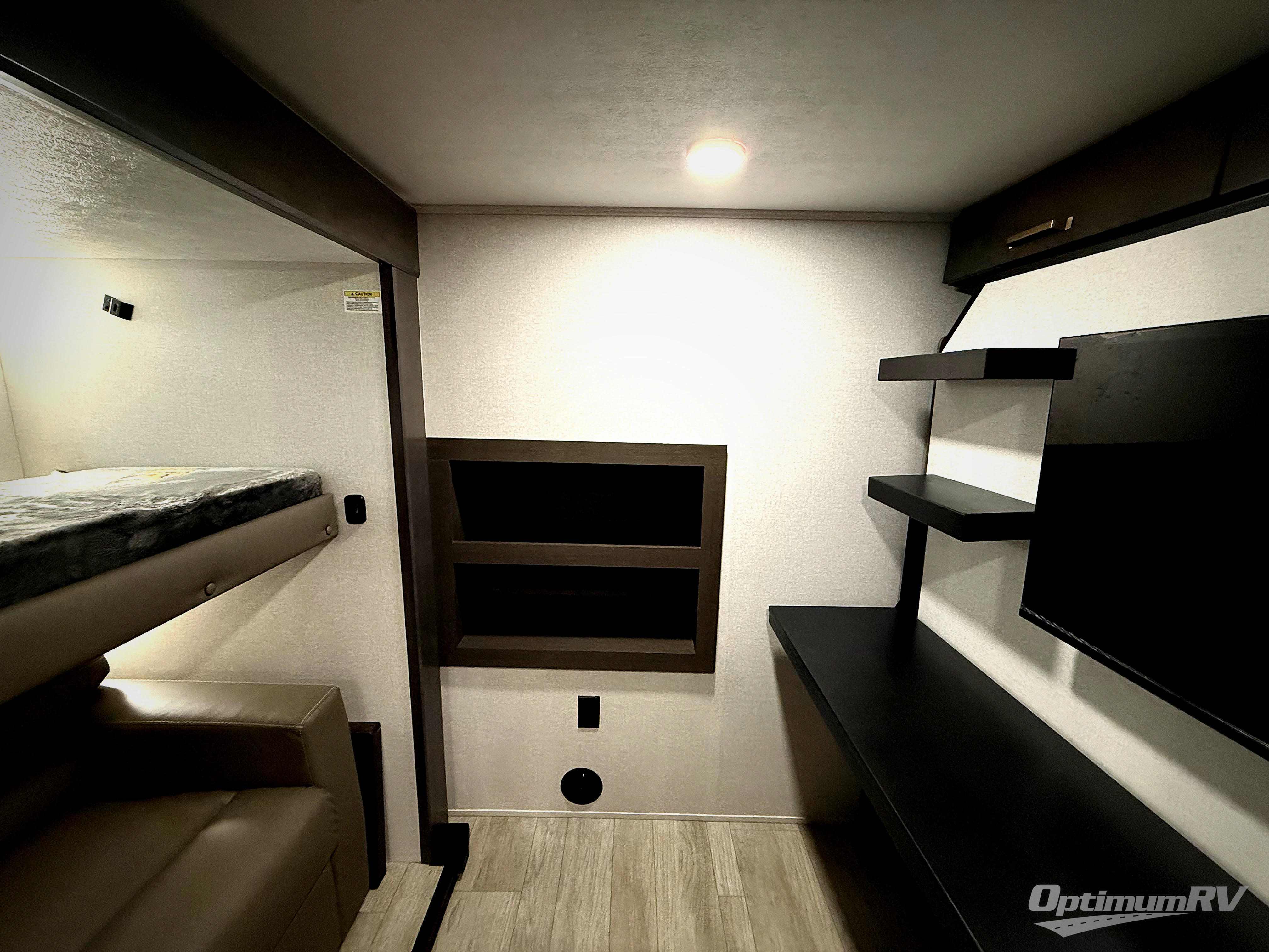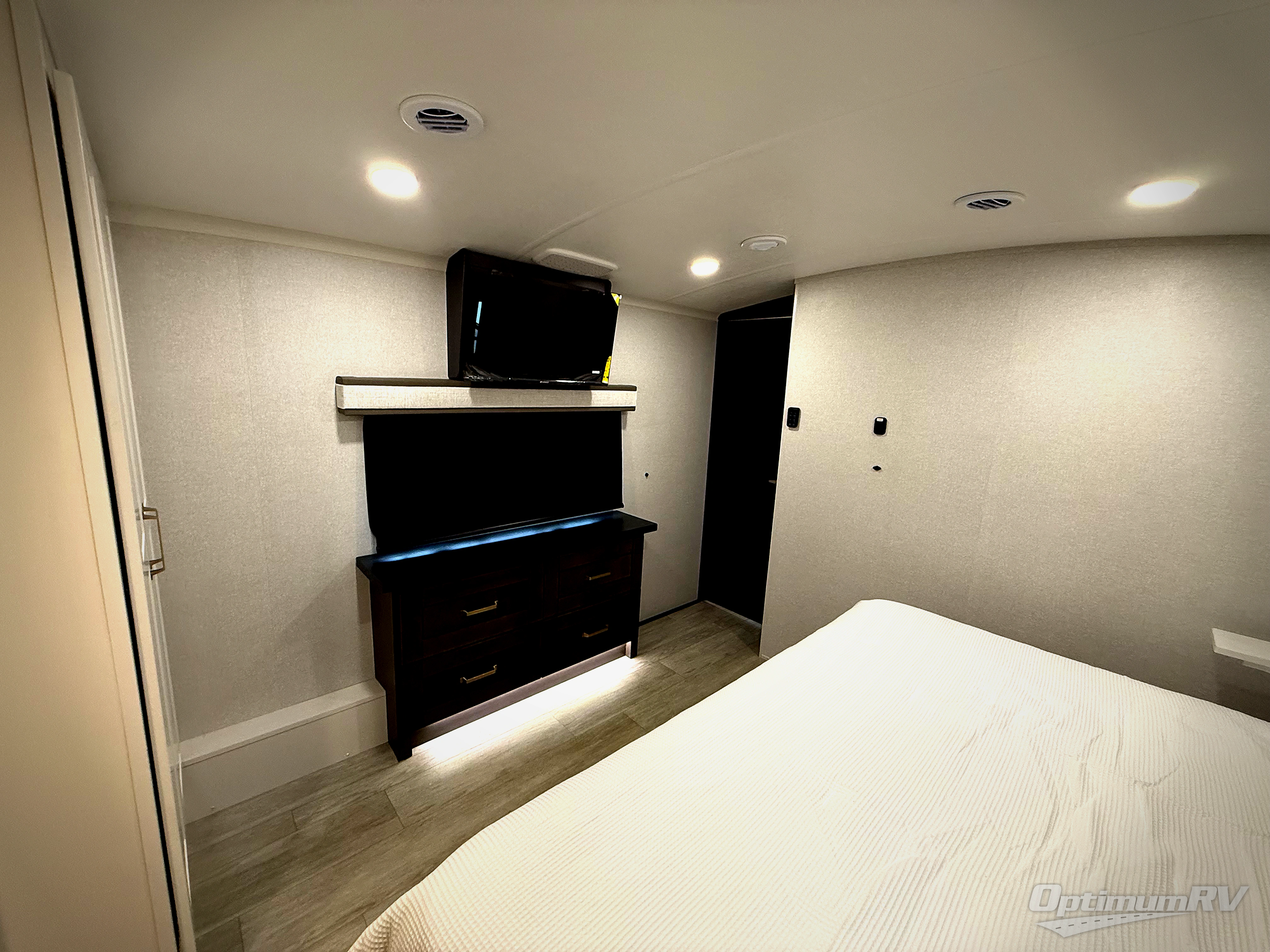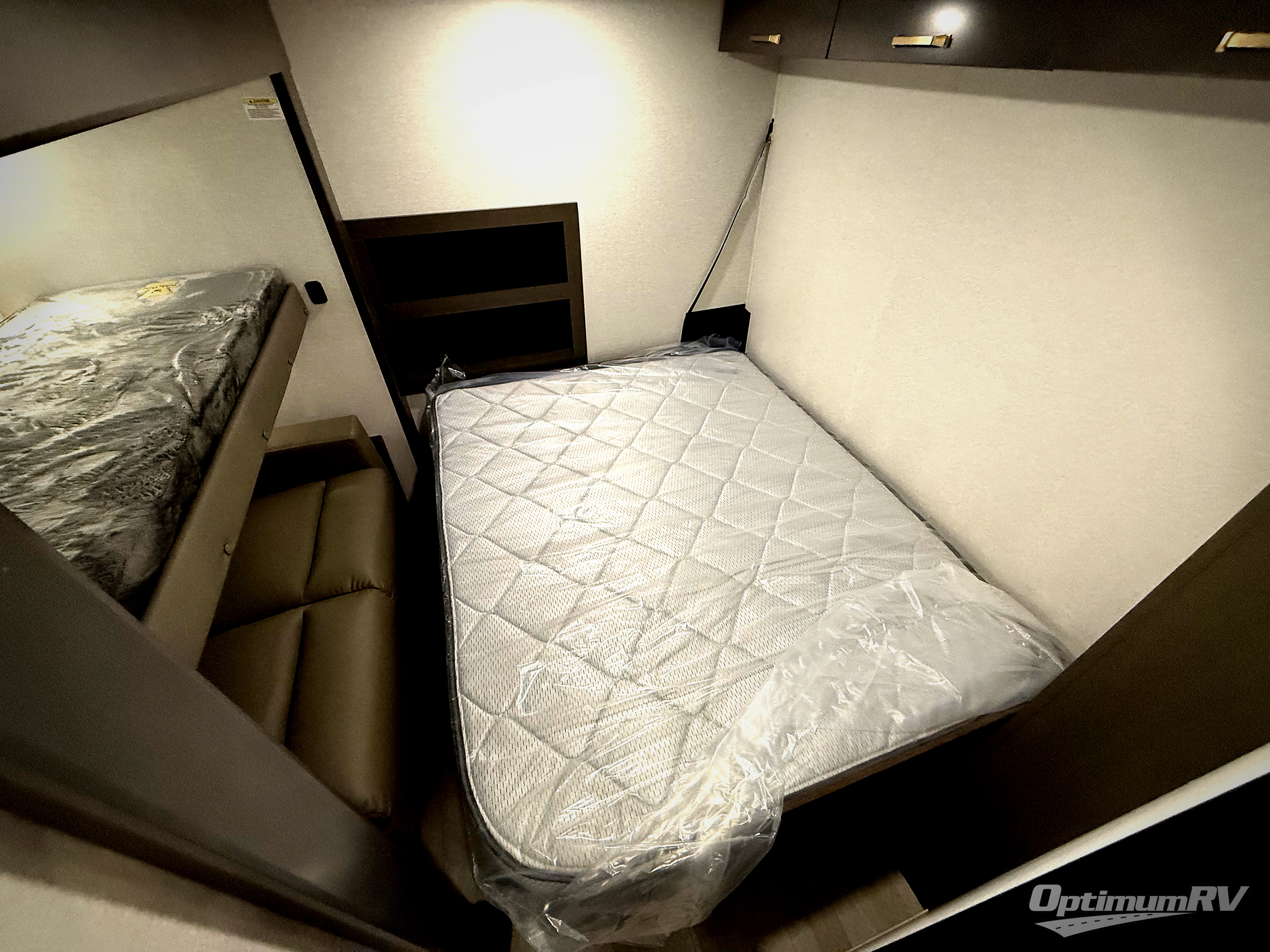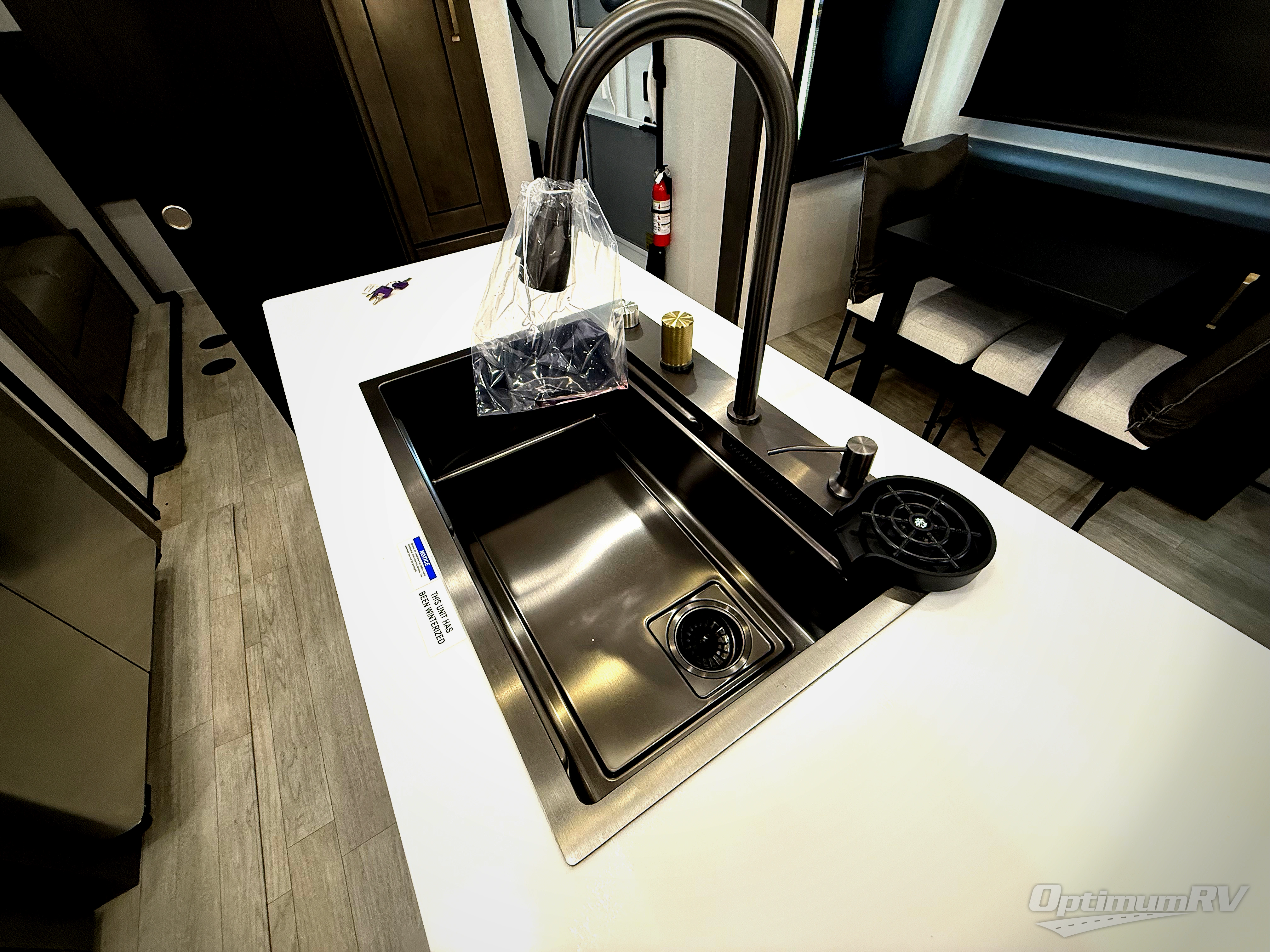 At the front of the unit, the private bedroom offers a retreat with a spacious 72" x 80" king bed, a wardrobe with drawers and a built-in hamper, and a dresser with a TV above, providing ample storage for clothing and essentials. Down the hall, the full bathroom features a 36" x 48" shower with a comfortable seat for added accessibility and relaxation. At the center of the unit, the versatile den serves perfectly as both an office and an additional sleeping area. It includes a 60" tri-fold sofa with a flip-up bunk above, a removable table for work or leisure, and across the room, a 60" x 74" Murphy bed complemented by a desk, shelves, and even a loft above, ideal for accommodating guests or creating a productive workspace on the road. Toward the rear, the open concept living area expands with dual opposing slides for a spacious and inviting atmosphere. One slide features the fully equipped kitchen with a hidden pantry, shelving for dry goods, a convection microwave with a built-in air fryer, a 21-cu. ft. refrigerator, and a 24" range. At the center, the kitchen island includes a sink and a pull-out cutting board, making meal prep both easy and enjoyable. Opposite the kitchen, you’ll find a theater seat and a roll-top dining table perfect for lounging or dining, while at the very back, a 78" sofa provides extra seating or converts into additional sleeping space when needed.