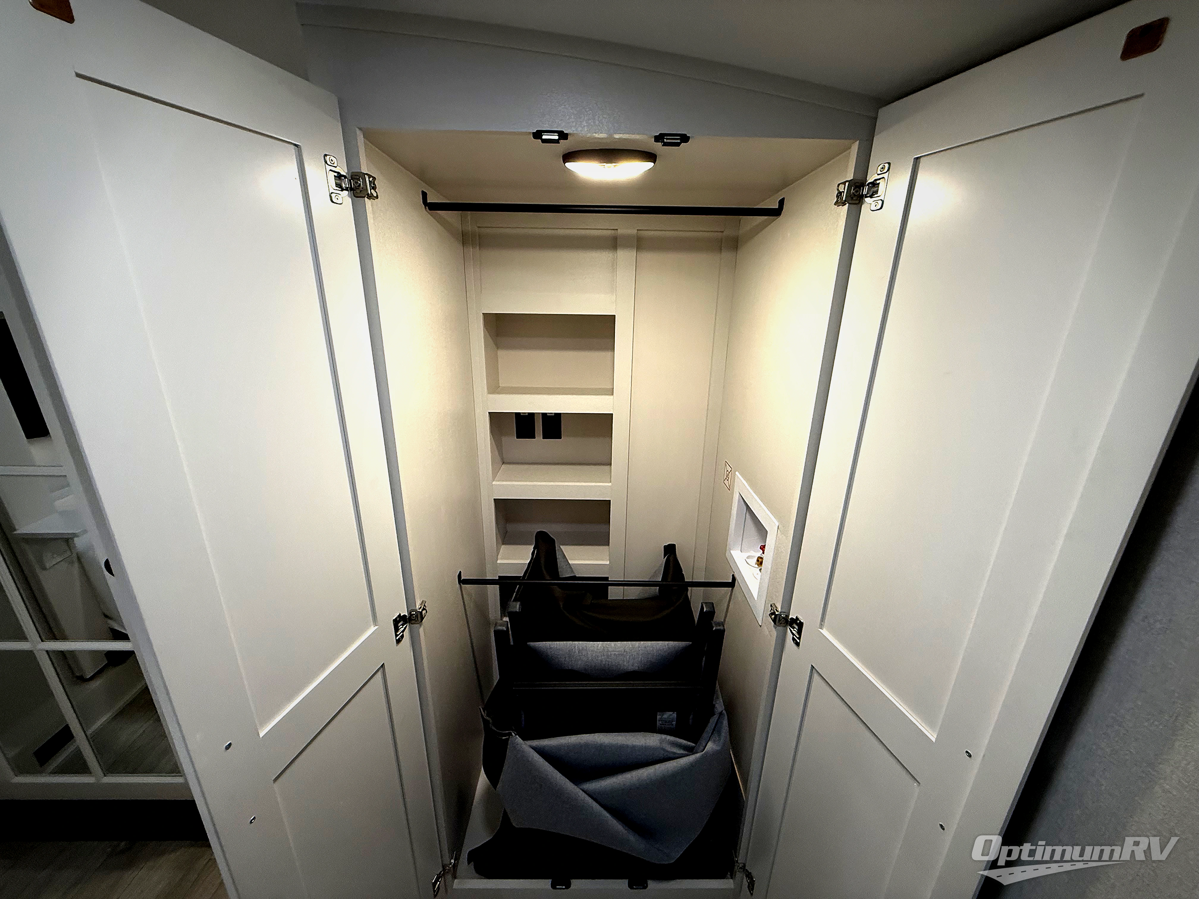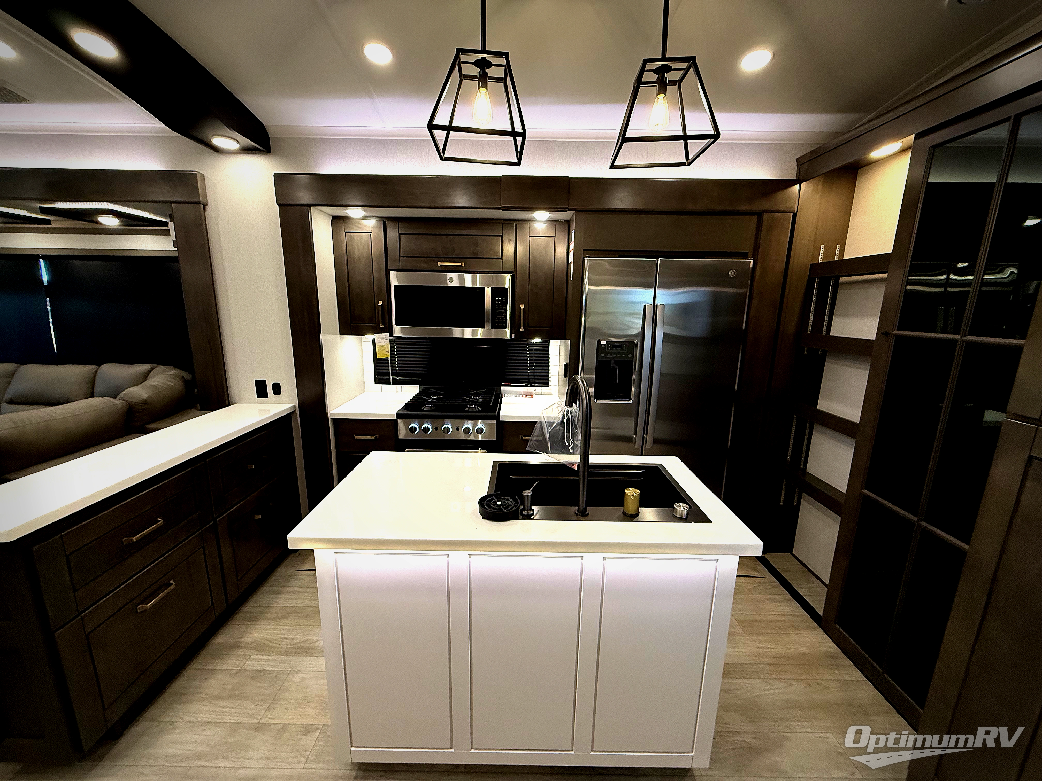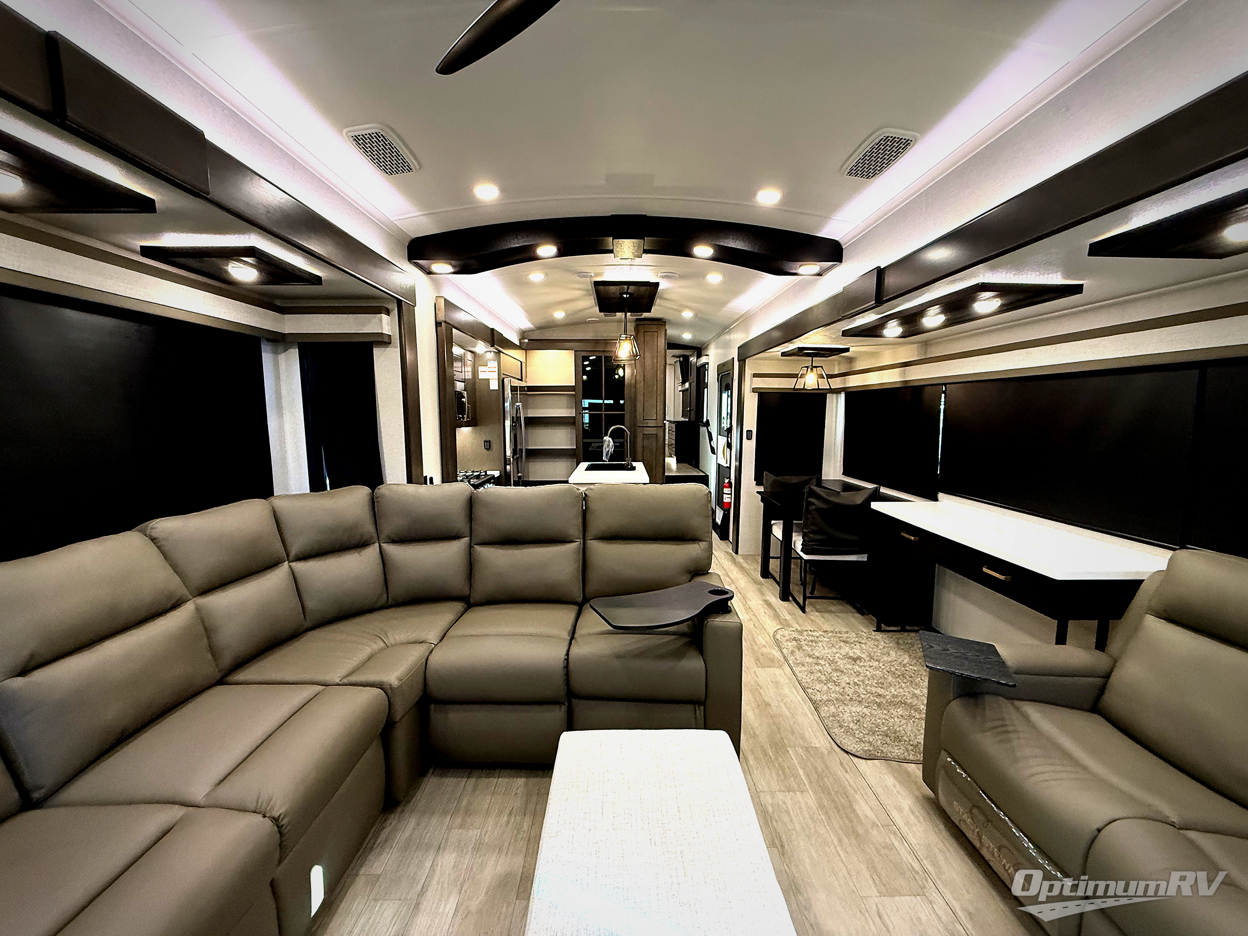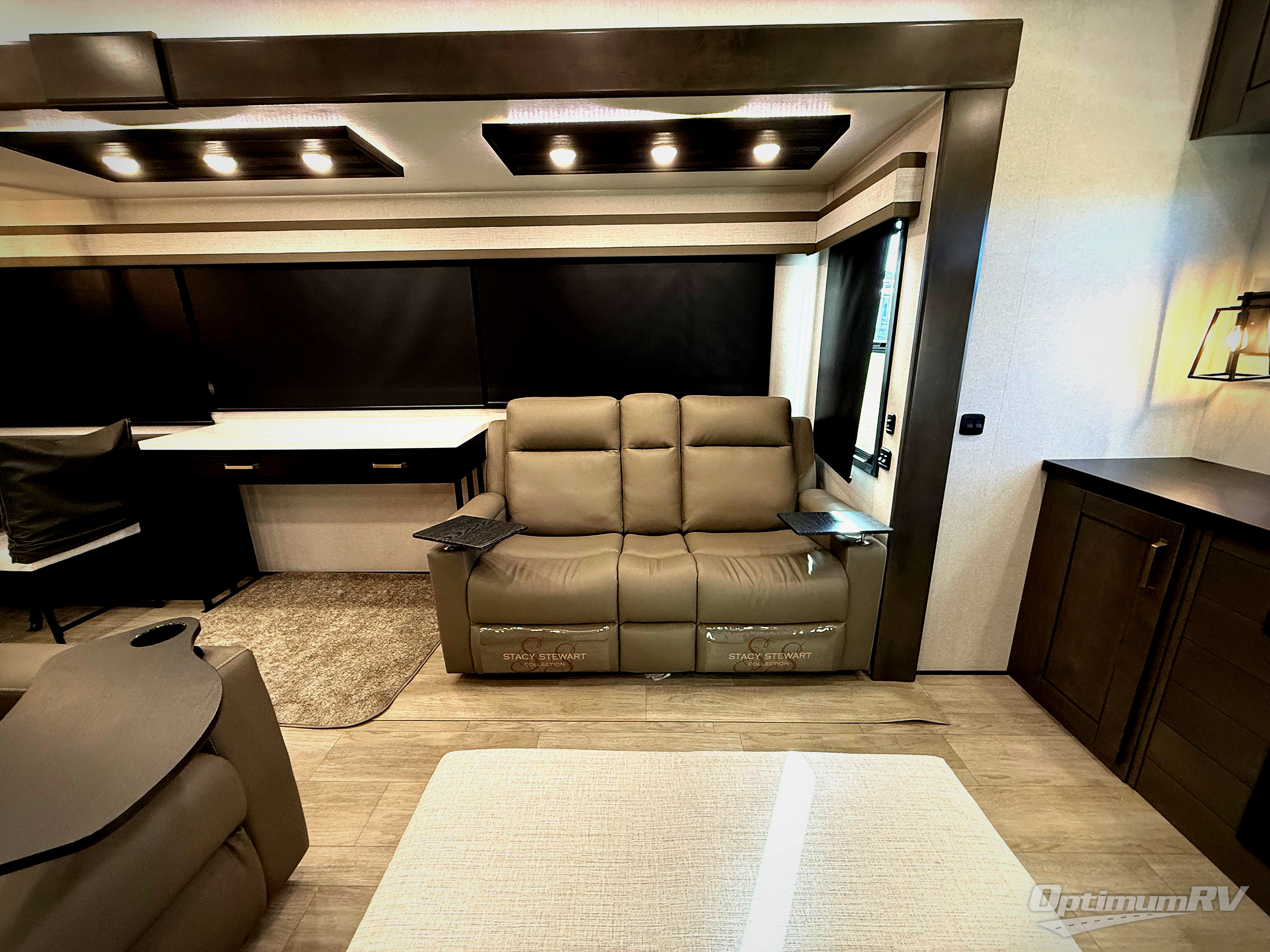 At the front of this 38RE layout, you’ll find a private bedroom featuring a spacious 72" x 80" king bed slide-out, creating a comfortable retreat to rest and recharge. The room also includes a wardrobe and dresser with a TV above, providing ample storage for clothing and essentials. Moving down the hall, the full bathroom offers both comfort and convenience with its 36" x 48" shower complete with a built-in seat for accessibility, plus linen shelves for added storage. At the heart of the unit, the kitchen is thoughtfully designed with everything needed to cook in comfort, including a pantry, a pull-out cutting board in the island, and a 21-cu. ft. refrigerator. Meal preparation is a breeze with the 24" range or the convection microwave featuring a built-in air fryer. Across from the kitchen, the large slide-out hosts a roll-out table perfect for dining or game nights, as well as a desk/coffee bar and cozy theater seating. At the rear, the entertainment center stands out with a TV lift and fireplace, while the L-shaped lounge and additional theater seat create the ultimate space to relax and enjoy movie nights in style.