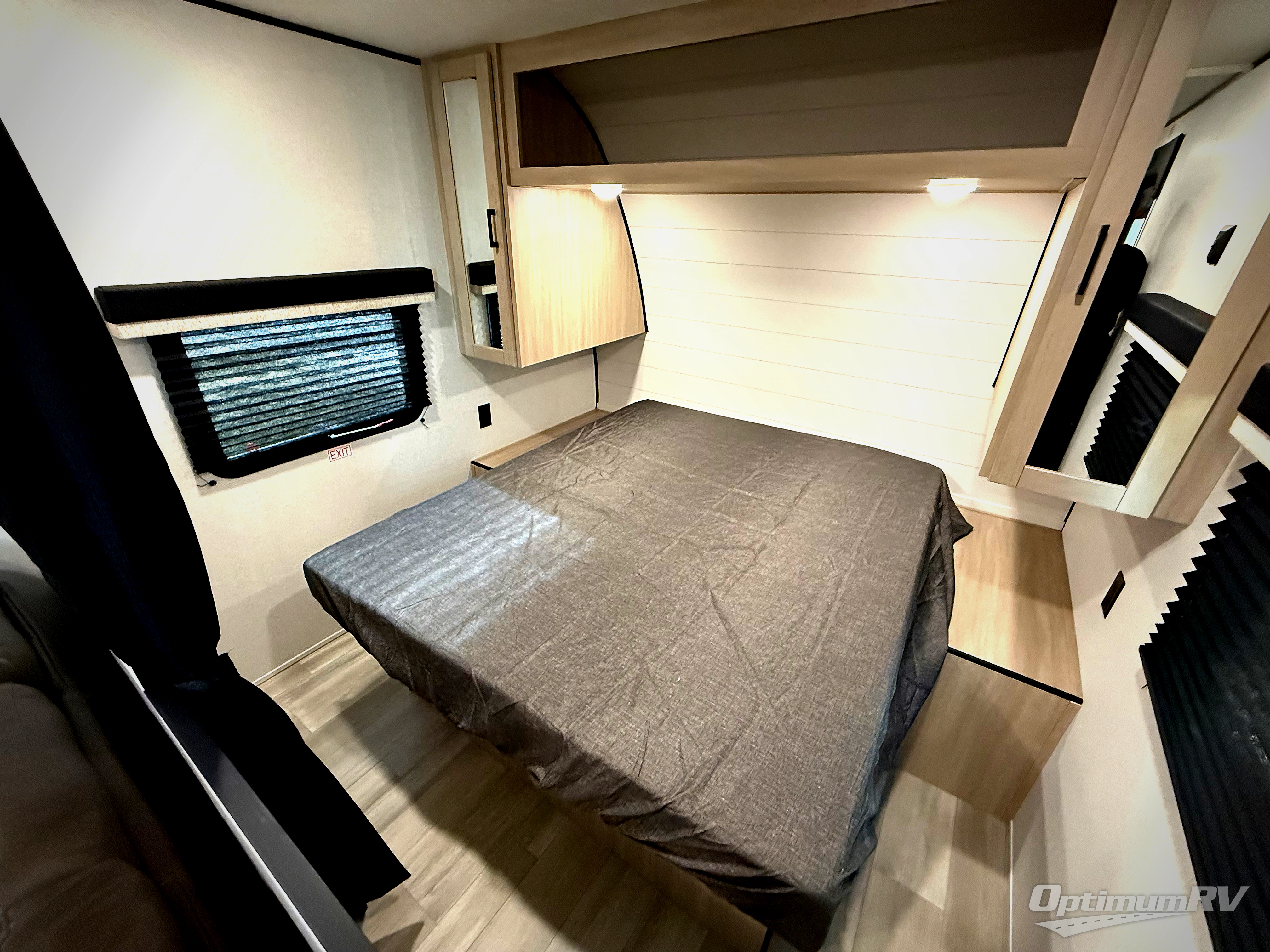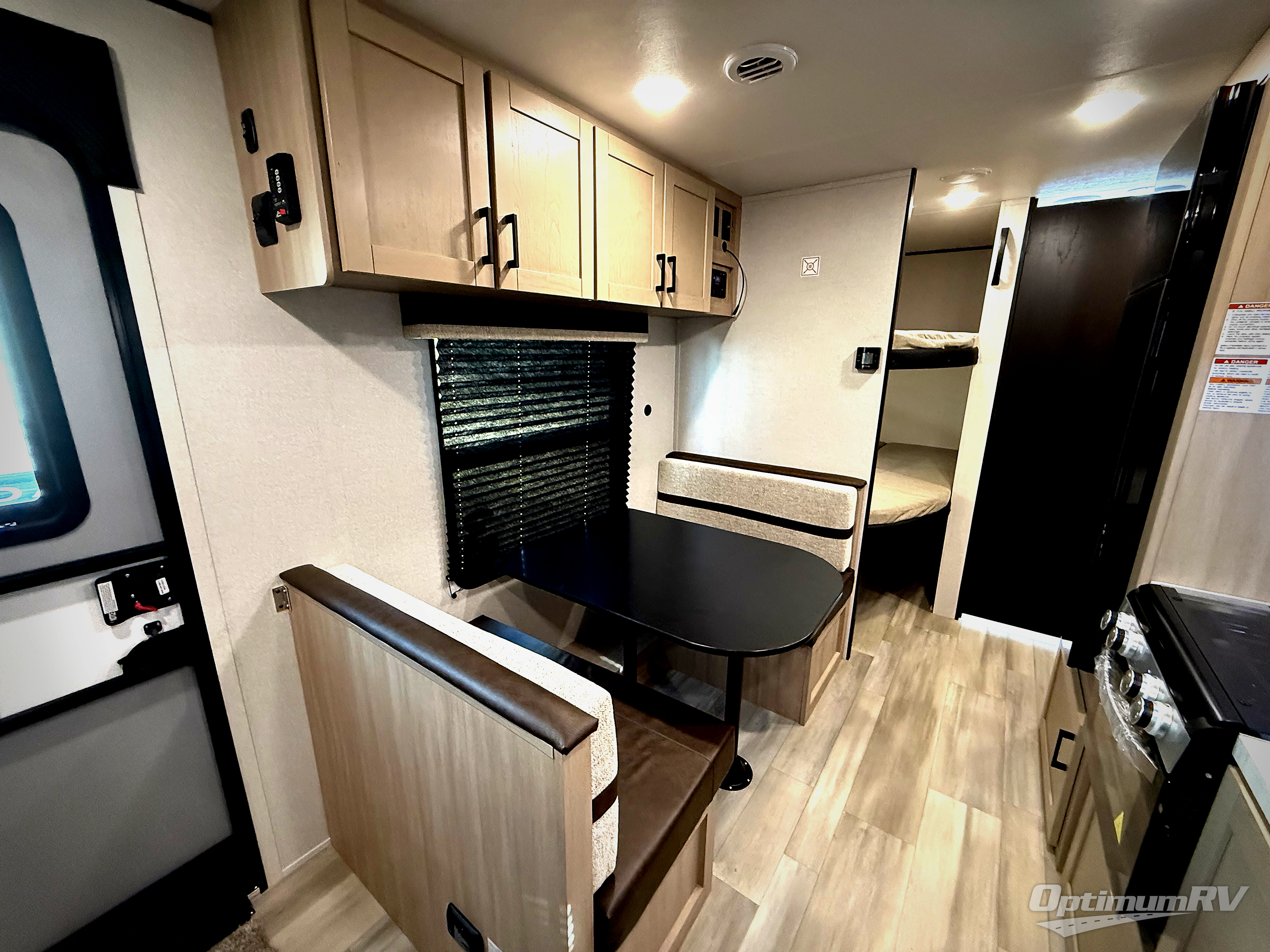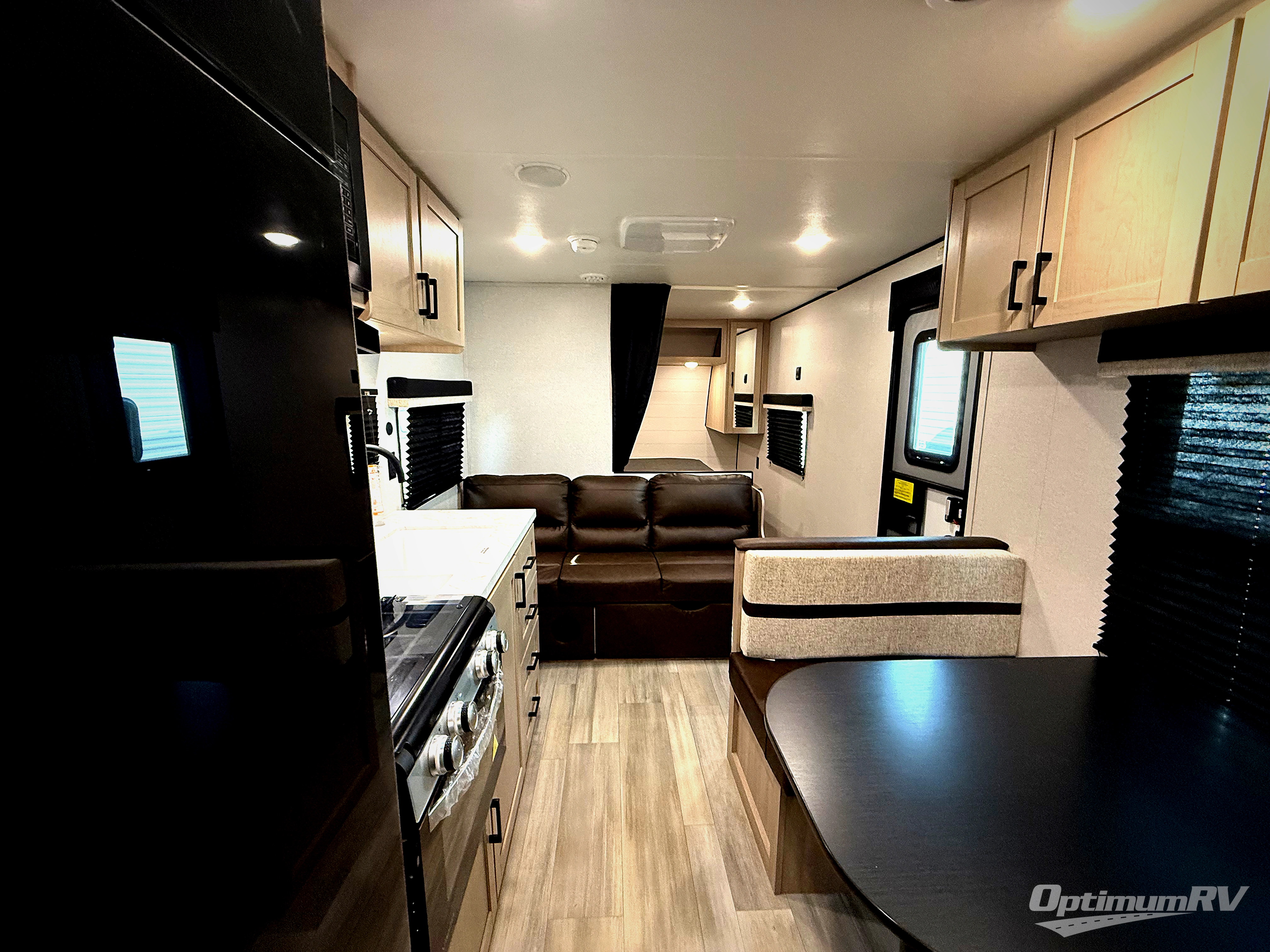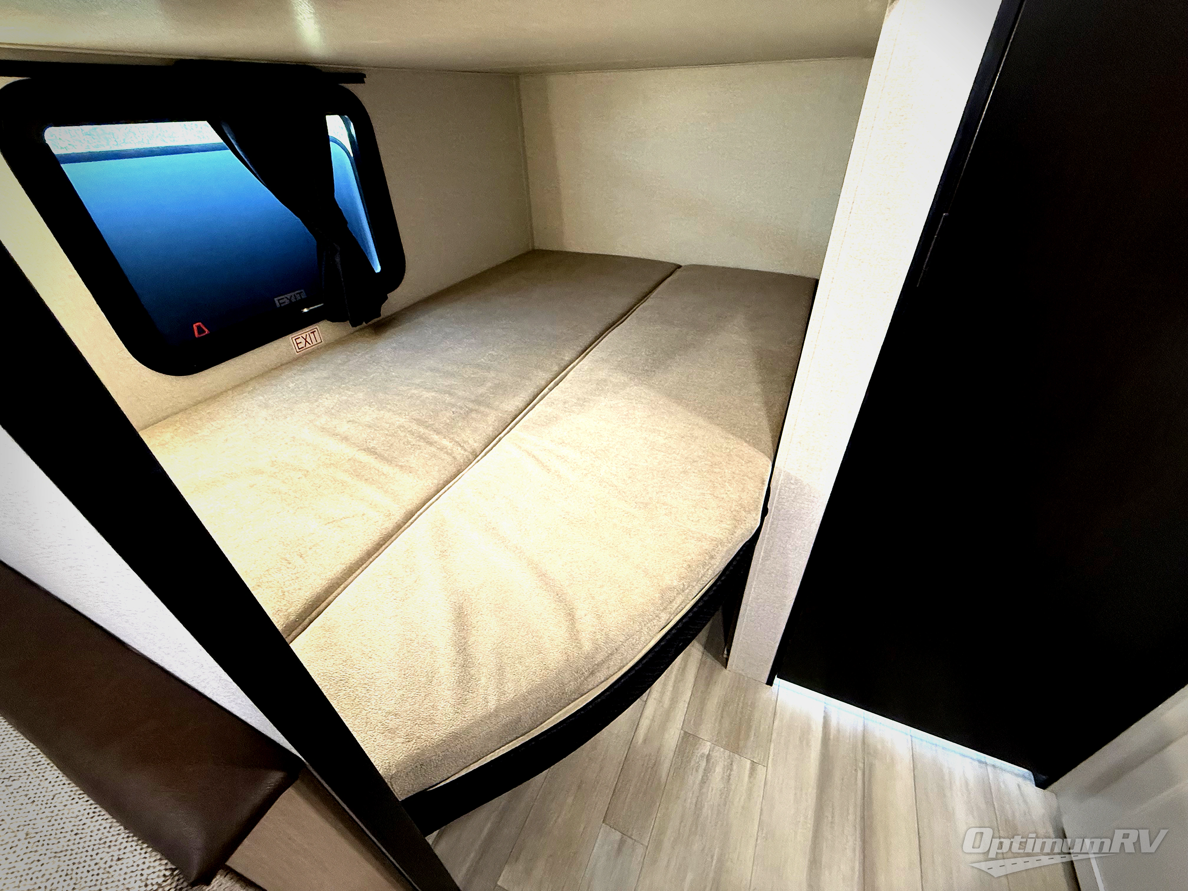 Camping trips are made easy in this spacious travel trailer with double-size bunk beds for guests or little ones. You'll find a front walk-around queen bed for a great night's rest, along with dual bedside wardrobes to keep your things tidy and a privacy curtain. The rear corner private bath includes a foot-flush toilet and a 24" x 40" shower, so you won't have to leave the camper in the middle of the night. A three-burner cooktop and microwave oven will let you make meals each day, and you'll find seating spaces at the booth dinette or on the sofa!