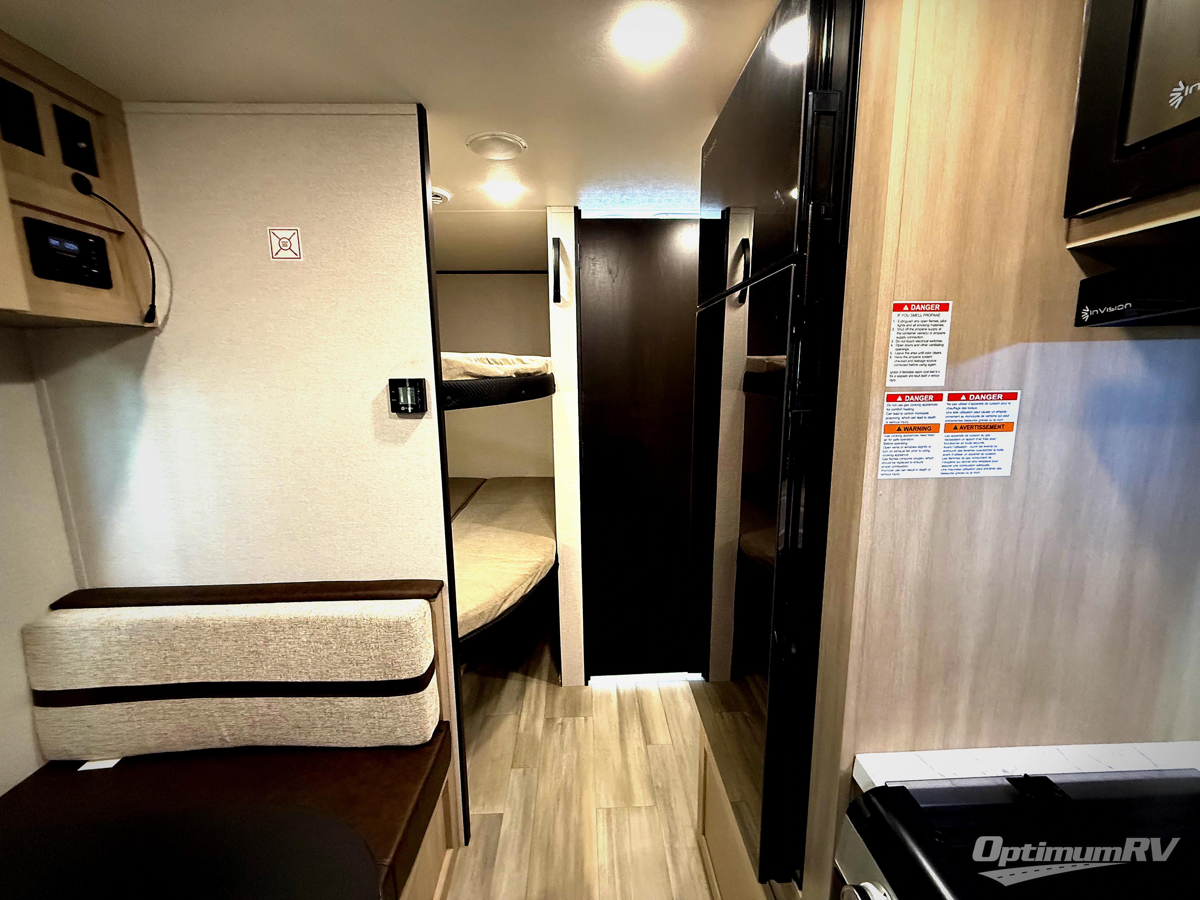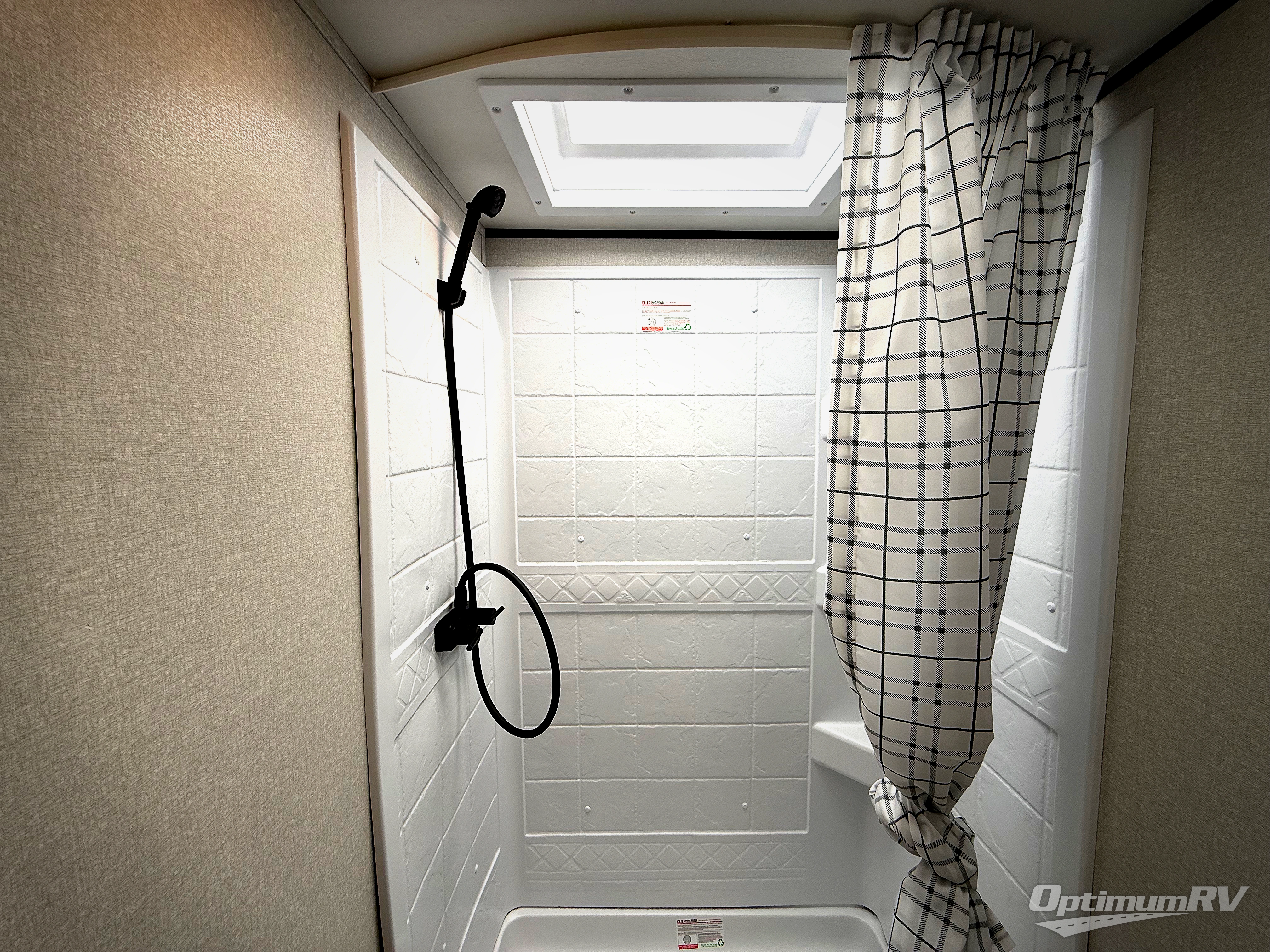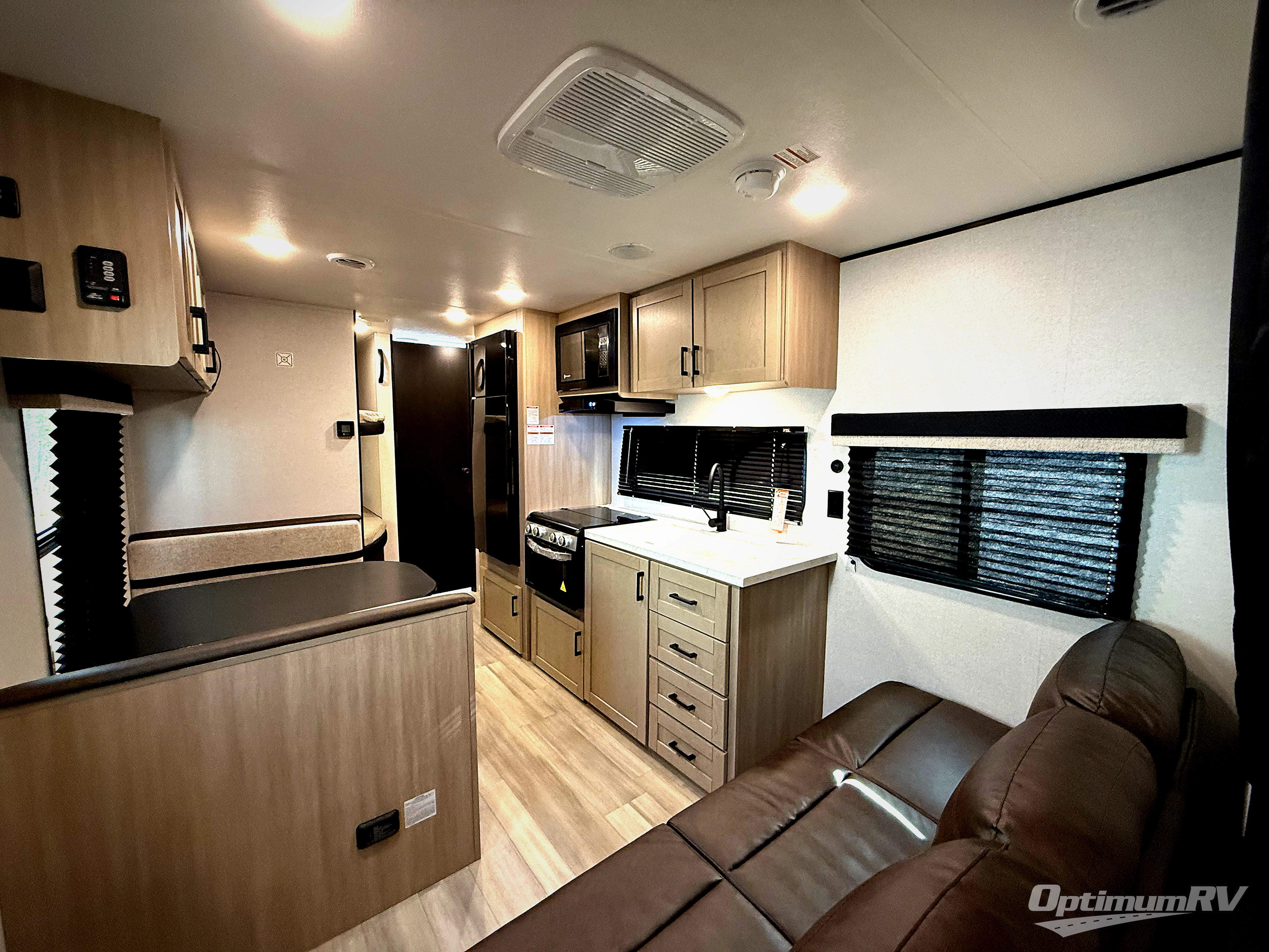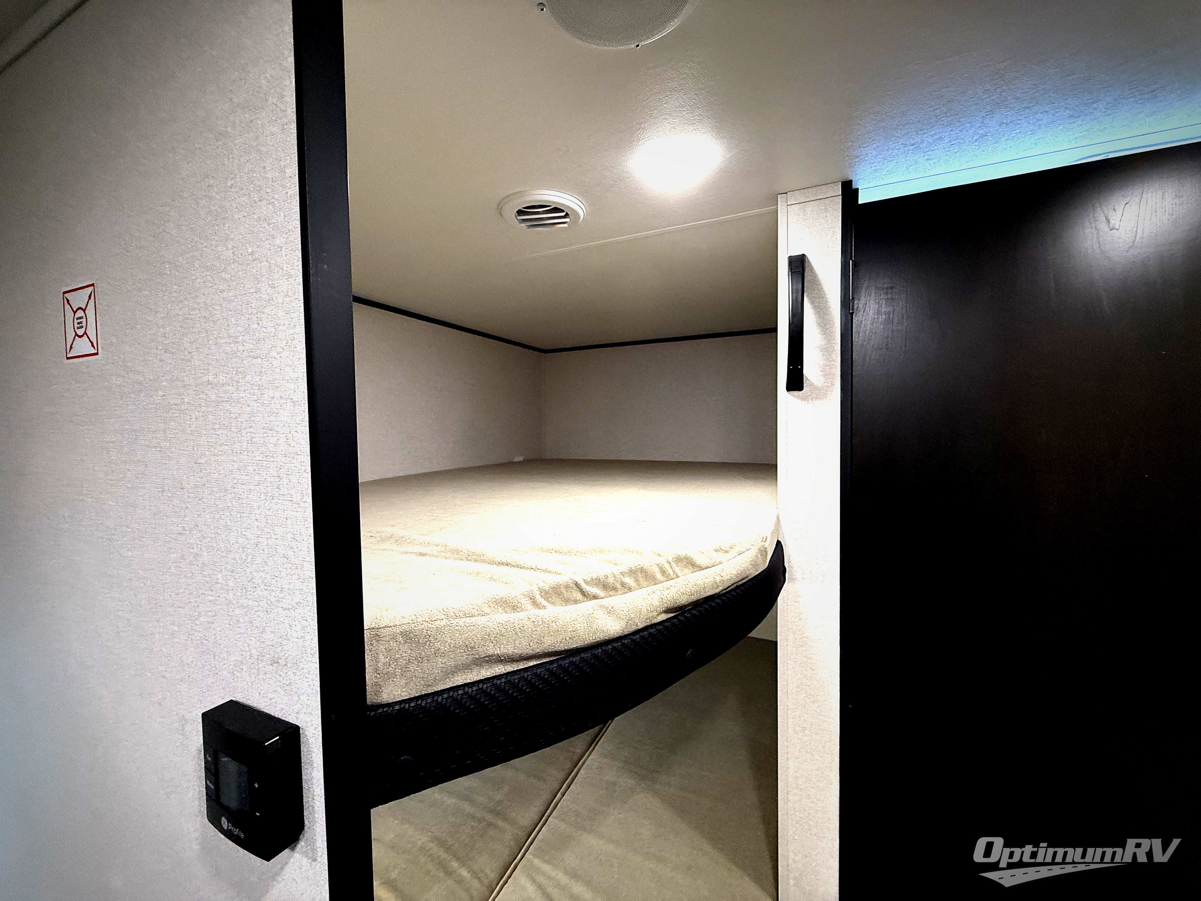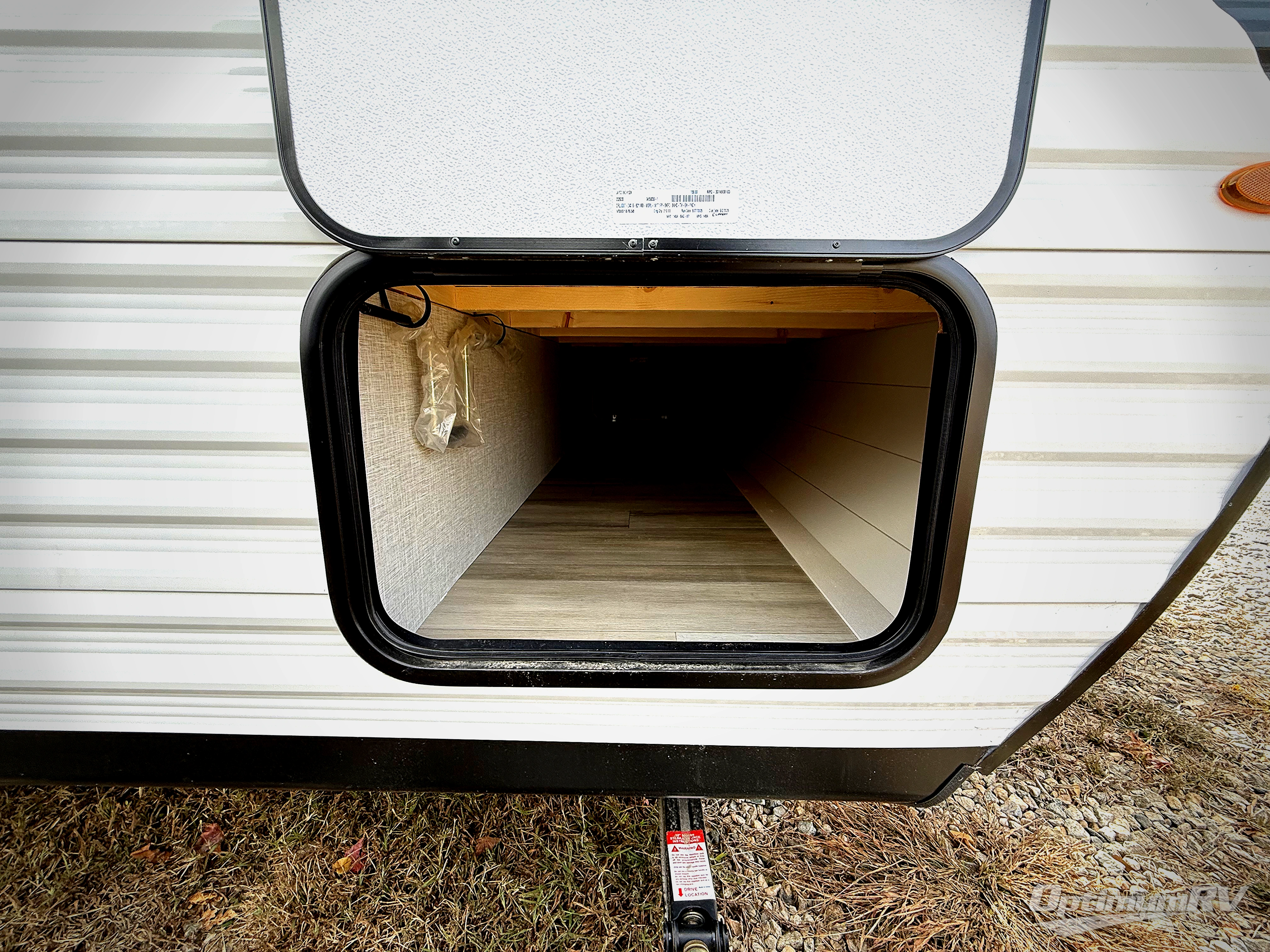 Camping trips are made easy in this spacious travel trailer with double-size bunk beds for guests or little ones. You'll find a front walk-around queen bed for a great night's rest, along with dual bedside wardrobes to keep your things tidy and a privacy curtain. The rear corner private bath includes a foot-flush toilet and a 24" x 40" shower, so you won't have to leave the camper in the middle of the night. A three-burner cooktop and microwave oven will let you make meals each day, and you'll find seating spaces at the booth dinette or on the sofa!