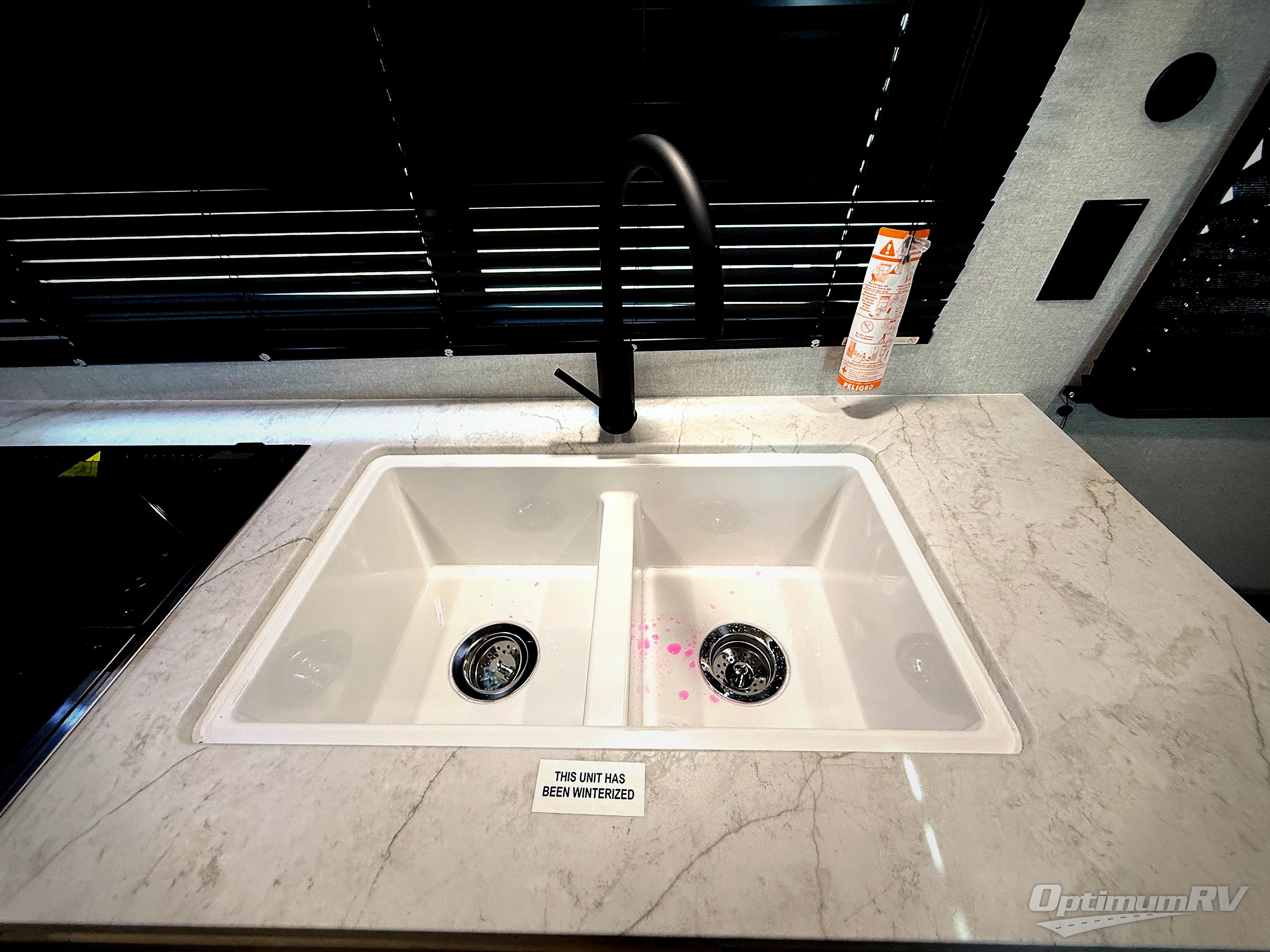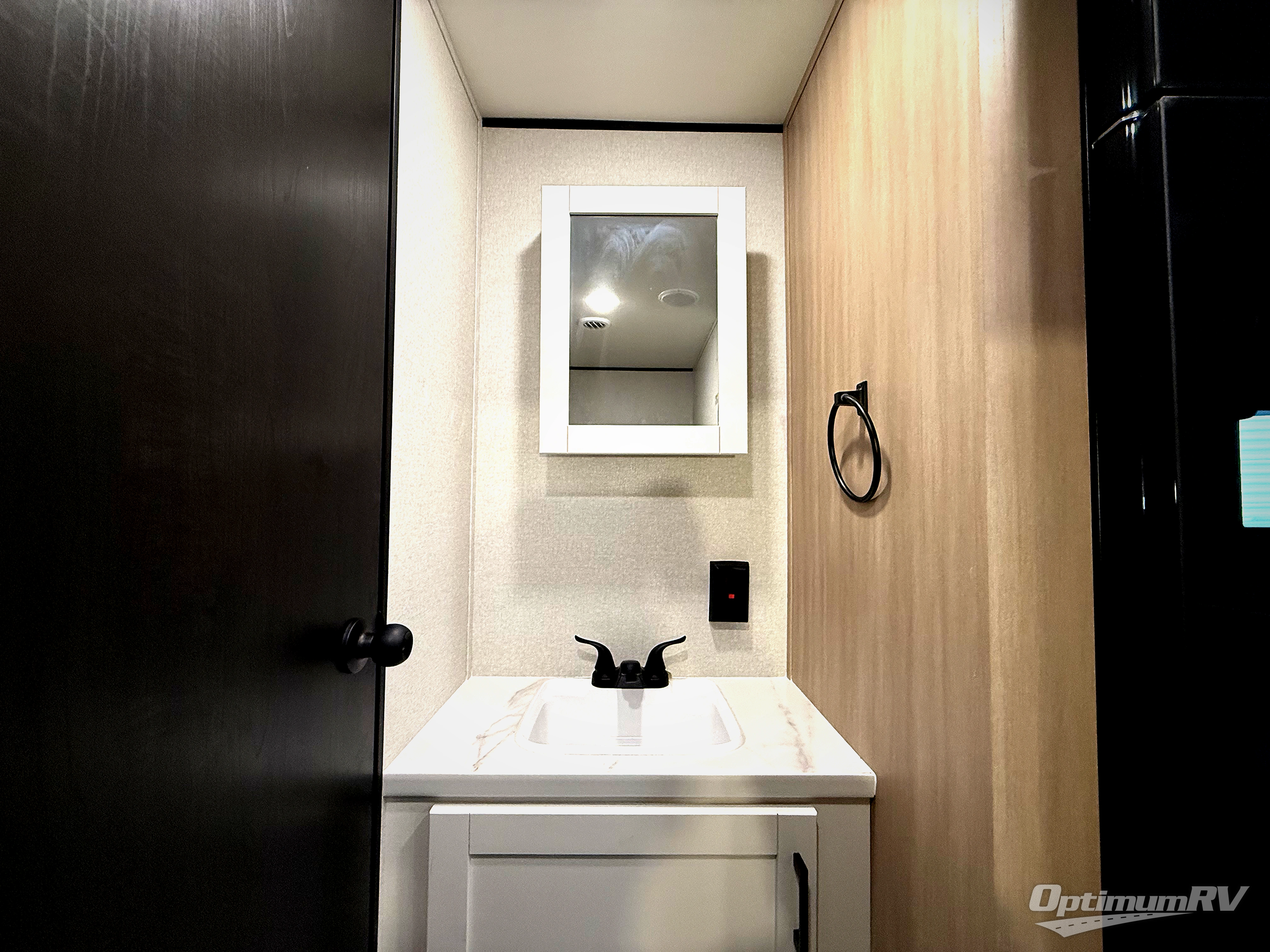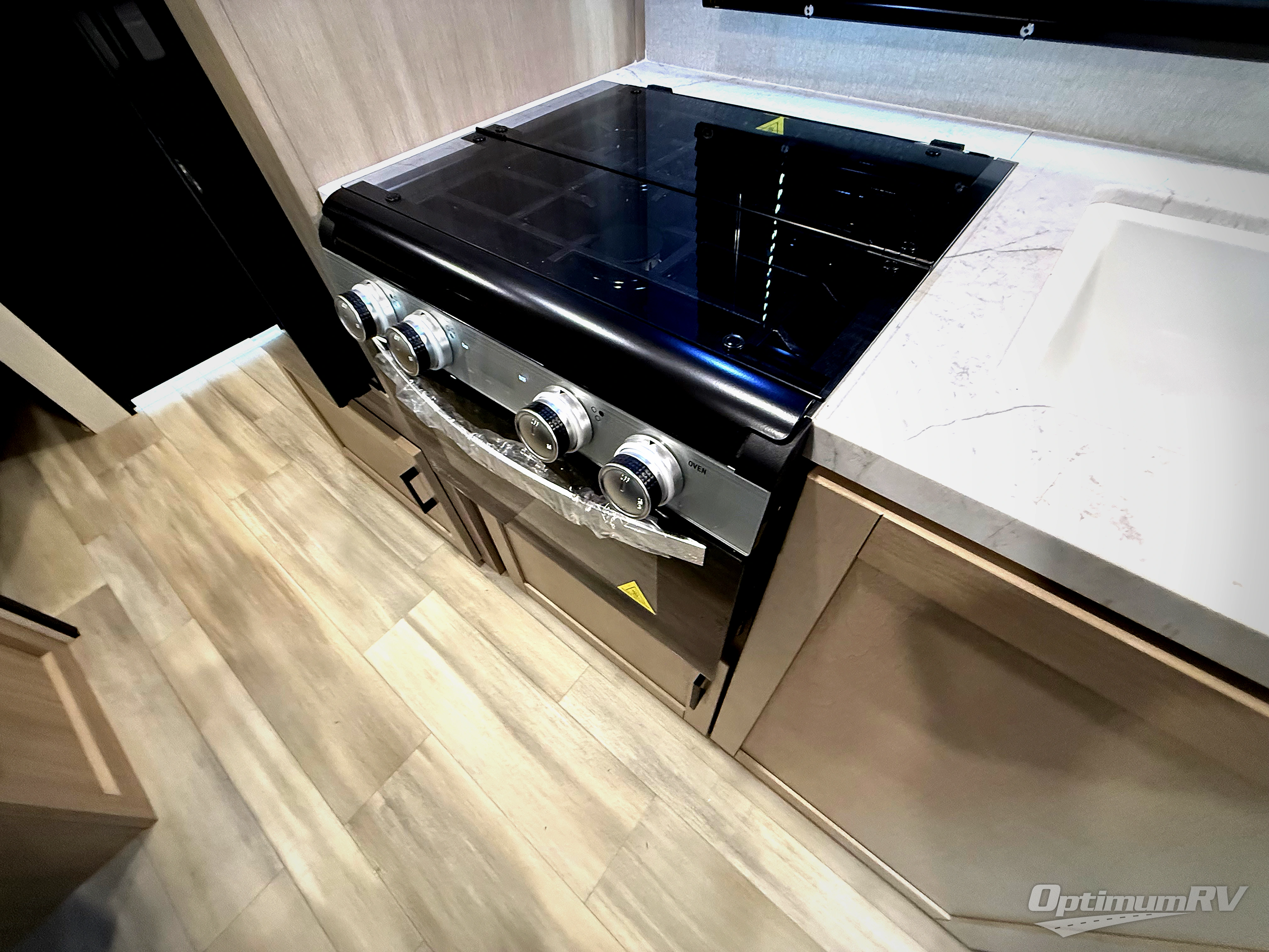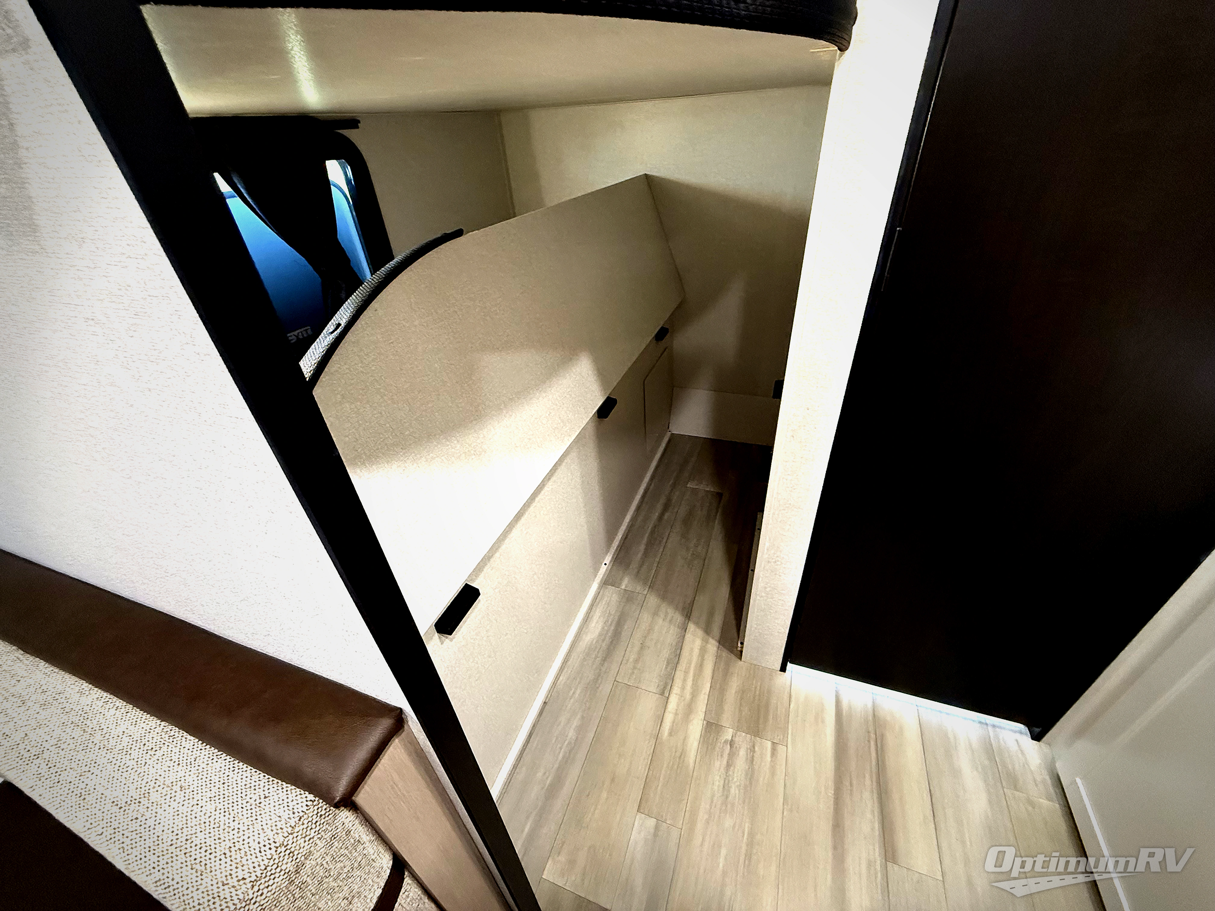 Camping trips are made easy in this spacious travel trailer with double-size bunk beds for guests or little ones. You'll find a front walk-around queen bed for a great night's rest, along with dual bedside wardrobes to keep your things tidy and a privacy curtain. The rear corner private bath includes a foot-flush toilet and a 24" x 40" shower, so you won't have to leave the camper in the middle of the night. A three-burner cooktop and microwave oven will let you make meals each day, and you'll find seating spaces at the booth dinette or on the sofa!