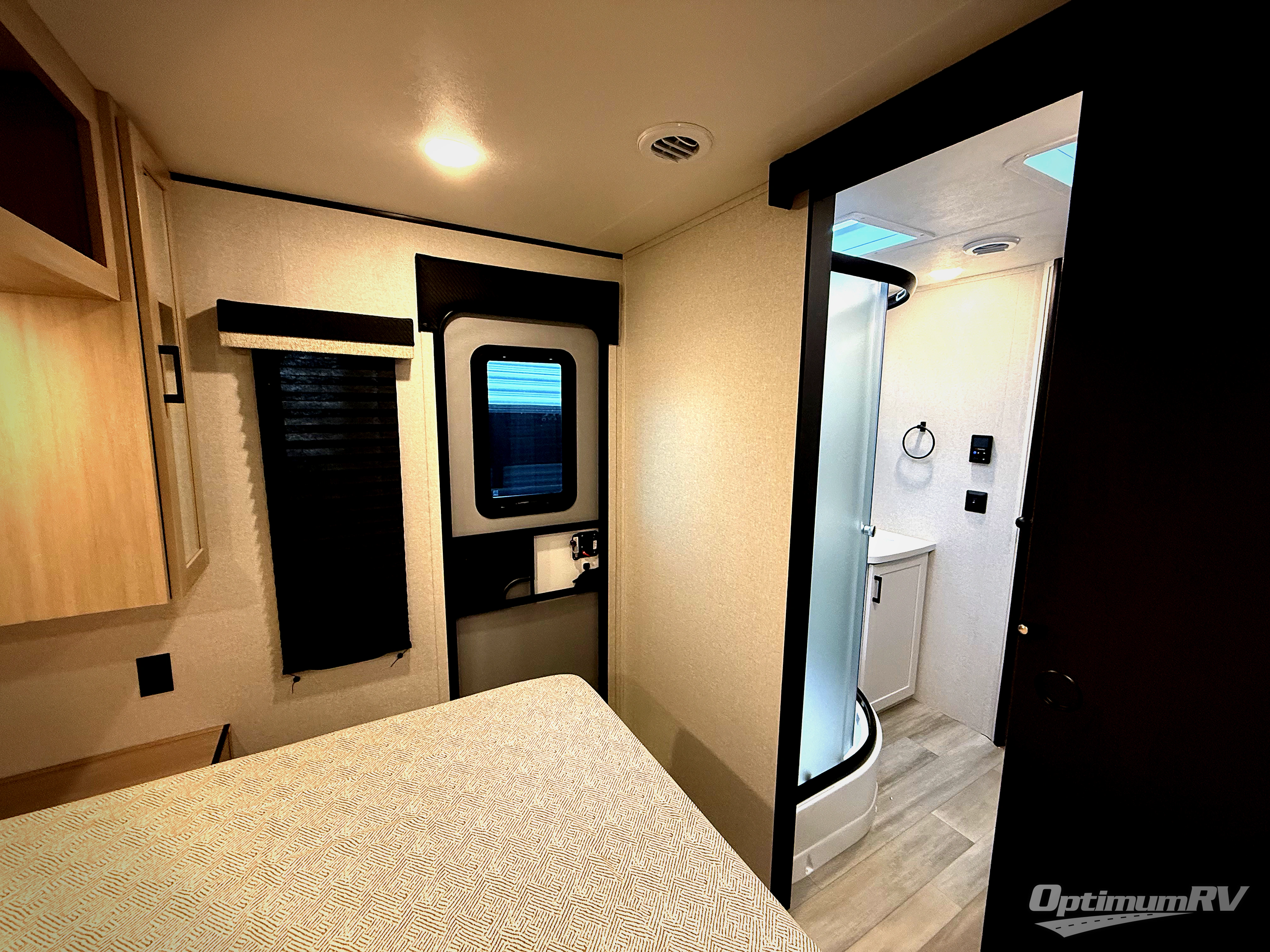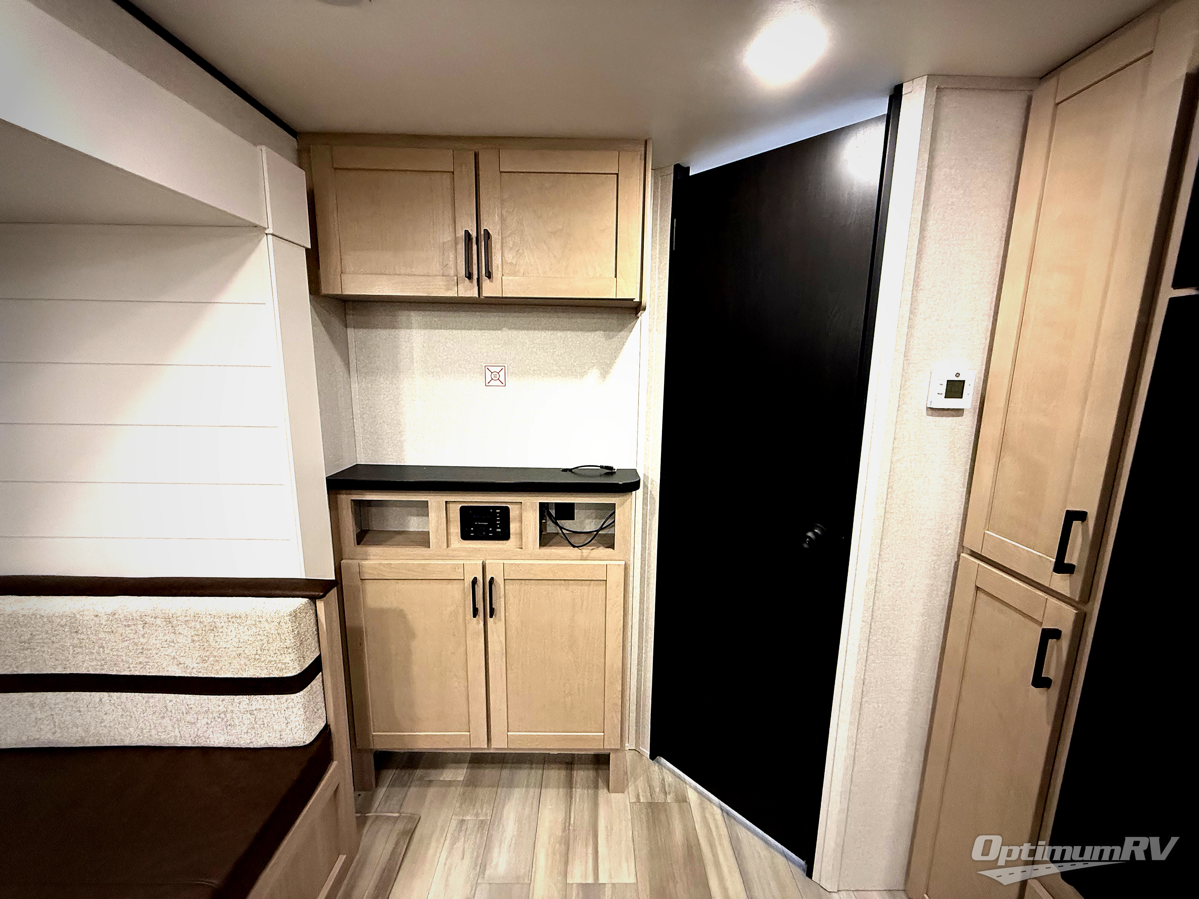 Time spent in this spacious travel trailer will be time well spent! Once you arrive at your campsite, you can put out the 18' power awning and relax in your camp chairs. The dual entry doors will allow you to enter in through the rear living room with dual lounge chairs, or the front private bedroom with an RV queen bed! The chef of your group can make lunch on the three-burner cooktop or in the microwave oven, and there is a booth dinette where you can dine together. Your guests can convert the dinette to sleeping space at night, along with the jack-knife sofa!