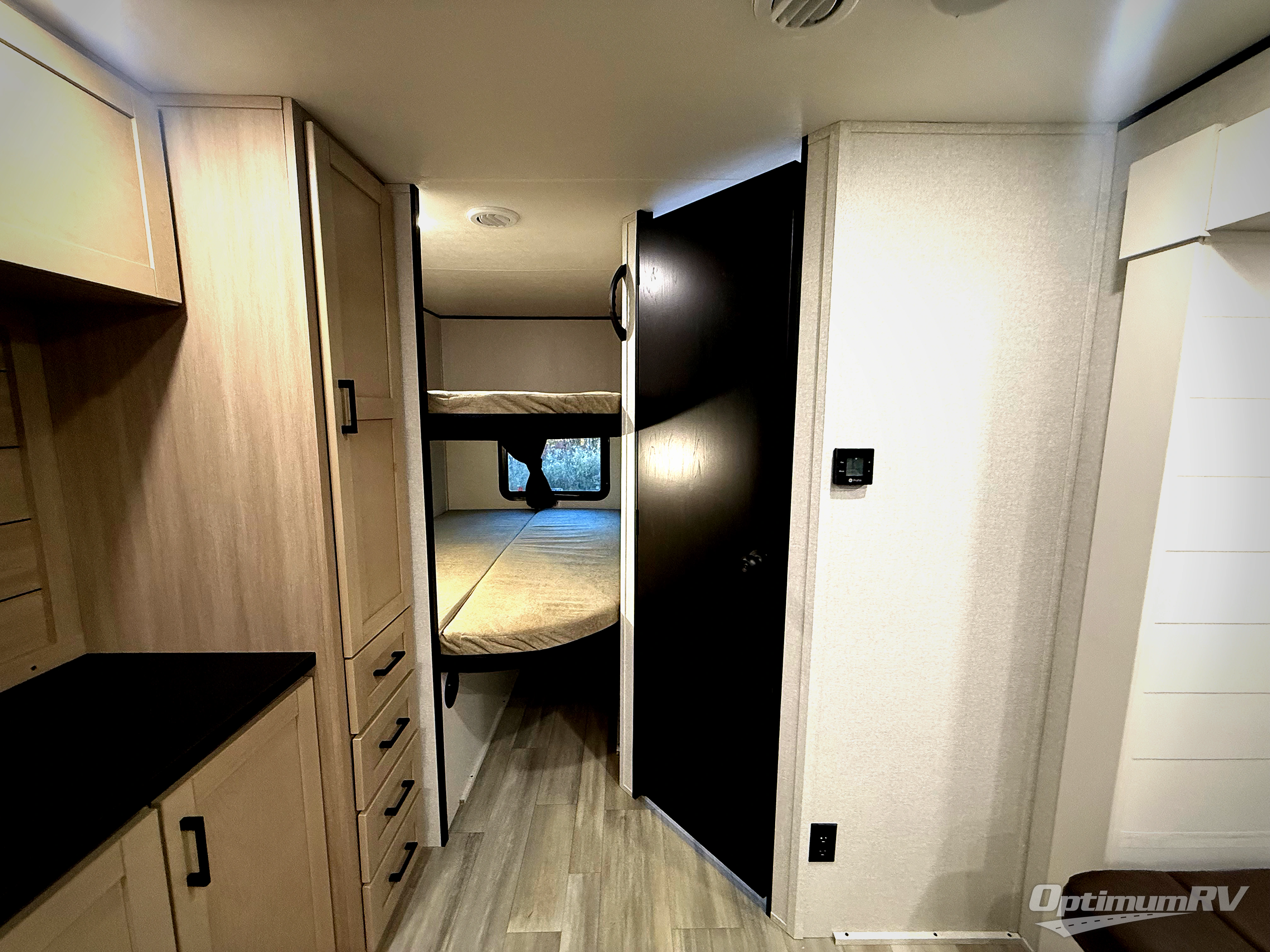 The whole gang will love weekends in the woods with this travel trailer in tow! There is a large slide out for added space, and here you'll find the jack-knife sofa and U-shaped dinette. There is also an entertainment center with a fireplace for cozy evenings indoors, and you'll appreciate the storage cabinet and shelves for board games, movies and more! You can claim the front private bedroom to yourselves, while your guests or little ones take the double-size bunks. A full kitchen is complete with a three-burner cooktop and microwave oven to make meals each day, plus a 12V refrigerator for food storage. This unit also includes an outdoor kitchen with a refrigerator to keep cold drinks ready to enjoy!