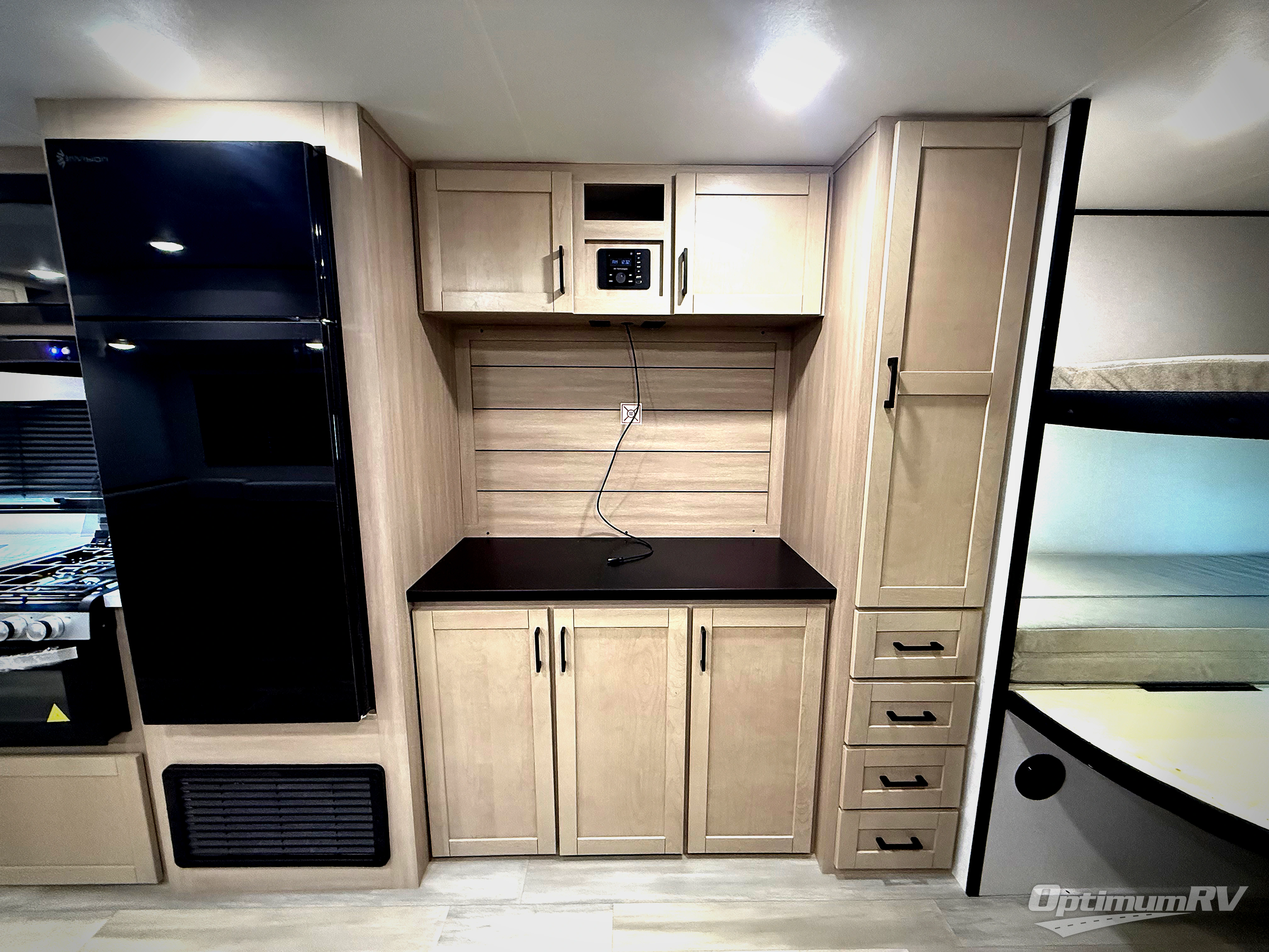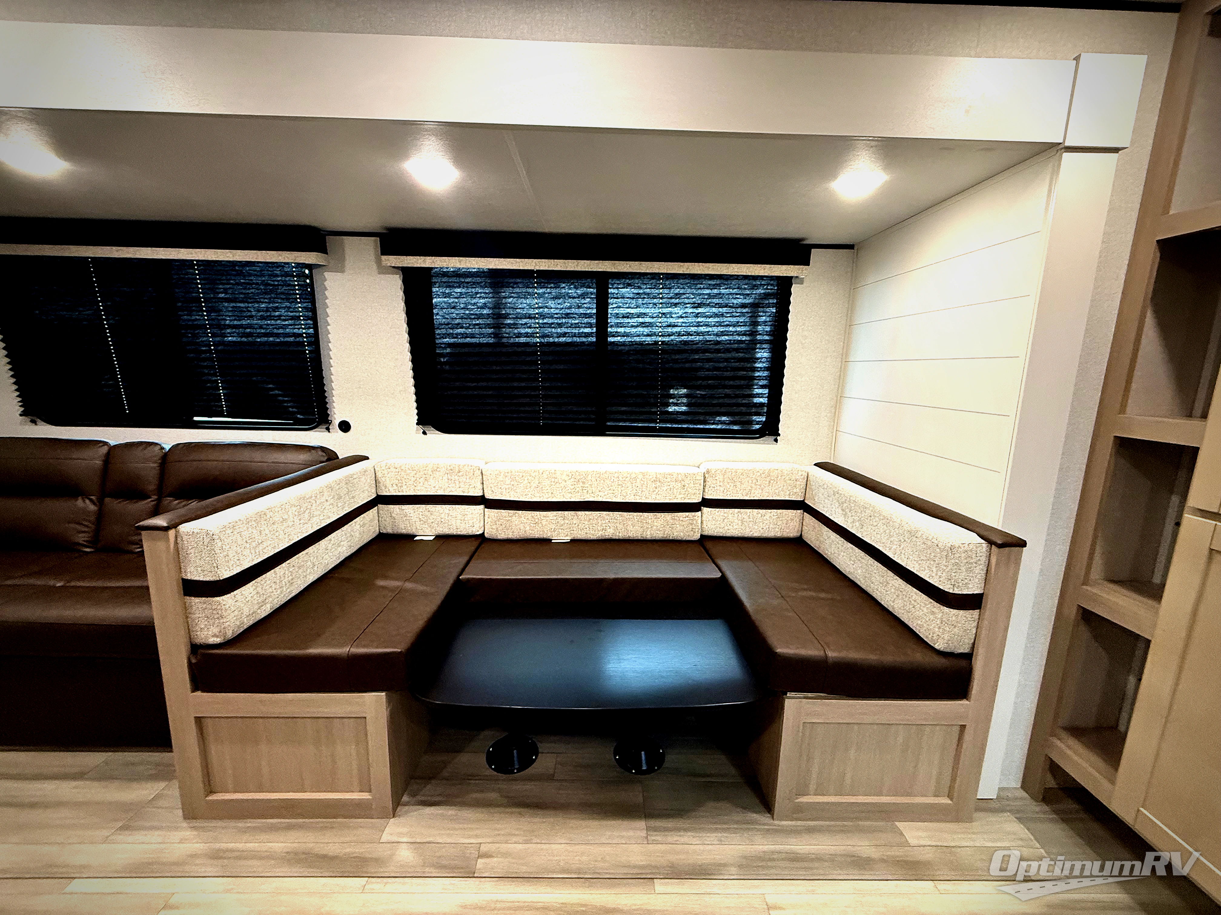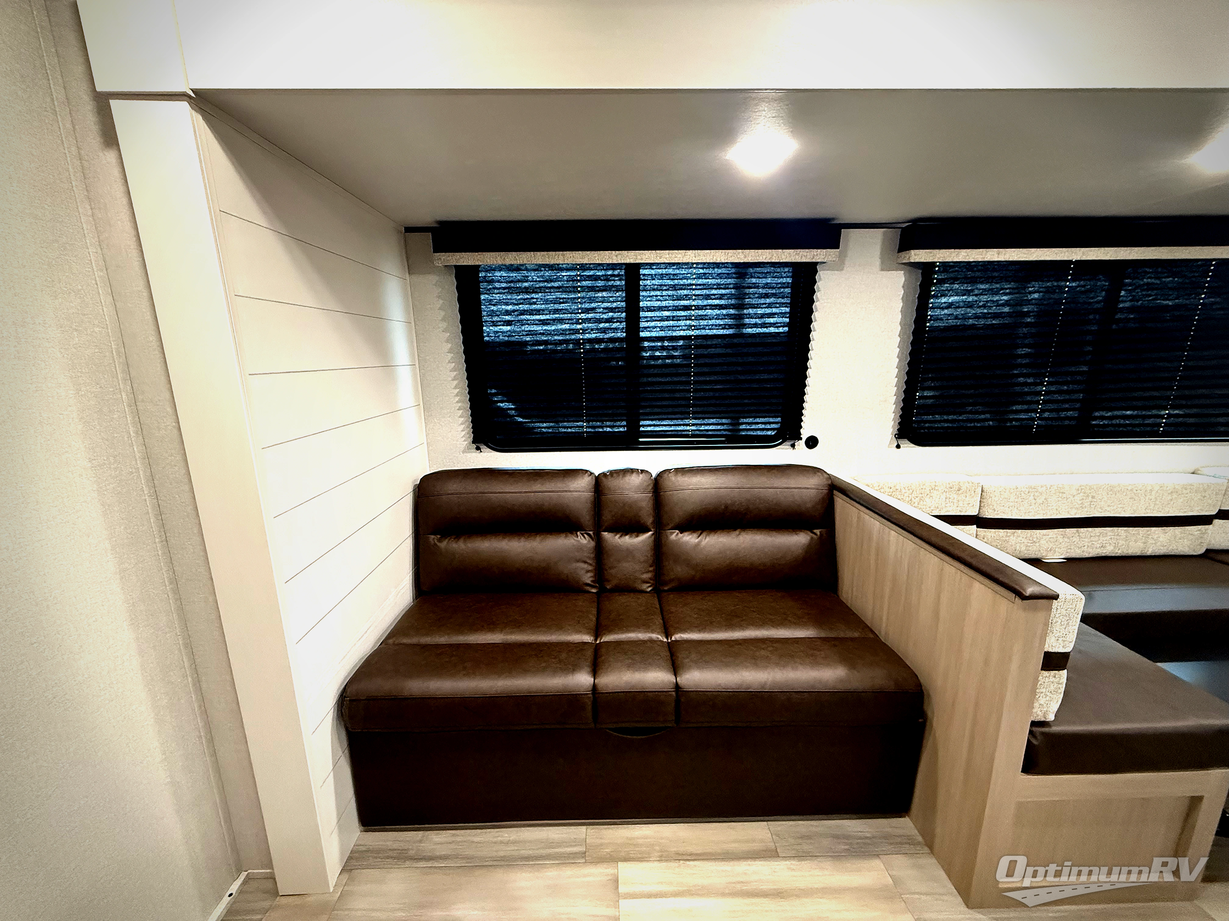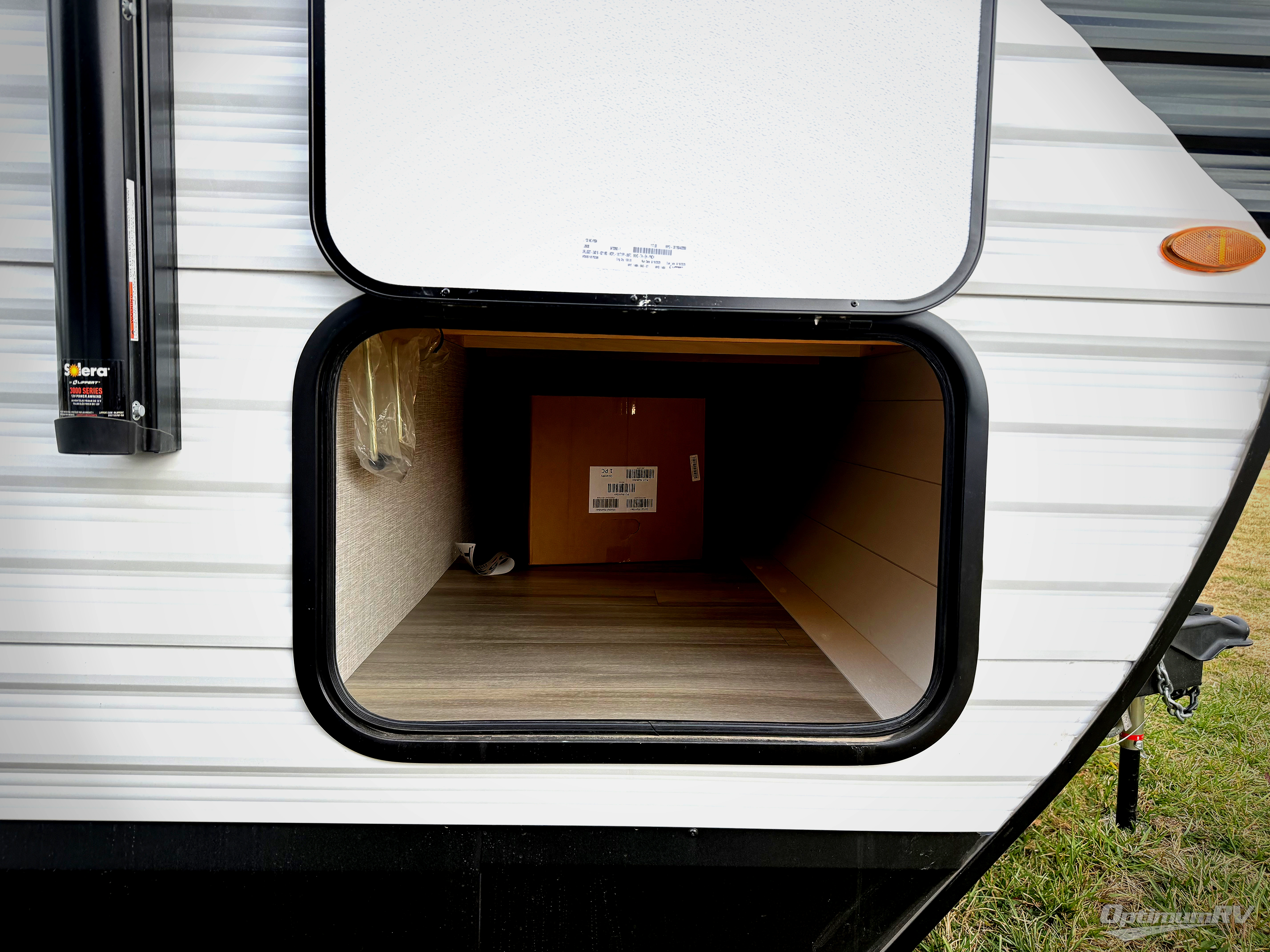 The whole gang will love weekends in the woods with this travel trailer in tow! There is a large slide out for added space, and here you'll find the jack-knife sofa and U-shaped dinette. There is also an entertainment center with a fireplace for cozy evenings indoors, and you'll appreciate the storage cabinet and shelves for board games, movies and more! You can claim the front private bedroom to yourselves, while your guests or little ones take the double-size bunks. A full kitchen is complete with a three-burner cooktop and microwave oven to make meals each day, plus a 12V refrigerator for food storage. This unit also includes an outdoor kitchen with a refrigerator to keep cold drinks ready to enjoy!