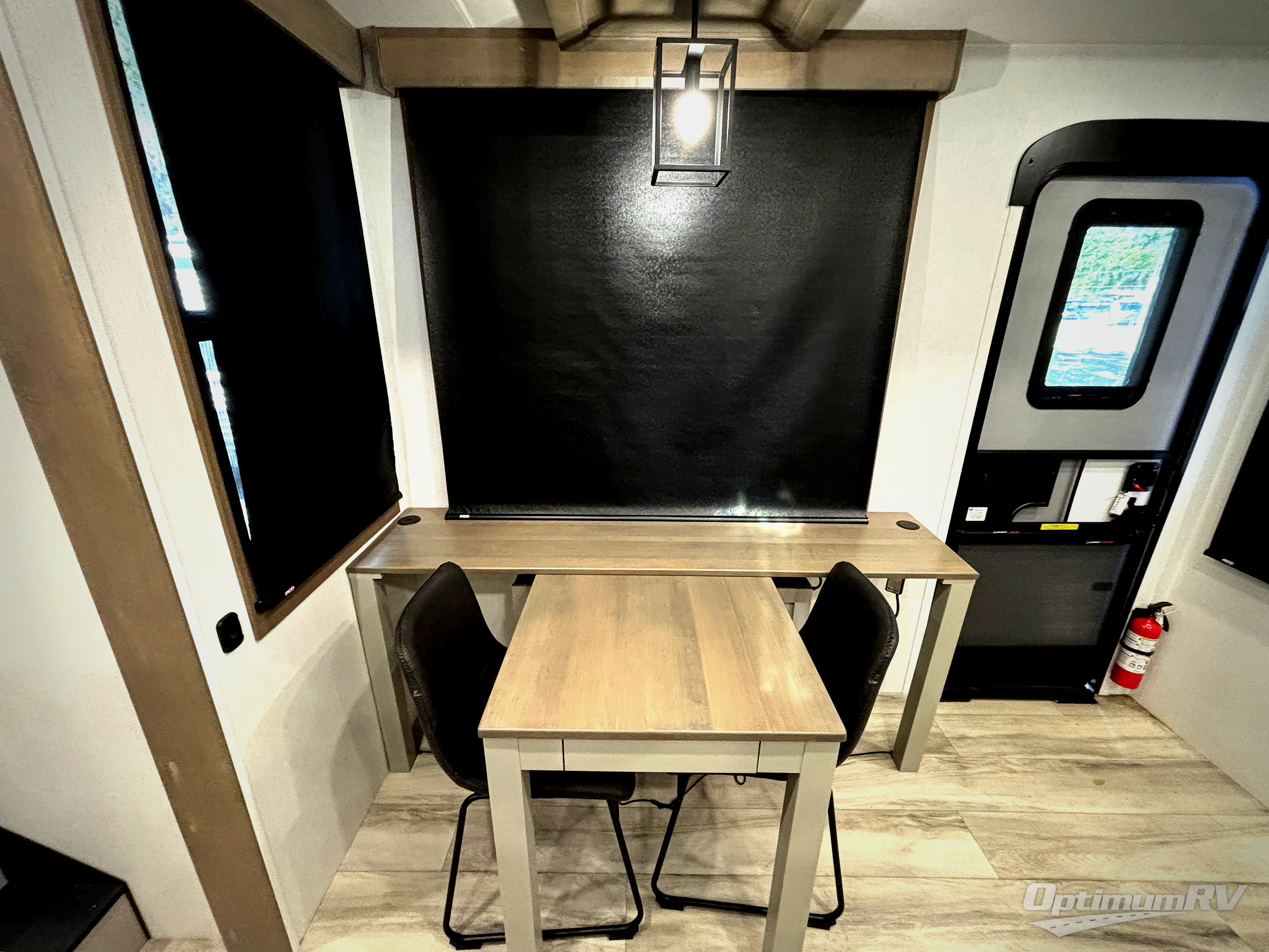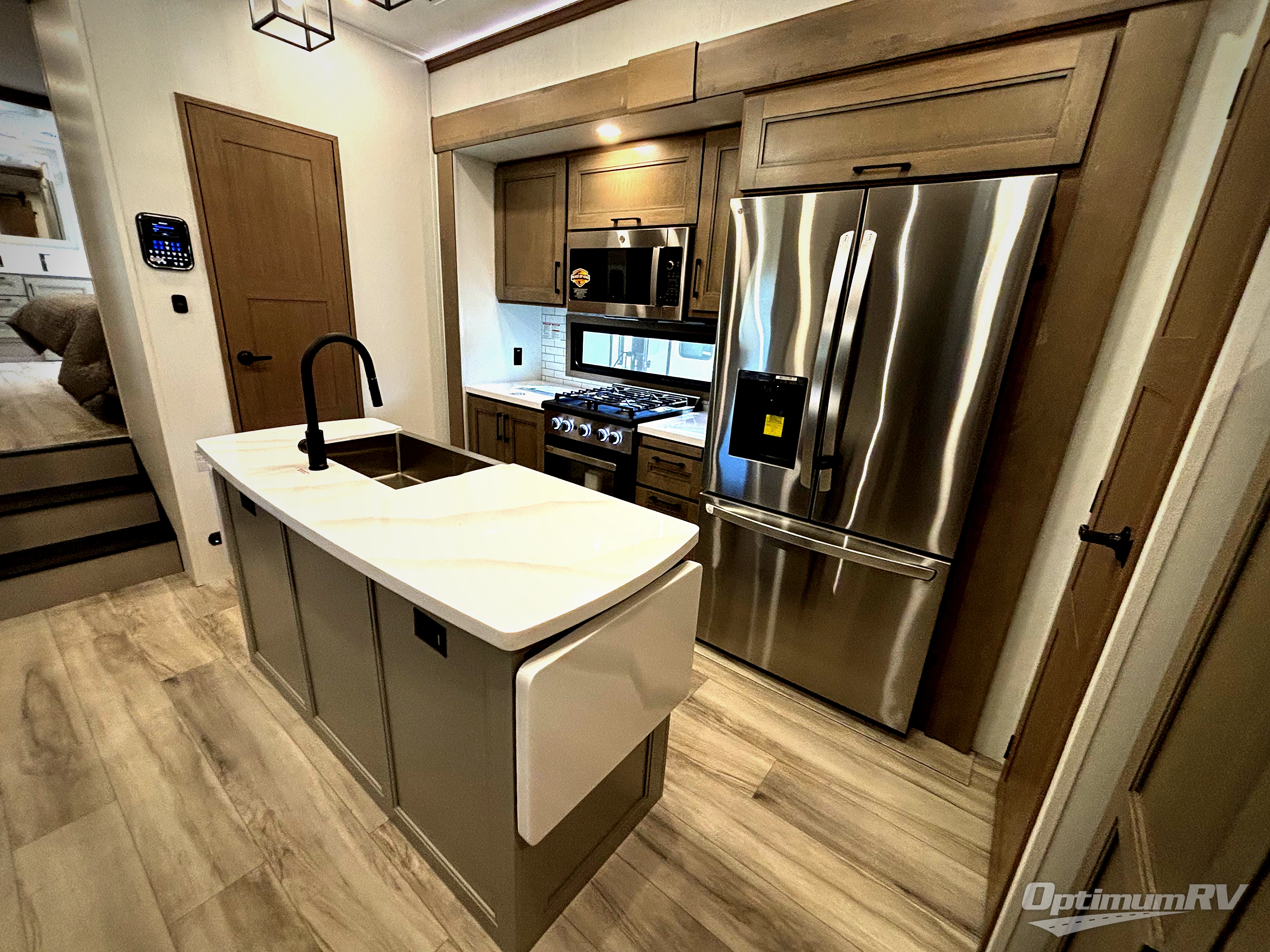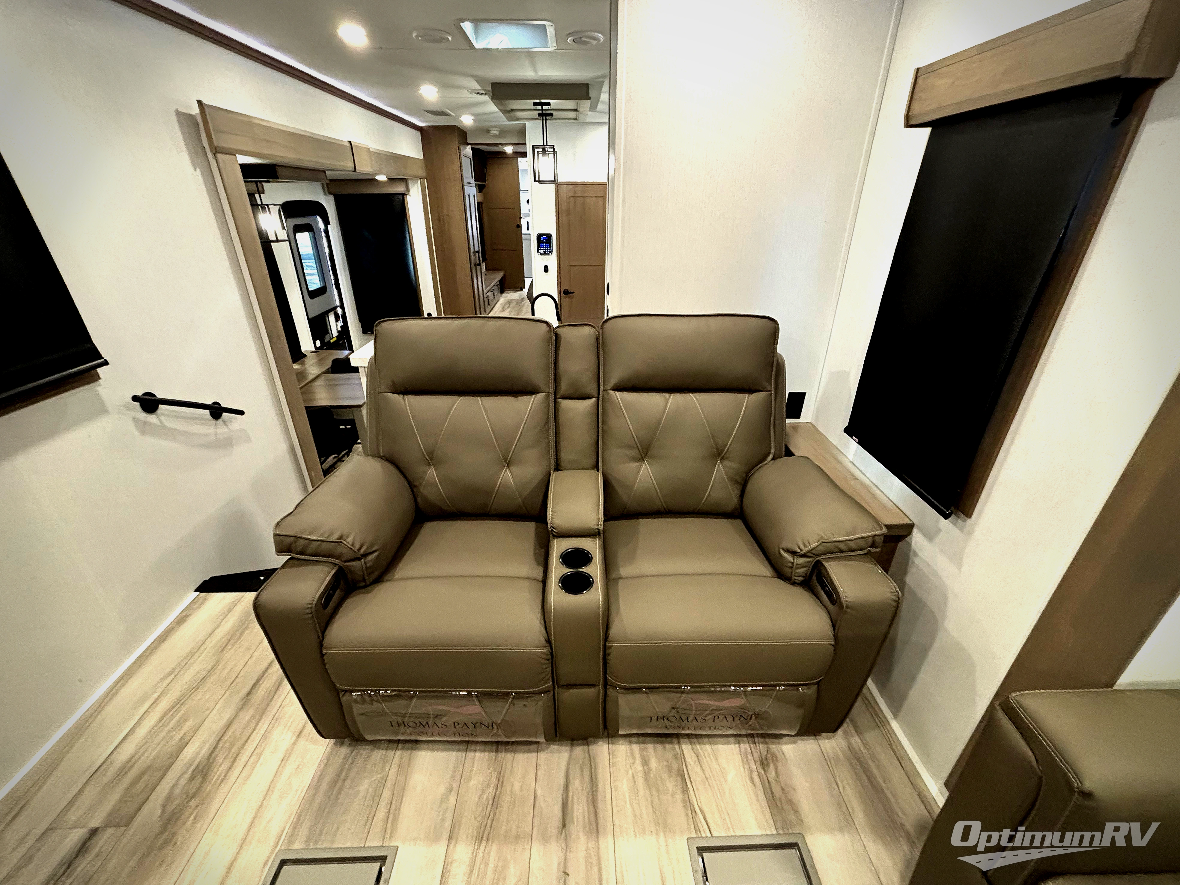 Fall in love with this unit's kitchen with residential appliances, a farmhouse stainless steel sink, a dishwasher, pantry, 26 cu refrigerator, and a sliding table/desk with chairs. Spend cozy entertainment nights watching the 65" LED TV with a fireplace below, a theater seating with USB ports, and two hide-a-bed sofa slides that widen this area so everyone can stretch out and relax. At night, retire to your private bedroom with a king electric tilt bed with drawers underneath, a 32" Smart LED TV, and, a closet, perfect for easy organization. Also, the full rear bathroom provides a residential shower with a seat plus linen storage, washer and dryer prep, and two sinks for more convenience. This model is also fitted with an exterior pass-through storage ideal for storing your things.