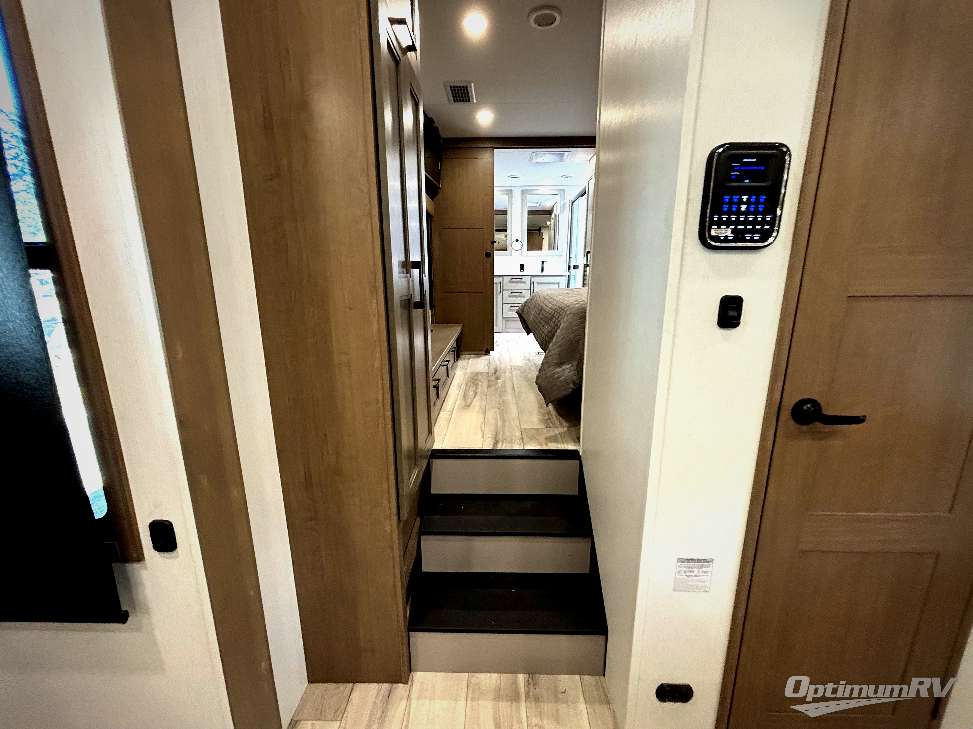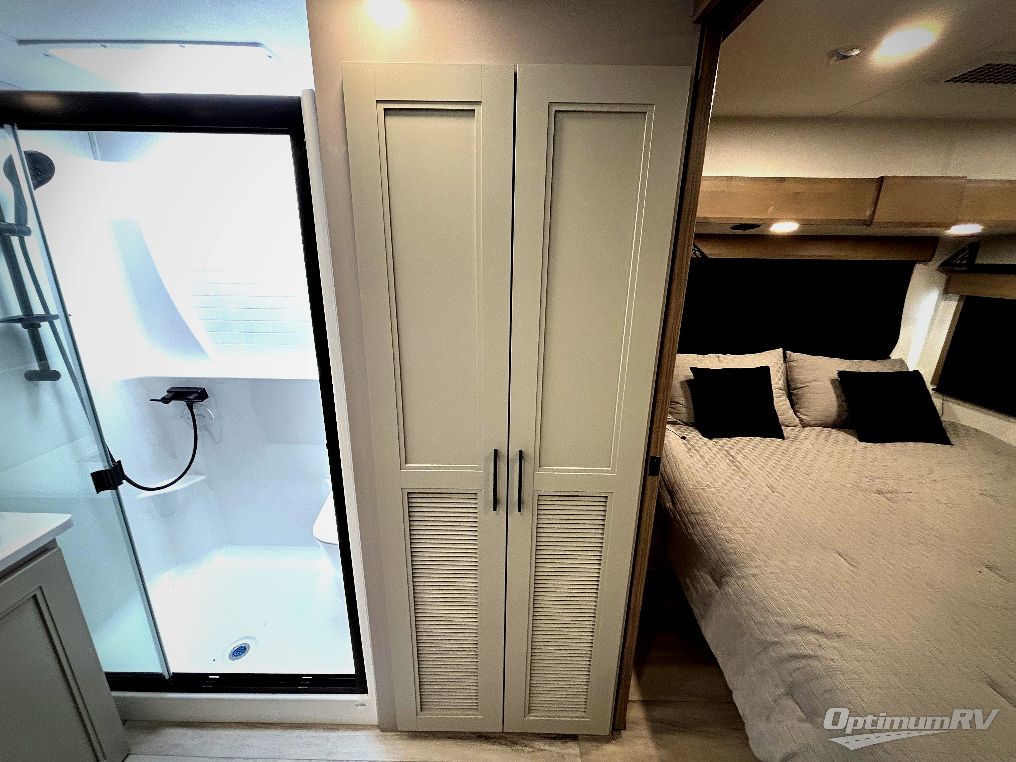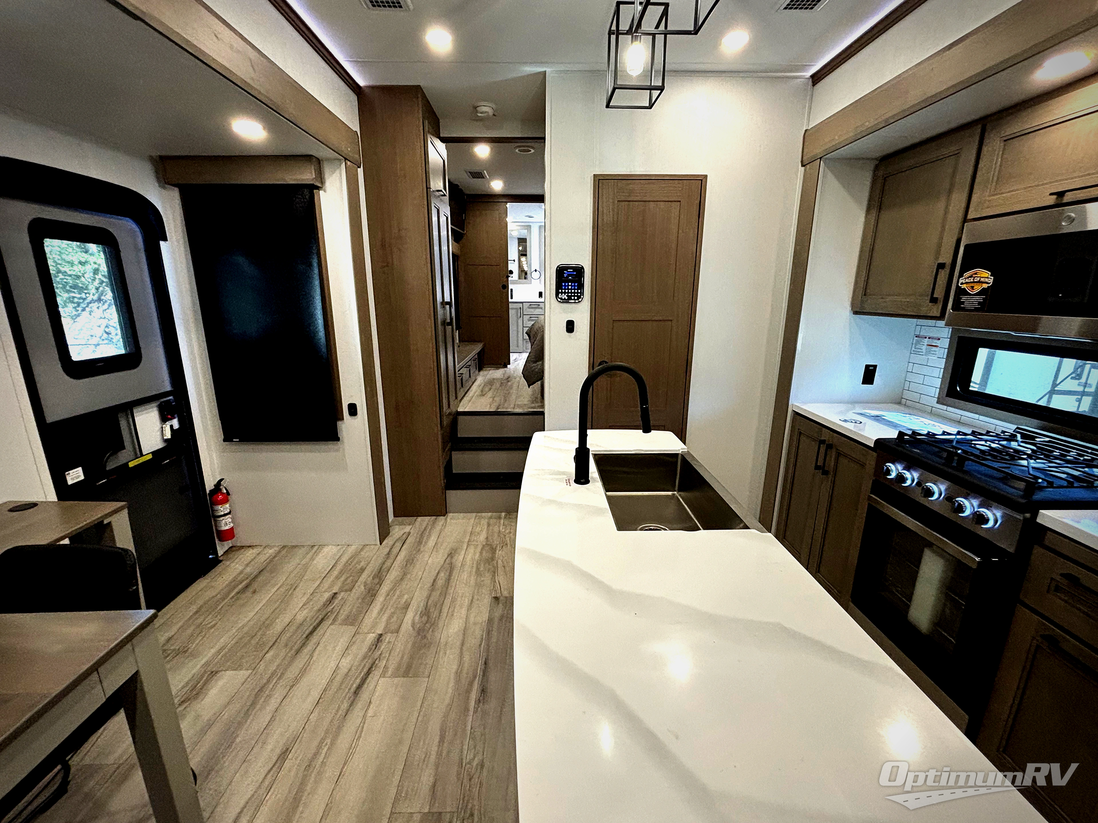 Fall in love with this unit's kitchen with residential appliances, a farmhouse stainless steel sink, a dishwasher, pantry, 26 cu refrigerator, and a sliding table/desk with chairs. Spend cozy entertainment nights watching the 65" LED TV with a fireplace below, a theater seating with USB ports, and two hide-a-bed sofa slides that widen this area so everyone can stretch out and relax. At night, retire to your private bedroom with a king electric tilt bed with drawers underneath, a 32" Smart LED TV, and, a closet, perfect for easy organization. Also, the full rear bathroom provides a residential shower with a seat plus linen storage, washer and dryer prep, and two sinks for more convenience. This model is also fitted with an exterior pass-through storage ideal for storing your things.