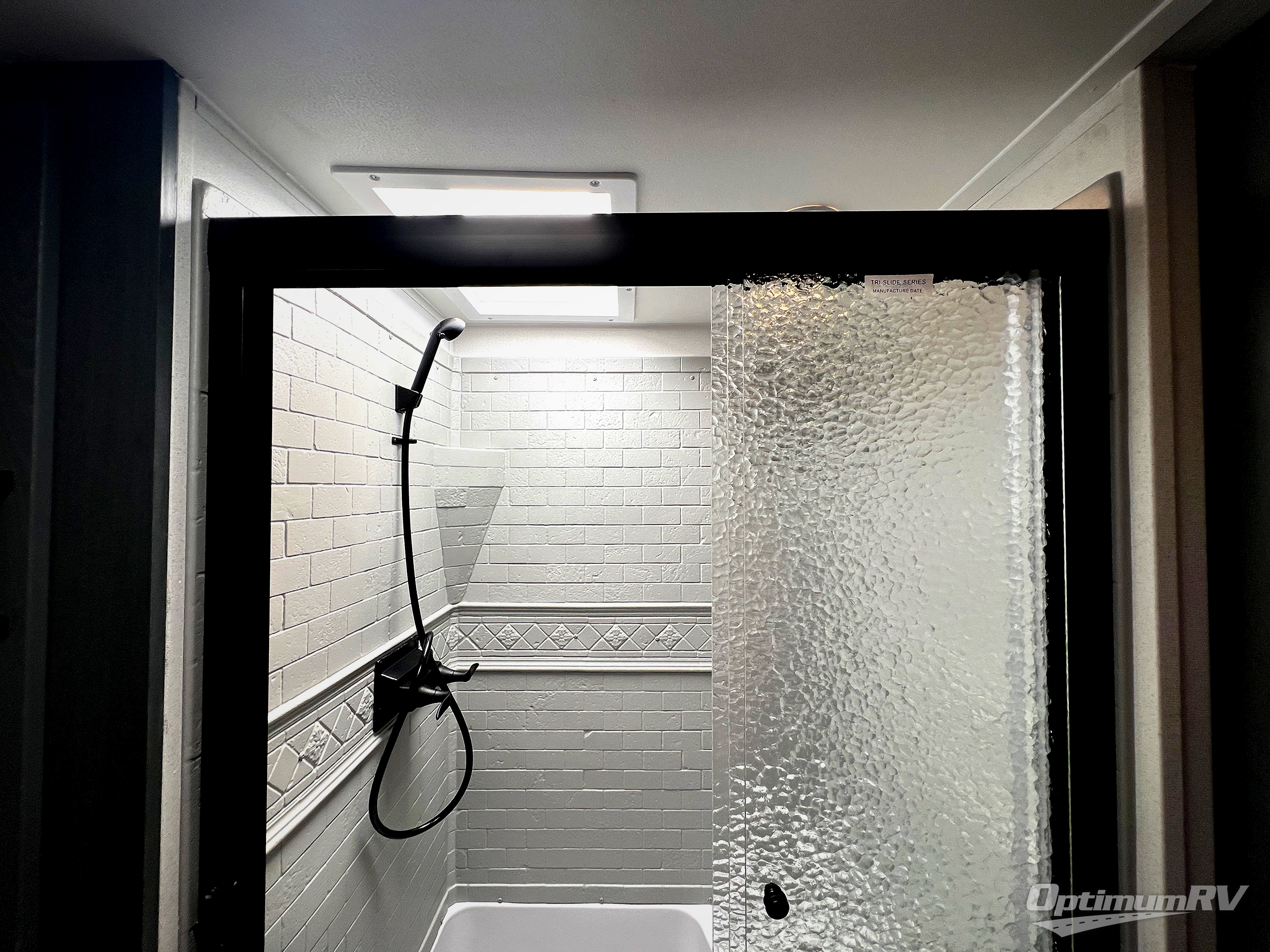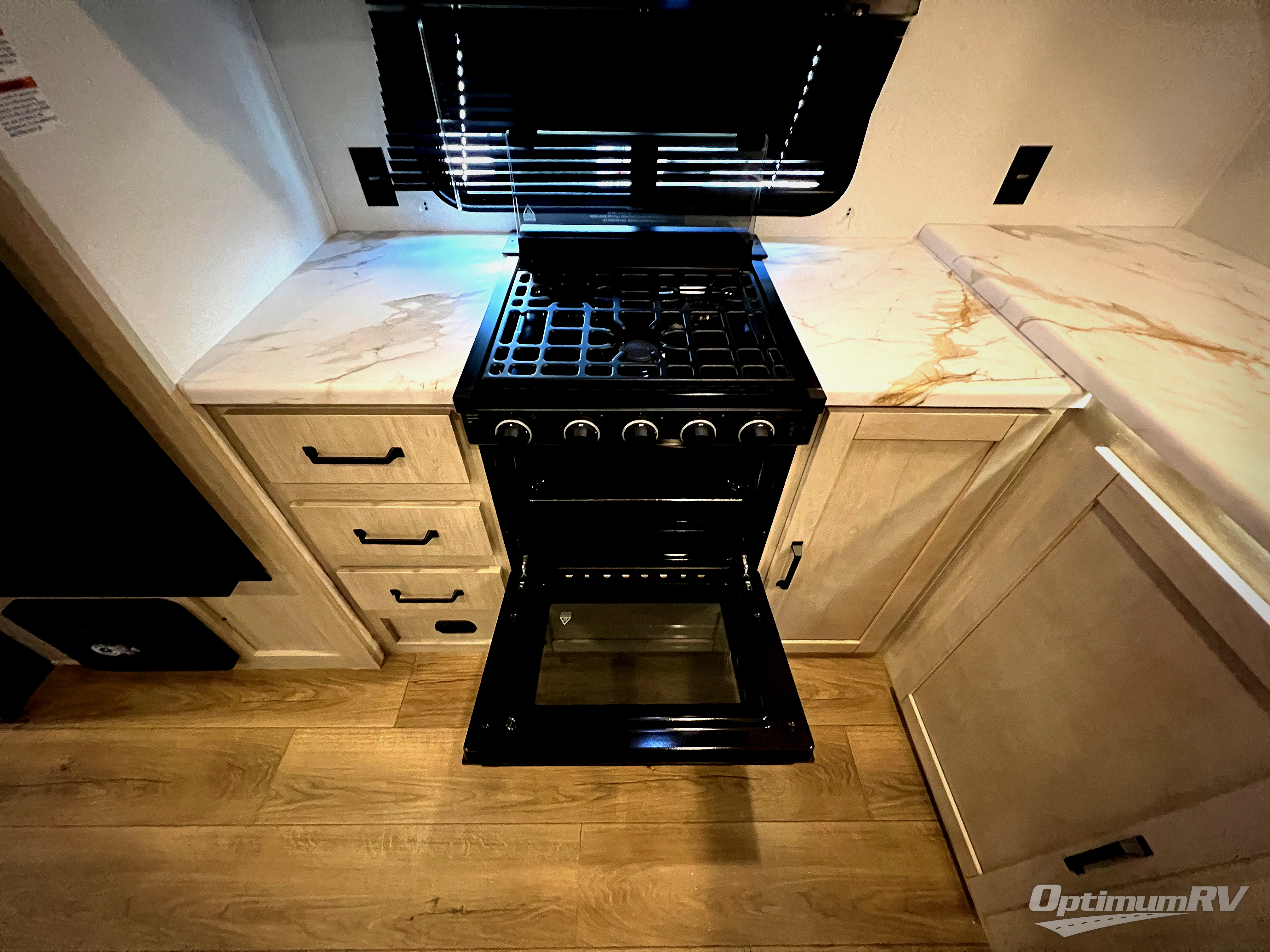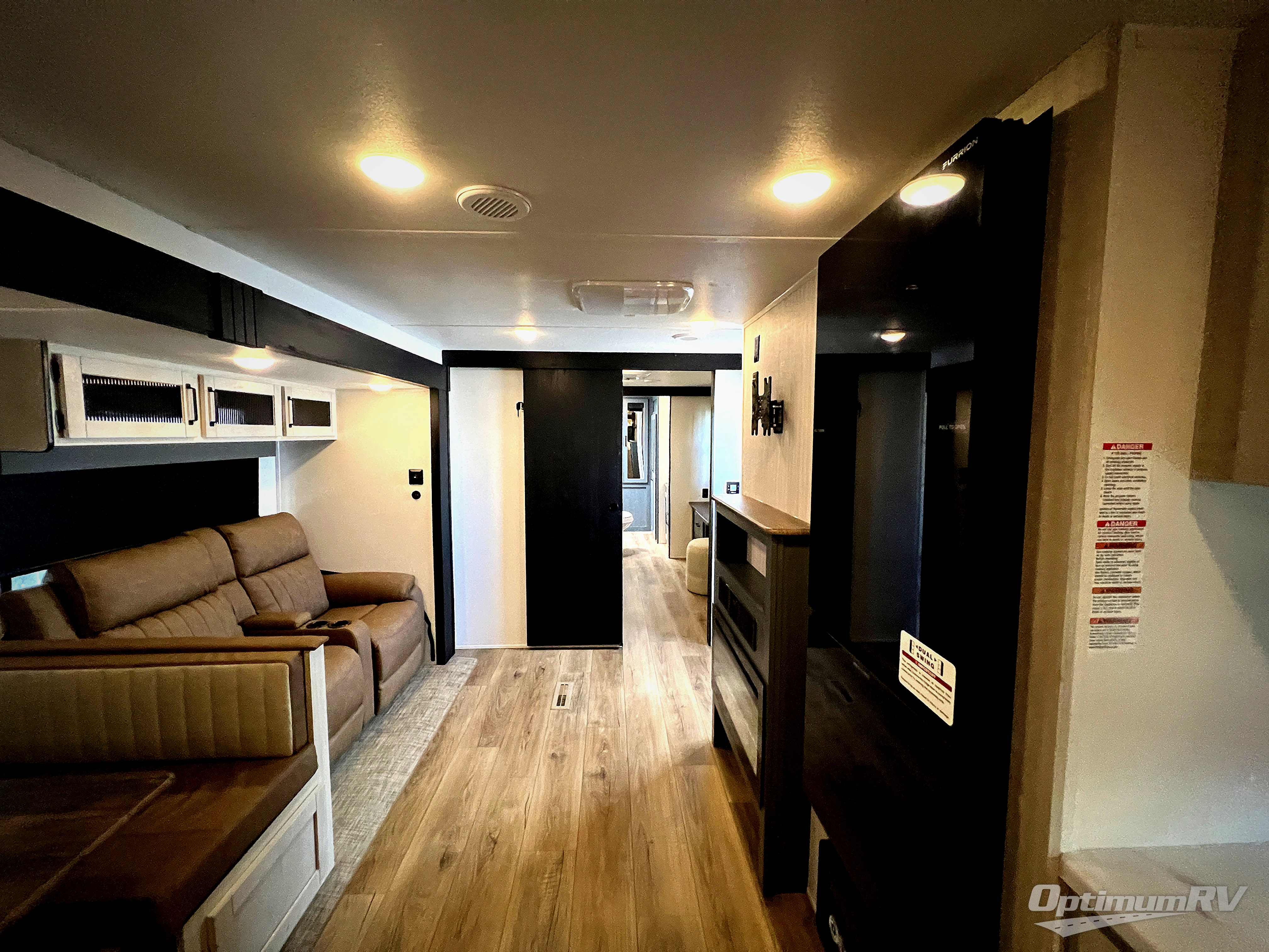 You'll love camping in this double slide out travel trailer with a rear kitchen and a spacious front bath! There is a 40" shower here, along with a linen closet, shirt closet, plus a closet with washer/dryer prep. The master bedroom includes a king bed slide out, dual bedroom dressers, a desk and a TV hookup if you want the option to watch movies in bed. The combined kitchen and living area is made open by the large slide out, which houses the sofa and booth dinette. These pieces of furniture area conveniently across from the entertainment center and fireplace to make it feel more like home. The chef of your group will appreciate generous counter space in the rear kitchen, and if they like to cook outdoors, and optional mini kitchen with a griddle can be added!