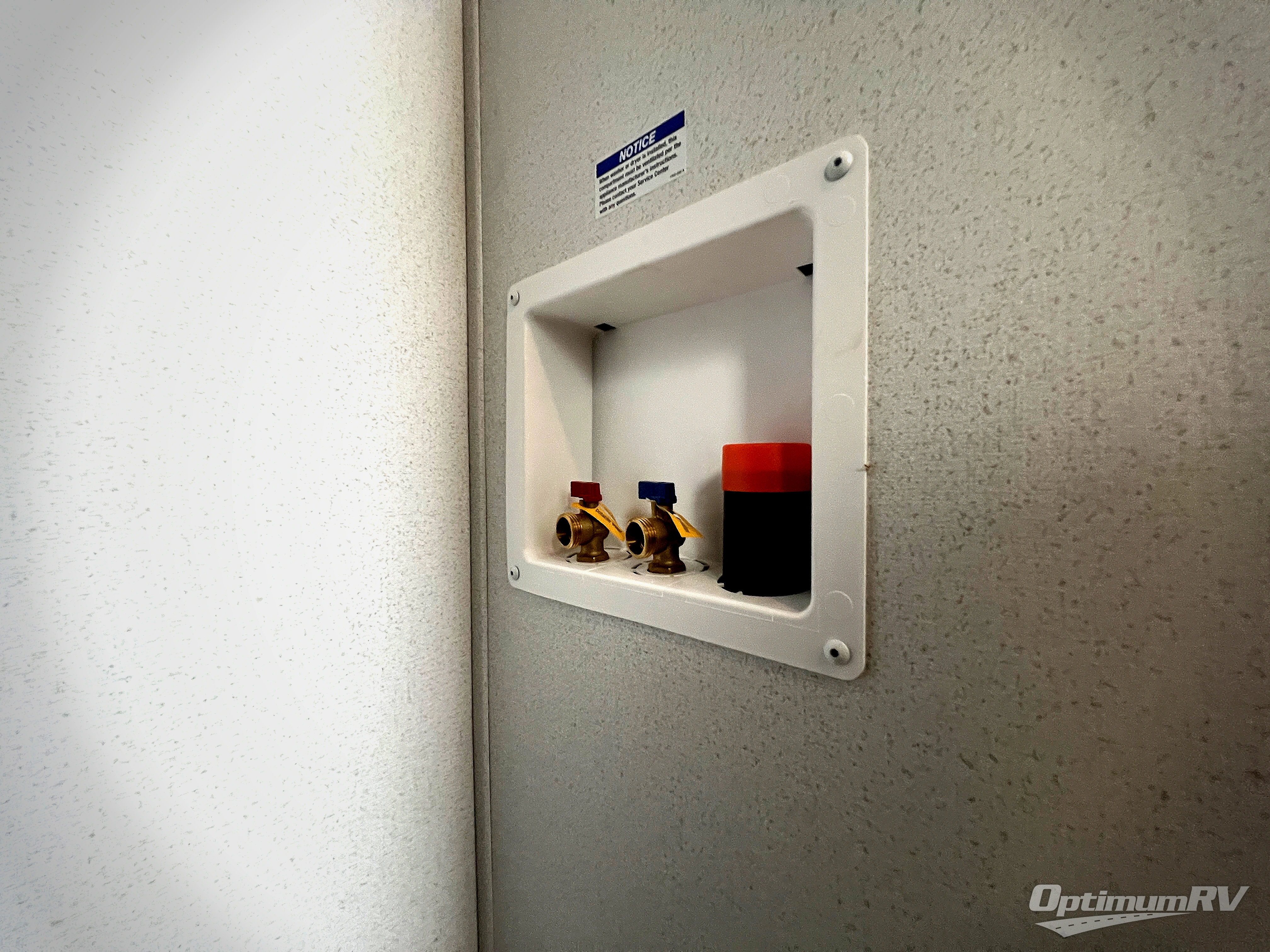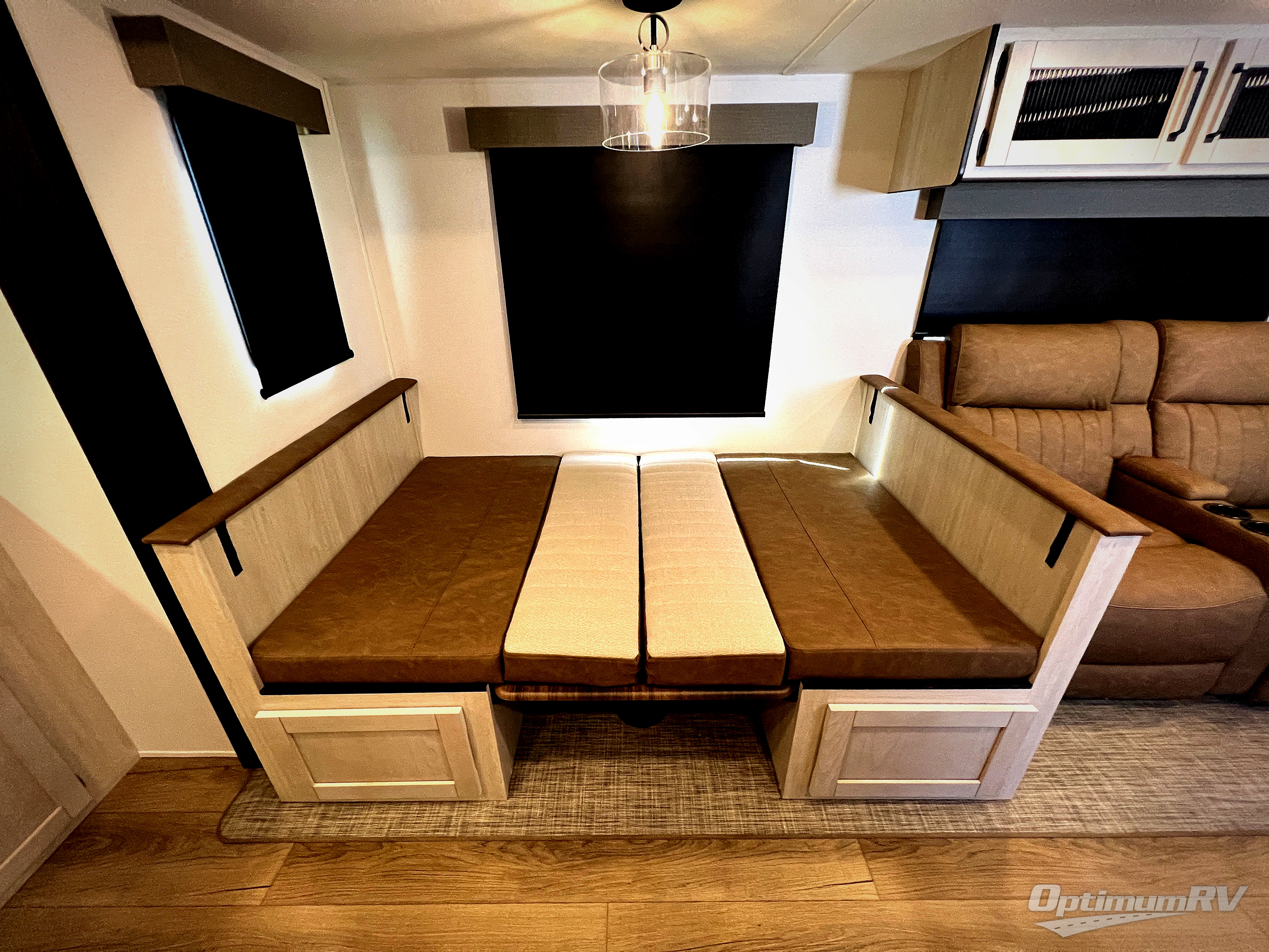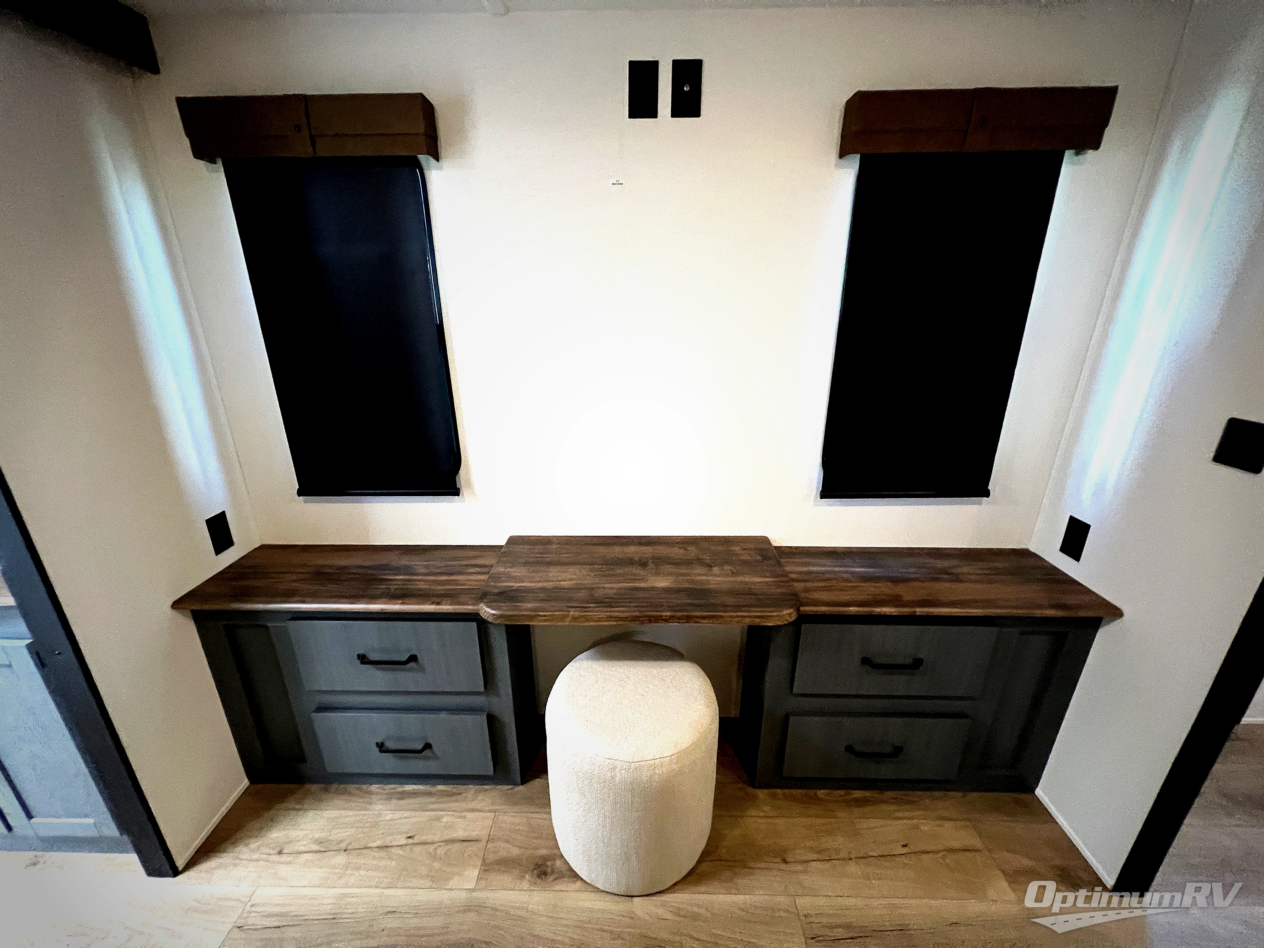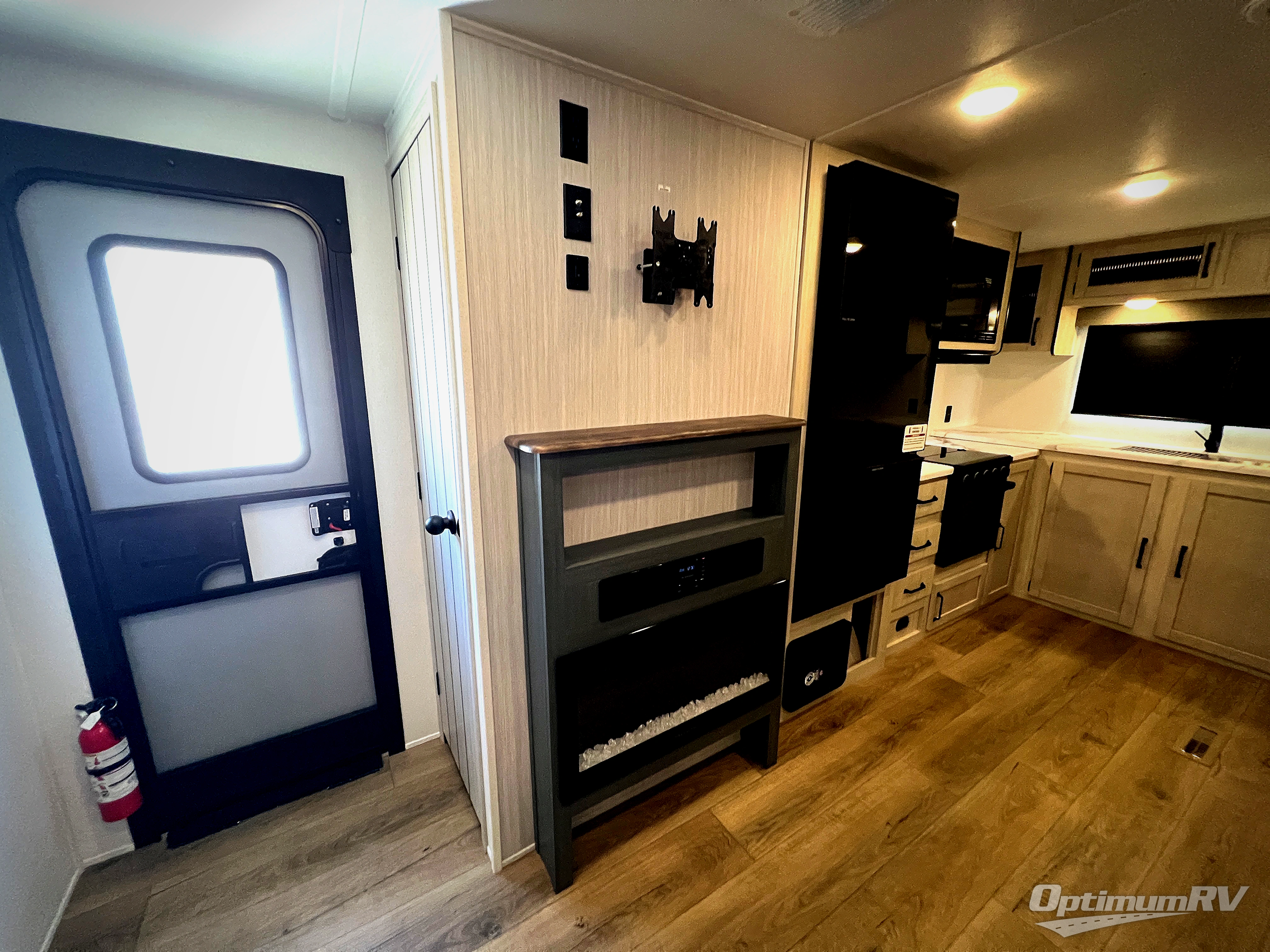You'll love camping in this double slide out travel trailer with a rear kitchen and a spacious front bath! There is a 40" shower here, along with a linen closet, shirt closet, plus a closet with washer/dryer prep. The master bedroom includes a king bed slide out, dual bedroom dressers, a desk and a TV hookup if you want the option to watch movies in bed. The combined kitchen and living area is made open by the large slide out, which houses the sofa and booth dinette. These pieces of furniture area conveniently across from the entertainment center and fireplace to make it feel more like home. The chef of your group will appreciate generous counter space in the rear kitchen, and if they like to cook outdoors, and optional mini kitchen with a griddle can be added!