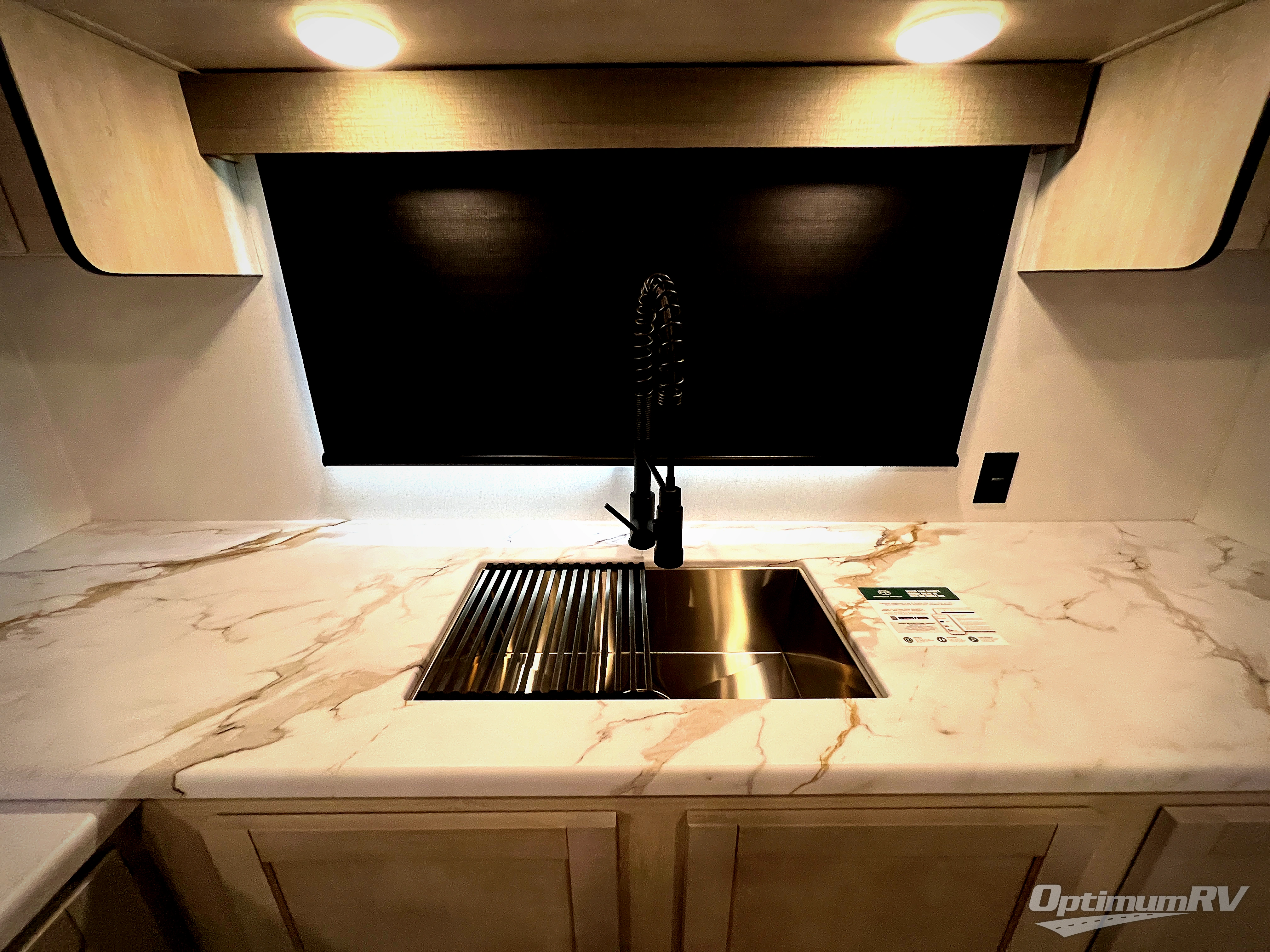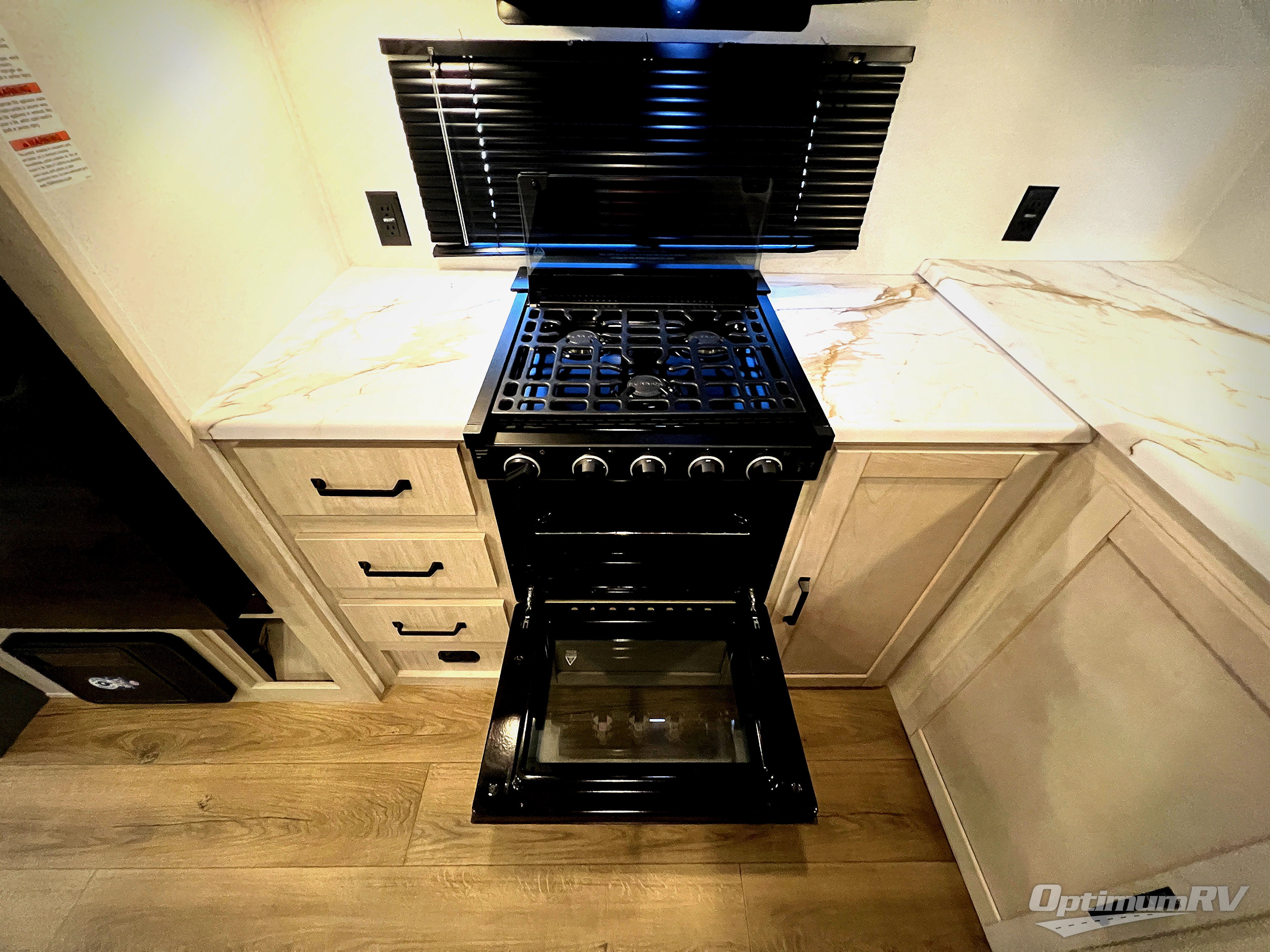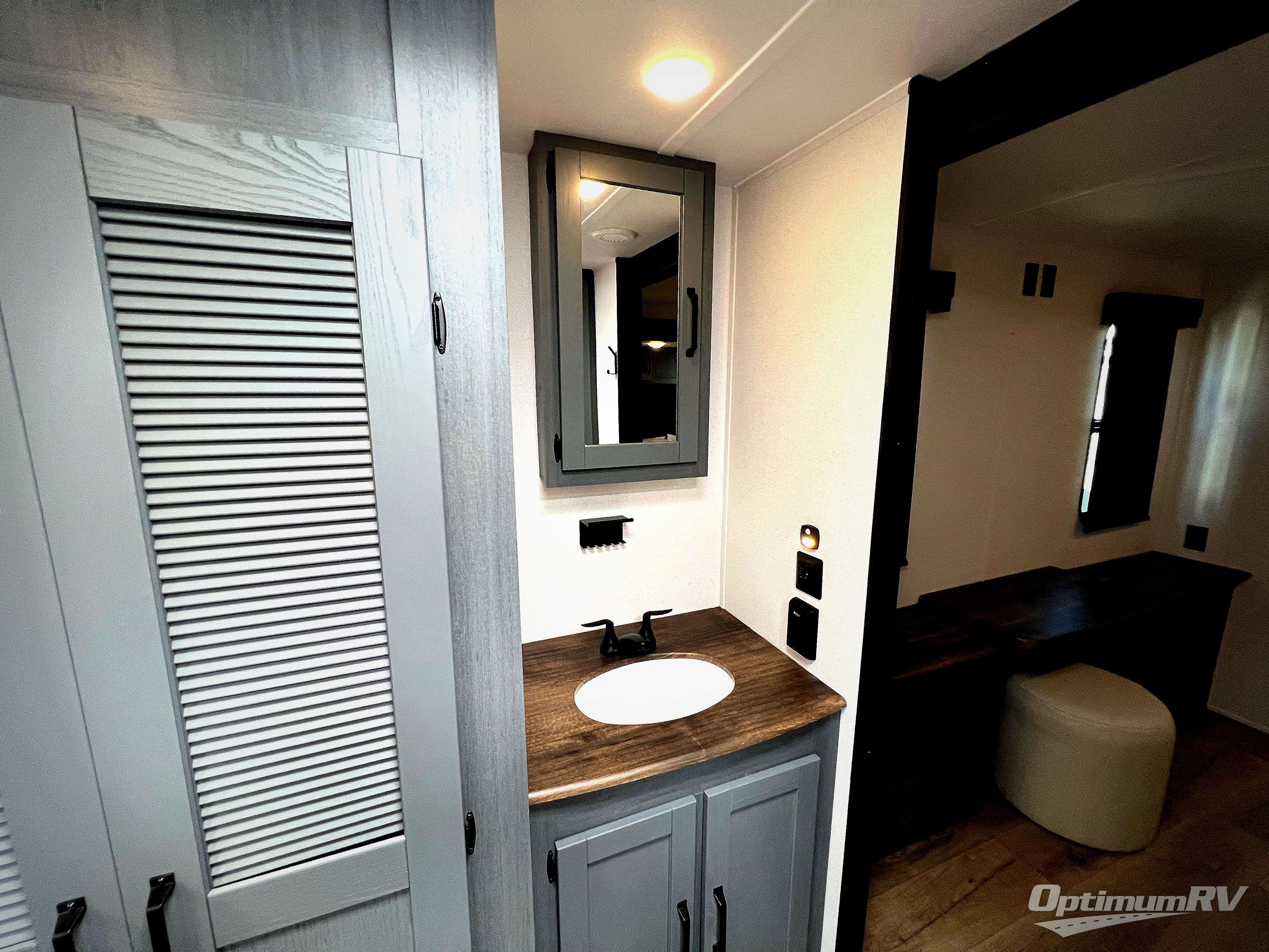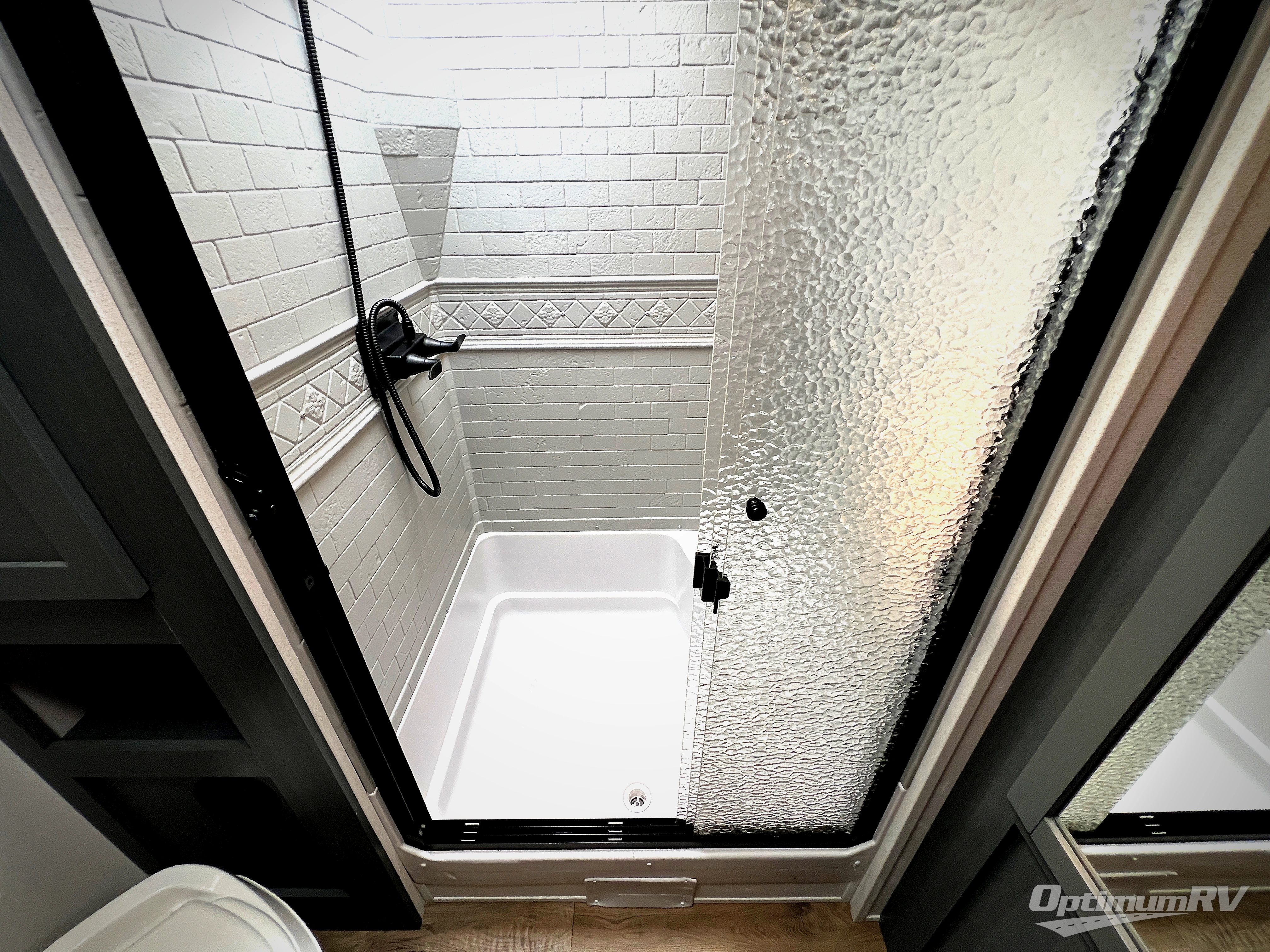 You'll love camping in this double slide out travel trailer with a rear kitchen and a spacious front bath! There is a 40" shower here, along with a linen closet, shirt closet, plus a closet with washer/dryer prep. The master bedroom includes a king bed slide out, dual bedroom dressers, a desk and a TV hookup if you want the option to watch movies in bed. The combined kitchen and living area is made open by the large slide out, which houses the sofa and booth dinette. These pieces of furniture area conveniently across from the entertainment center and fireplace to make it feel more like home. The chef of your group will appreciate generous counter space in the rear kitchen, and if they like to cook outdoors, and optional mini kitchen with a griddle can be added!