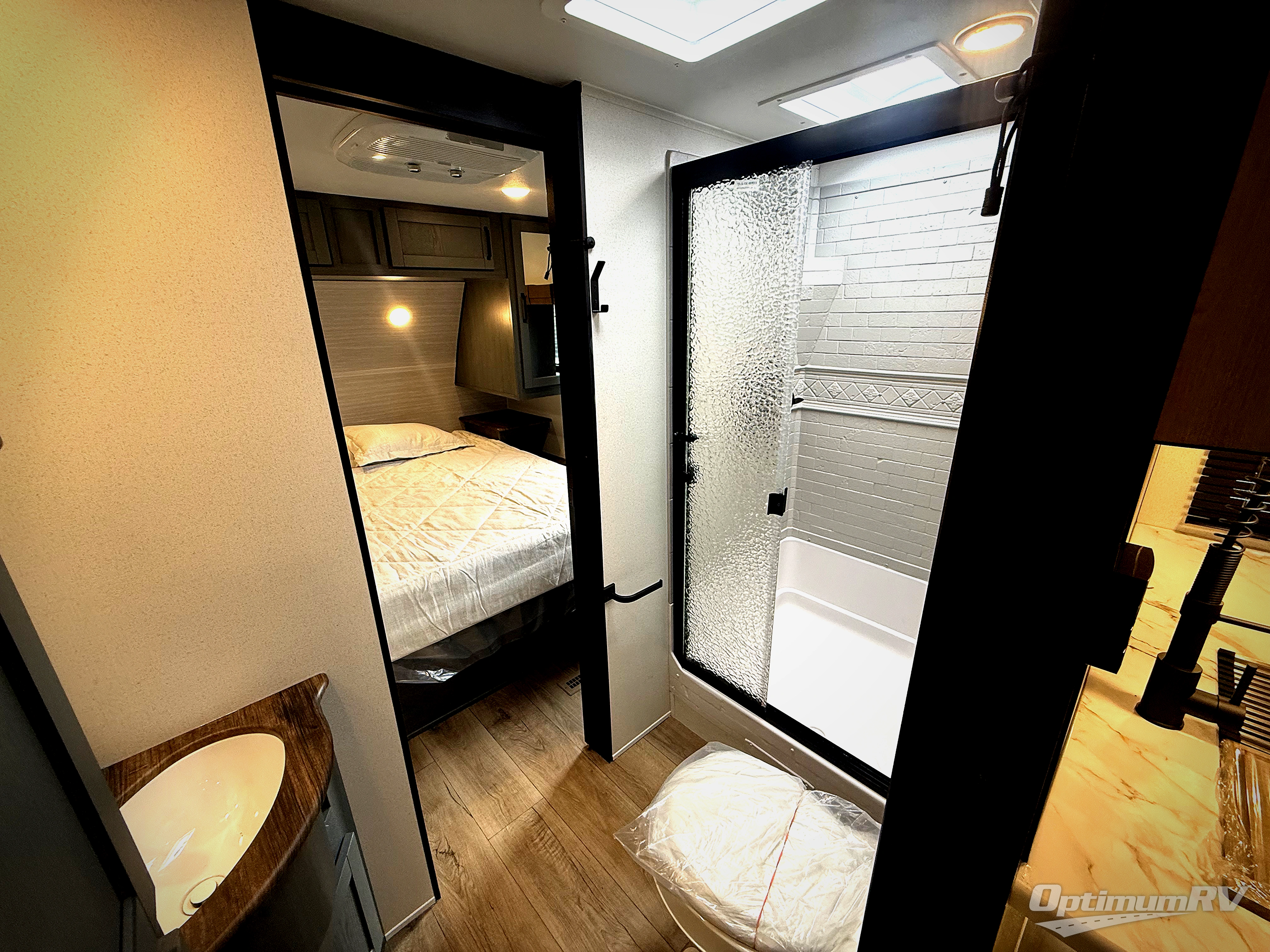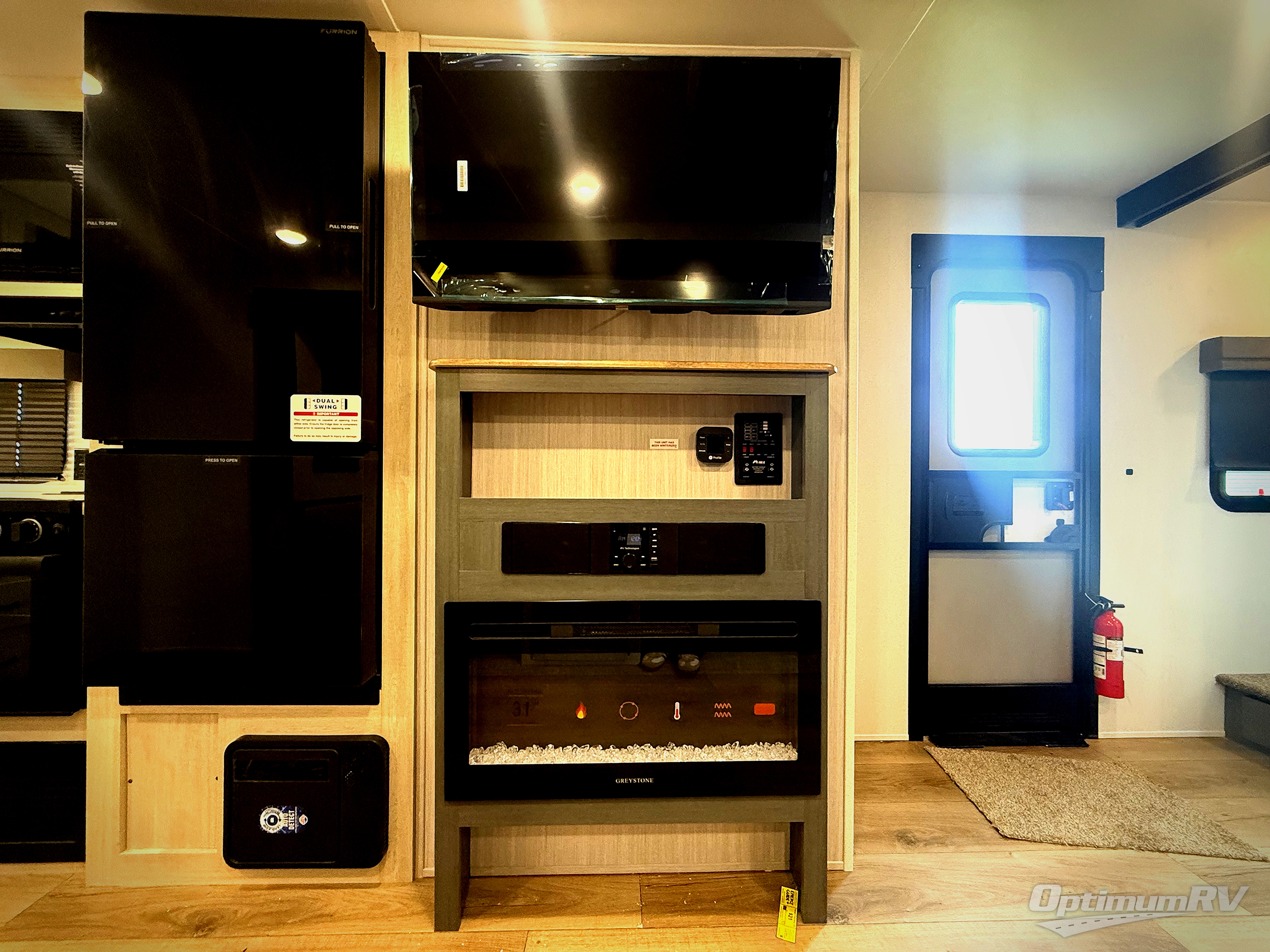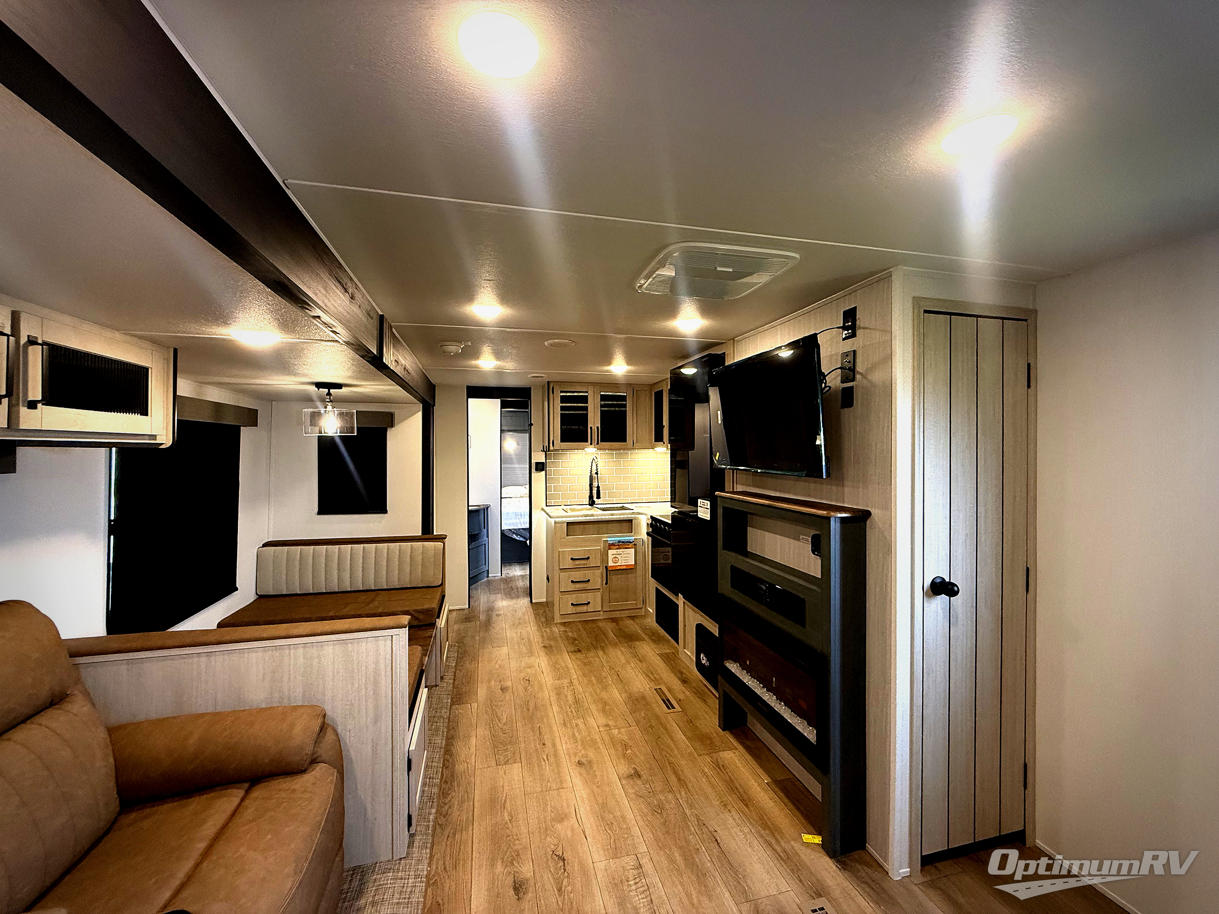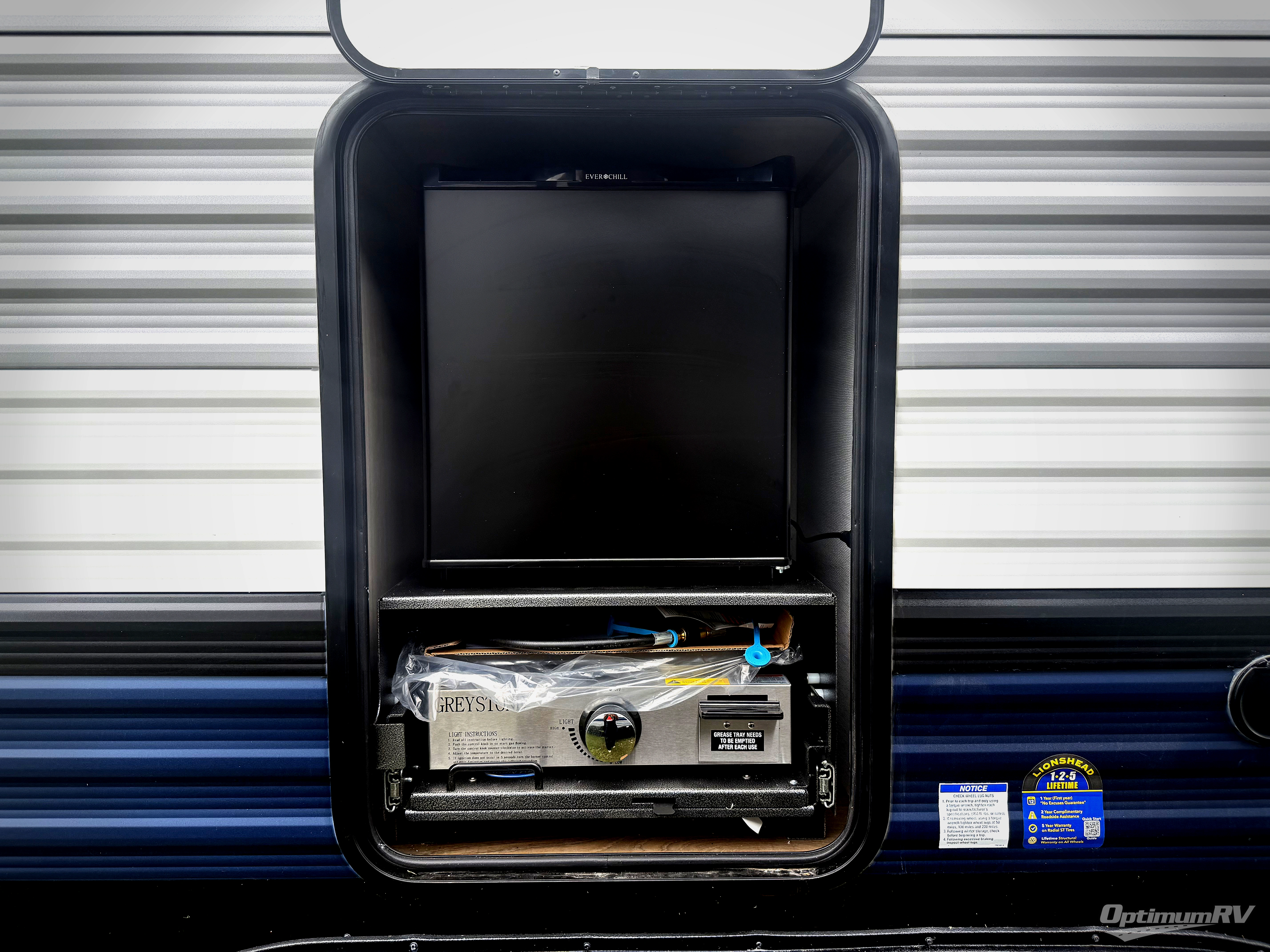 This travel trailer is perfect for camping with a larger group of friends or if you have older kids since there are two private bunkrooms! Each room includes a bunk bed and storage space for clothes, shoes, and more. You'll enjoy your own space up front in the master bedroom that includes a queen bed, dual shirt closets, and one of the dual entry doors to the unit for added convenience. Everyone can come together in the combined living area and kitchen that includes a large slide out with a sofa and booth dinette, plus there is a fireplace to make this space feel more like home. A full kitchen inside lets you create home-cooked meals each day, and you can choose to add the optional micro kitchen with a griddle for a pancake breakfast outdoors!