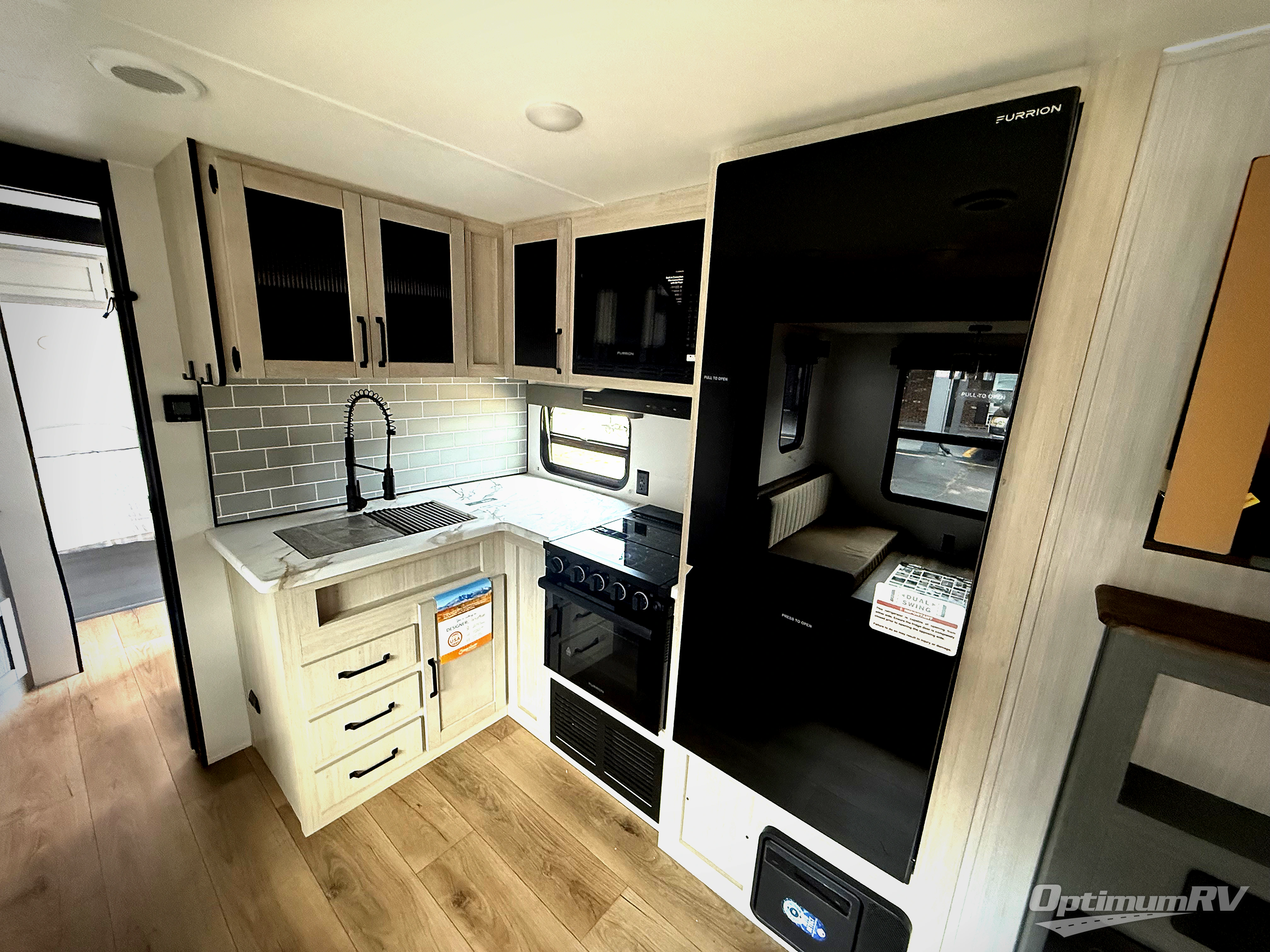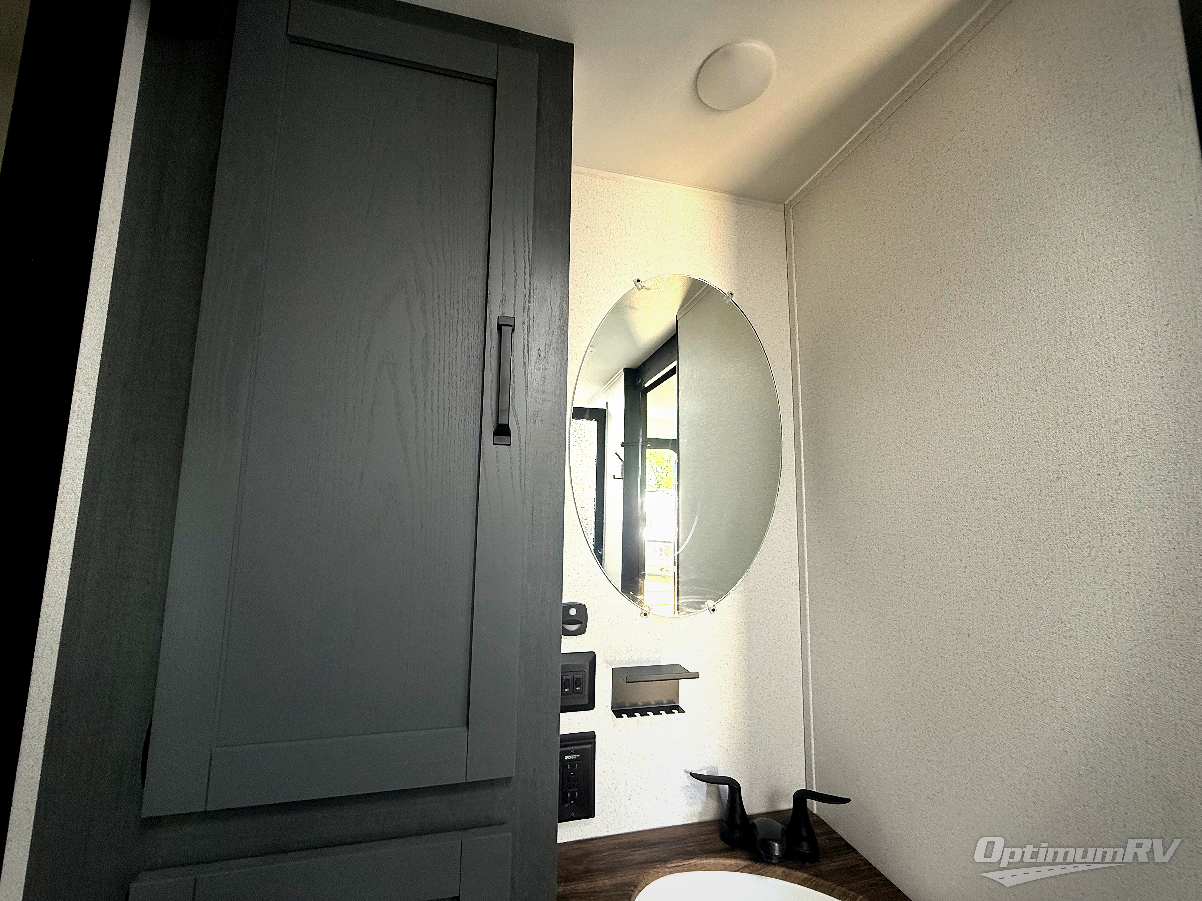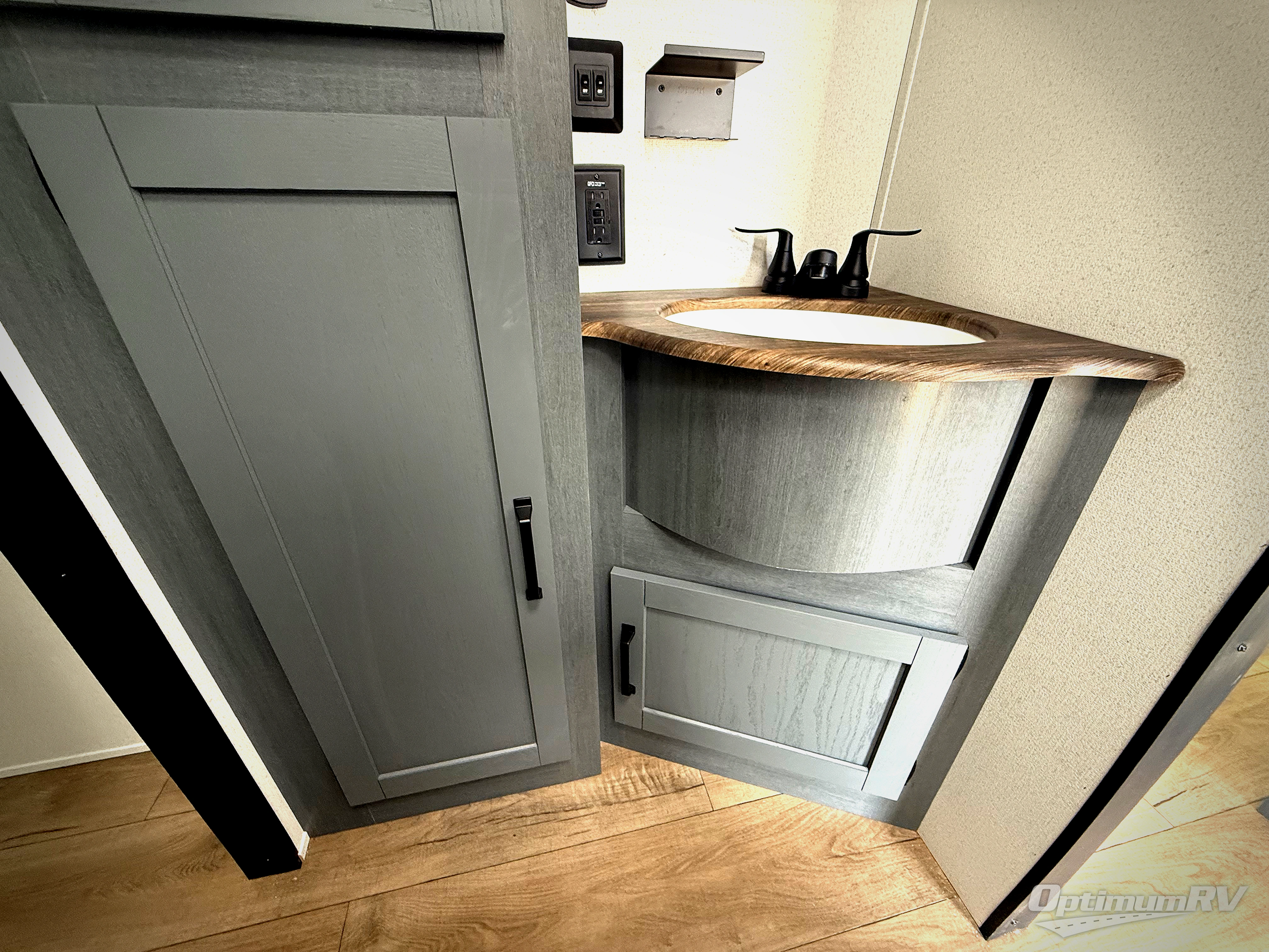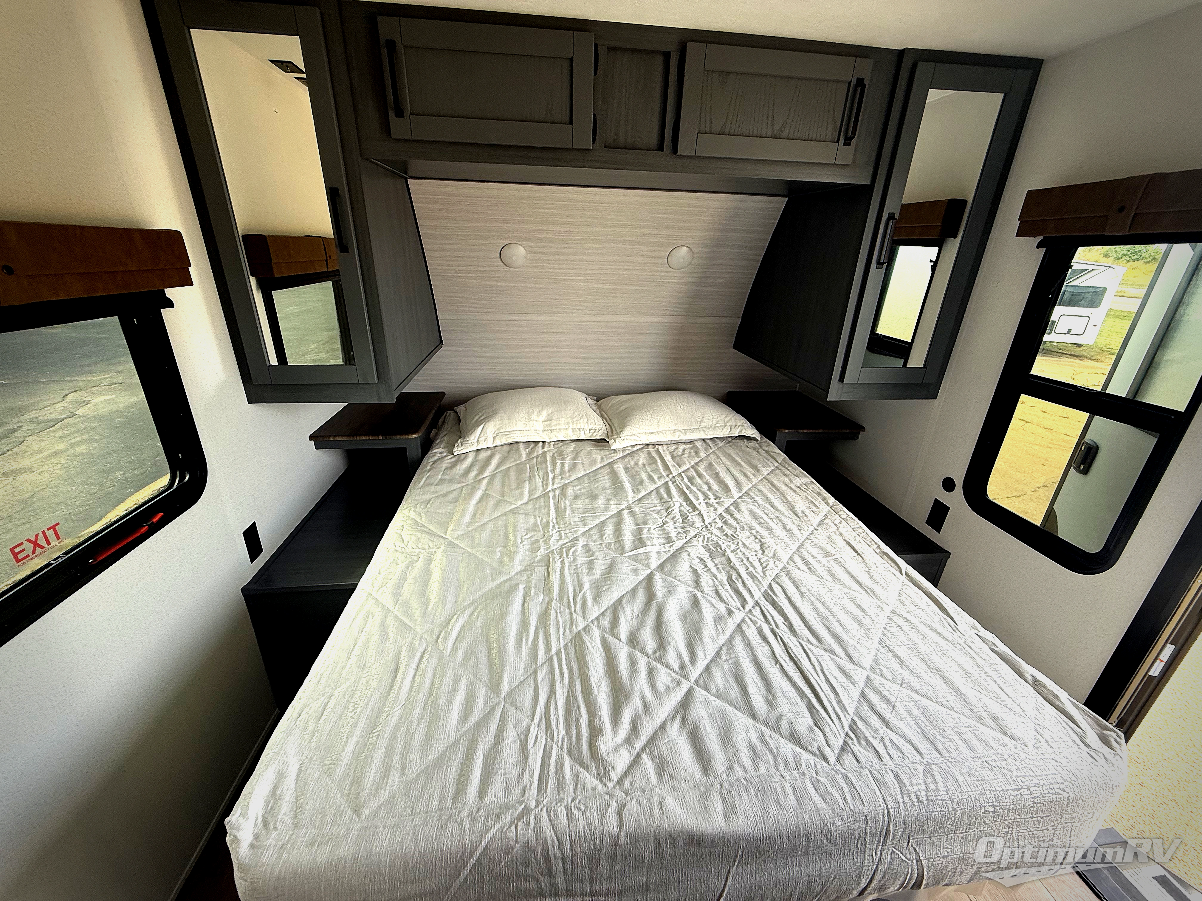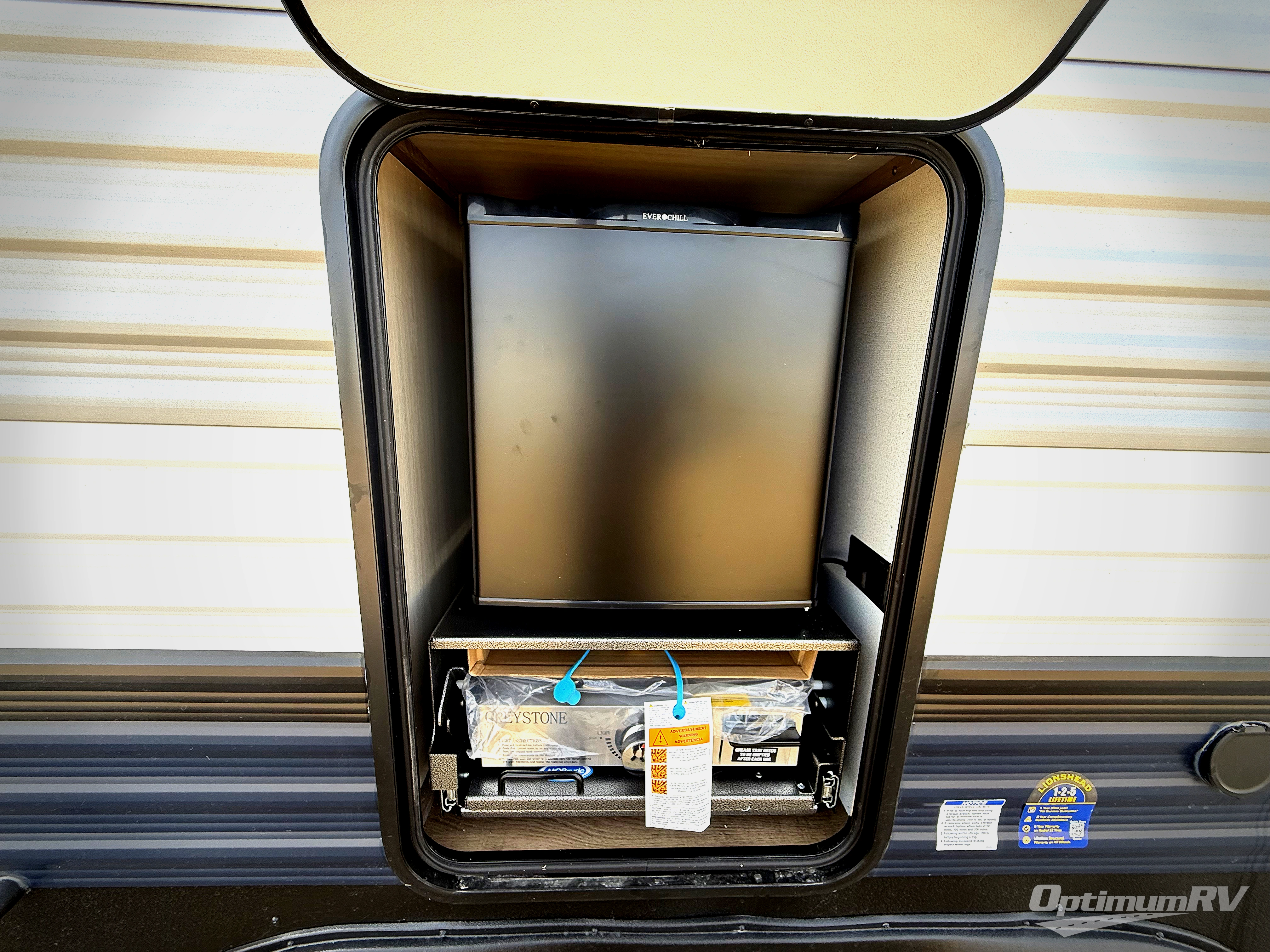 This travel trailer is perfect for camping with a larger group of friends or if you have older kids since there are two private bunkrooms! Each room includes a bunk bed and storage space for clothes, shoes, and more. You'll enjoy your own space up front in the master bedroom that includes a queen bed, dual shirt closets, and one of the dual entry doors to the unit for added convenience. Everyone can come together in the combined living area and kitchen that includes a large slide out with a sofa and booth dinette, plus there is a fireplace to make this space feel more like home. A full kitchen inside lets you create home-cooked meals each day, and you can choose to add the optional micro kitchen with a griddle for a pancake breakfast outdoors!