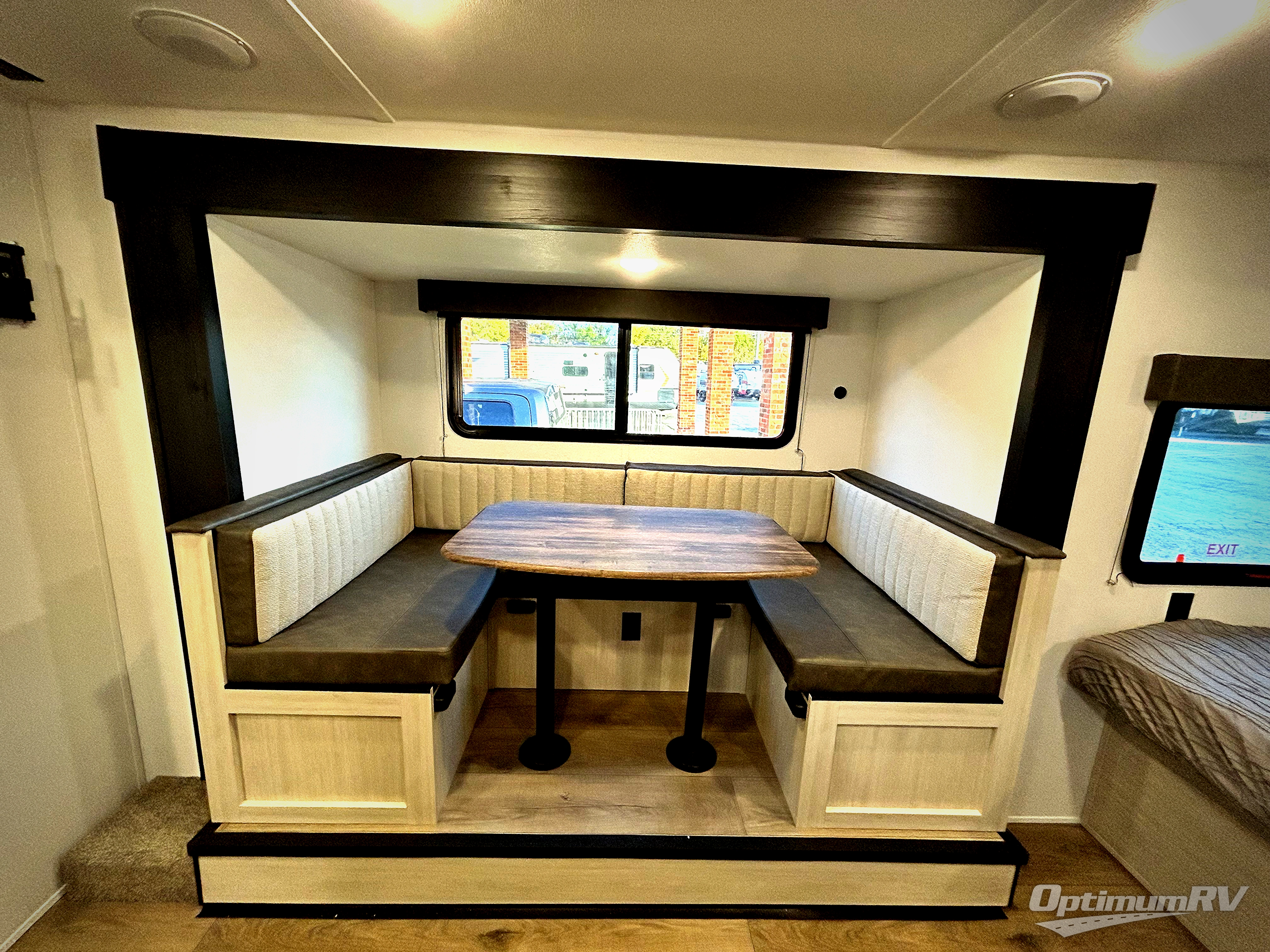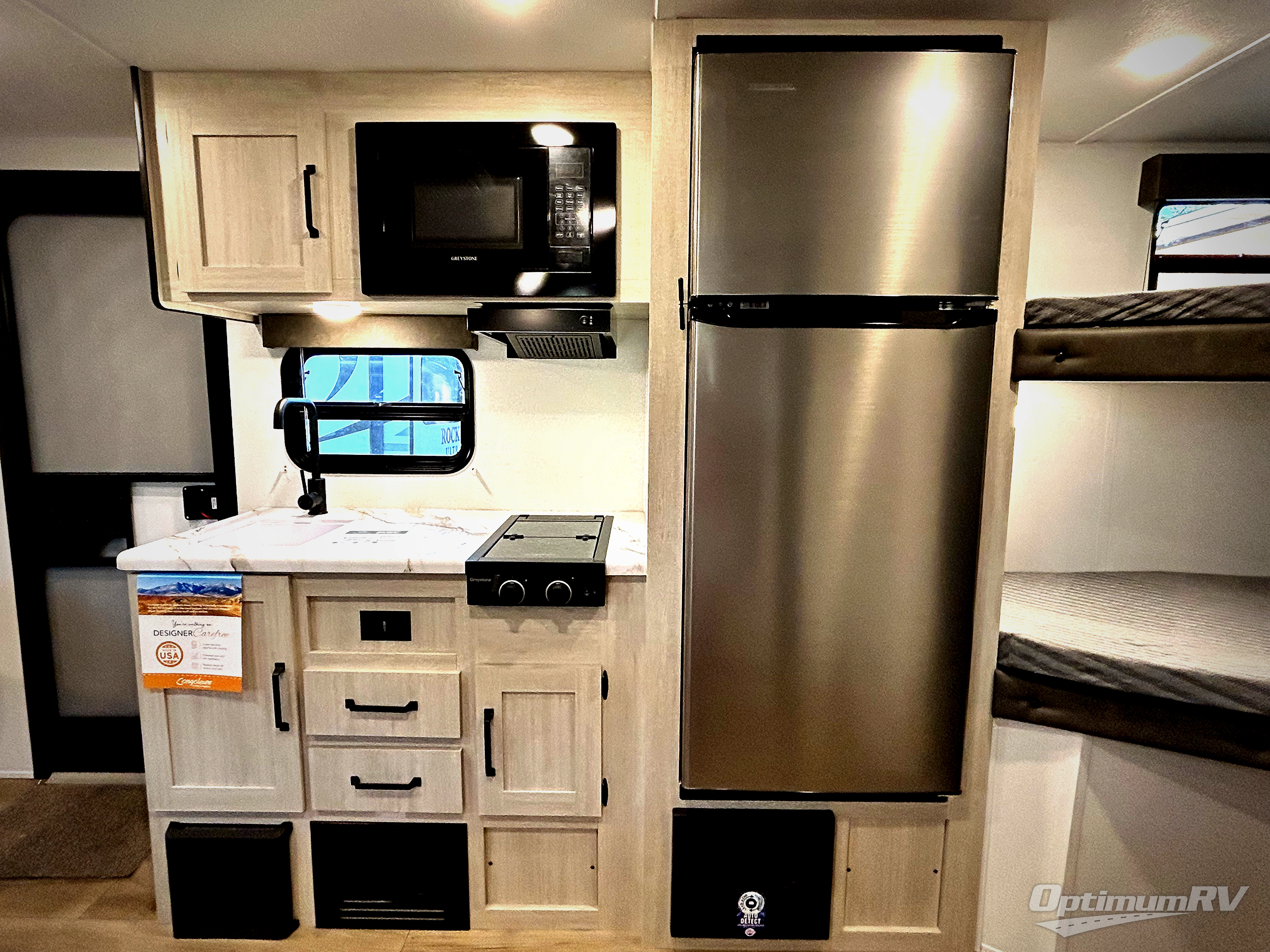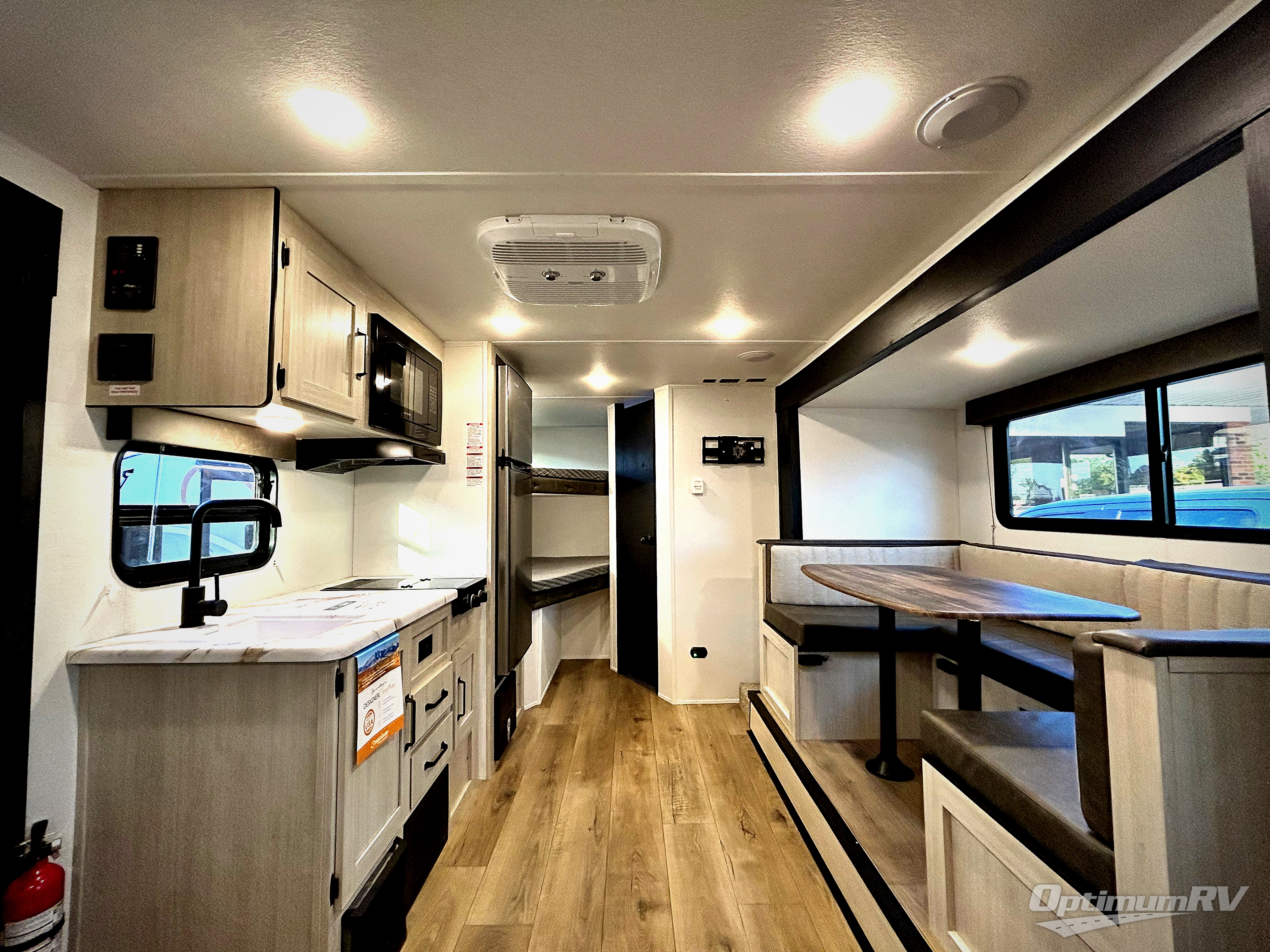 The whole gang will love camping in this travel trailer since there are double-size bunks for compact sleeping spaces and a slide out for more space to relax! The front RV queen bed is sure to provide a great night's rest, and you can choose the optional Murphy bed if you're needing more seating space during the day. Once you've made dinner on the two burner cooktop, you can dine around the U-shaped dinette. And an optional mini kitchen with a griddle is available if you'd rather cook outdoors! This unit includes ample storage space for your things, including exterior storage and storage under the bunks!