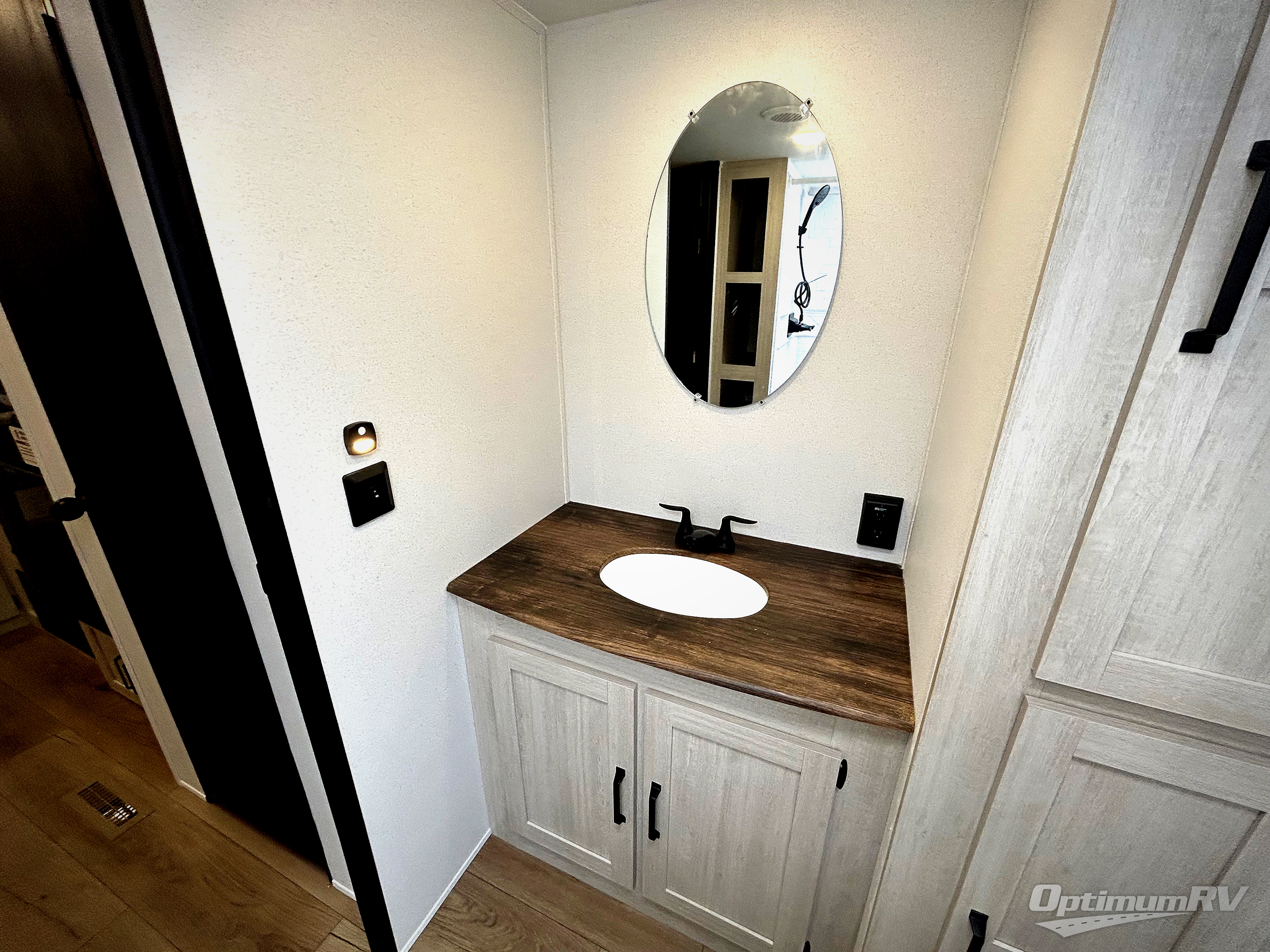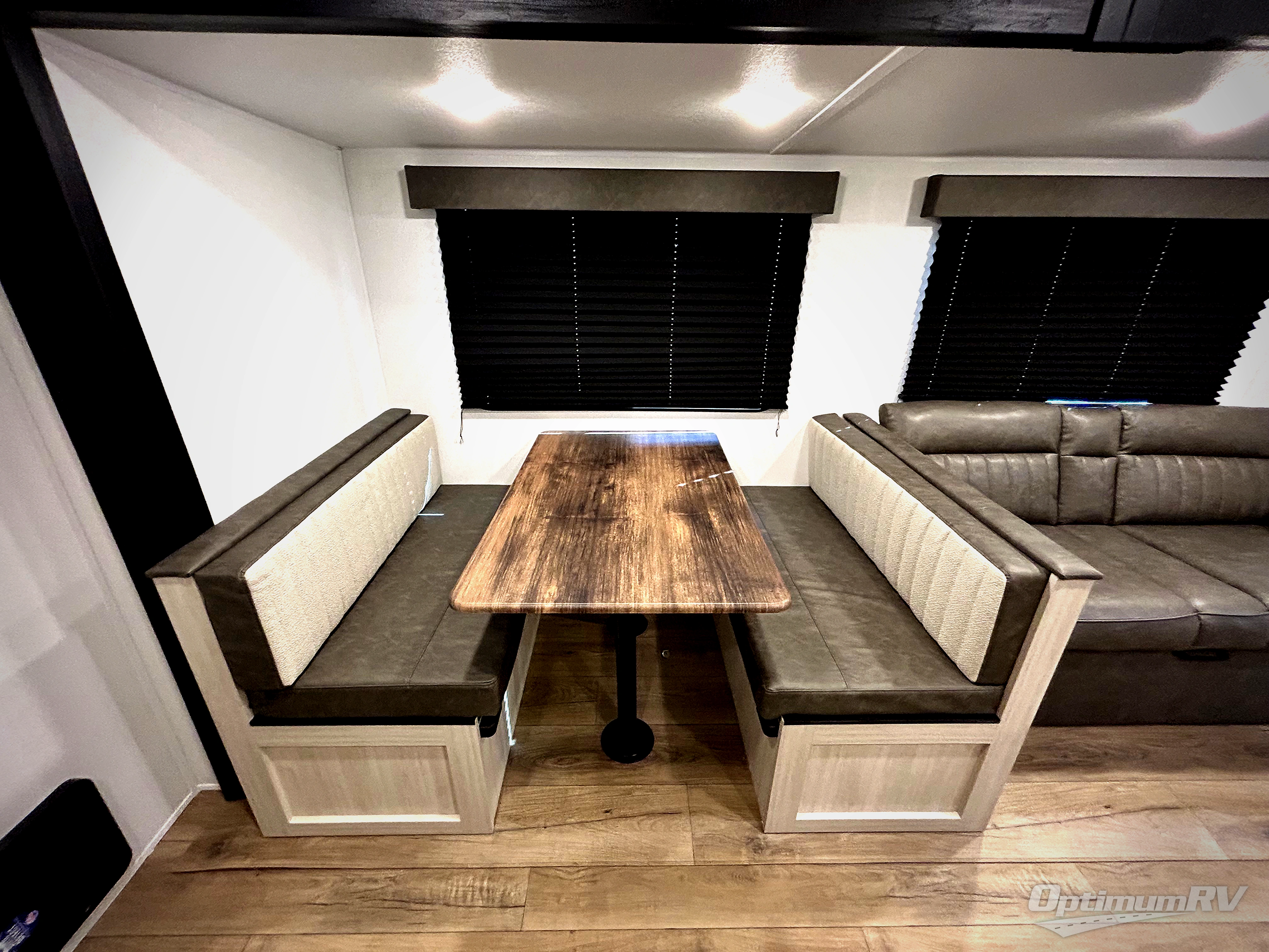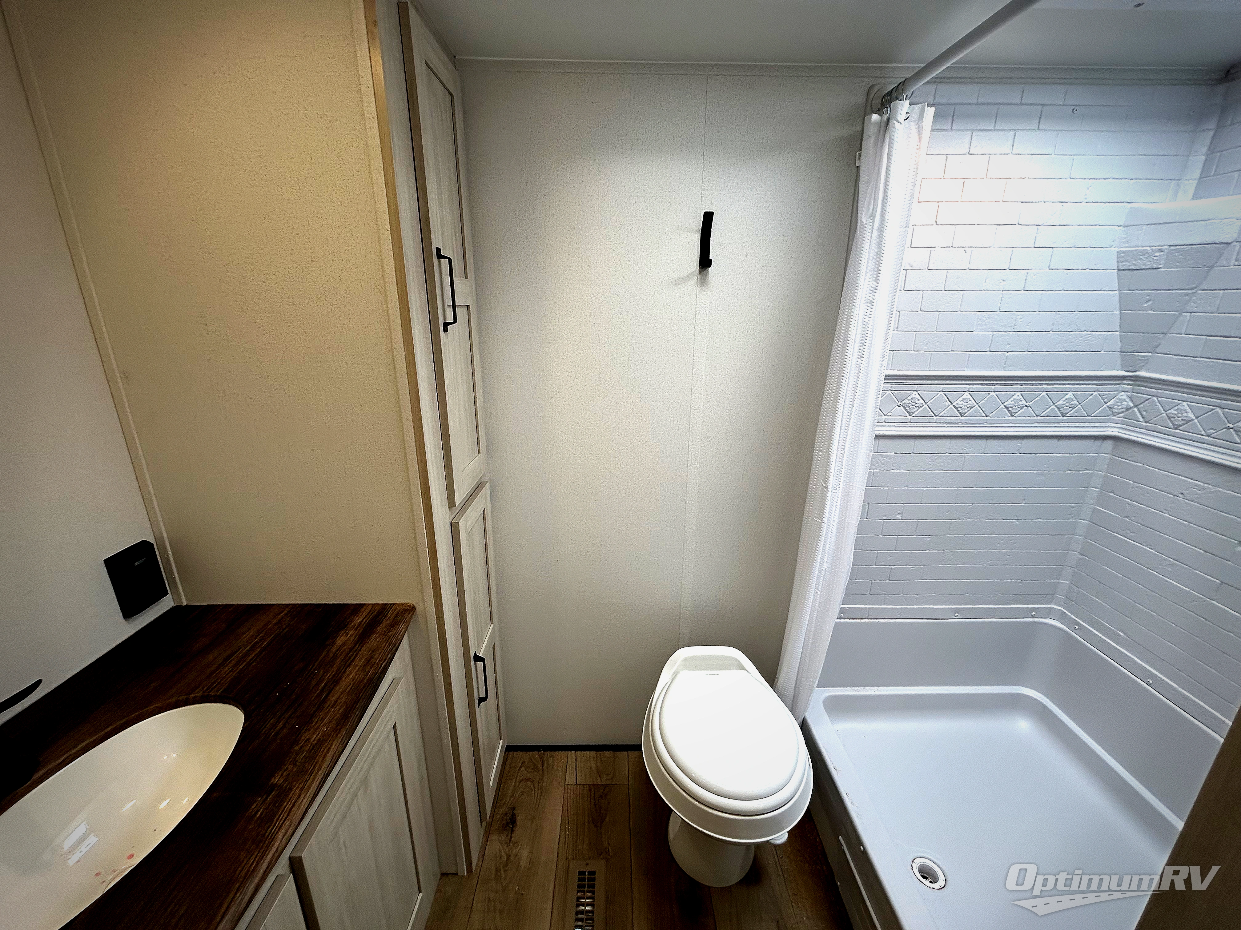 Wherever you decide to camp, you can be sure to have a great time in this rear bath travel trailer! The combined kitchen and living area is made spacious thanks to the large slide out. Here, you can relax on the sofa and dine at the booth dinette, and an optional TV can be added if you want the option for movie night. The full kitchen will allow you to make meals each day, and you can choose to add the optional outside mini kitchen with a griddle if you want to cook with fresh air. This unit also includes a front private bedroom, complete with an RV queen bed, an overhead shelf and dual shirt closets to keep clothes wrinkle-free.