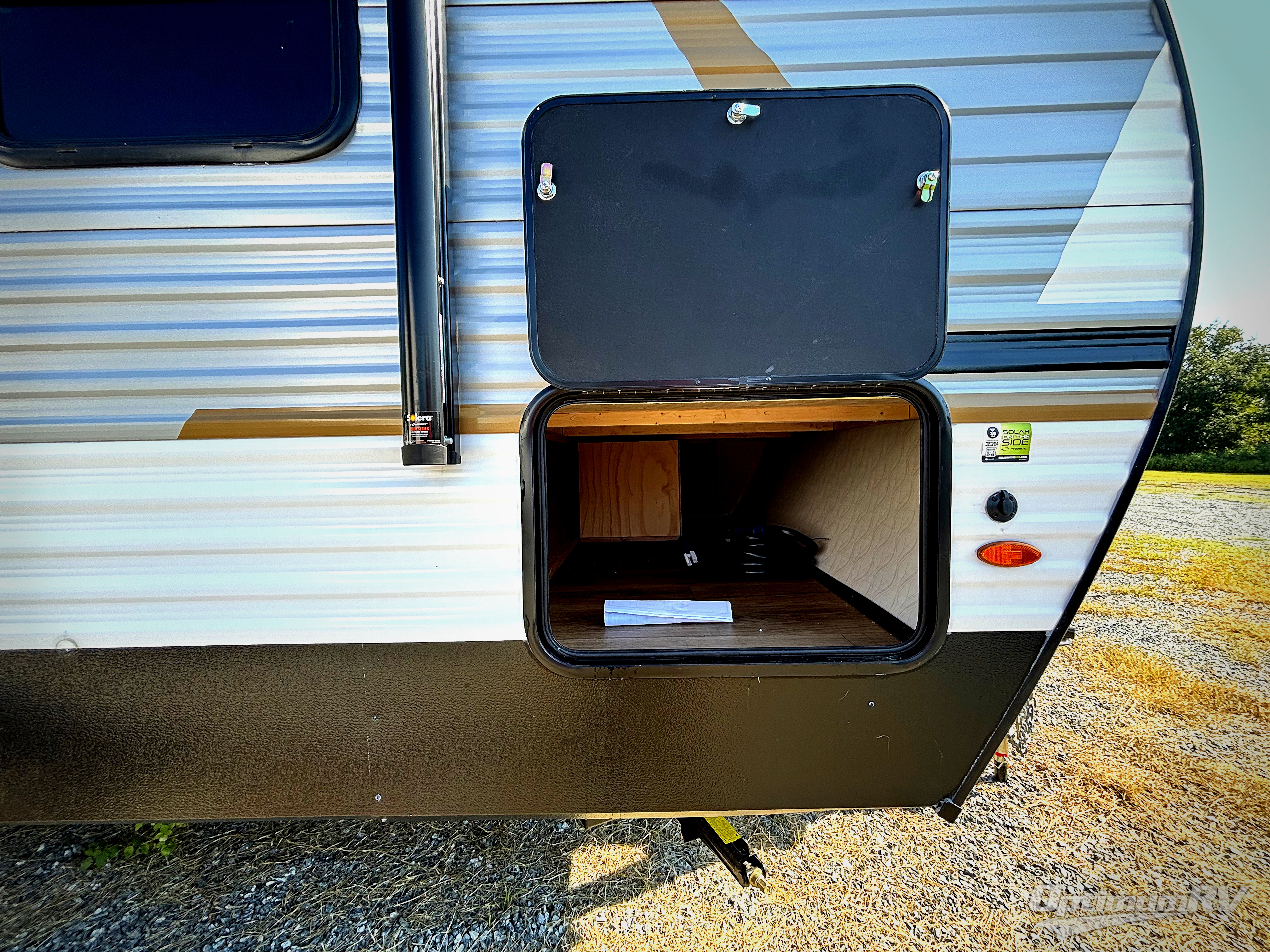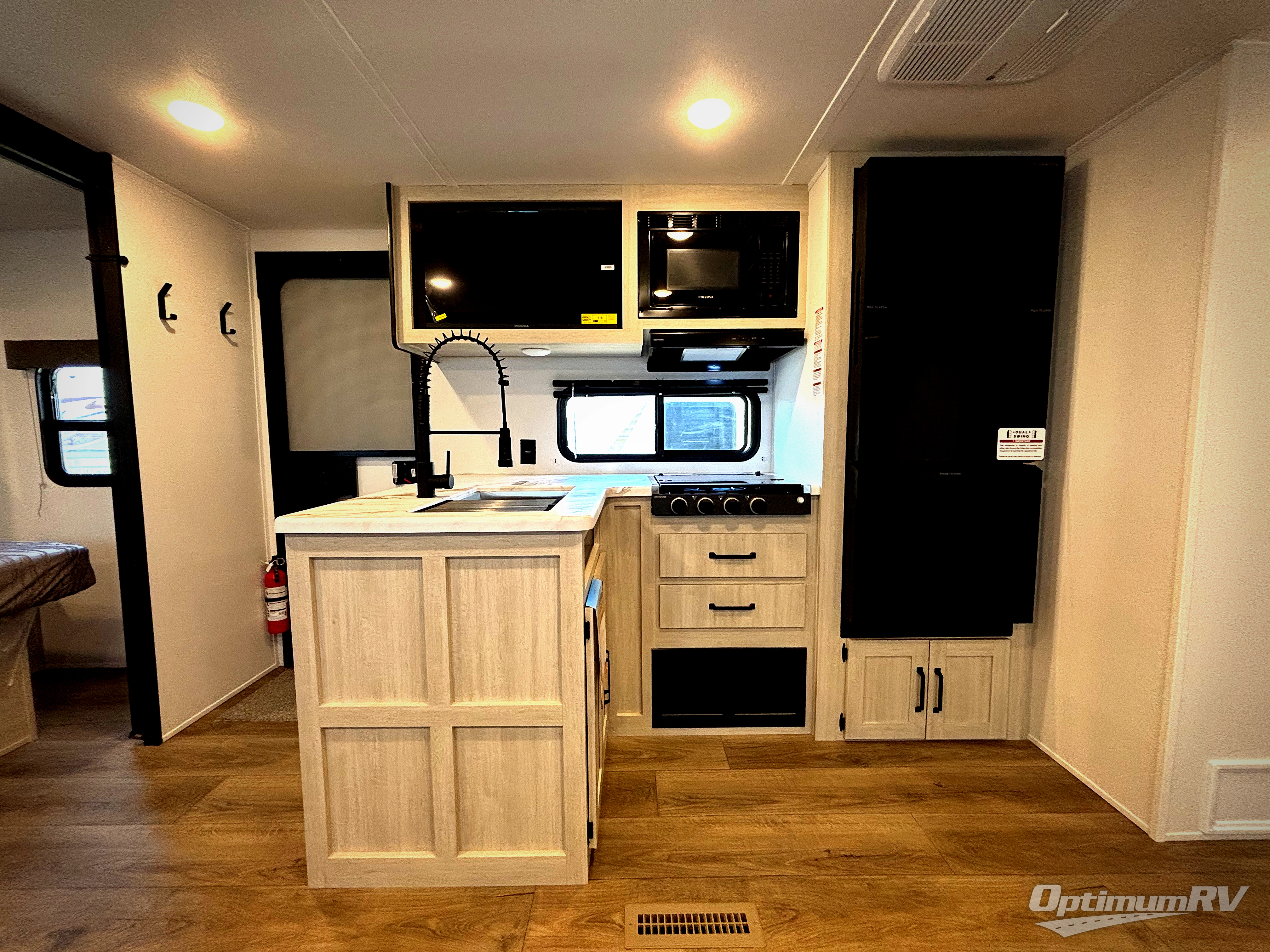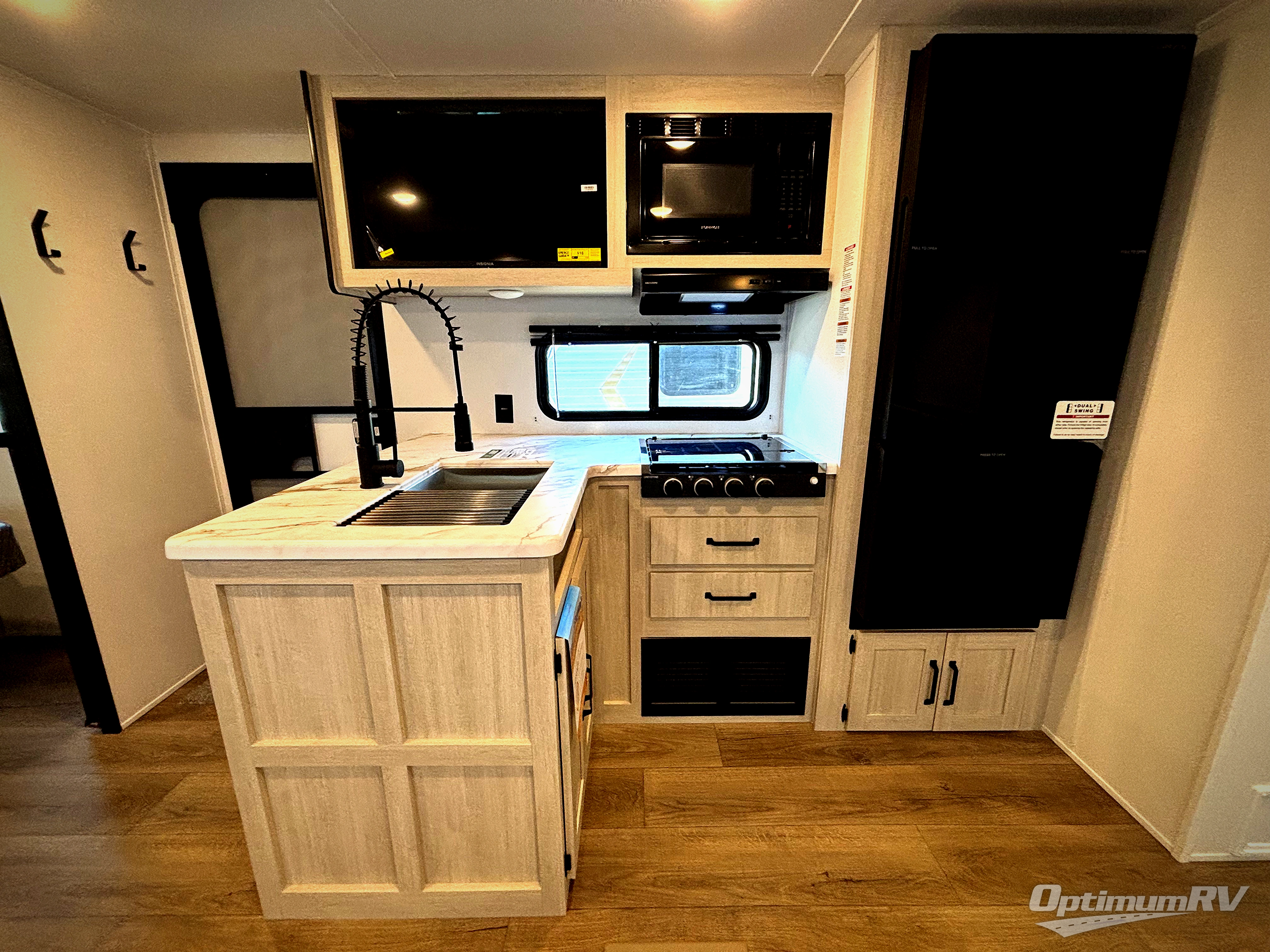 If you're looking for more space, this double axle, double slide out unit is perfect for your group of eight. Within the large slide in the living room, you'll find the booth dinette and sofa, which sit across from the optional TV if you want to enjoy movie nights. The full kitchen includes a stainless microwave and three burner cooktop to make meals, plus a pantry and 12V refrigerator for food storage. And an optional outside kitchen with a griddle can be added if you enjoy cooking outdoors! Your guests or littles are sure to enjoy the rear private bunkhouse that features a set of 38" x 76" bunks across from the third bunk and jiffy sofa within a slide out!