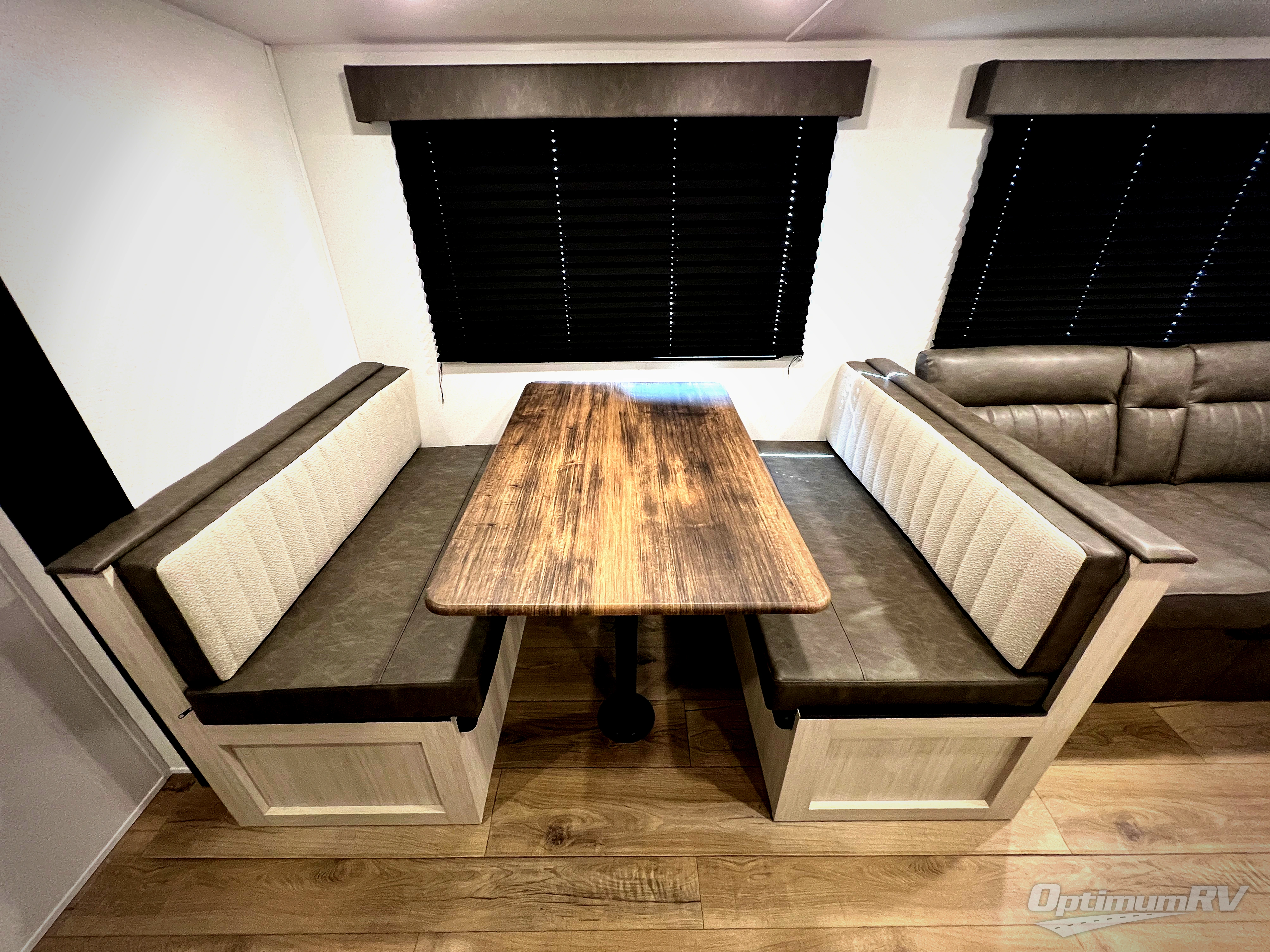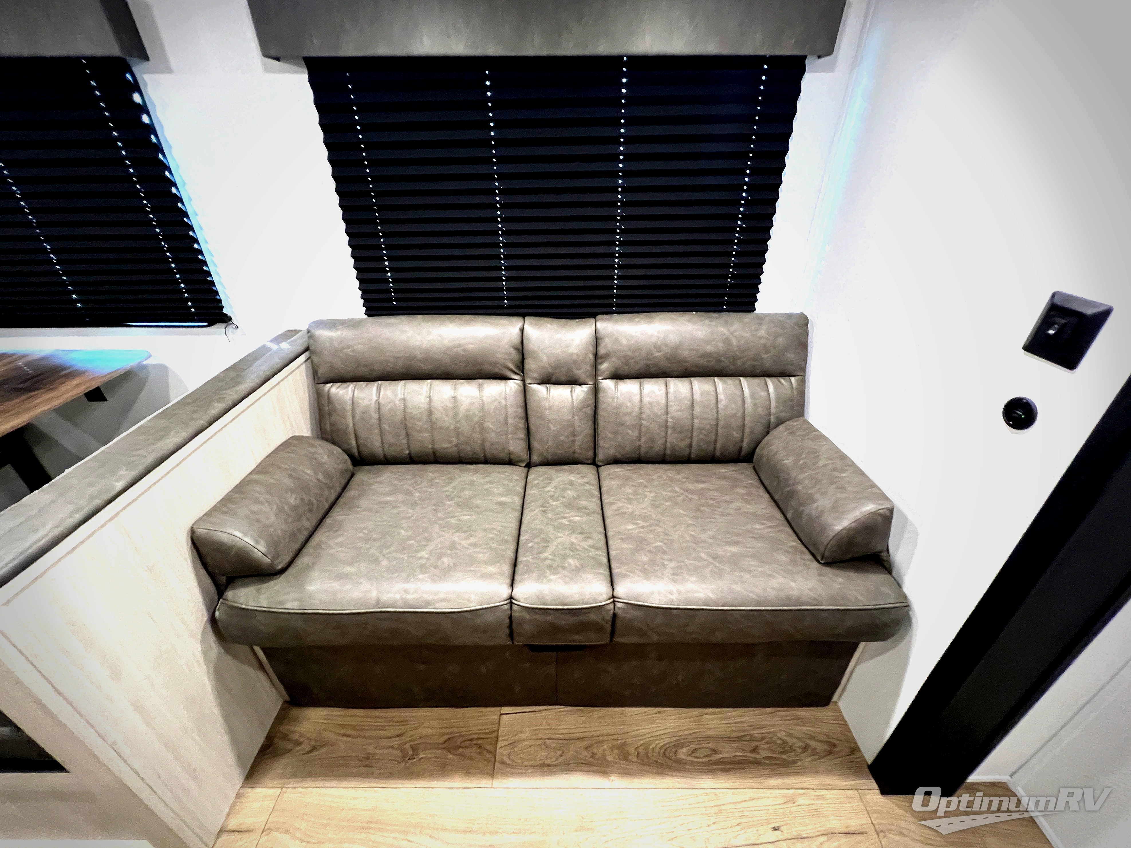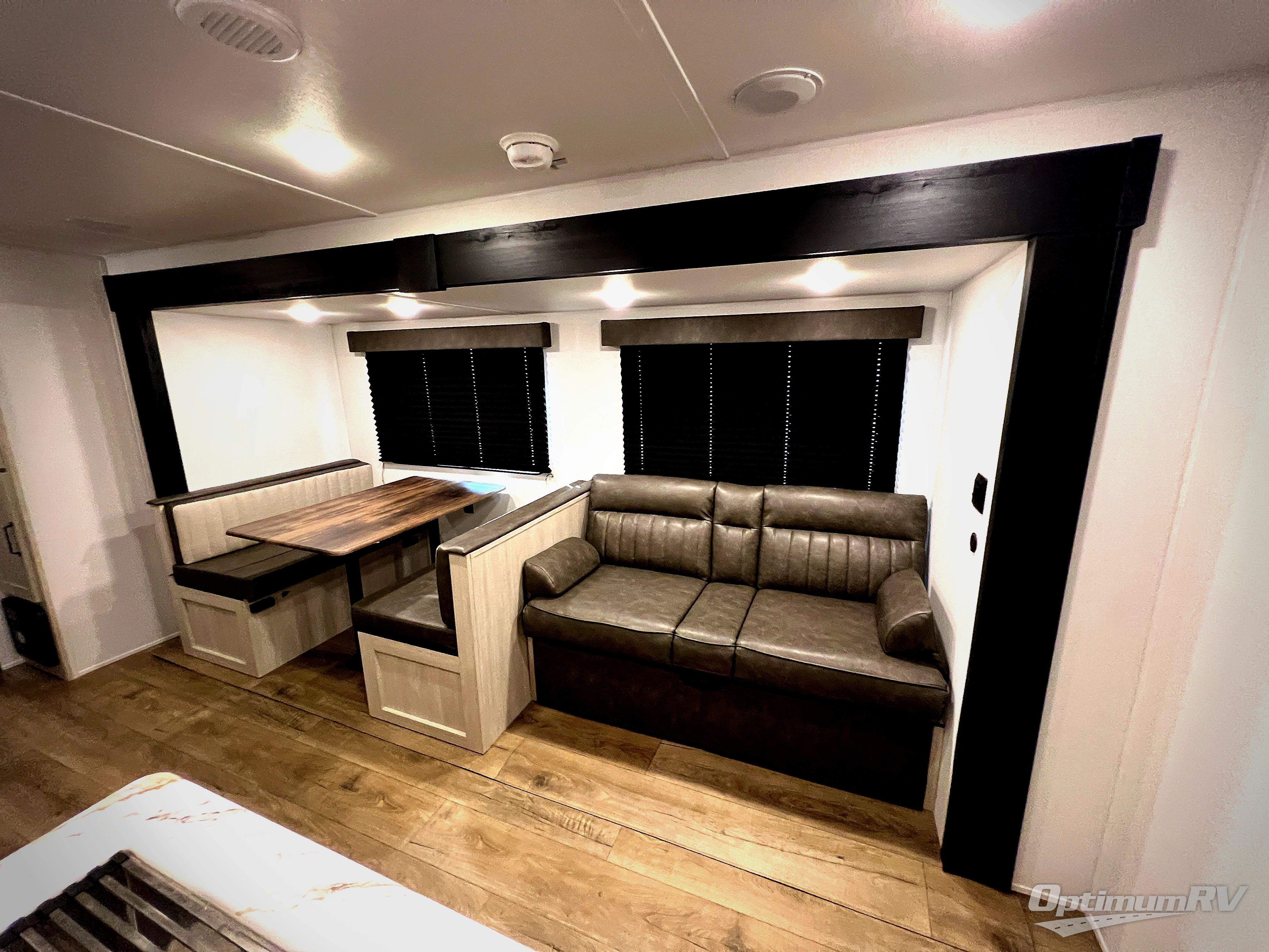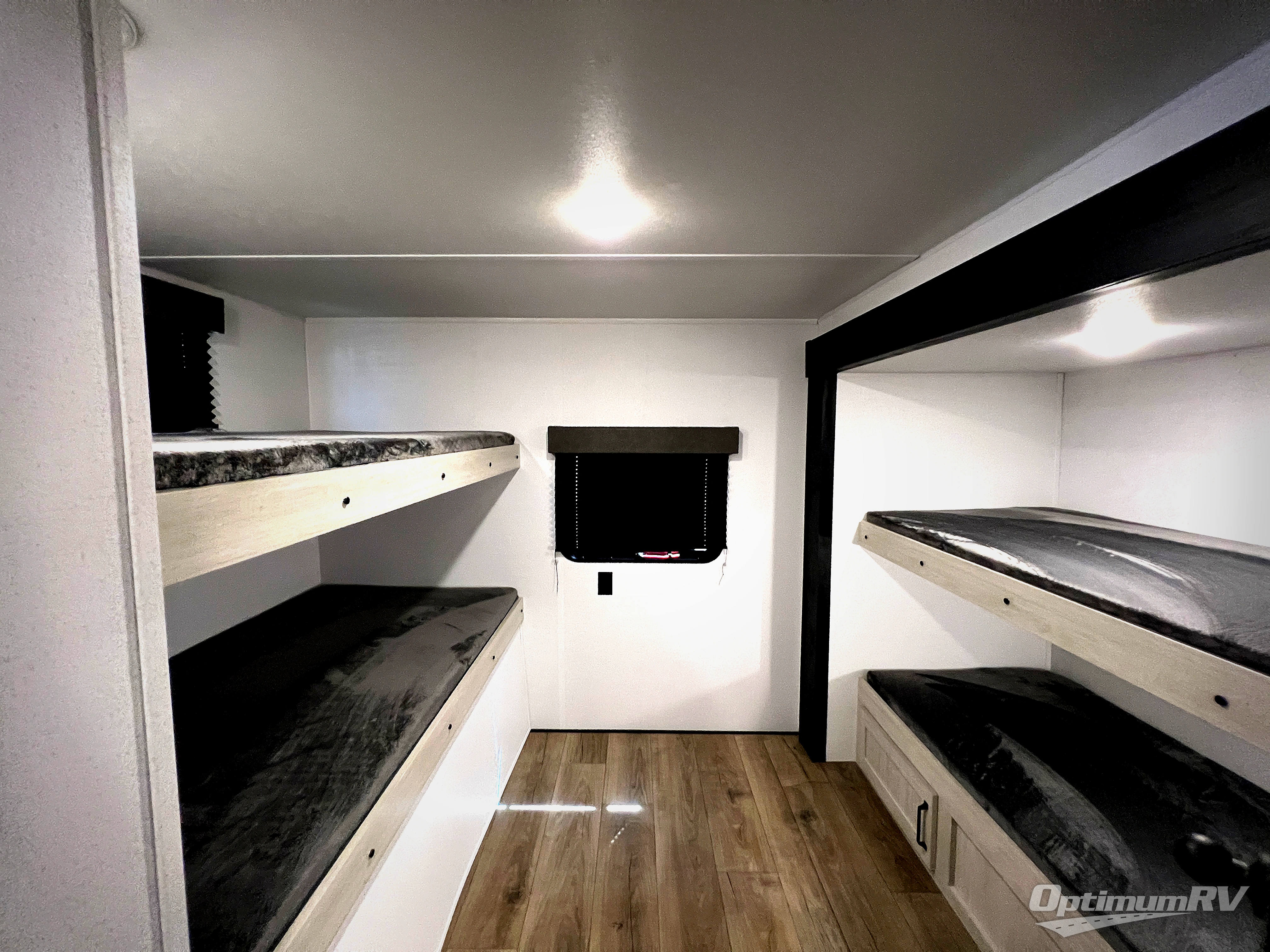 If you're looking for more space, this double axle, double slide out unit is perfect for your group of eight. Within the large slide in the living room, you'll find the booth dinette and sofa, which sit across from the optional TV if you want to enjoy movie nights. The full kitchen includes a stainless microwave and three burner cooktop to make meals, plus a pantry and 12V refrigerator for food storage. And an optional outside kitchen with a griddle can be added if you enjoy cooking outdoors! Your guests or littles are sure to enjoy the rear private bunkhouse that features a set of 38" x 76" bunks across from the third bunk and jiffy sofa within a slide out!