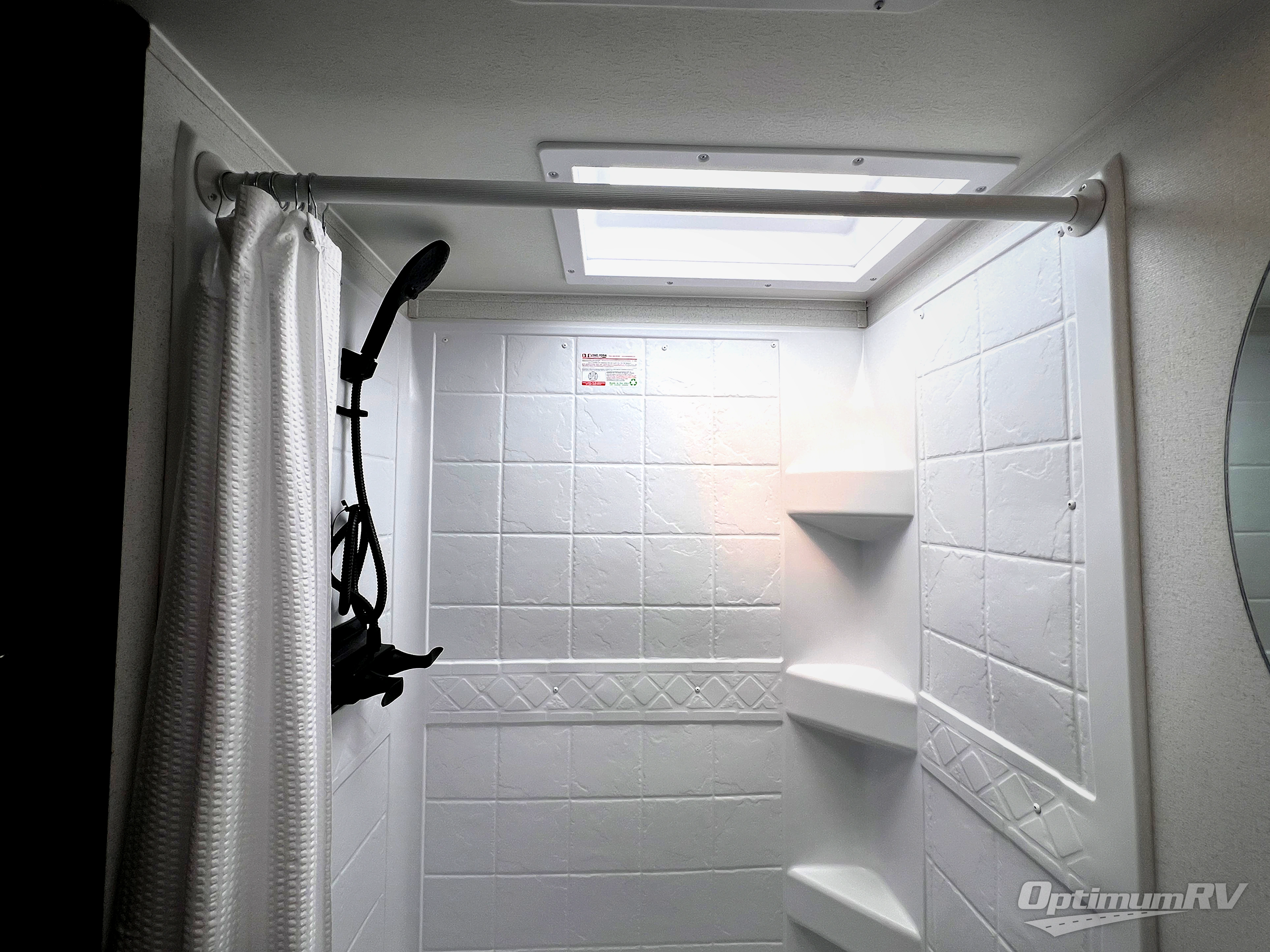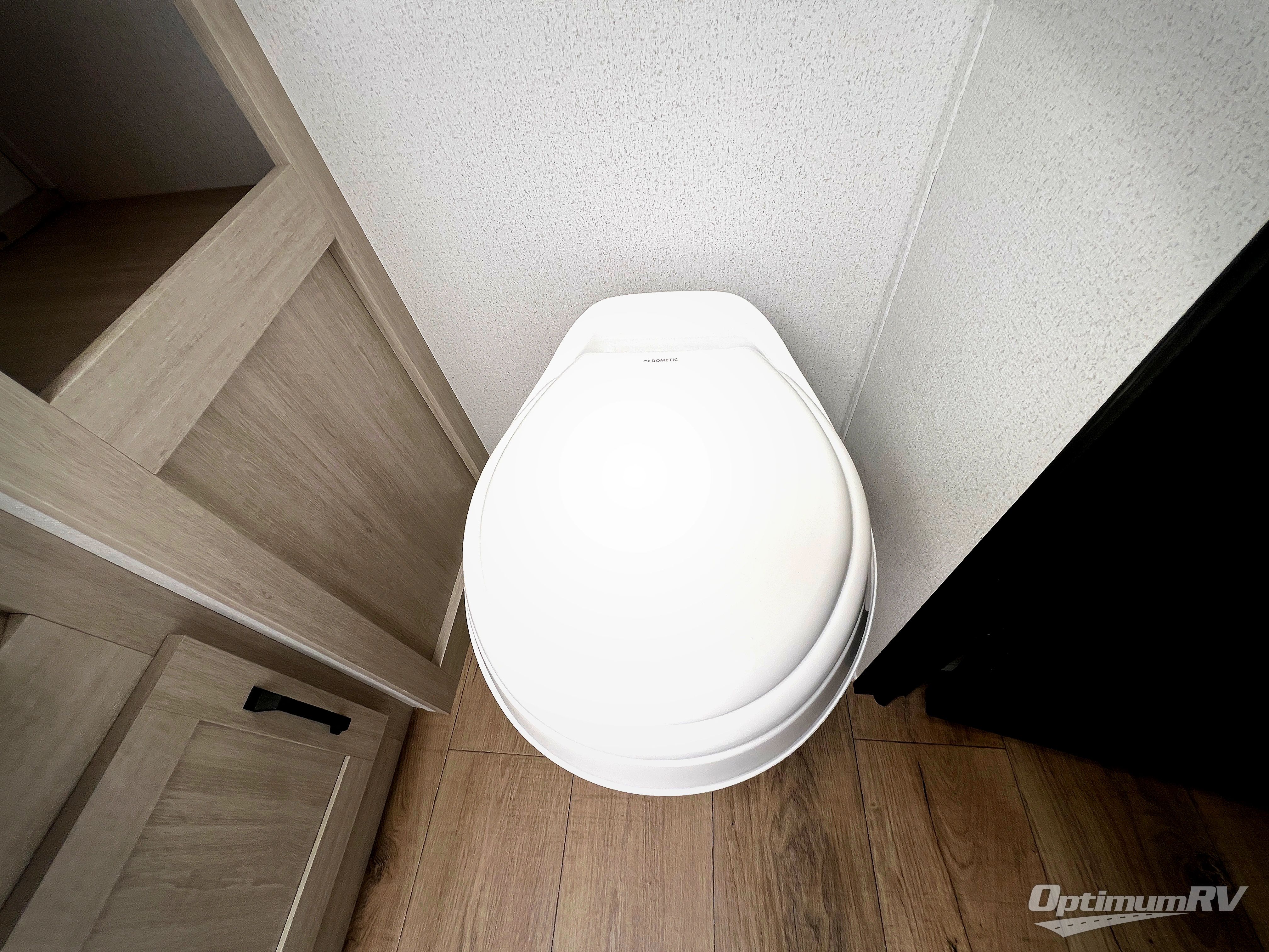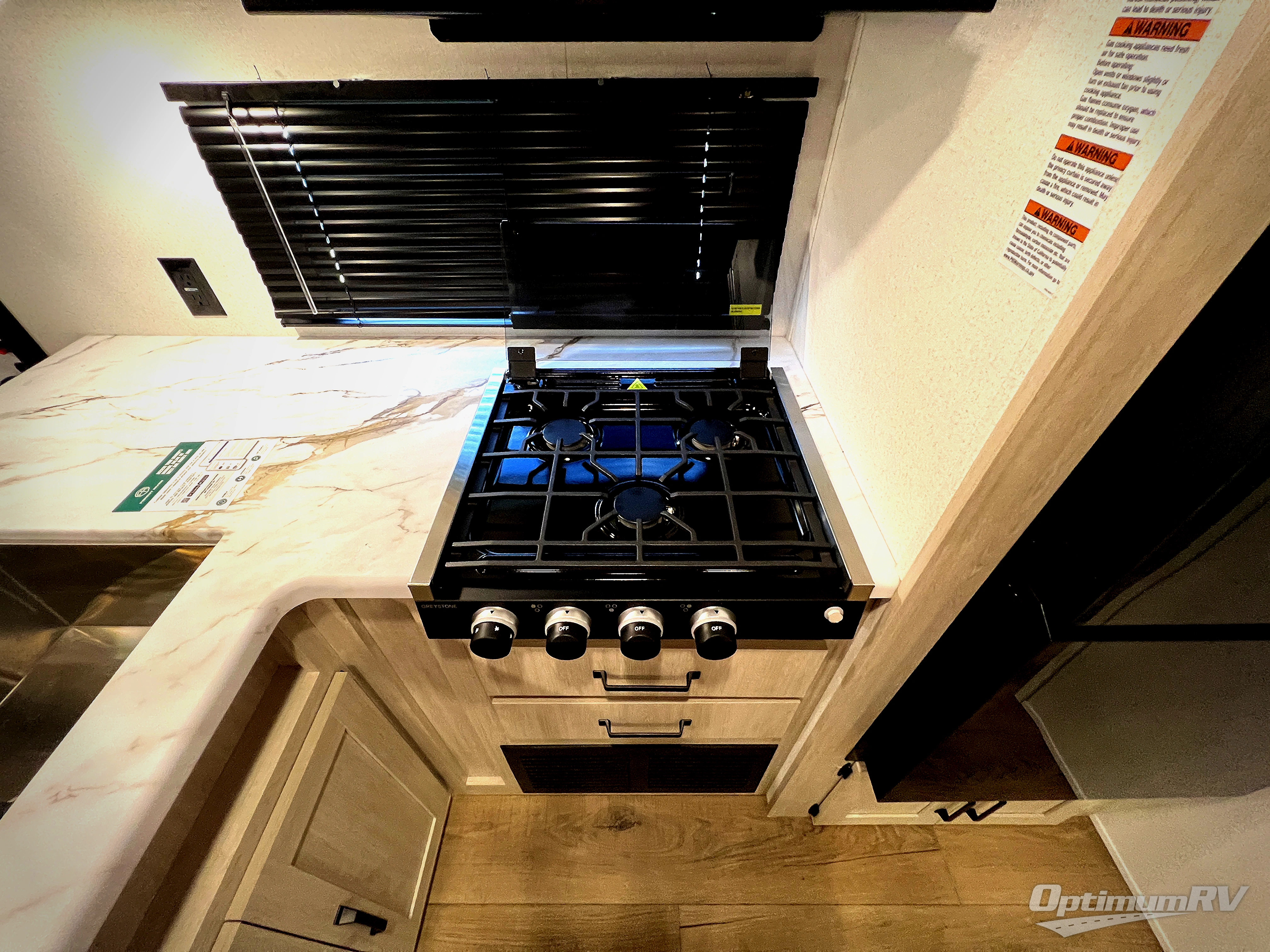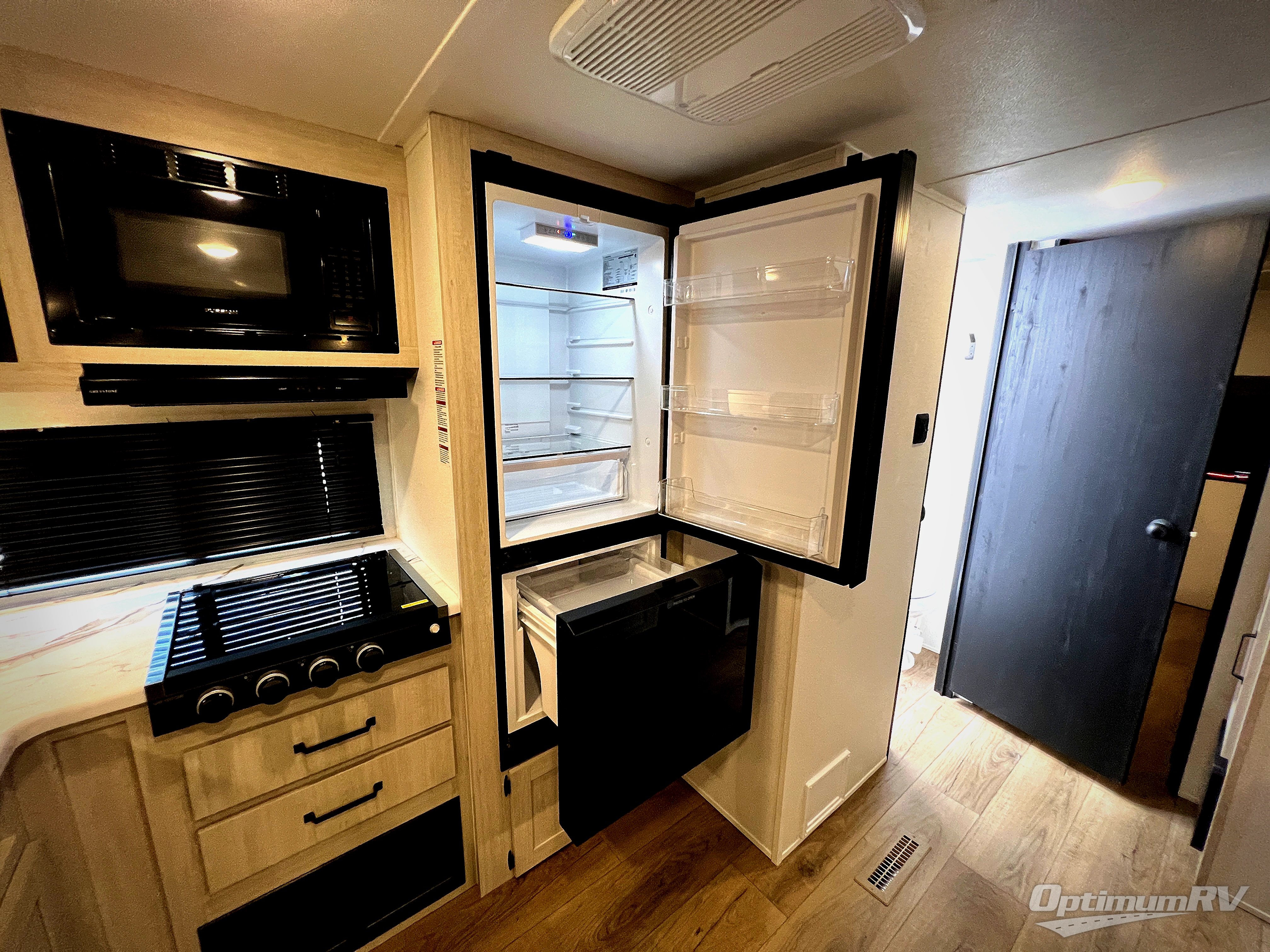 If you're looking for more space, this double axle, double slide out unit is perfect for your group of eight. Within the large slide in the living room, you'll find the booth dinette and sofa, which sit across from the optional TV if you want to enjoy movie nights. The full kitchen includes a stainless microwave and three burner cooktop to make meals, plus a pantry and 12V refrigerator for food storage. And an optional outside kitchen with a griddle can be added if you enjoy cooking outdoors! Your guests or littles are sure to enjoy the rear private bunkhouse that features a set of 38" x 76" bunks across from the third bunk and jiffy sofa within a slide out!