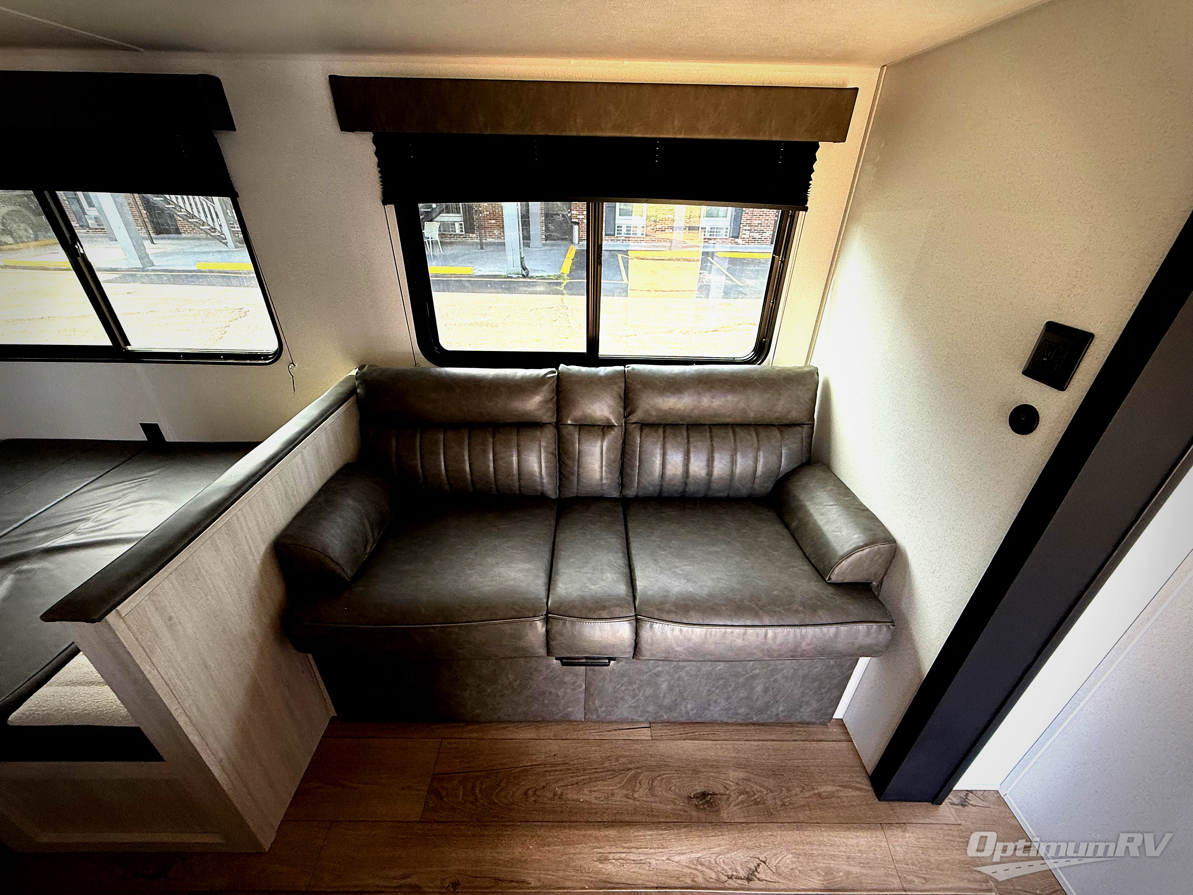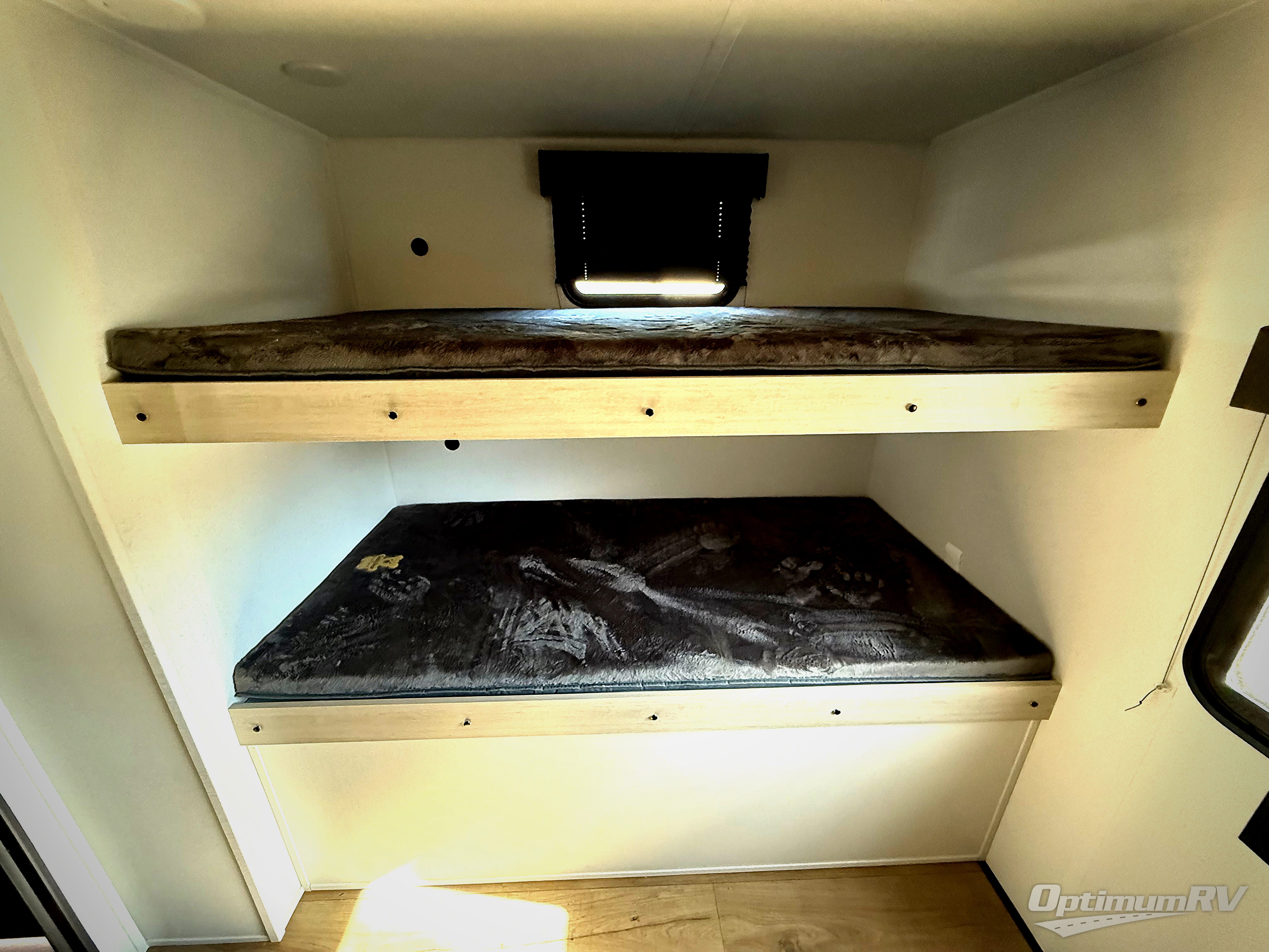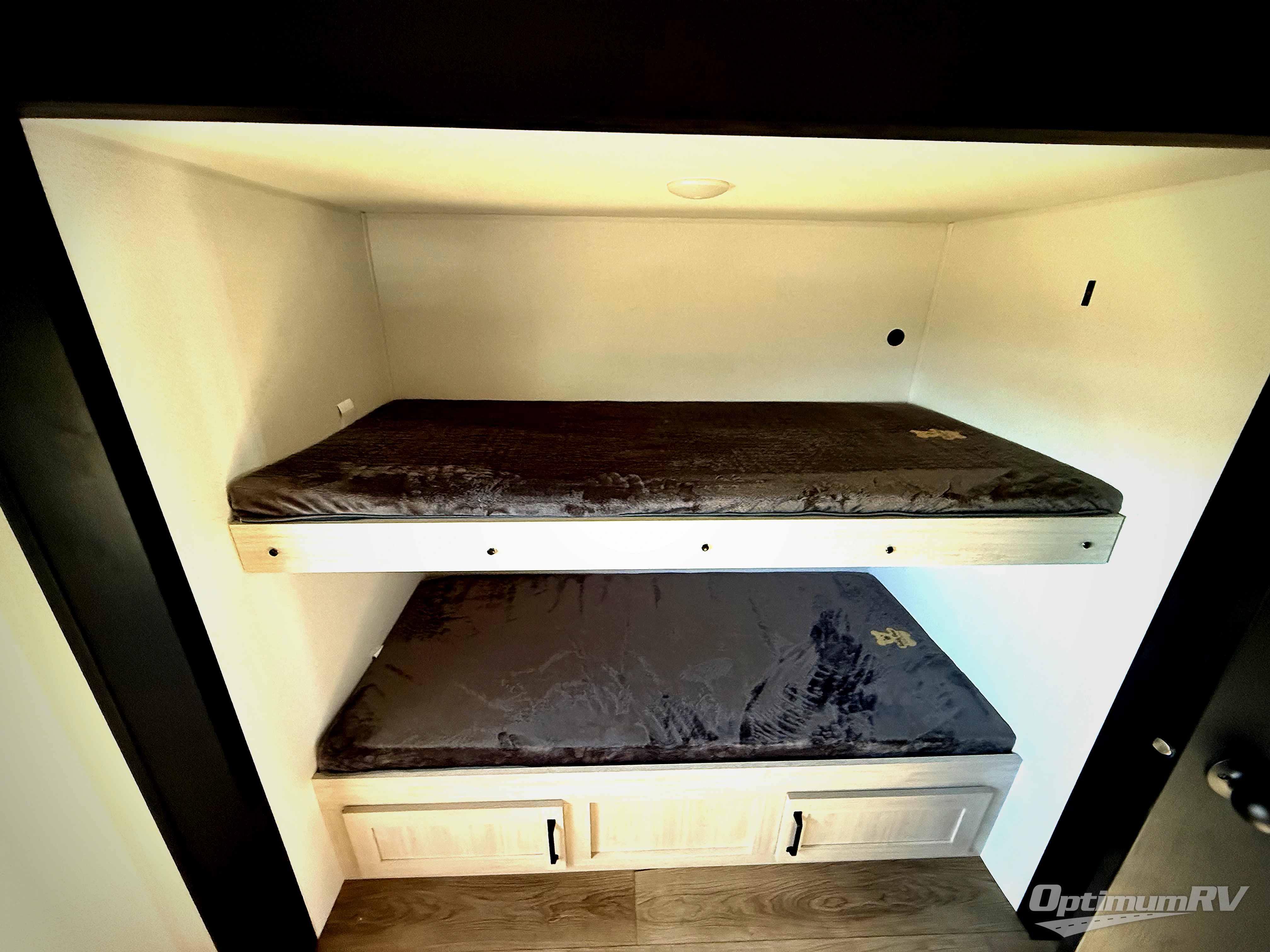 If you're looking for more space, this double axle, double slide out unit is perfect for your group of eight. Within the large slide in the living room, you'll find the booth dinette and sofa, which sit across from the optional TV if you want to enjoy movie nights. The full kitchen includes a stainless microwave and three burner cooktop to make meals, plus a pantry and 12V refrigerator for food storage. And an optional outside kitchen with a griddle can be added if you enjoy cooking outdoors! Your guests or littles are sure to enjoy the rear private bunkhouse that features a set of 38" x 76" bunks across from the third bunk and jiffy sofa within a slide out!