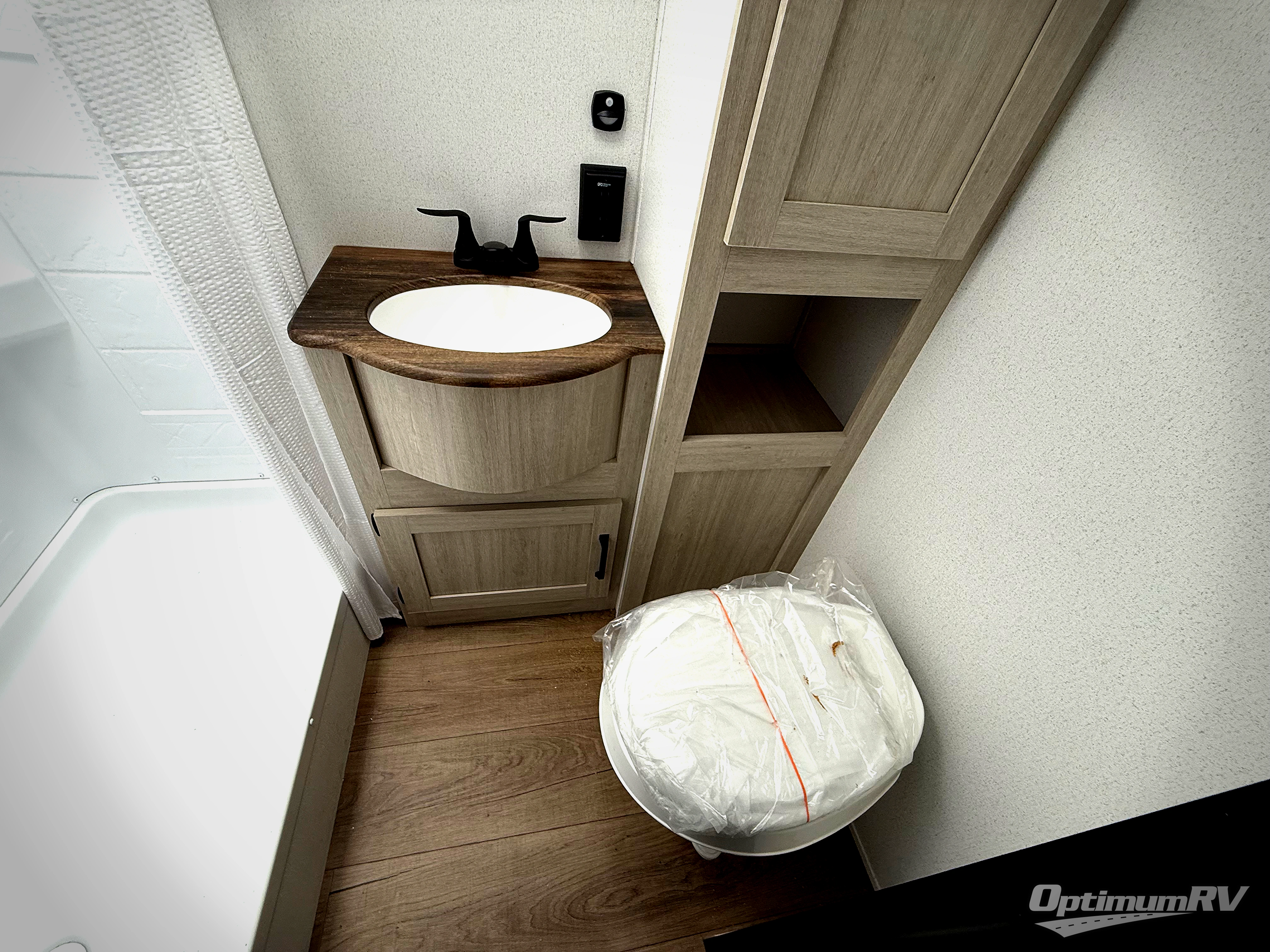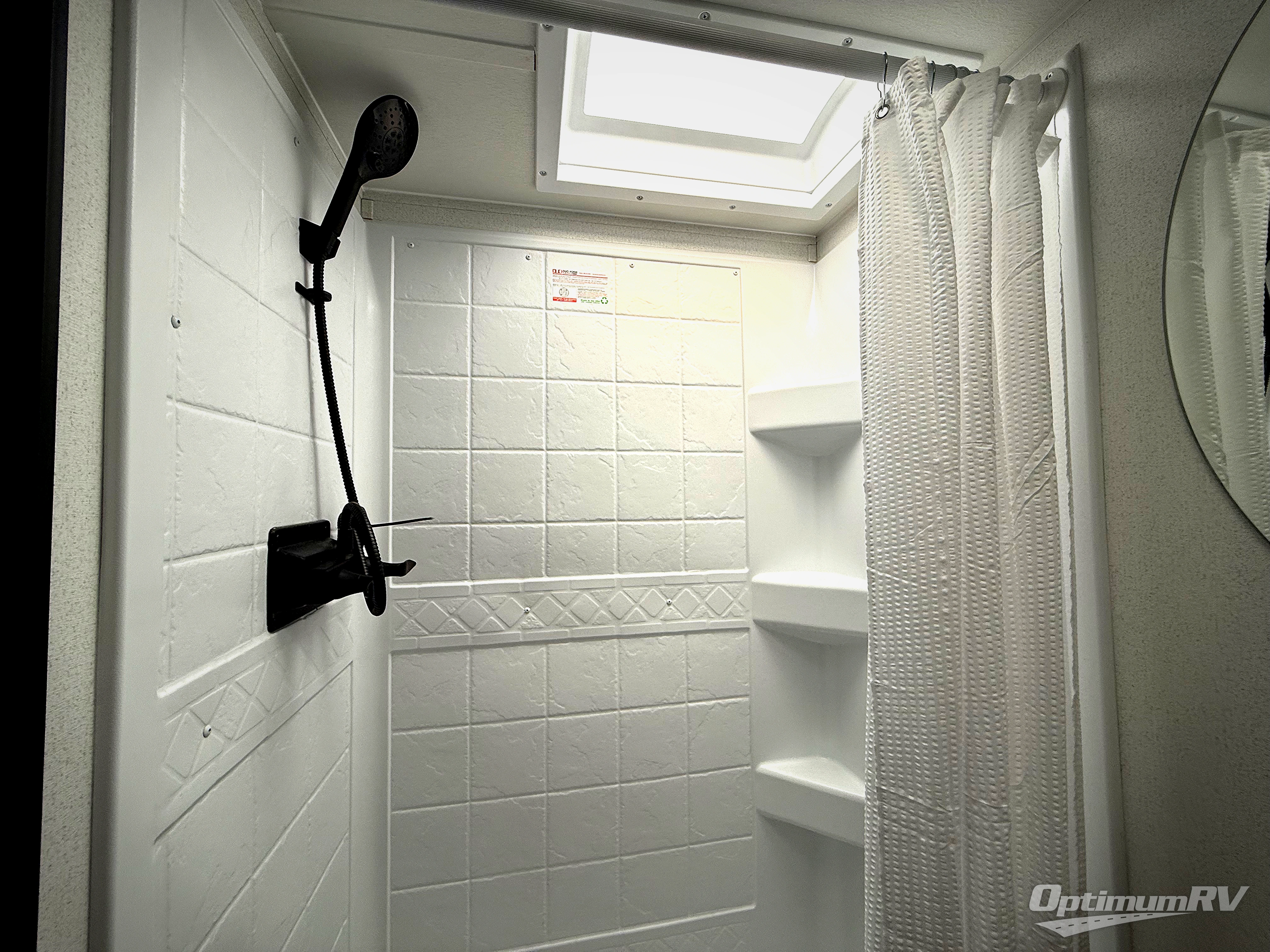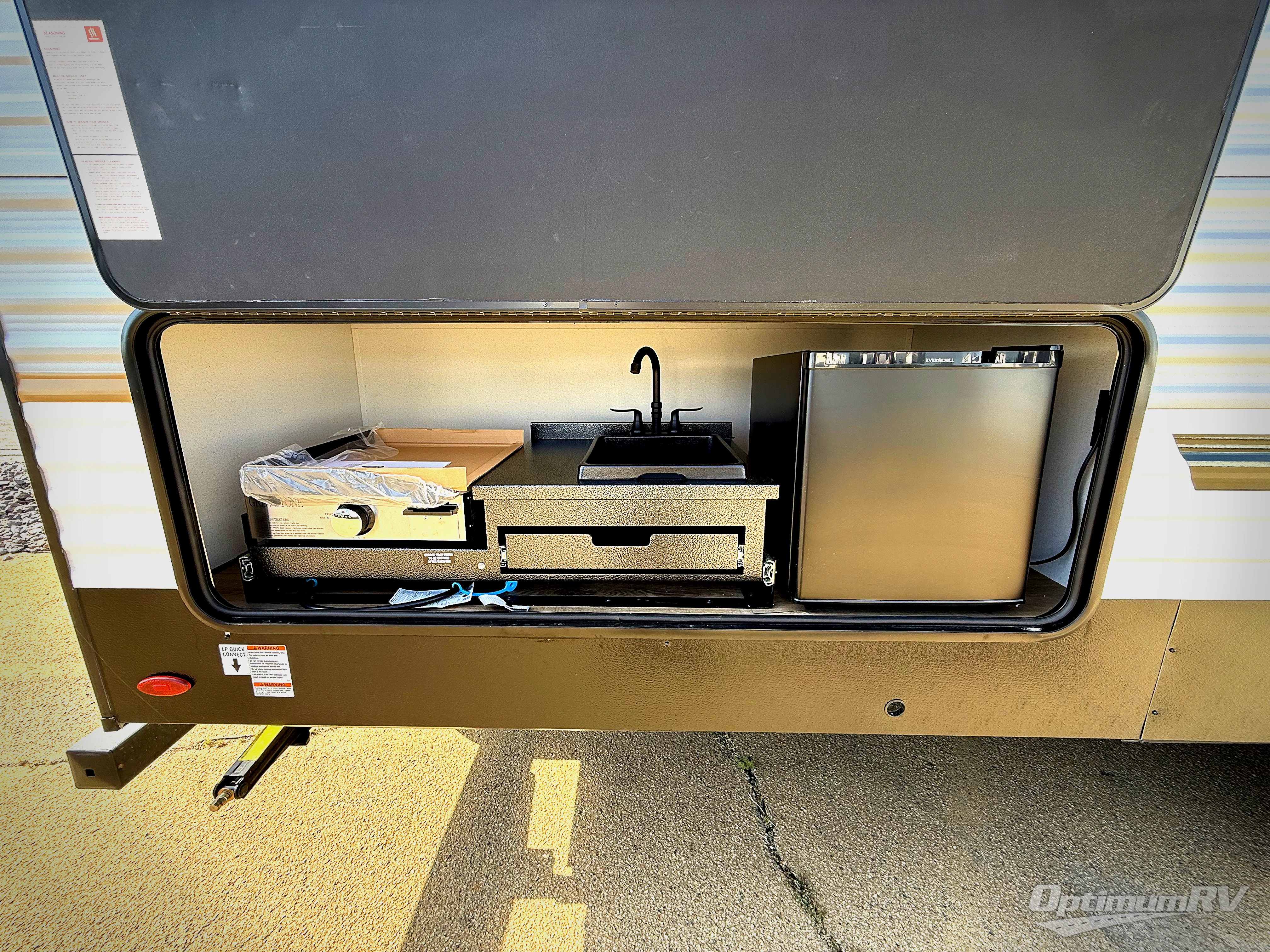 If you're looking for more space, this double axle, double slide out unit is perfect for your group of eight. Within the large slide in the living room, you'll find the booth dinette and sofa, which sit across from the optional TV if you want to enjoy movie nights. The full kitchen includes a stainless microwave and three burner cooktop to make meals, plus a pantry and 12V refrigerator for food storage. And an optional outside kitchen with a griddle can be added if you enjoy cooking outdoors! Your guests or littles are sure to enjoy the rear private bunkhouse that features a set of 38" x 76" bunks across from the third bunk and jiffy sofa within a slide out!