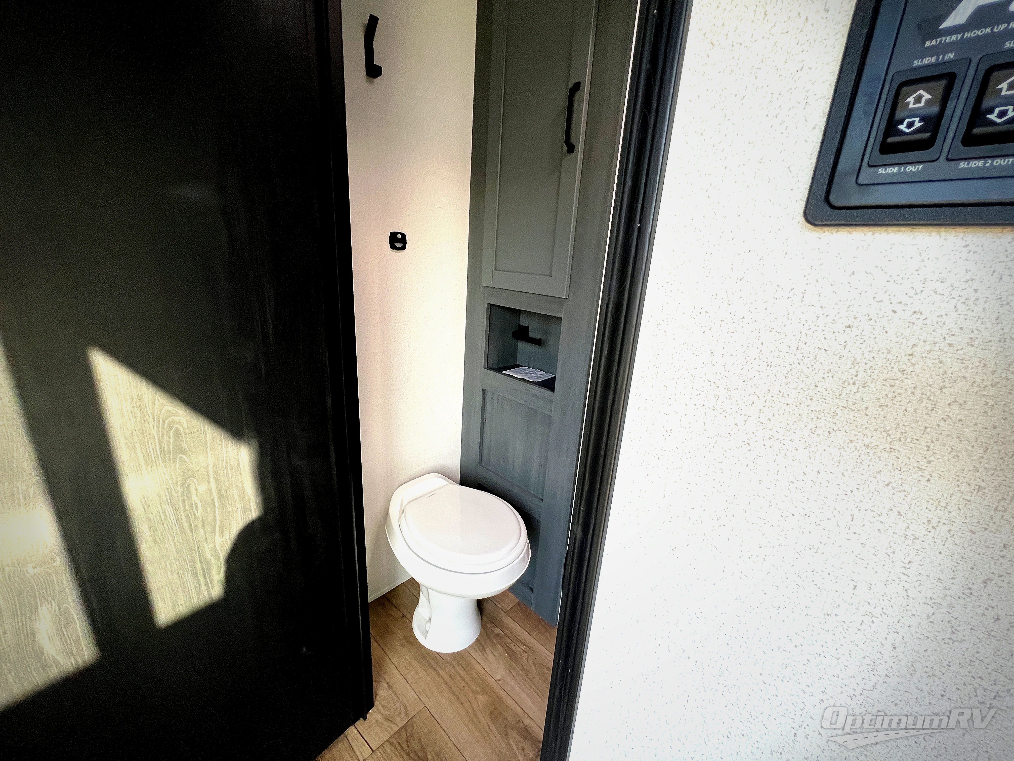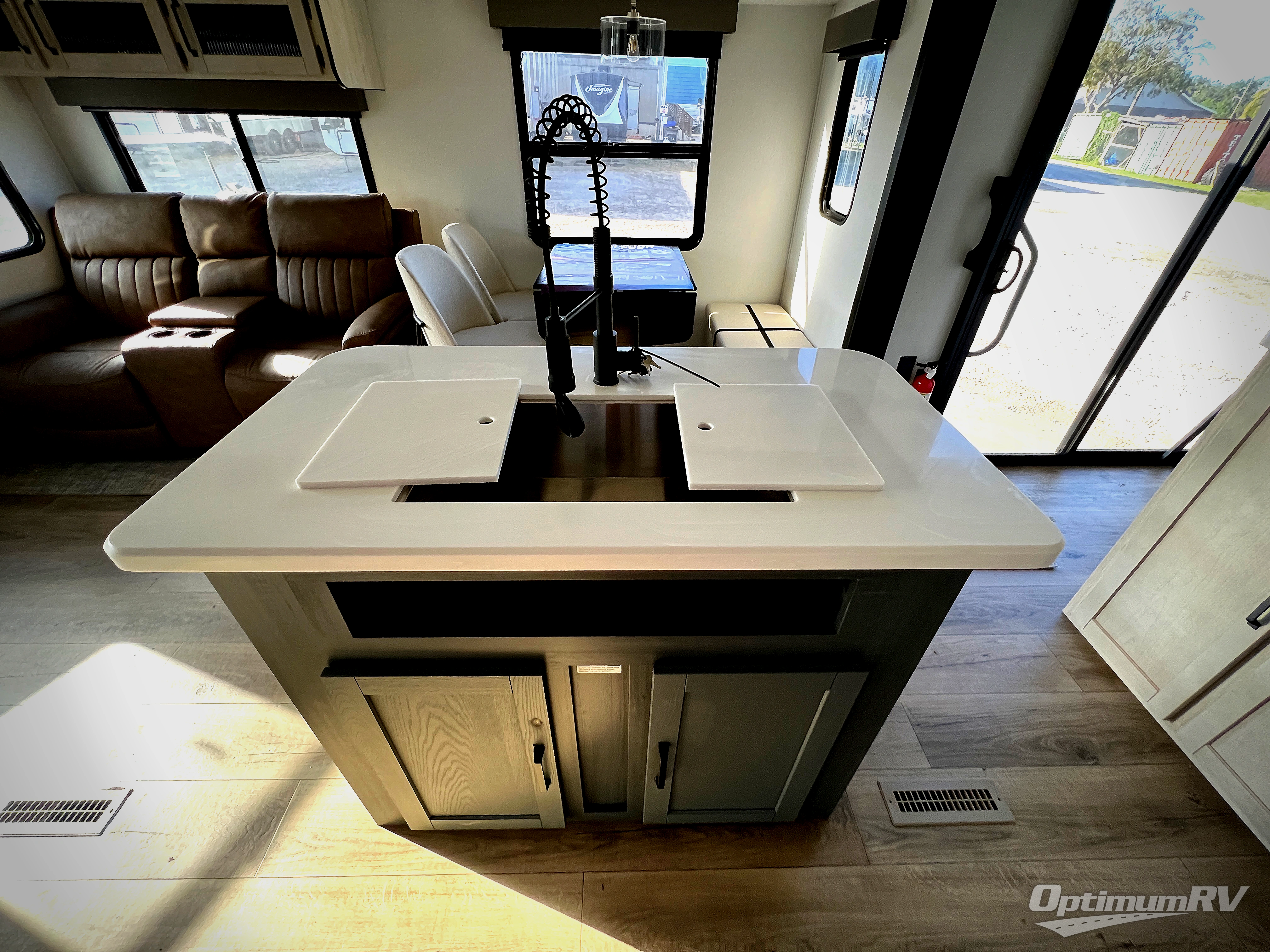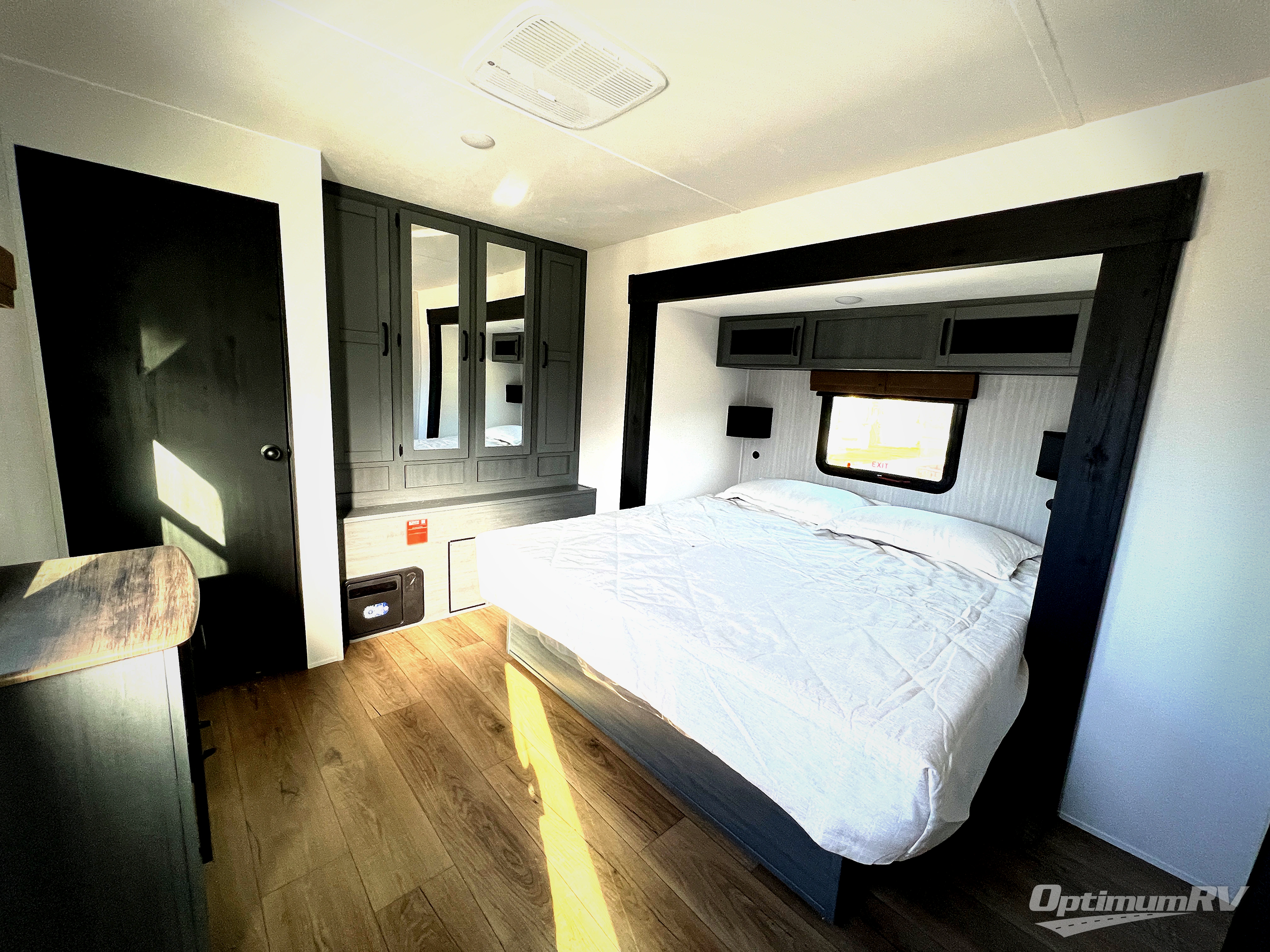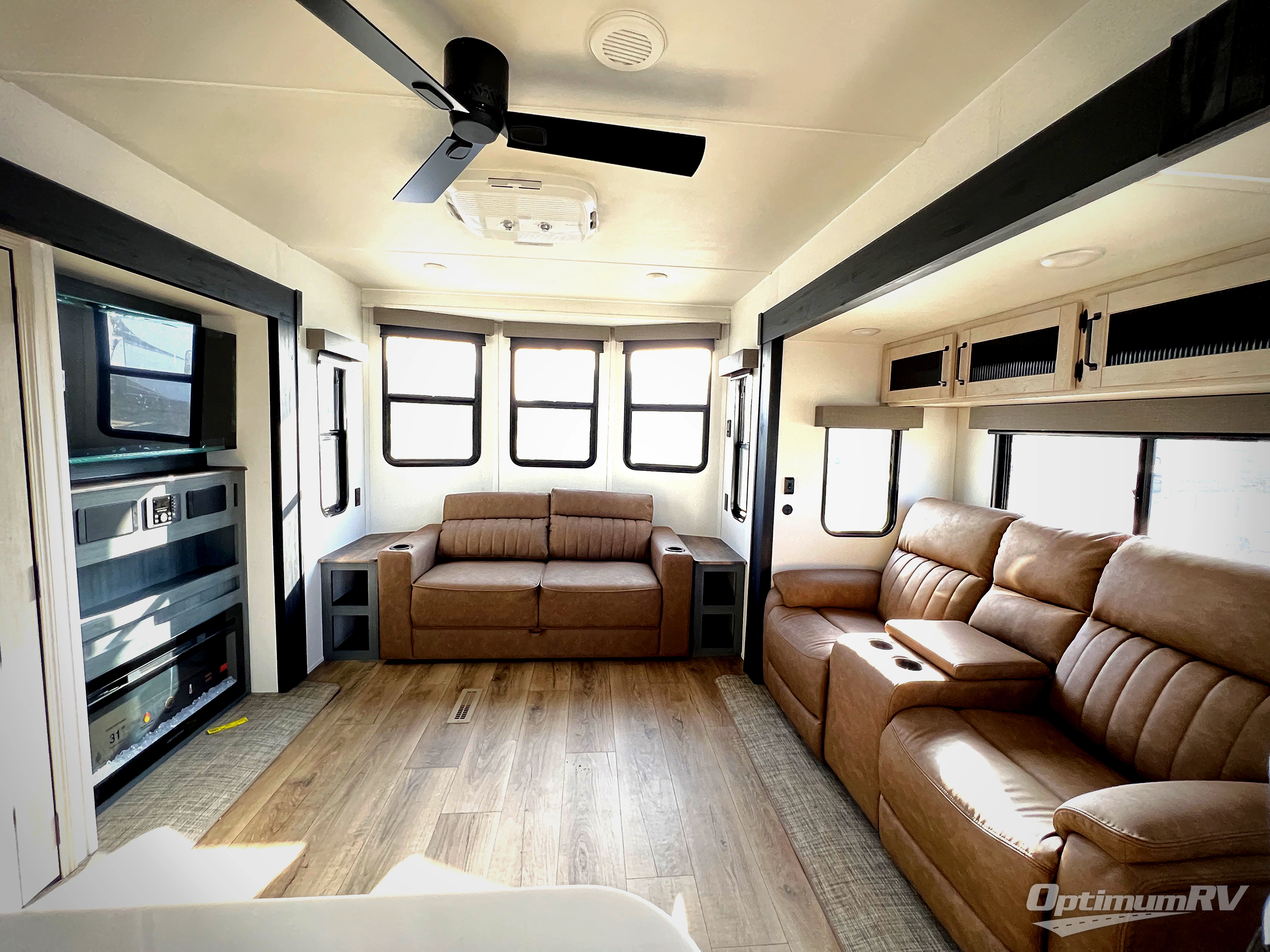 Get ready to enjoy your destination for a weekend or even longer in comfort with the front living and kitchen combined area. The sofa and booth dinette offer relaxing and dining space as well as sleeping space when needed. There are two recliners you are sure to love, as well as a fireplace to make it feel more like home. There is a kitchen island to prepare and serve meals from and wash the dishes. The kitchen offers full amenities including a stainless steel refrigerator and plenty of storage. You will surely enjoy the natural lighting from the patio door, and the second entry/exit is located in the rear private bedroom where you can sleep like a royalty on the king bed. There is also a closet with the option to add washer and dryer prep if you choose!