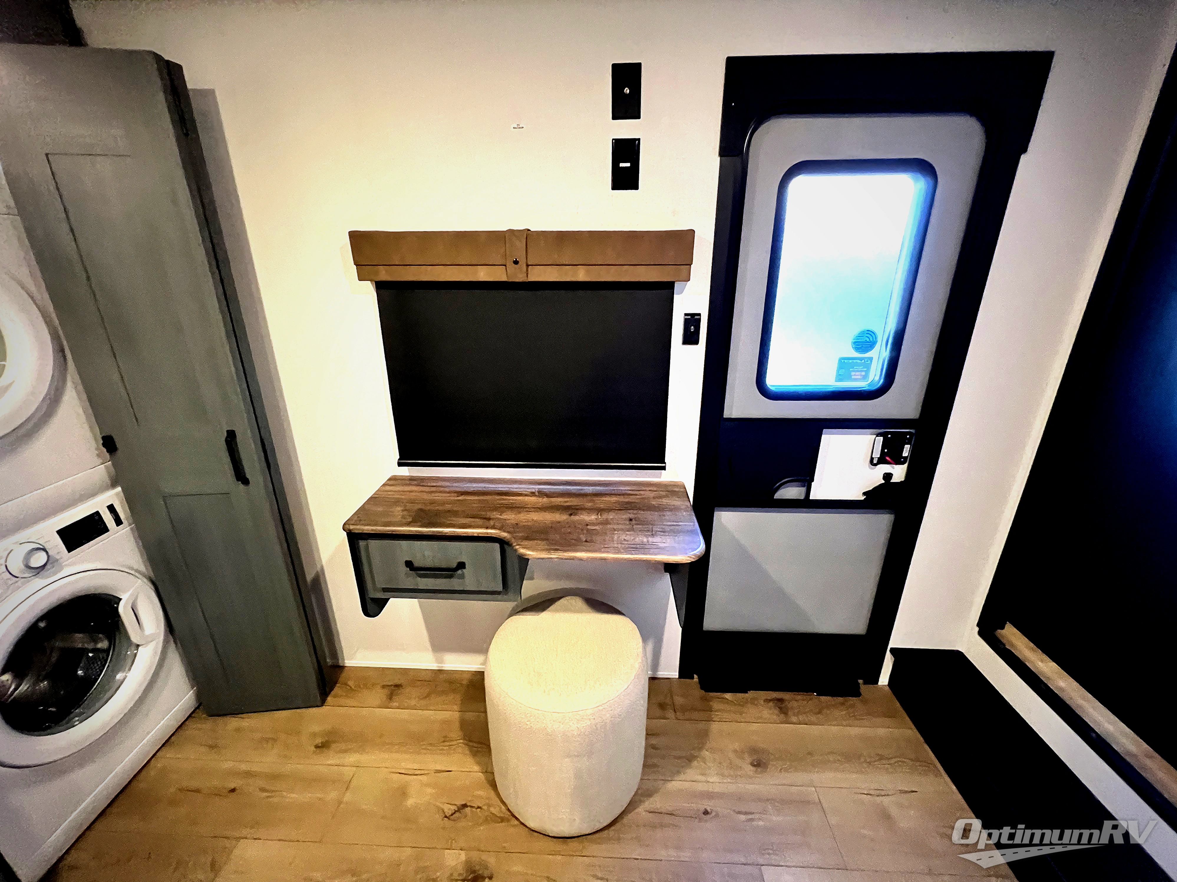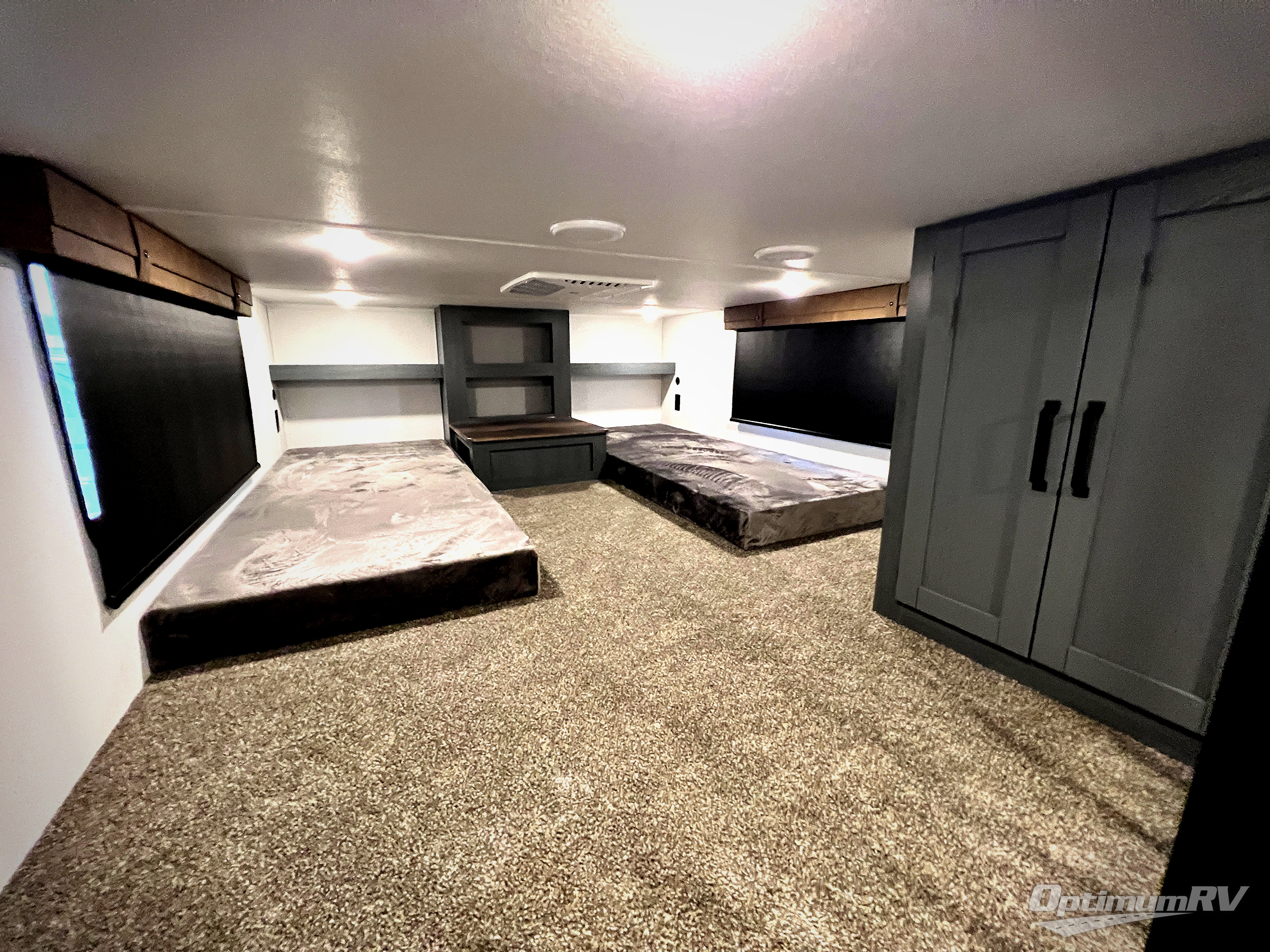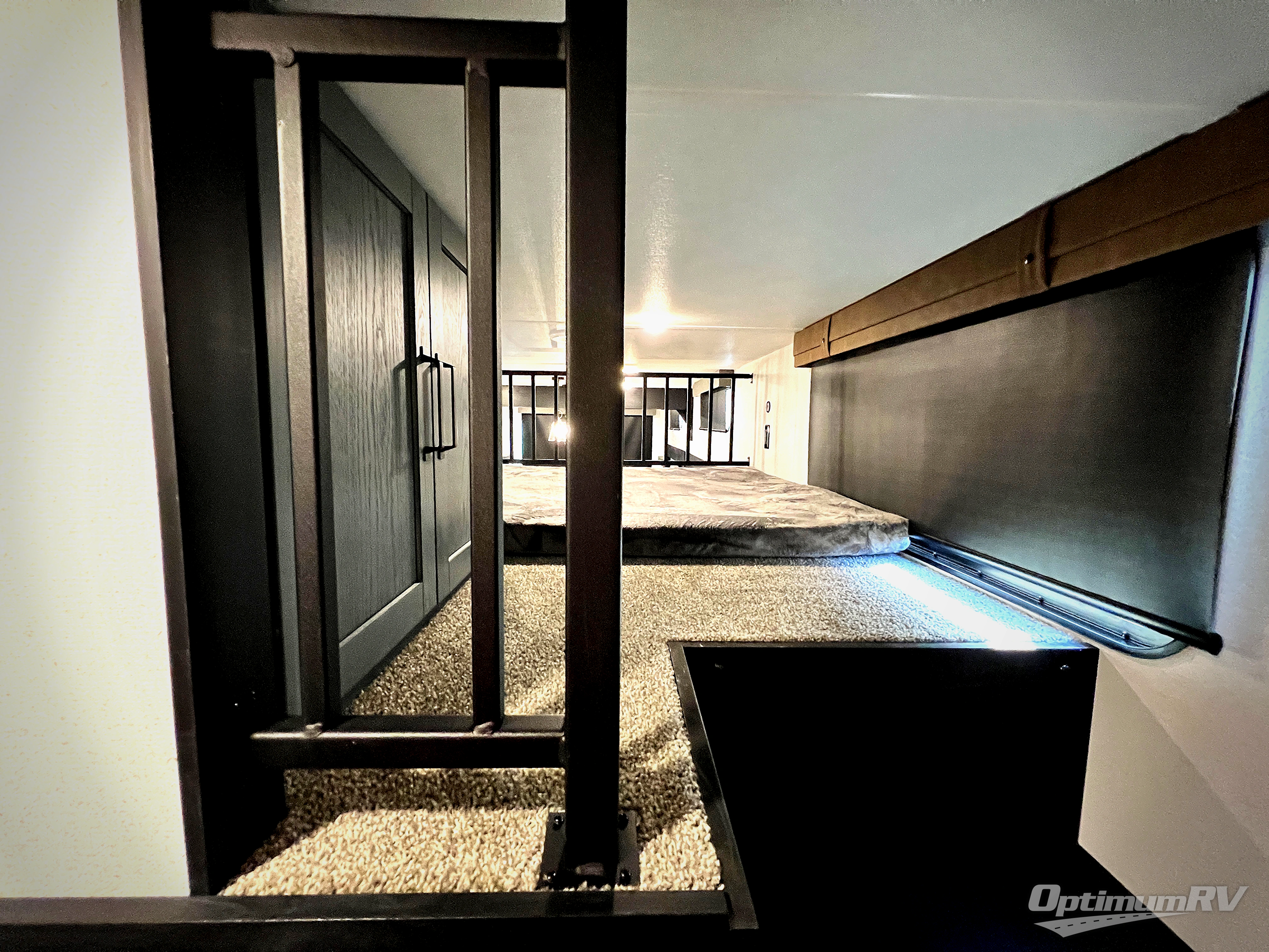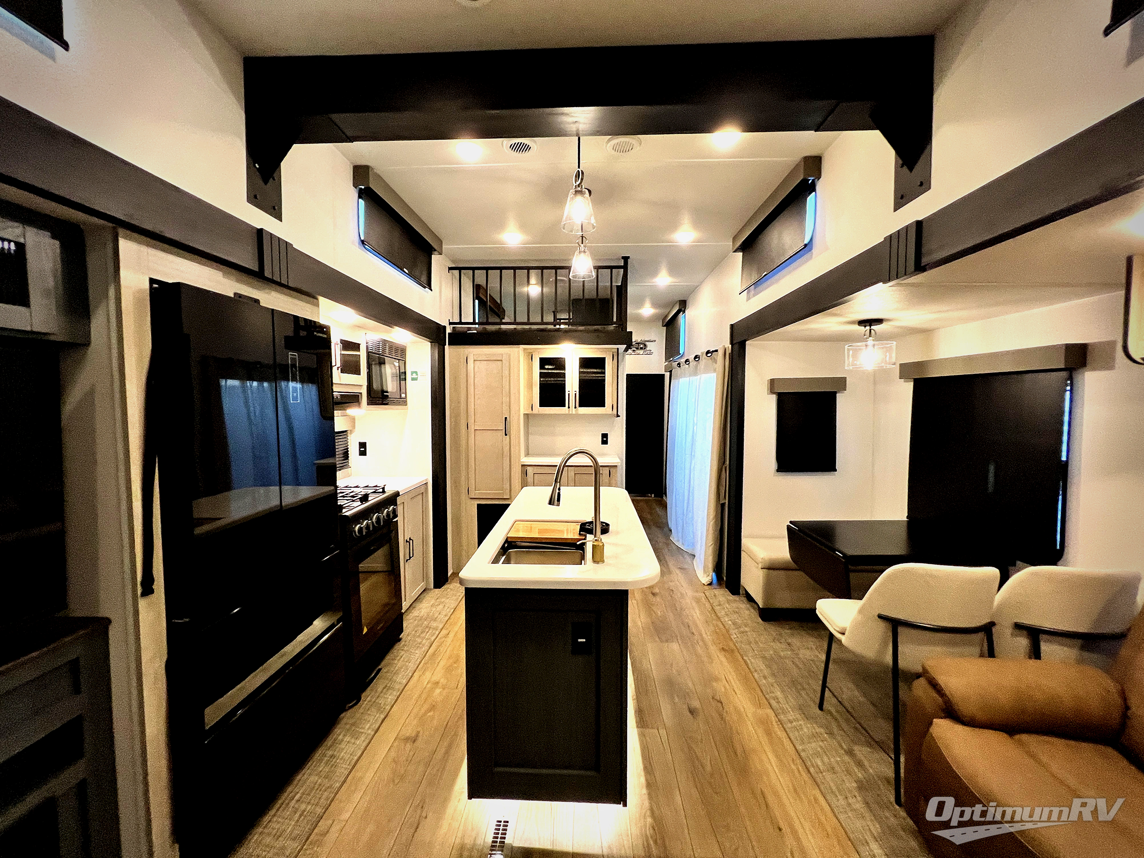 Wherever your destination may be, you can be sure to enjoy it to the fullest with this trailer in tow! With two entry doors, you can enter in through the front private bedroom or the main living area. The bedroom includes a king bed slide out, a desktop if you need to work from home, and a wardrobe/closet to keep your clothes organized. There is also a closet with the option to add washer and dryer prep. Just outside this room are steps that lead to the large loft area with a 58" x 58" bunk mat and a cabinet on one side, plus two 32" x 80" bunk mats on the other. There is also a front cabinet and a wardrobe/closet for plenty of storage space. Once you've headed back downstairs, you can relax on the dual recliners, rear sofa, or free-standing table with a bench and two seats. And the chef of your group will love the kitchen with its residential style refrigerator and pantry, kitchen island, and four burner cooktop!