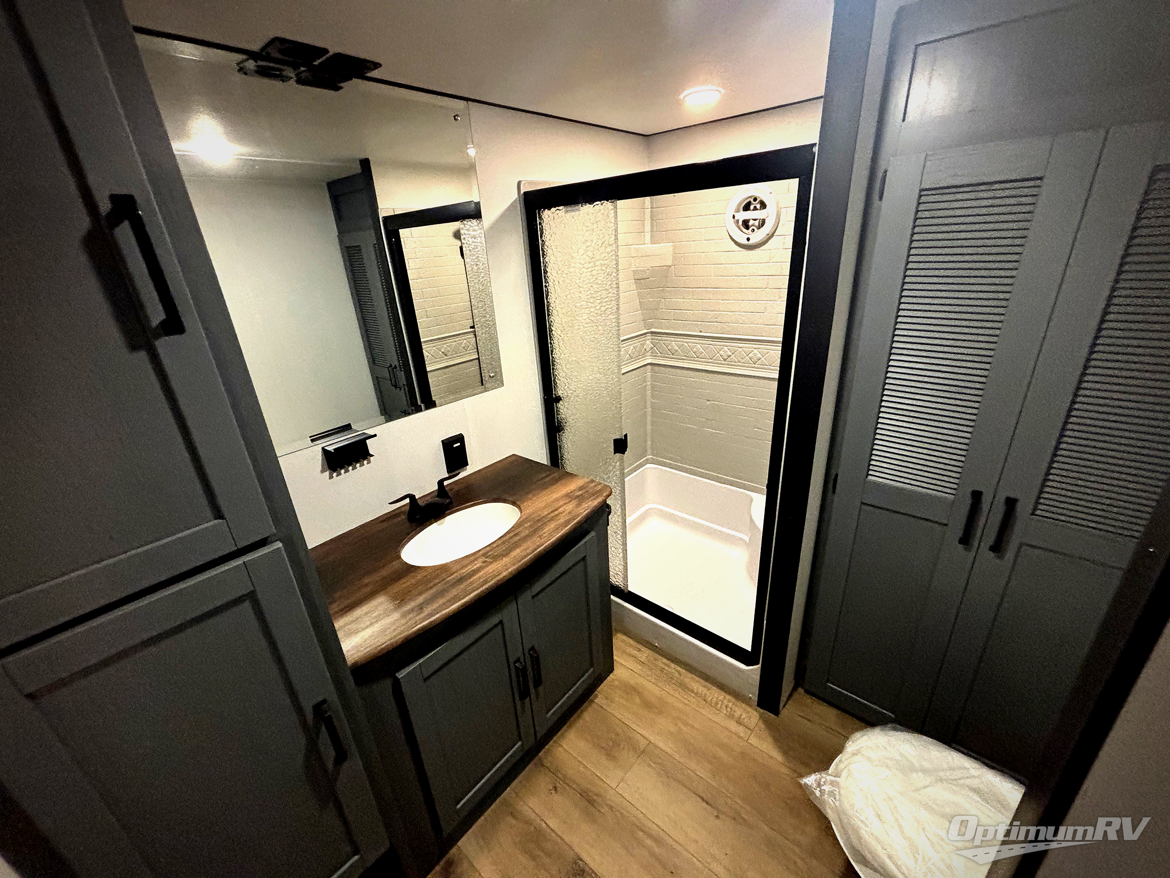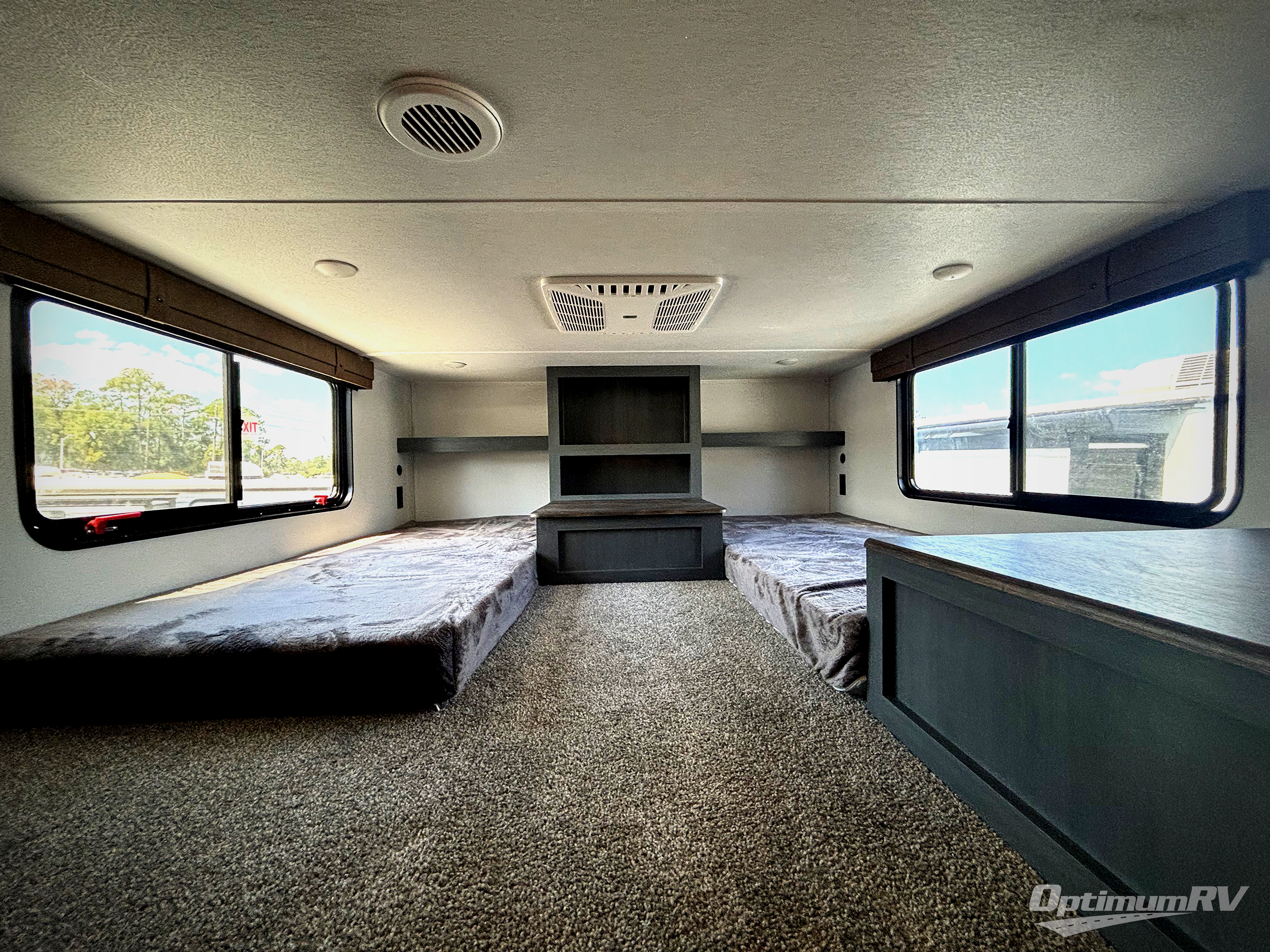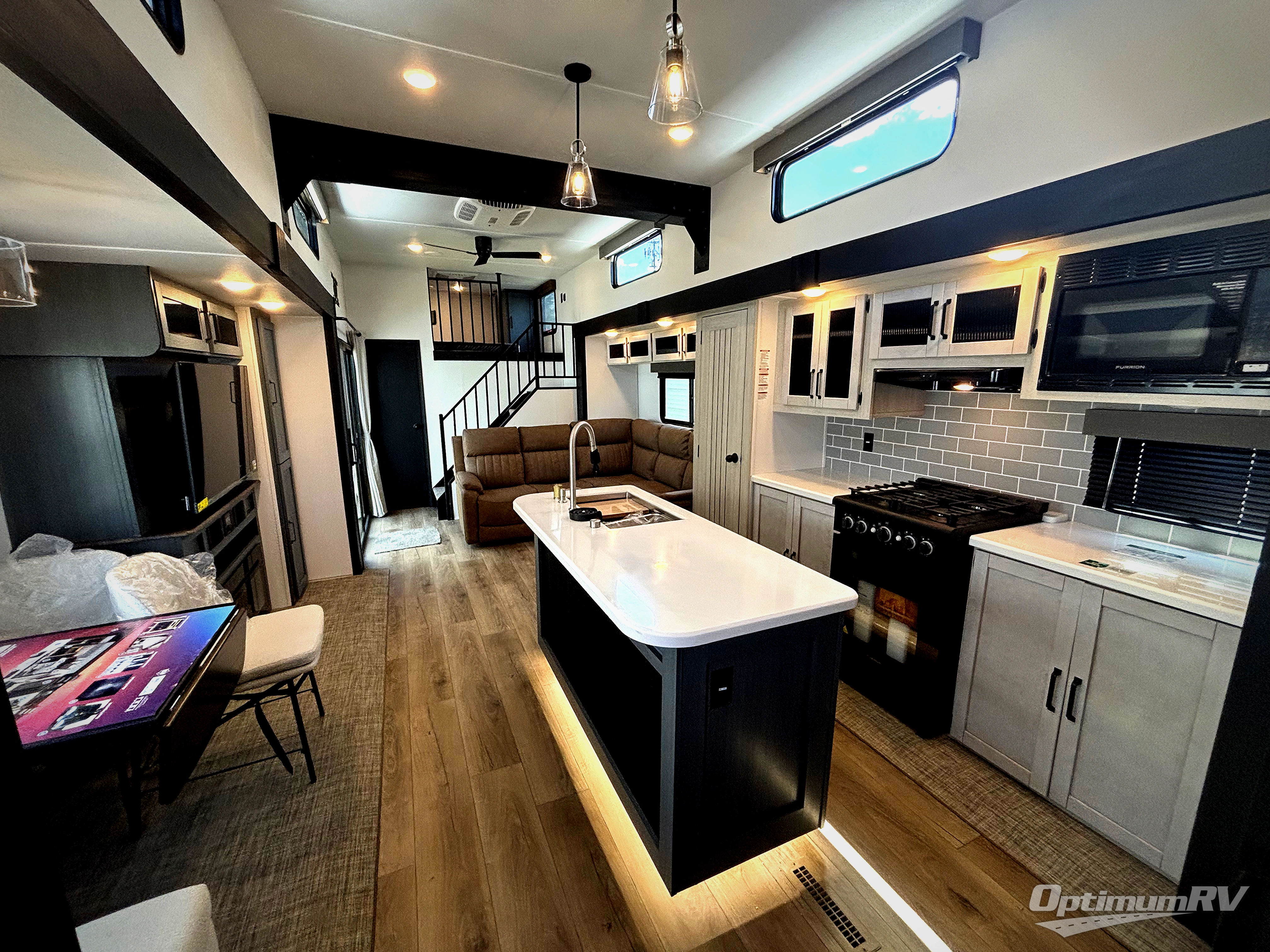 Head to your favorite spots with this destination trailer! With two entry doors, you can easily enter or exit the unit. The front private bedroom includes a king bed slide out, a wardrobe and dresser to keep your clothes organized, plus a countertop for your books or jewelry. Just outside this room is the ladder that leads to the large loft area with two 32" x 80" bunk mats, a cubby, a counter, a nightstand, and cabinets. Once you've headed back downstairs, you can relax on the L-shaped sofa across from the entertainment center with a fireplace and slide-out cabinet or the free-standing table with a bench and two seats. And the chef of your group will love the kitchen with its residential style refrigerator and pantry, kitchen island, and four burner cooktop. The full rear bathroom not only has a 32" x 40" shower with a seat to freshen up in and a closet prepped to add the optional washer and dryer, but is also below the second loft with a 32" x 80" bunk mat and closet for storage!