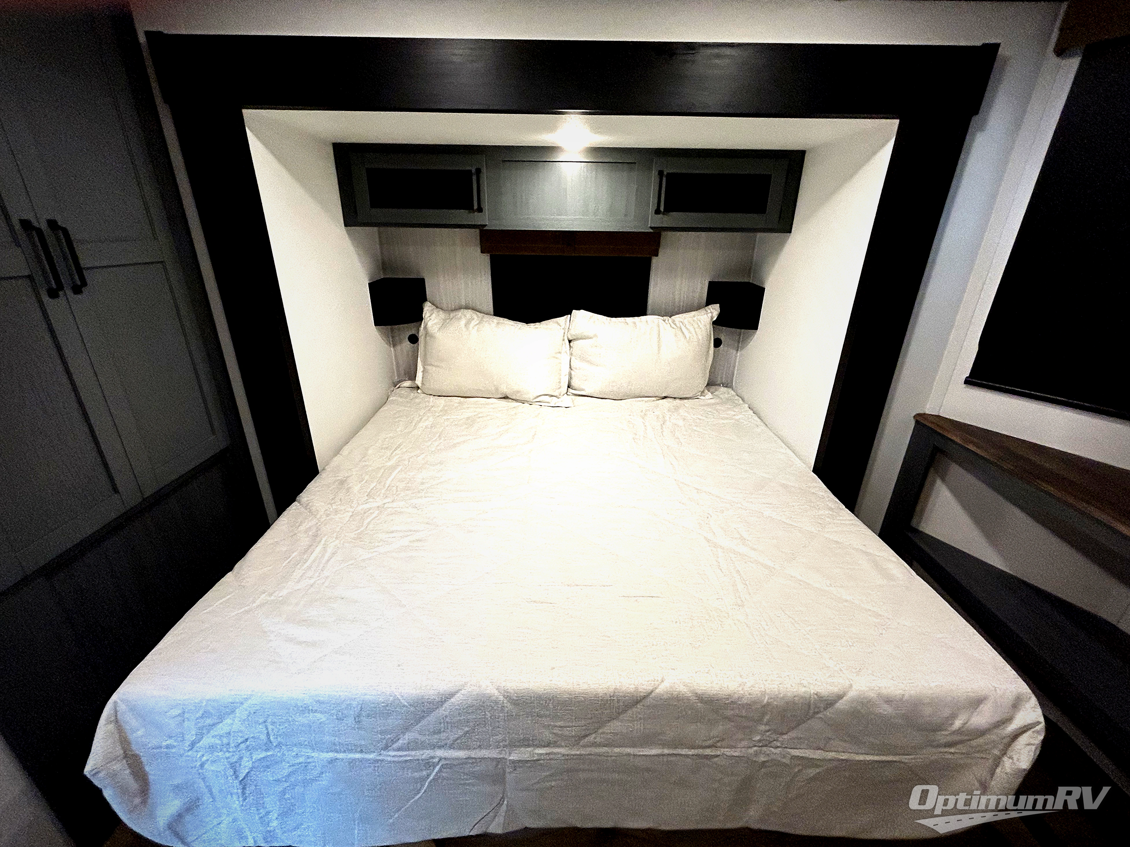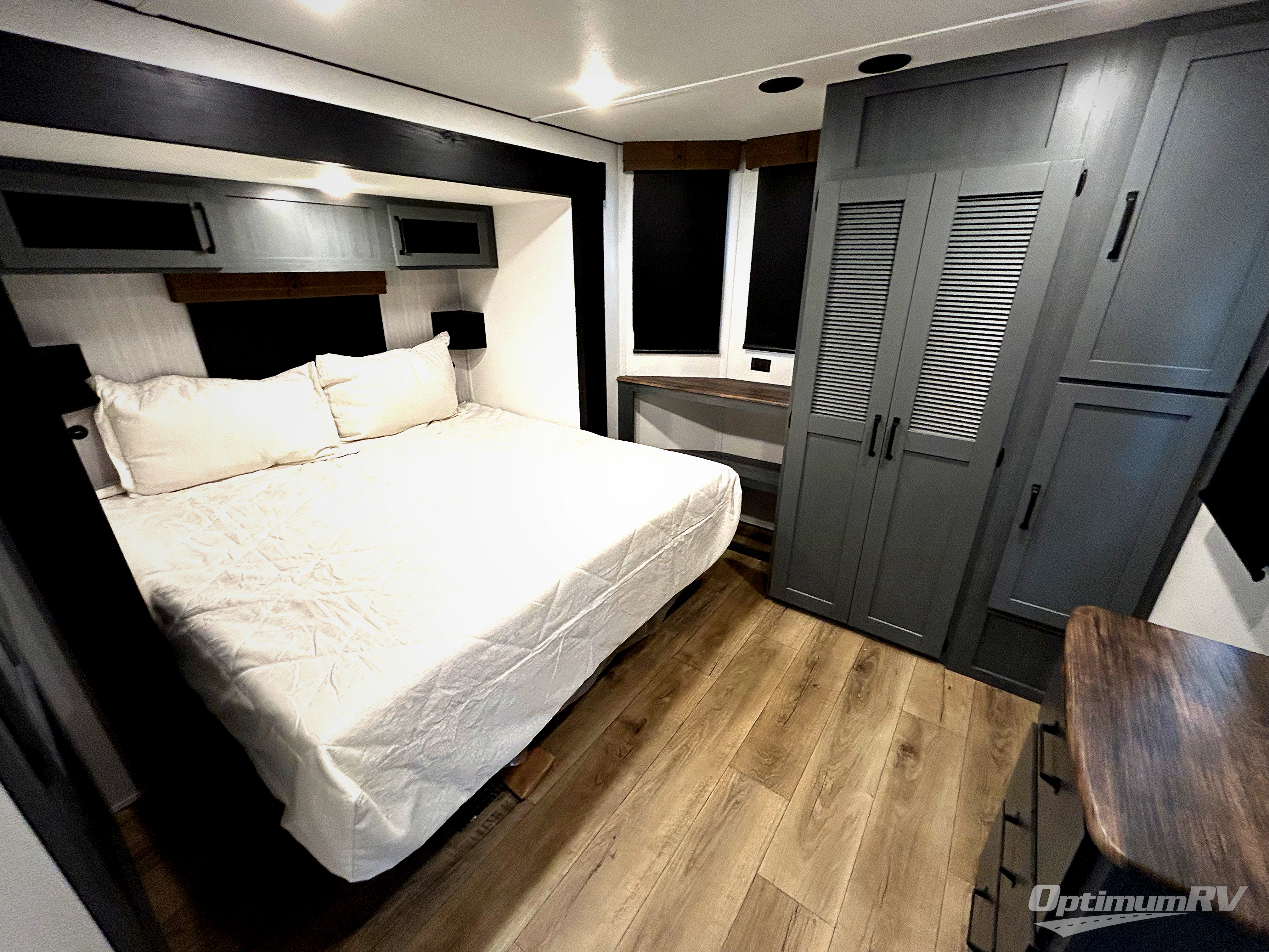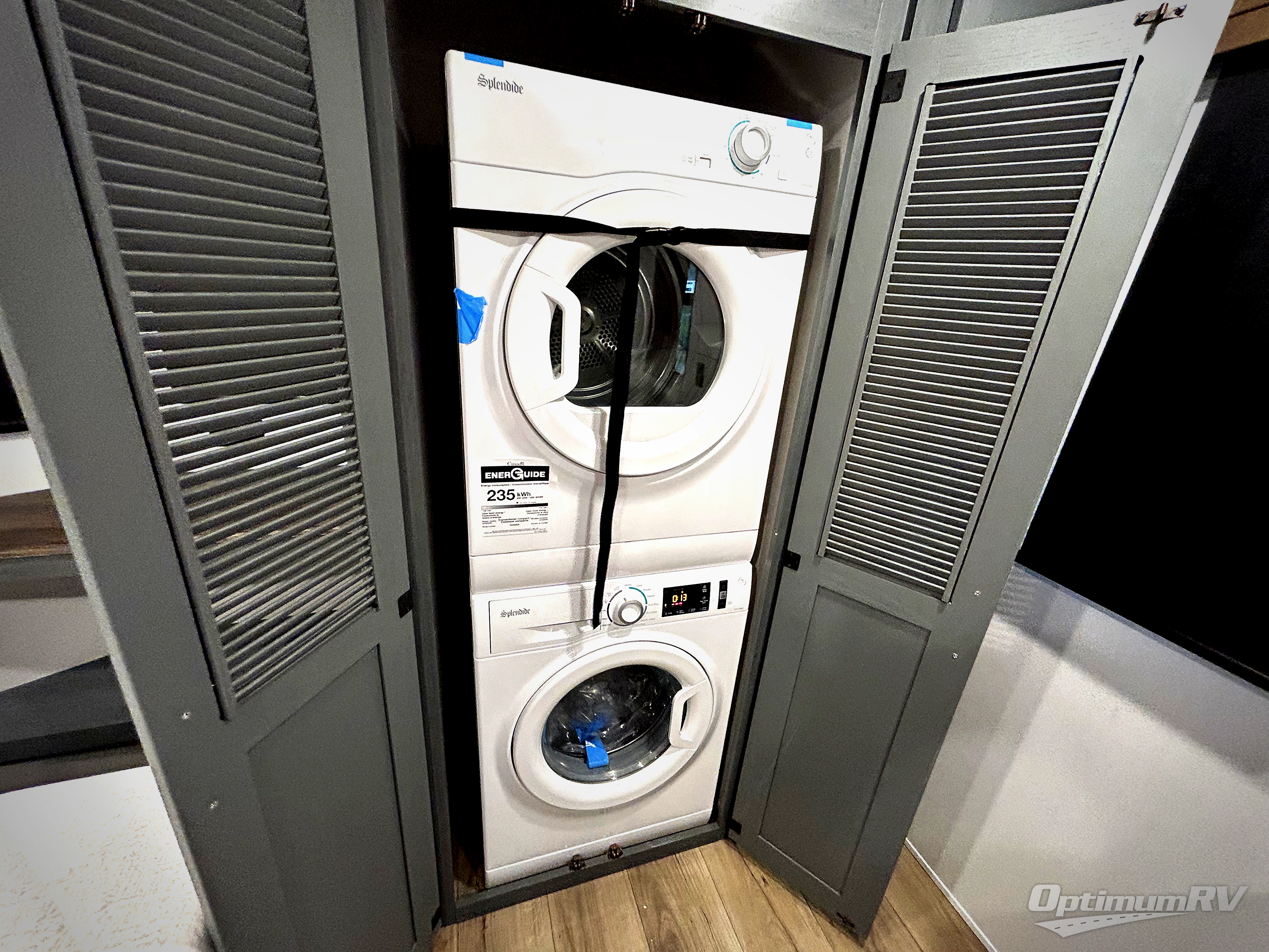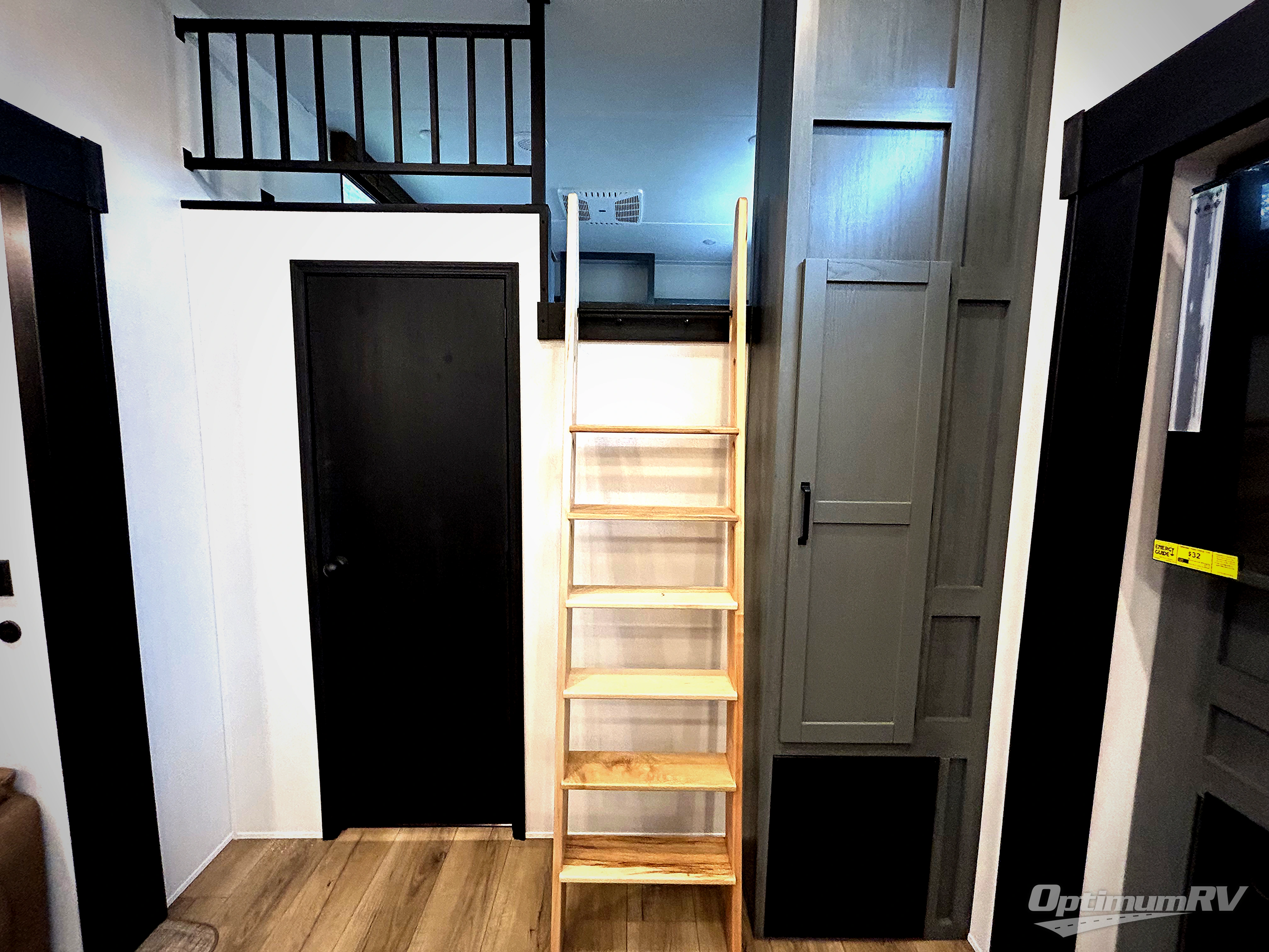 Head to your favorite spots with this destination trailer! With two entry doors, you can easily enter or exit the unit. The front private bedroom includes a king bed slide out, a wardrobe and dresser to keep your clothes organized, plus a countertop for your books or jewelry. Just outside this room is the ladder that leads to the large loft area with two 32" x 80" bunk mats, a cubby, a counter, a nightstand, and cabinets. Once you've headed back downstairs, you can relax on the L-shaped sofa across from the entertainment center with a fireplace and slide-out cabinet or the free-standing table with a bench and two seats. And the chef of your group will love the kitchen with its residential style refrigerator and pantry, kitchen island, and four burner cooktop. The full rear bathroom not only has a 32" x 40" shower with a seat to freshen up in and a closet prepped to add the optional washer and dryer, but is also below the second loft with a 32" x 80" bunk mat and closet for storage!