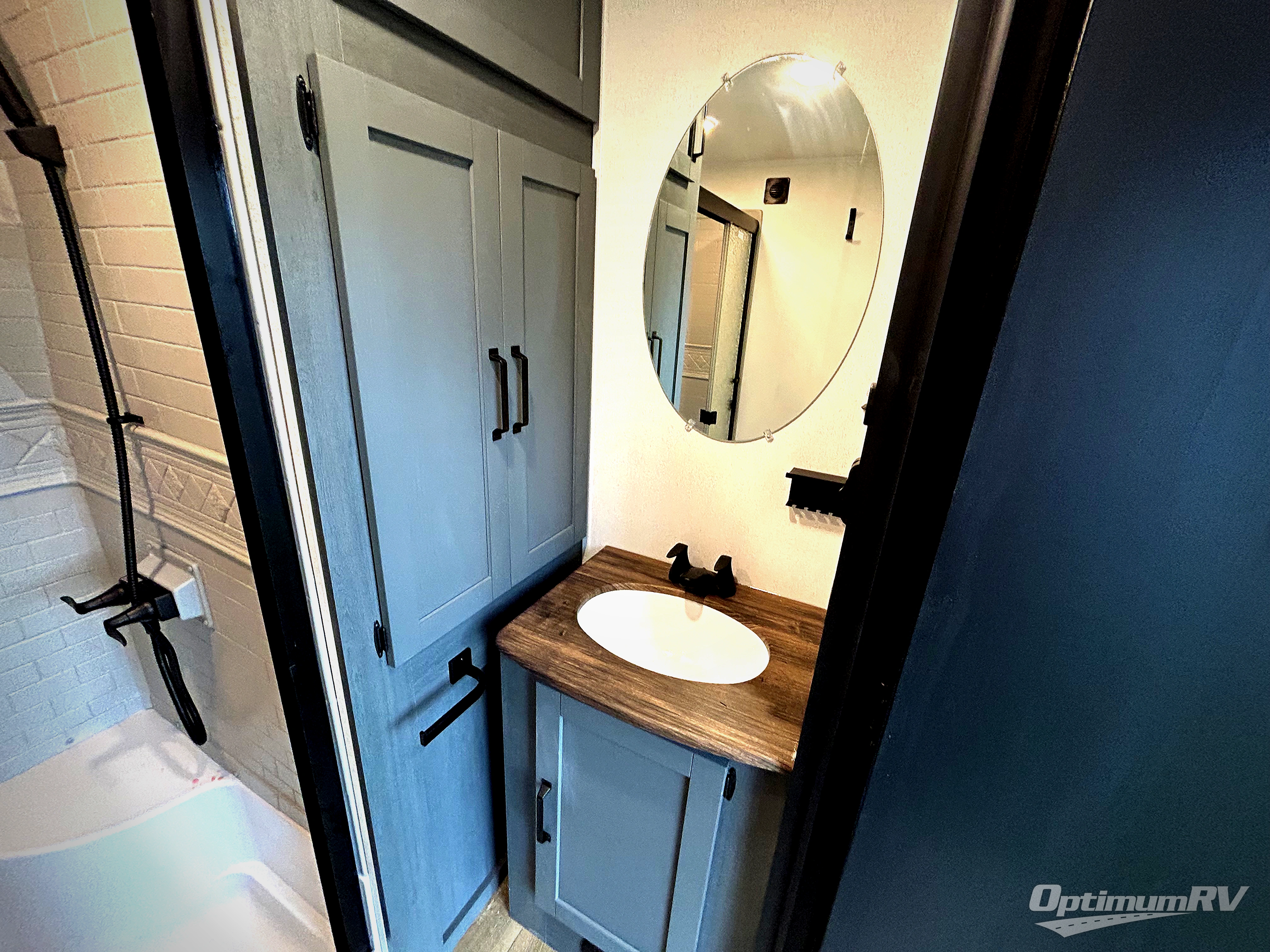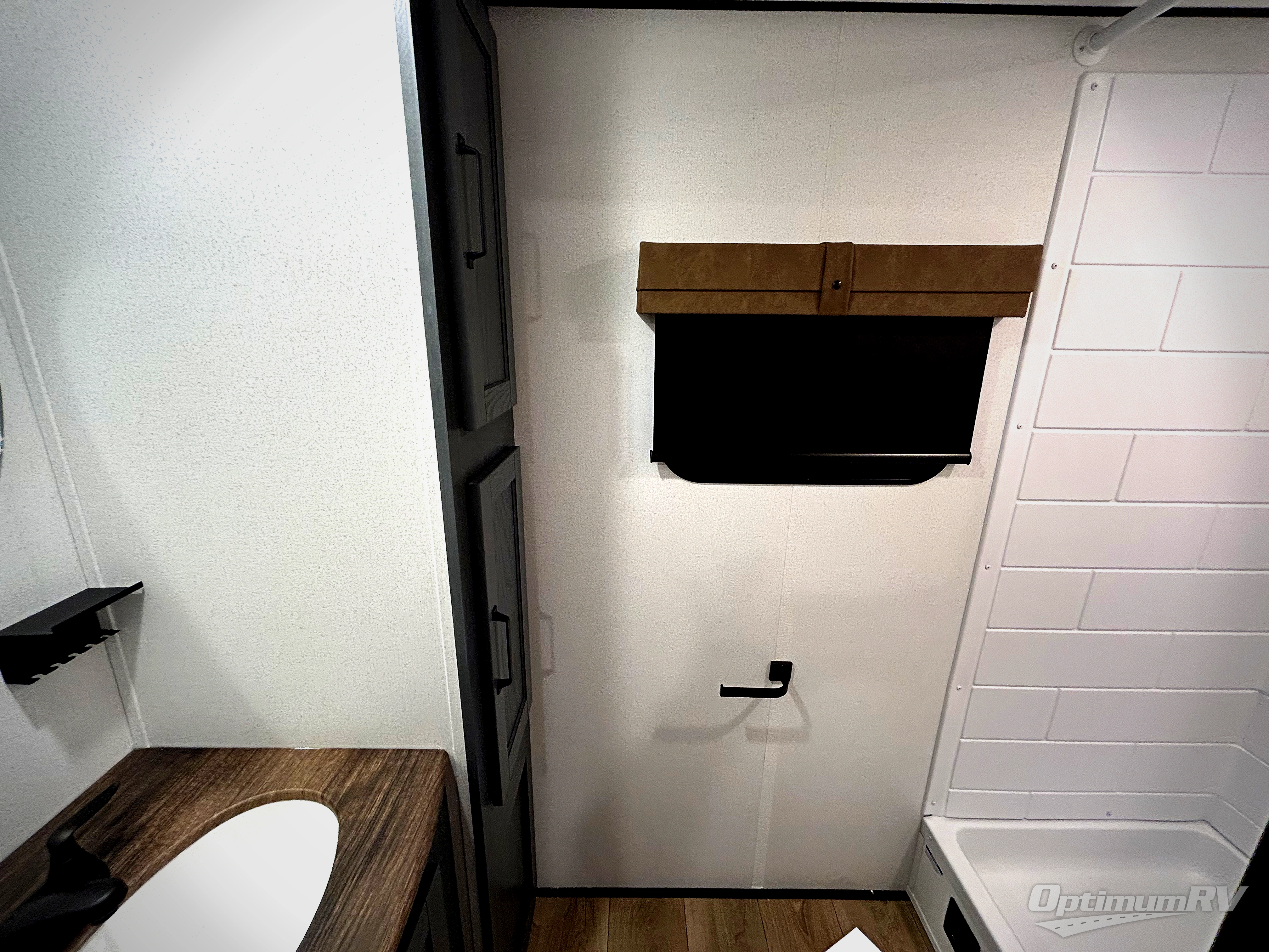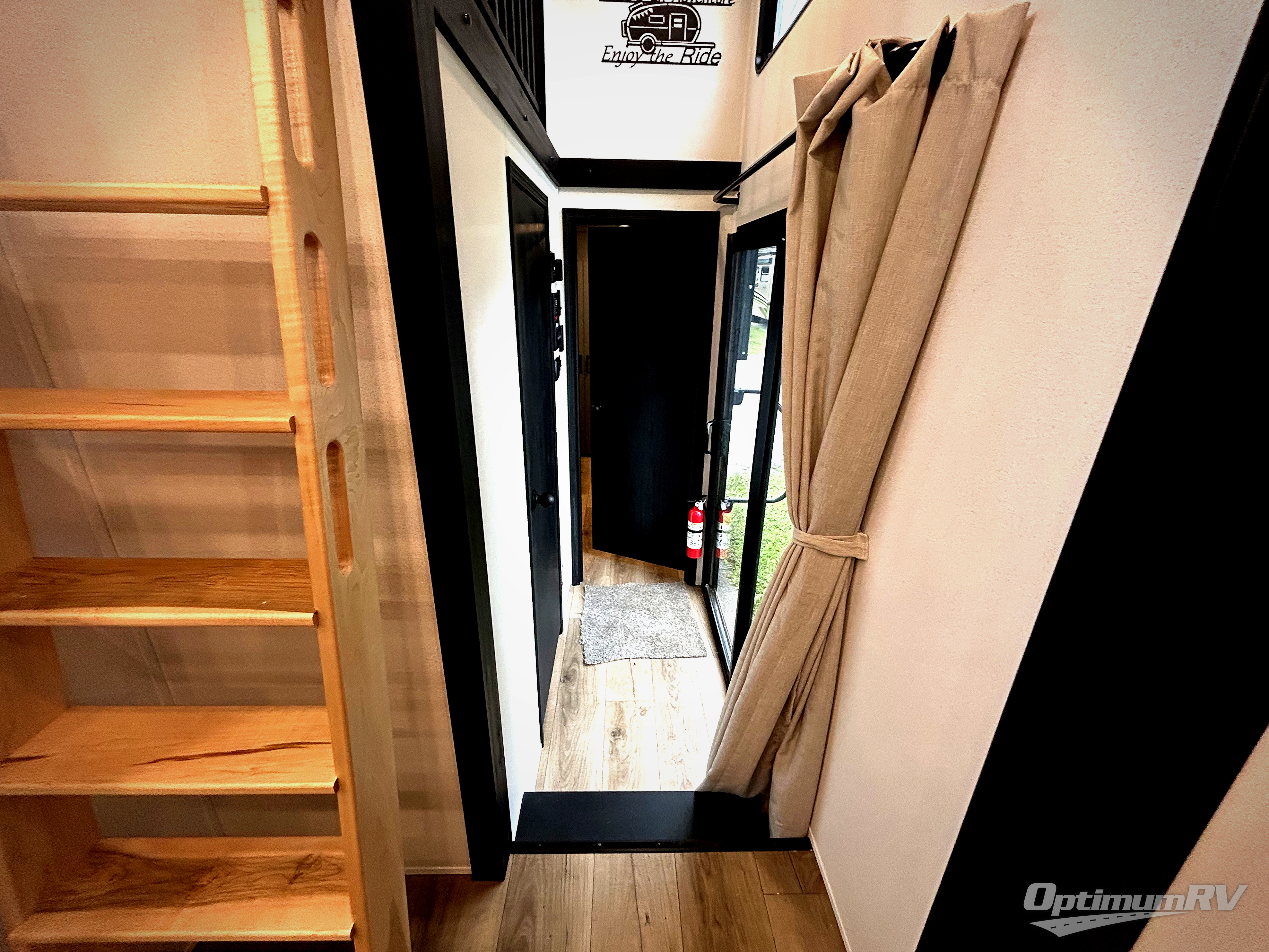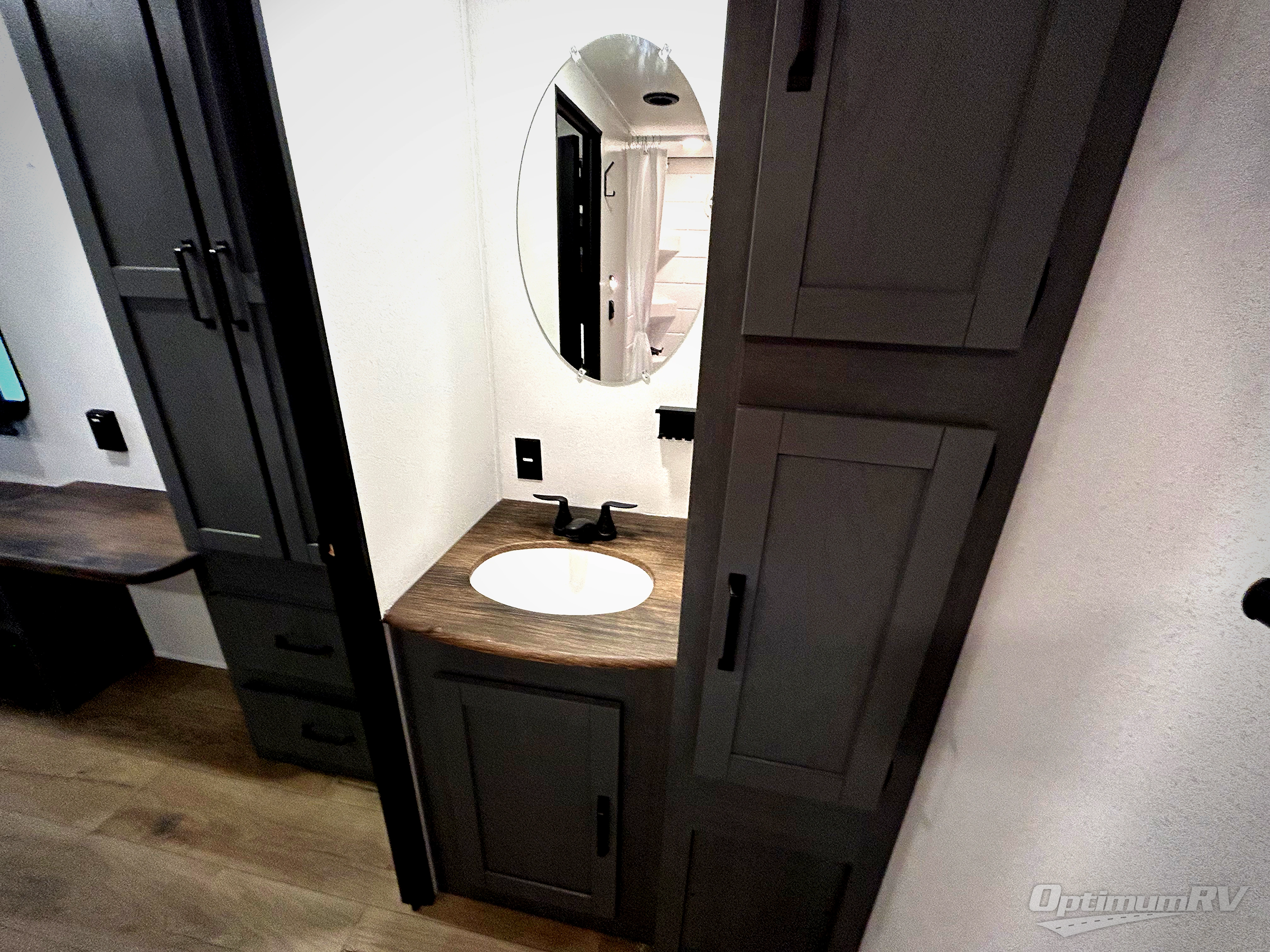 Head to your favorite spots with this destination trailer! With two entry doors, you can easily enter or exit the unit. The front private bedroom includes a king bed slide out, a wardrobe and dresser to keep your clothes organized, plus a countertop for your books or jewelry. Just outside this room is the ladder that leads to the large loft area with two 32" x 80" bunk mats, a cubby, a counter, a nightstand, and cabinets. Once you've headed back downstairs, you can relax on the L-shaped sofa across from the entertainment center with a fireplace and slide-out cabinet or the free-standing table with a bench and two seats. And the chef of your group will love the kitchen with its residential style refrigerator and pantry, kitchen island, and four burner cooktop. The full rear bathroom not only has a 32" x 40" shower with a seat to freshen up in and a closet prepped to add the optional washer and dryer, but is also below the second loft with a 32" x 80" bunk mat and closet for storage!