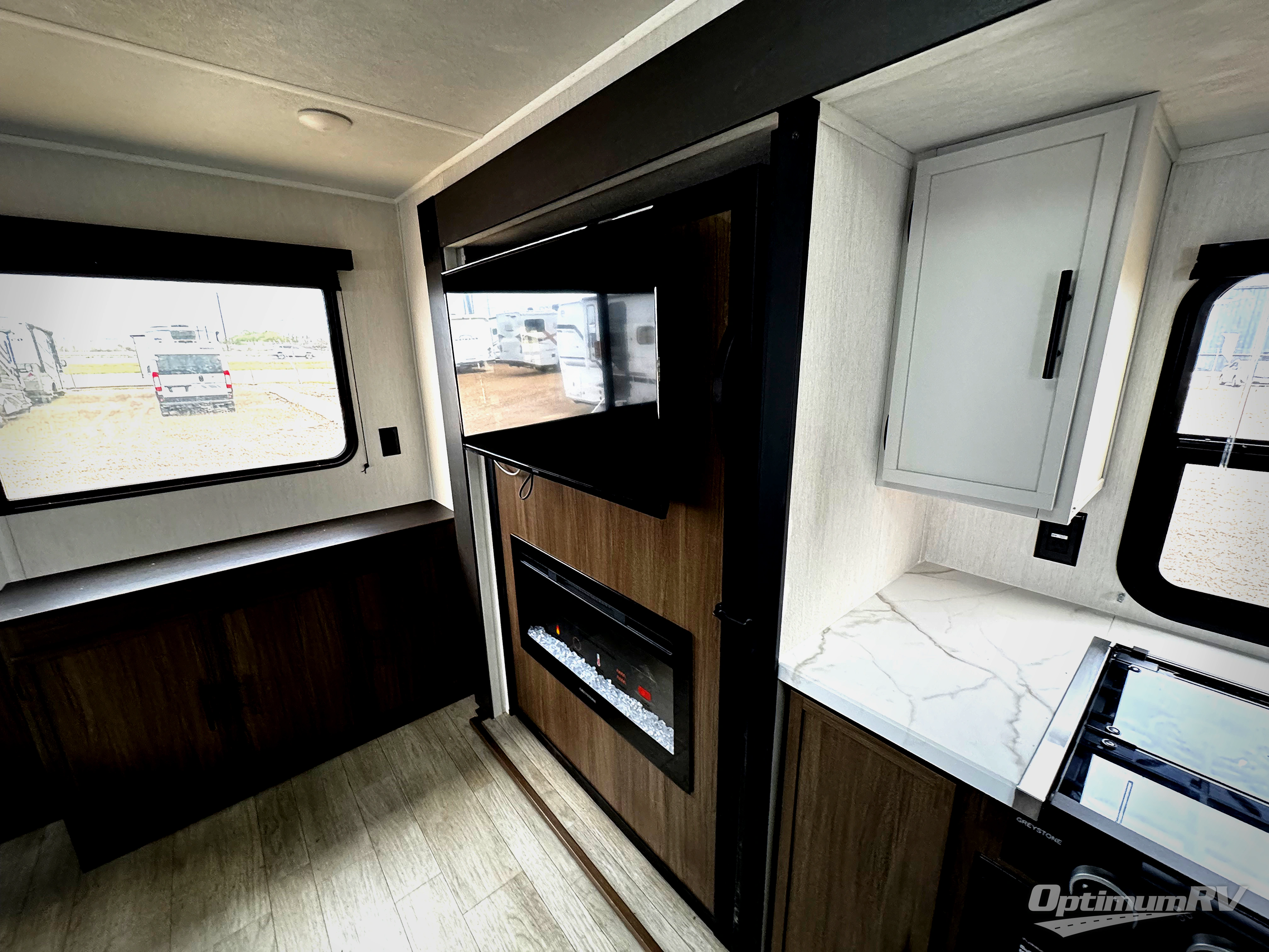 There is ample space to move about in this travel trailer thanks to the dual opposing slides! Here, you'll find an L-shaped sofa with a chaise lounge in direct view of TV and fireplace. There is also a hidden pantry behind the TV for snacks and movies! The center farm table includes four stools so you can gather around for meal times, and the desk with a chair will provide a place for you to get some work done if needed. This unit features a full bath towards the front private bedroom for easy access at night, and you're sure to get a great night's rest on the camp king bed!