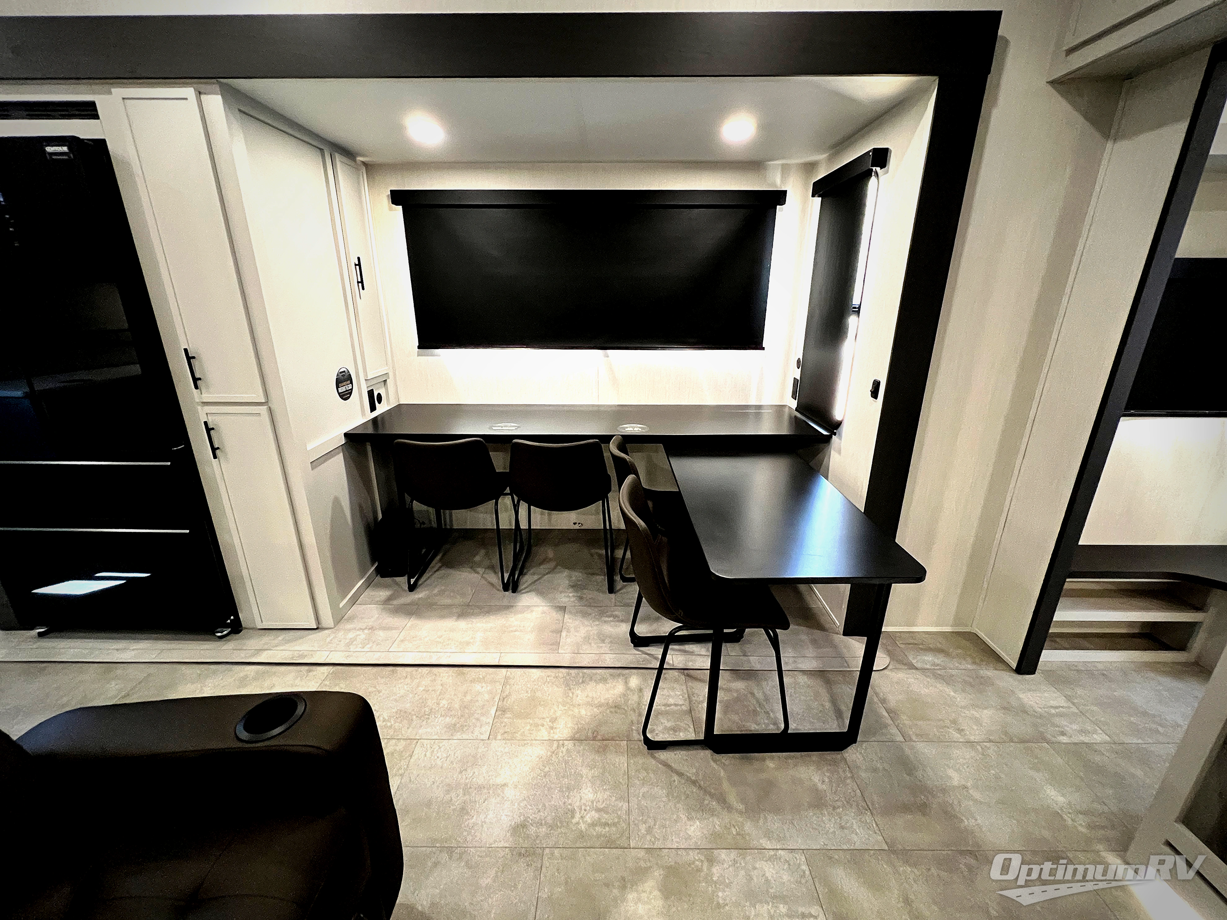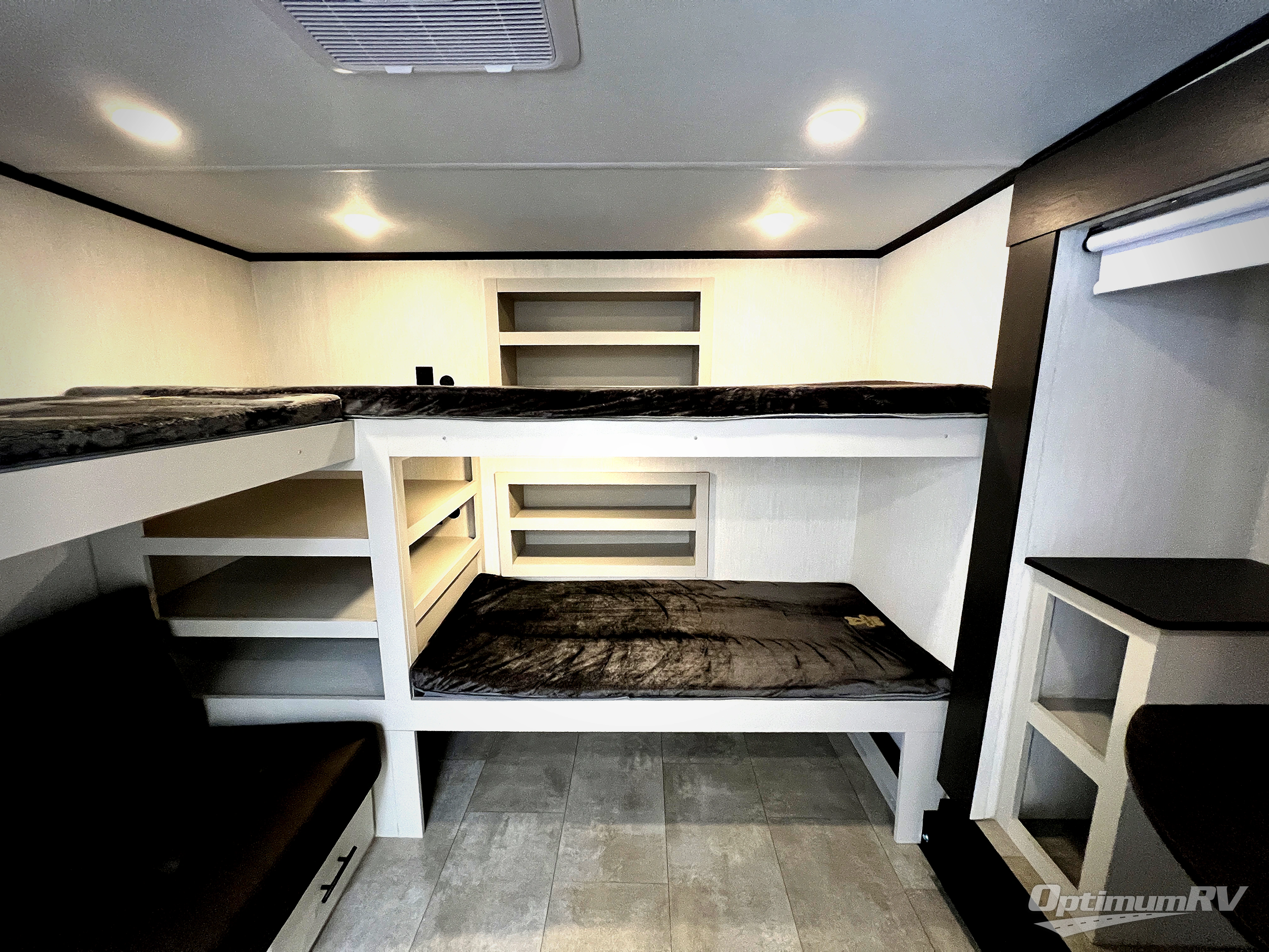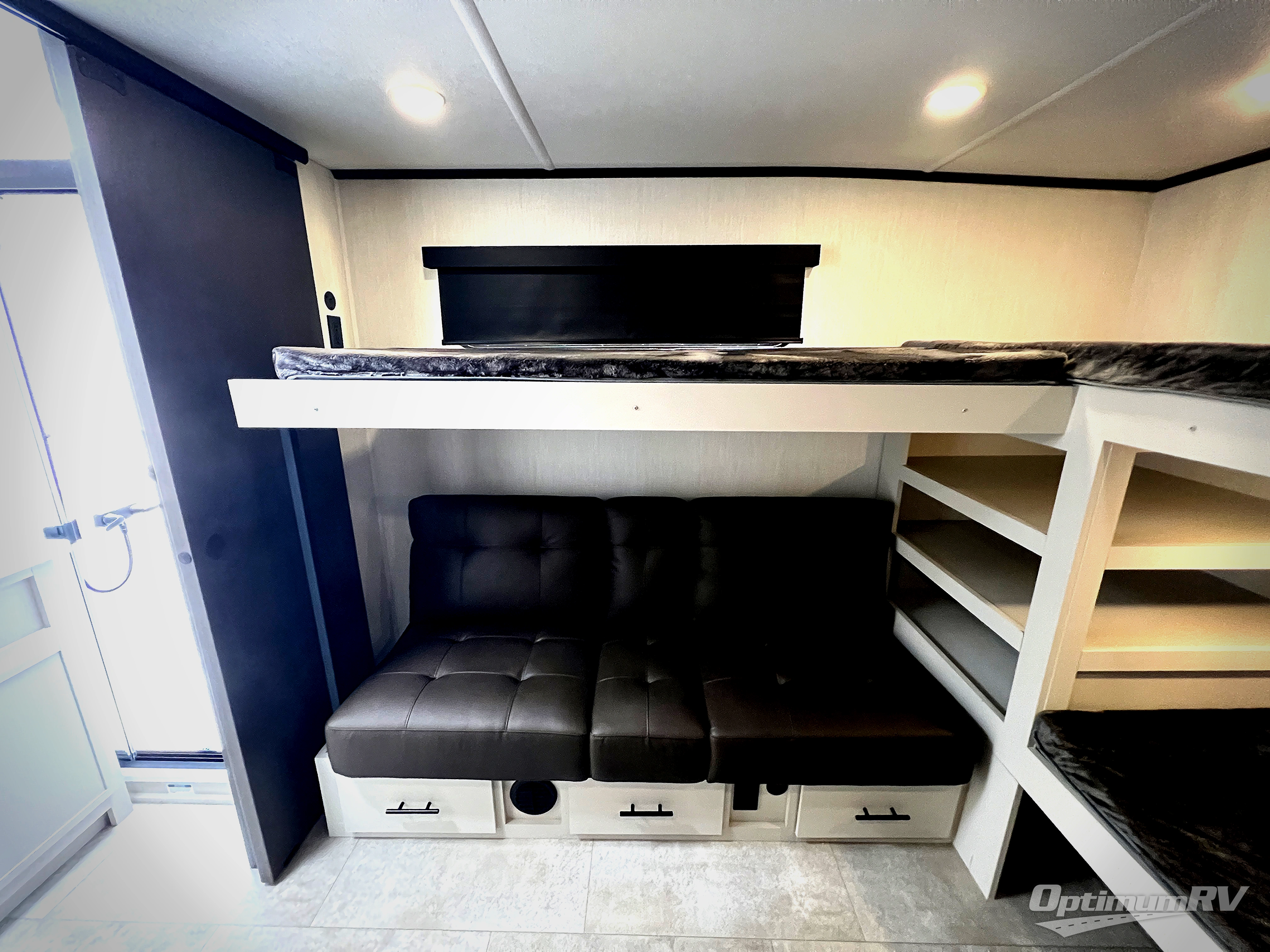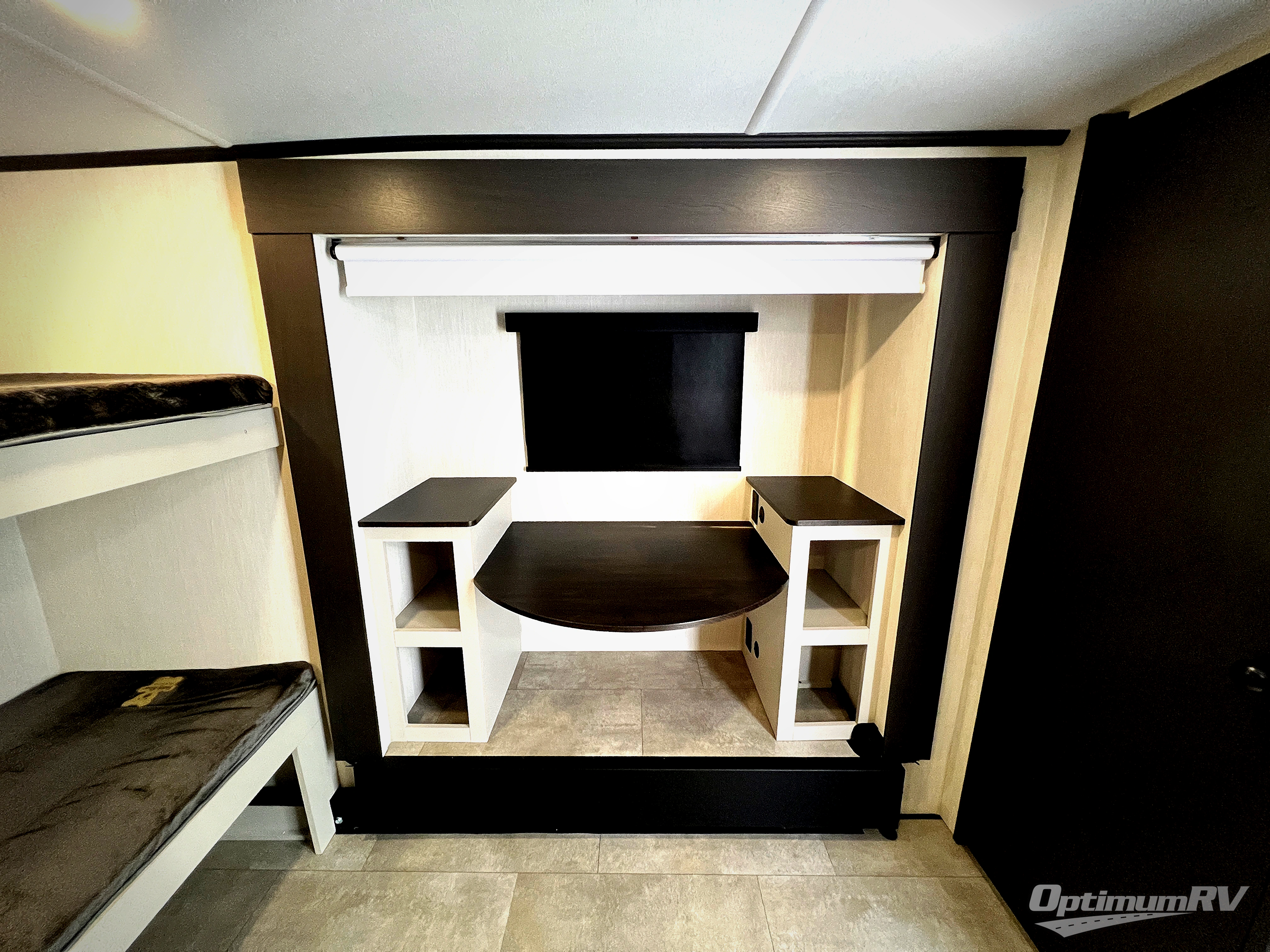 If you enjoy long trips with family and friends, this fifth wheel is sure to meet all of your needs! There is a private bedroom with a king bed slide-out for more space and comfort, plus a front wardrobe. And you will be amazed by the lovely full bathroom behind the barn door next to the bedroom with a double vanity for you and your partner! The living room is made spacious thanks to the dual opposing slides, and you'll find a sectional sleeper sofa here, as well as desk/dinette for meals and even work. And don't overlook the kitchen area with ample counter space, a four burner range, an accessory sink and a French door 12V refrigerator! If you thought it can´t get better, wait until you see the front room that will be the best place to relax and hang out, featuring a sleeper sofa, bunks above, and an entertainment center with a projector for a movie marathon.