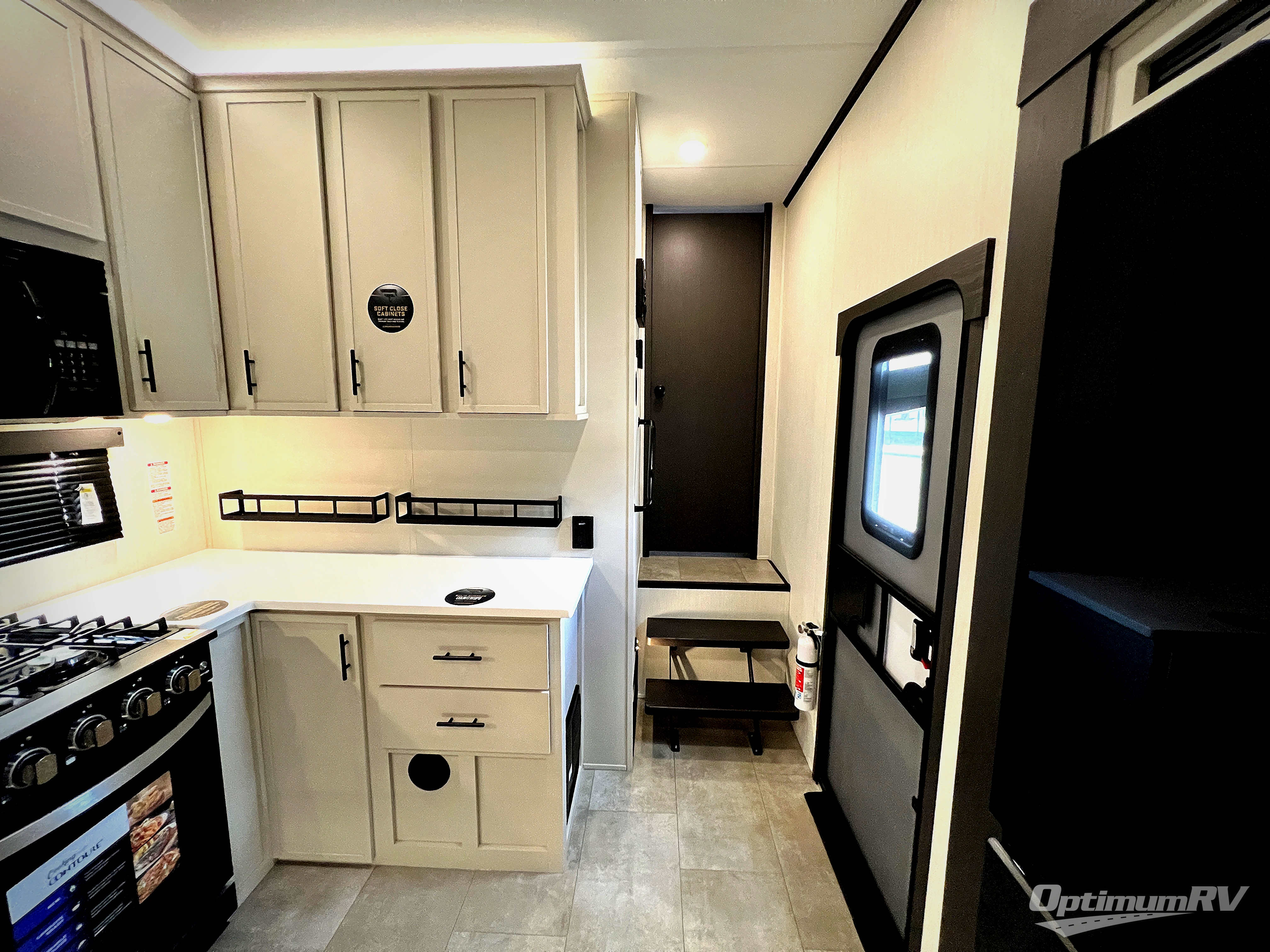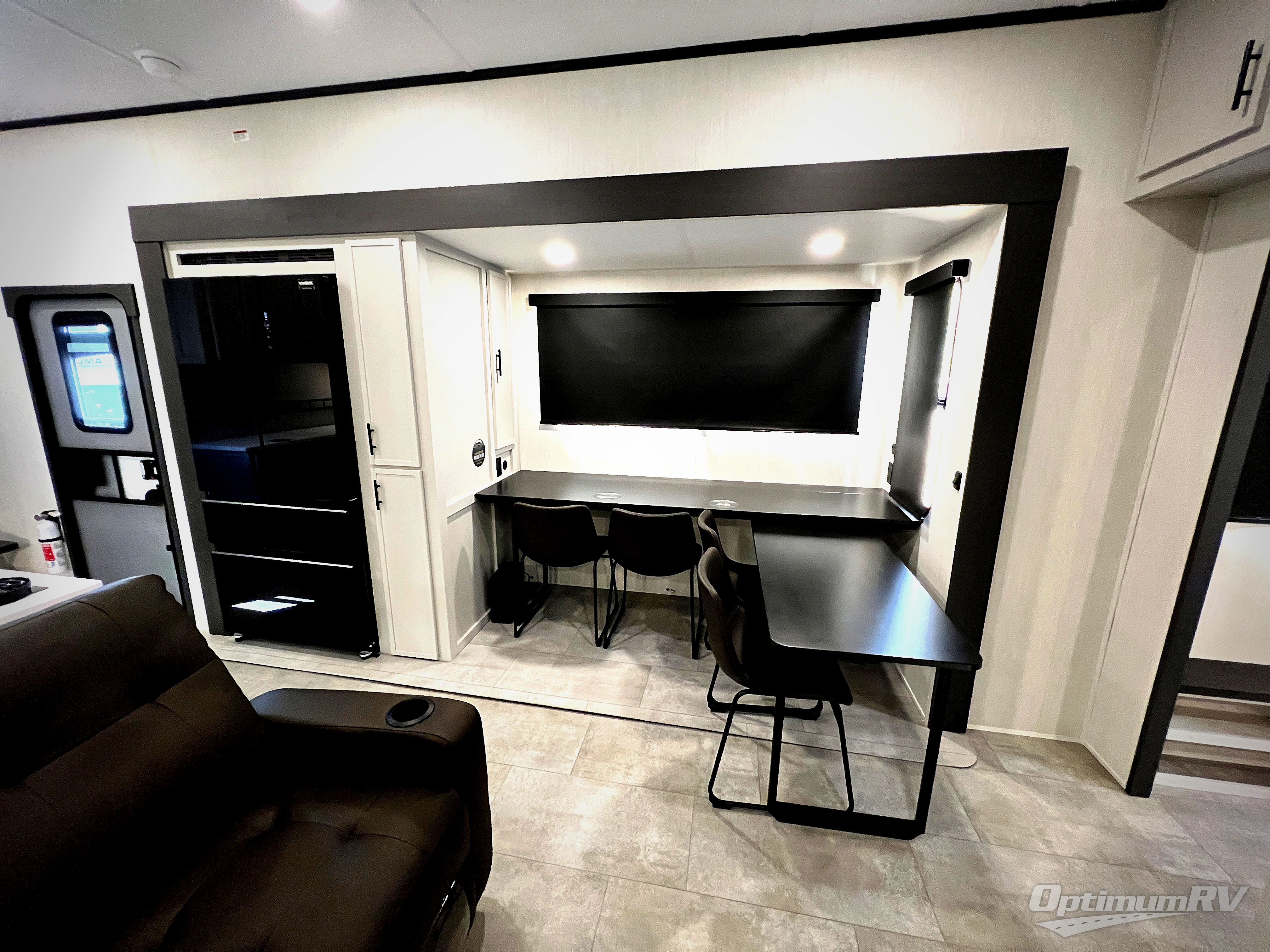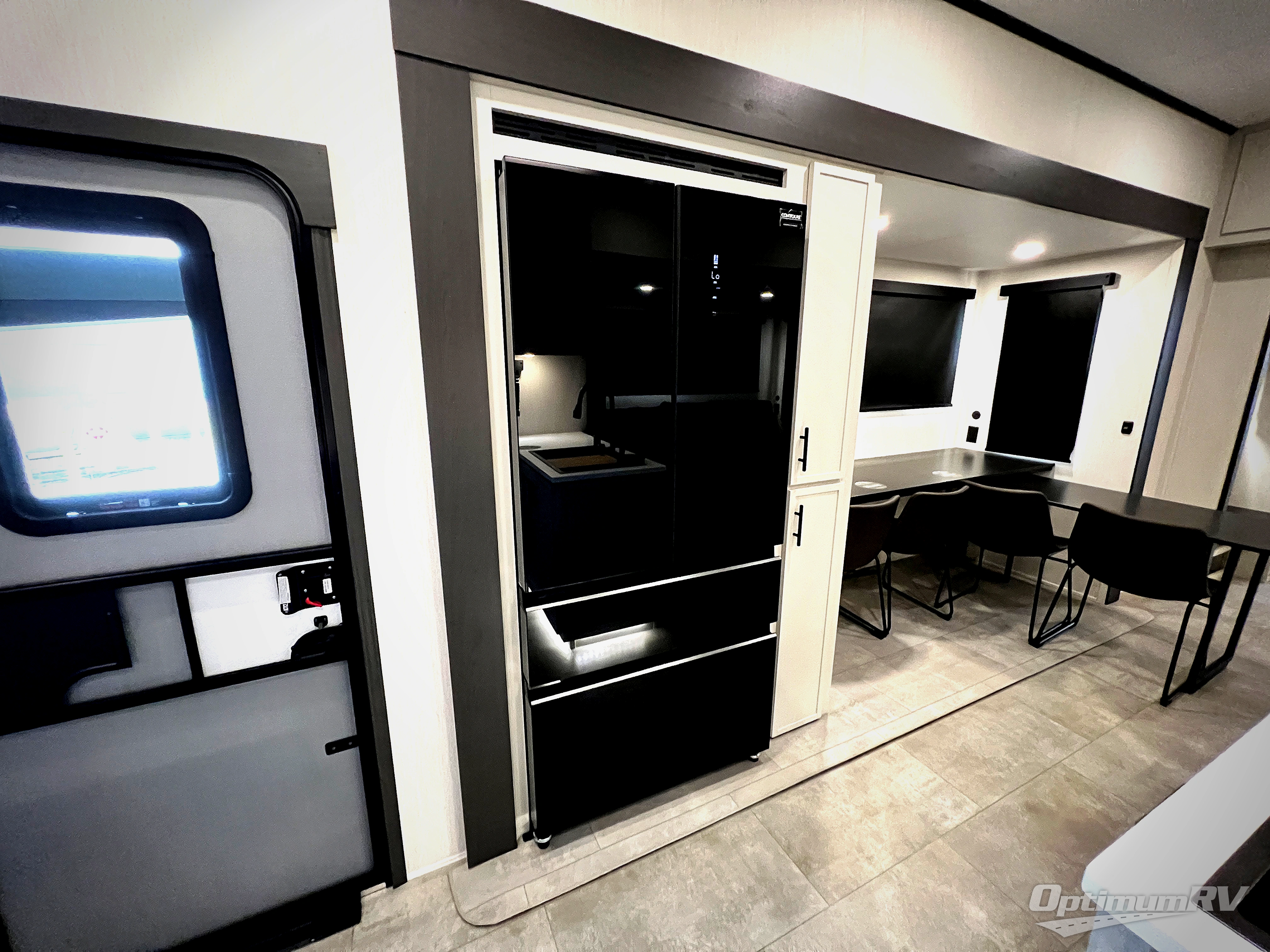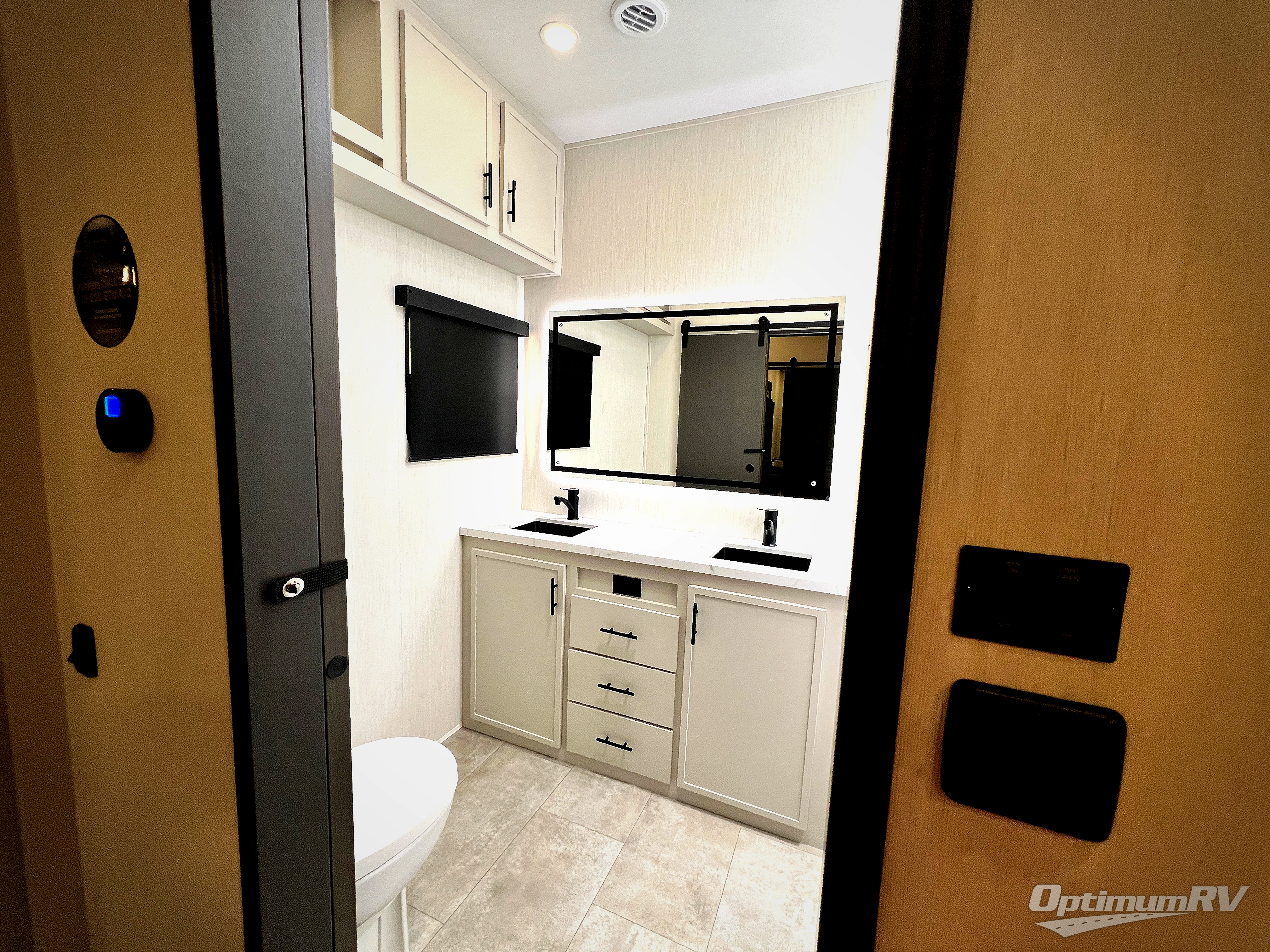 If you enjoy long trips with family and friends, this fifth wheel is sure to meet all of your needs! There is a private bedroom with a king bed slide-out for more space and comfort, plus a front wardrobe. And you will be amazed by the lovely full bathroom behind the barn door next to the bedroom with a double vanity for you and your partner! The living room is made spacious thanks to the dual opposing slides, and you'll find a sectional sleeper sofa here, as well as desk/dinette for meals and even work. And don't overlook the kitchen area with ample counter space, a four burner range, an accessory sink and a French door 12V refrigerator! If you thought it can´t get better, wait until you see the front room that will be the best place to relax and hang out, featuring a sleeper sofa, bunks above, and an entertainment center with a projector for a movie marathon.