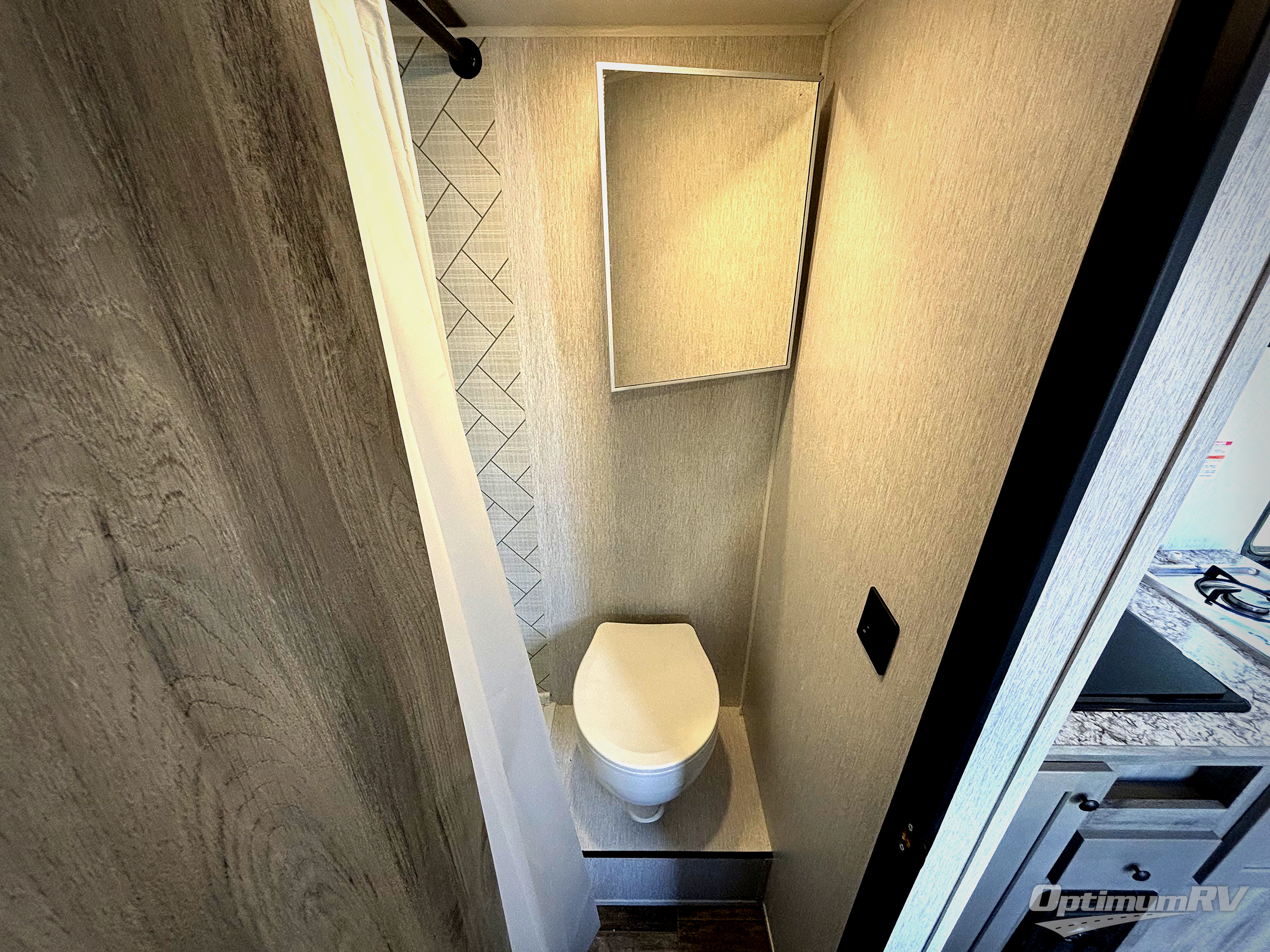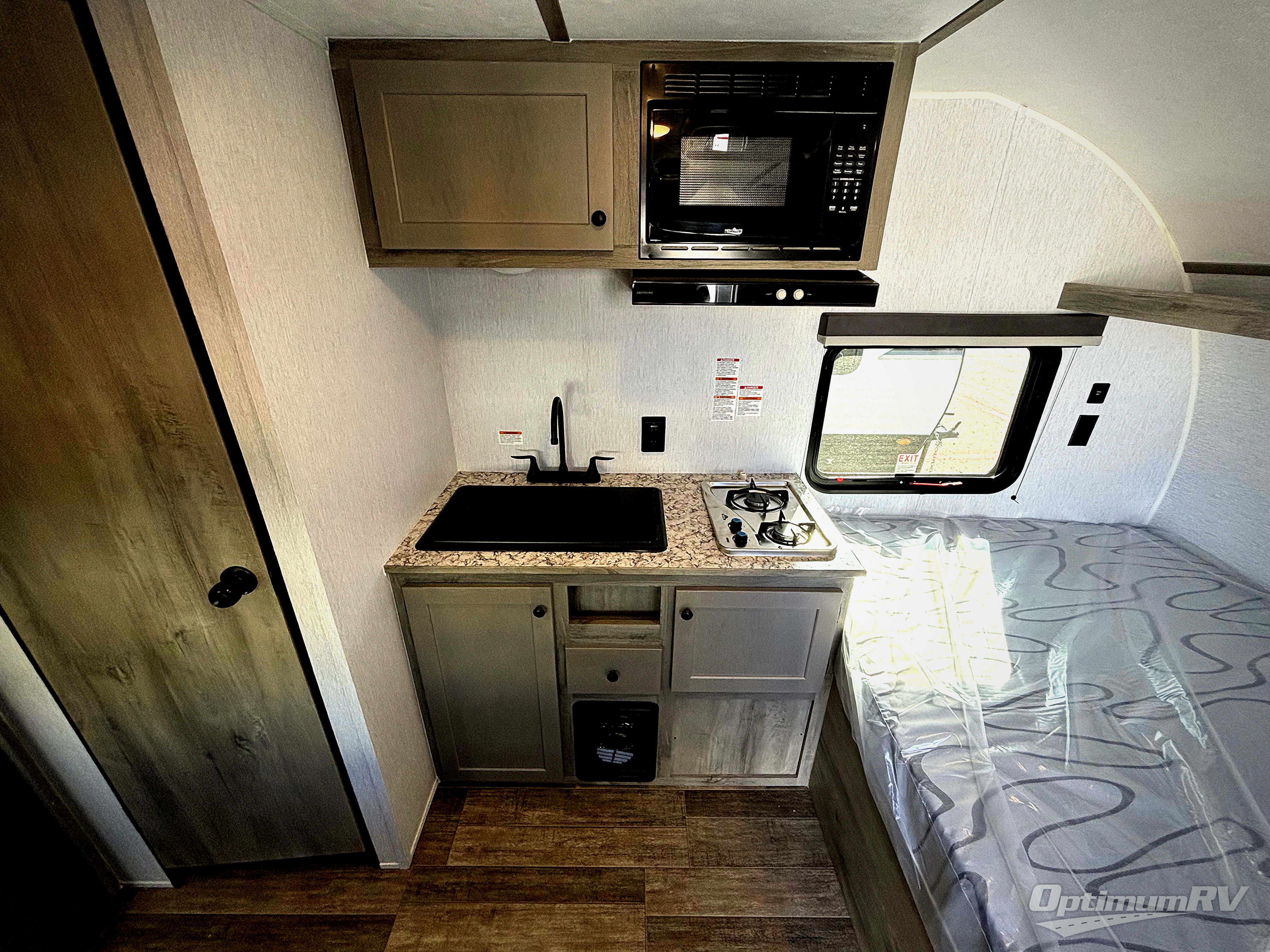 This lightweight travel trailer is perfect for two to three campers each night! You will sleep soundly on the front 54" x 74" bed with an overhead shelf and a closet for your things. Whip up eggs and bacon on the two burner cooktop in the morning, then dine at the 30" booth dinette. This can also double as sleeping space for an overnight guest or two little ones! The private bath with a 24" x 32" shower and a toilet will let you freshen up each day, and the double sink in the kitchen provides a place to wash your hands and teeth at night. You will also appreciate having a 4.3 cu. ft. 12V refrigerator to keep your food fresh and a 5K BTU wall A/C to keep you comfortable all summer long!