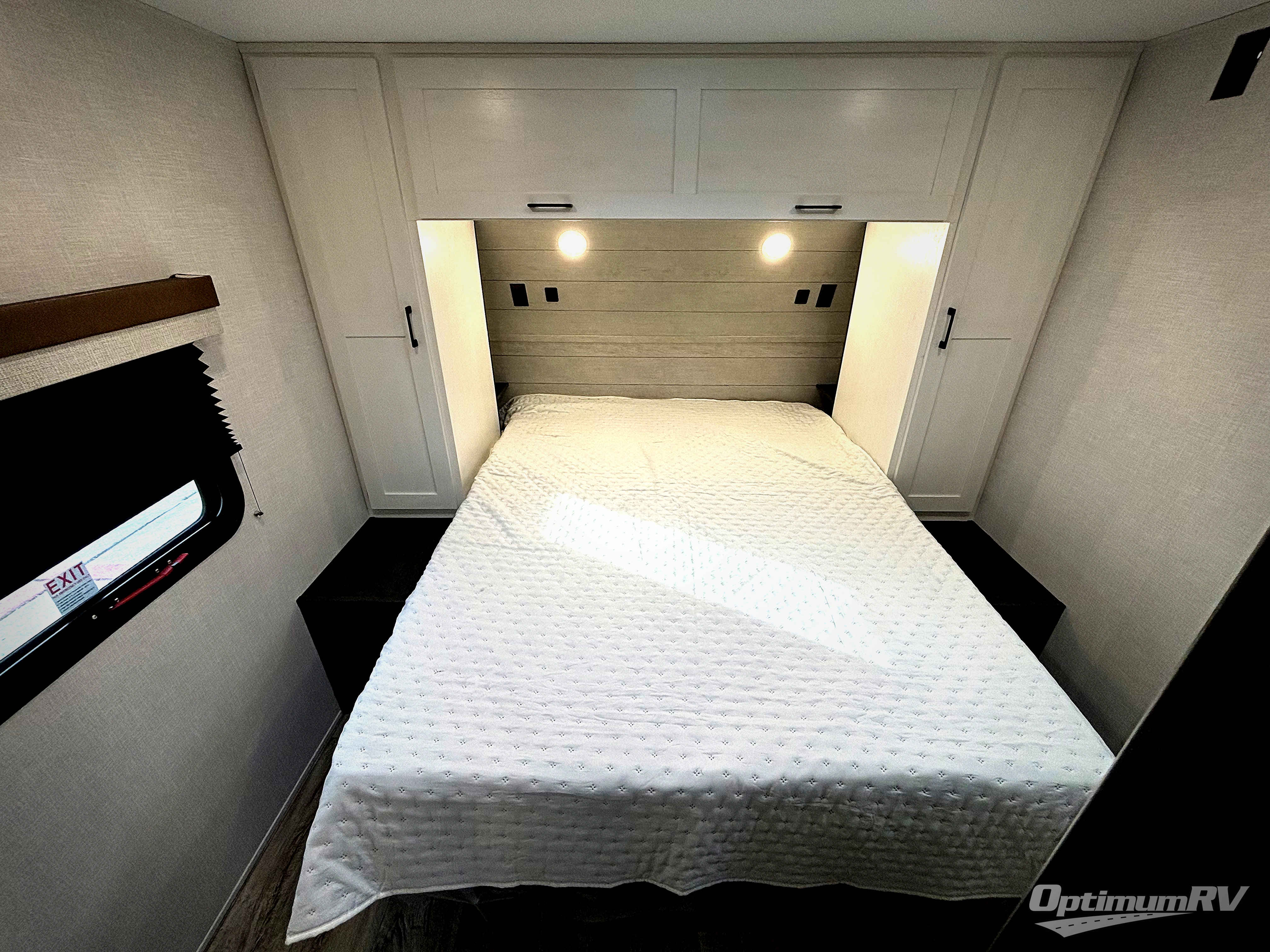 You'll love every minute spent in this dual entry travel trailer. The front master bedroom includes one of these doors, along with a Sleep Tight queen bed, dual wardrobes, and easy access into the walk-thru bath. Your crew can relax on the theater seating within the large slide out, play a game at the Sit N' Slide table with flipside reversible cushions, or dine at the bartop with stools. There is also a rear kitchen with ample counter space. Head outdoors to enjoy the 20' power awning in your camp chairs!