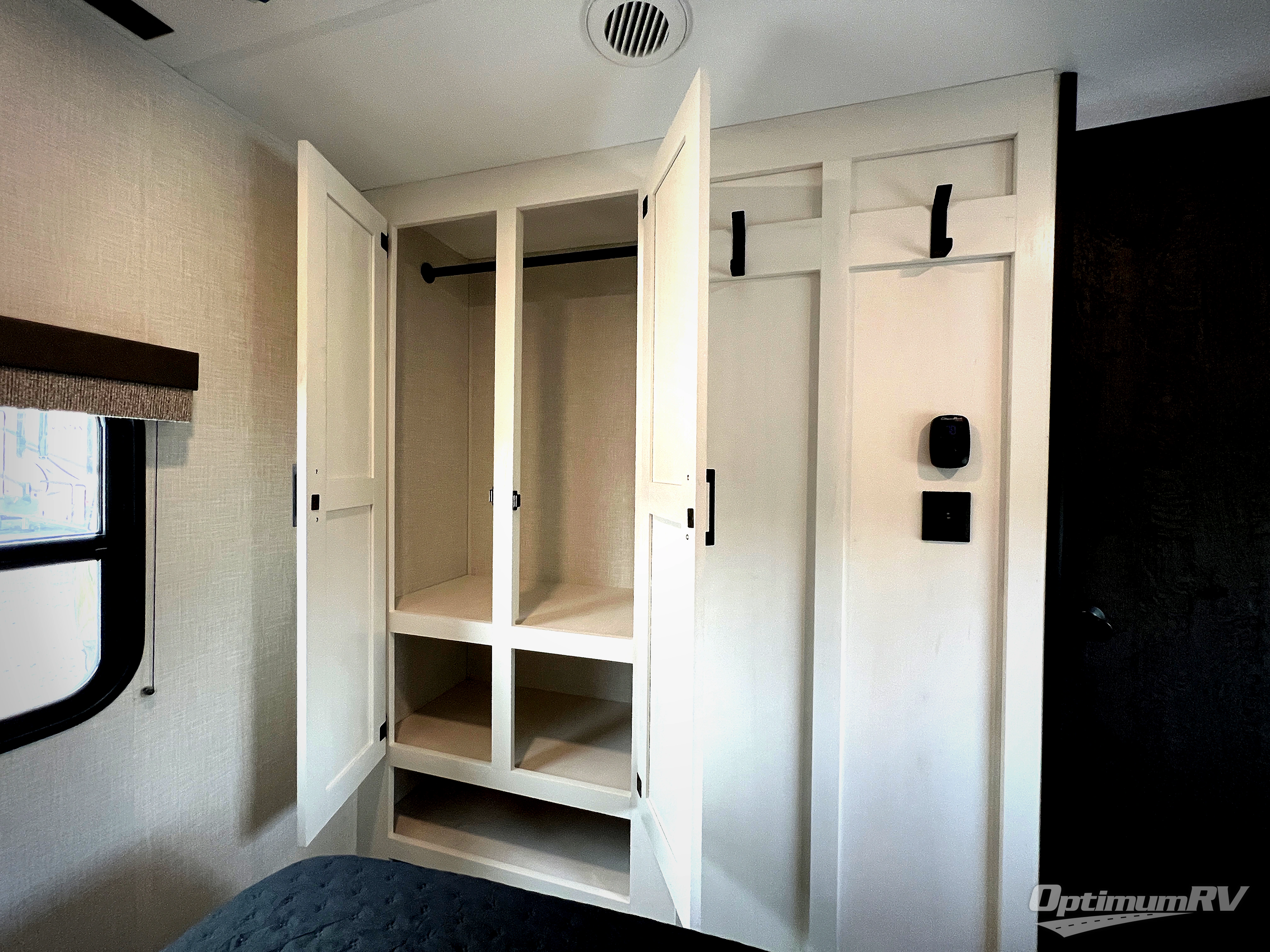 You will be enchanted by this travel trailer features! Starting with the rear bathroom which offers a convenient linen closet, keeping your essentials within reach. Moving forward to the kitchen area, the sit n’ slide booth dinette is a fun and functional spot for meals or socializing, also the kitchen is well-equipped with a 10 cu refrigerator, three-burner cooktop, and pantry, making you feel right at home. For the entertainment and leisure, the sofa provides a comfortable spot to relax, and the fireplace adds a cozy touch to the interior plus, the 40” TV is perfect for family movie nights or enjoying your favorite shows on the go. The front bedroom offers a spacious queen bed, overhead cabinet, and wardrobe. The exterior awning provides shade and protection from the elements, while the pass-through storage will provide ample space for your outdoor gear and equipment.