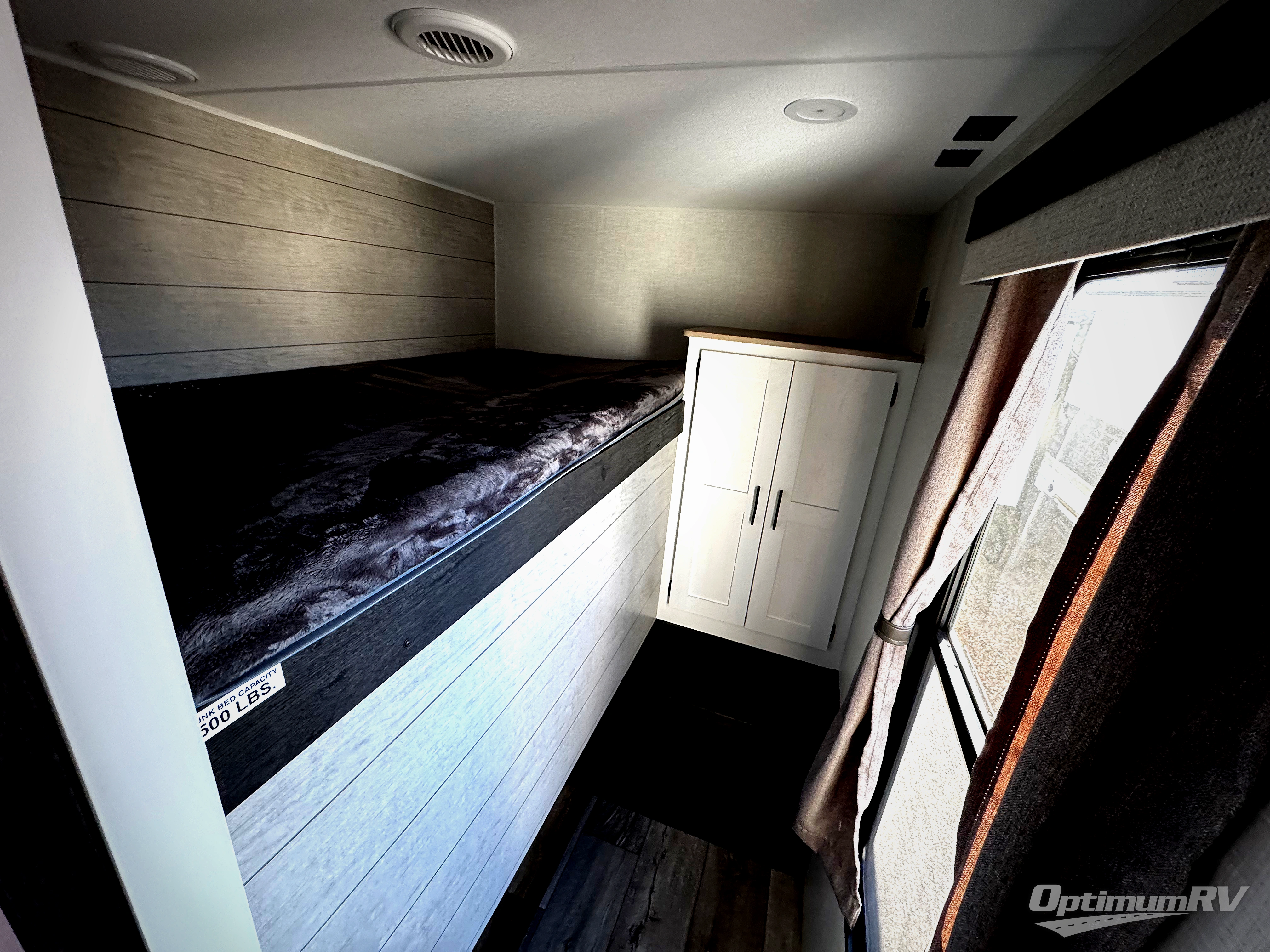 This travel trailer’s bunk beds are perfect for kids, providing ample sleeping space for the whole family. The wardrobes offer plenty of storage for your clothing and essentials.The sofa is a comfortable spot to relax, and the fireplace adds a cozy touch to the interior. The entertainment center is equipped with a 50” TV, perfect for family movie nights or enjoying your favorite shows on the go. The walk-in pantry provides ample storage for your food and snacks, while the 10 cu refrigerator keeps your food and drinks fresh. The sit n’ slide table is a fun and functional spot for meals and adds additional sleeping space. For convenience and comfort the walk-through bath provides easy access and convenience, while the overhead cabinets offer additional storage for your essentials. The front bedroom features a spacious queen bed and overhead cabinet. Head outside and unwind under the shade of the two exterior awnings and store everything you need in the pass-through storage offering ample space for your outdoor gear and equipment.
