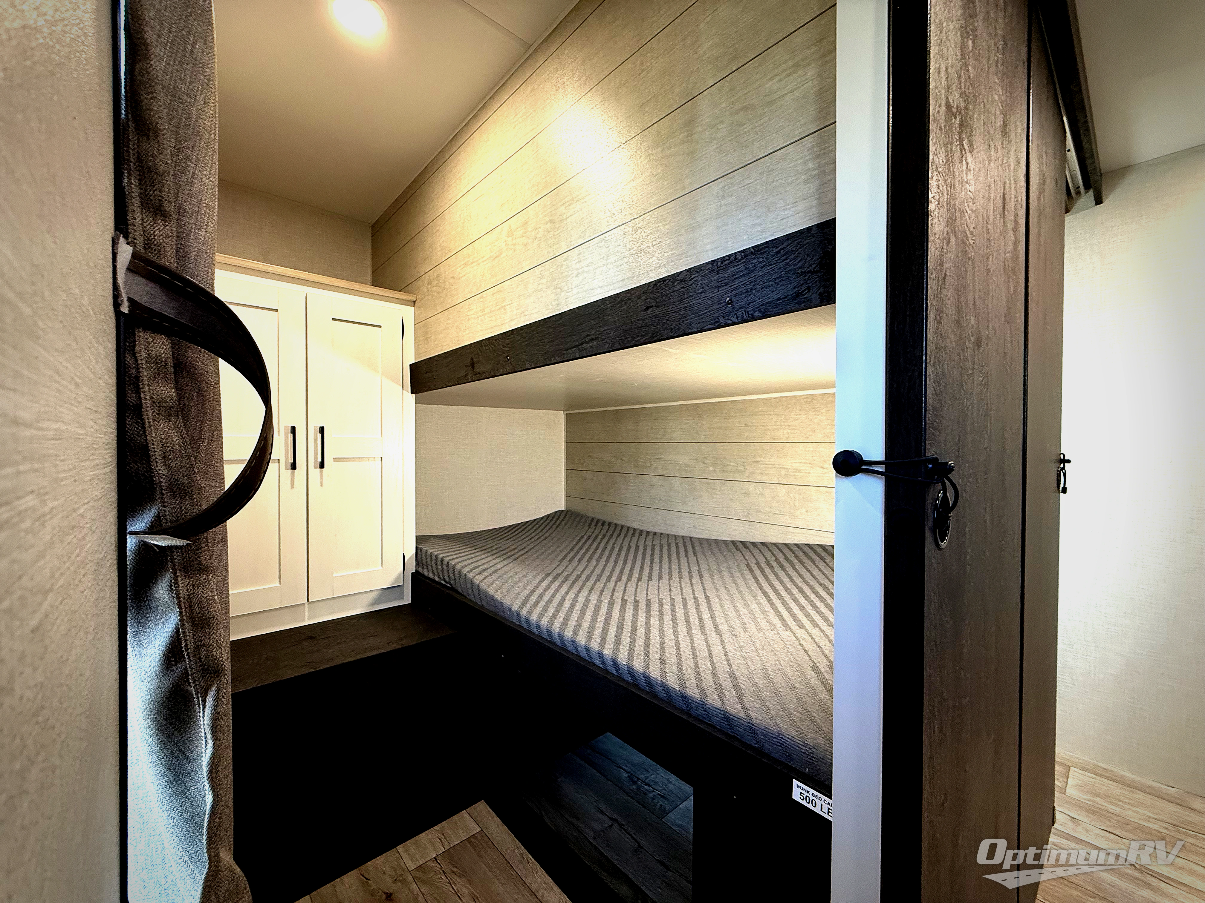 This travel trailer’s bunk beds are perfect for kids, providing ample sleeping space for the whole family. The wardrobes offer plenty of storage for your clothing and essentials.The sofa is a comfortable spot to relax, and the fireplace adds a cozy touch to the interior. The entertainment center is equipped with a 50” TV, perfect for family movie nights or enjoying your favorite shows on the go. The walk-in pantry provides ample storage for your food and snacks, while the 10 cu refrigerator keeps your food and drinks fresh. The sit n’ slide table is a fun and functional spot for meals and adds additional sleeping space. For convenience and comfort the walk-through bath provides easy access and convenience, while the overhead cabinets offer additional storage for your essentials. The front bedroom features a spacious queen bed and overhead cabinet. Head outside and unwind under the shade of the two exterior awnings and store everything you need in the pass-through storage offering ample space for your outdoor gear and equipment.