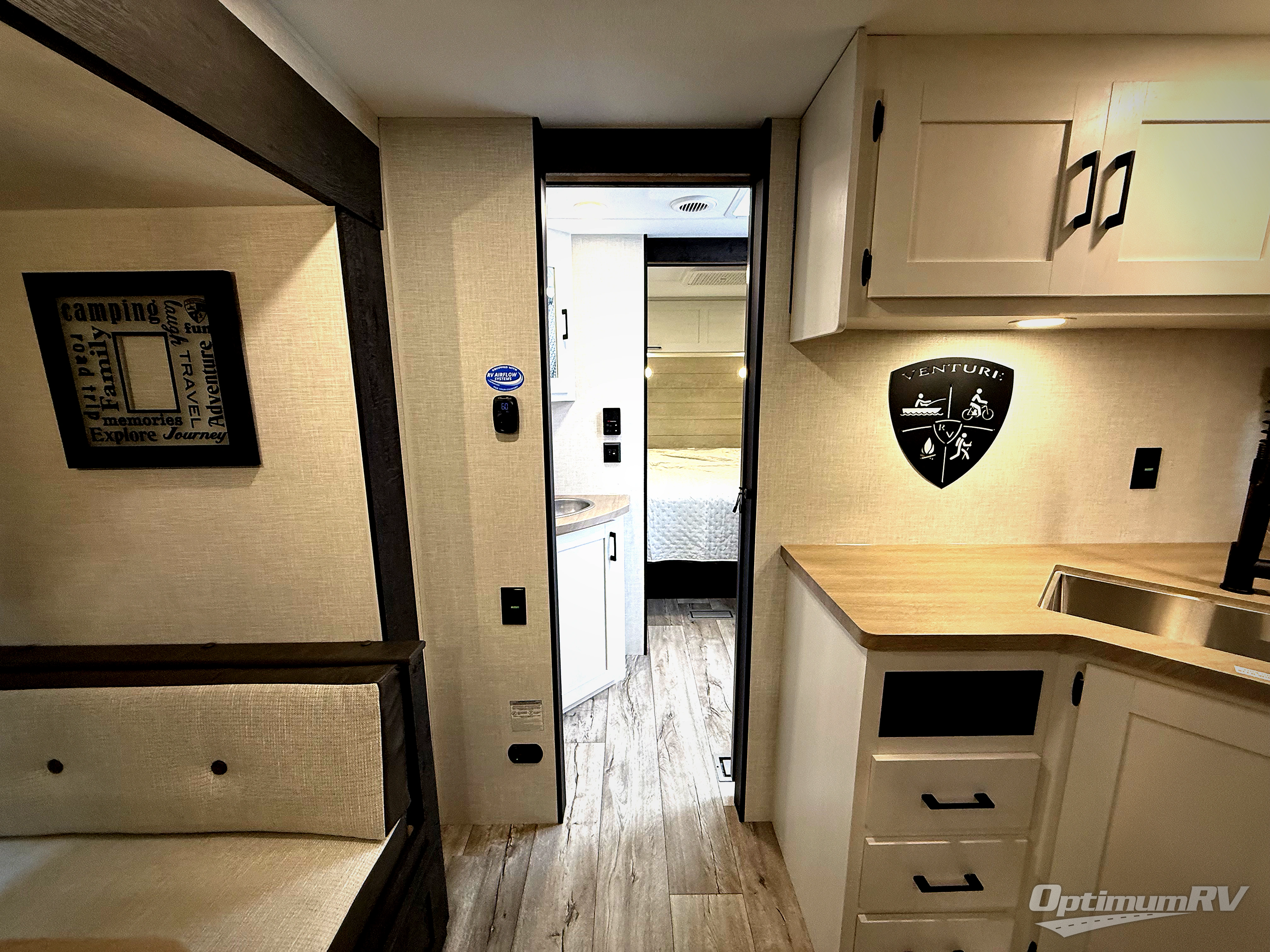 With any Sienna travel trailer by Venture RV, you will enjoy a lightweight unit, convenient amenities, and a durable construction that includes a BAL NXG-bolted frame. There is also a heated and enclosed one-piece underbelly, residential fiberglass insulation, and a reflective PVC roof membrane within the Weather-Shield Package to help extend your camping season. Outside, the BAL 5.0 power stabilizer jacks and power tongue jack will have you set up in no-time, and the Venture RV bottle opener/dog tie down will make it easy to bring your furry friends along. Head inside to enjoy the modern farmhouse design, along with Beauflor throughout with no carpet, custom backsplash, large underbed storage, and a bath skylight to name a few comforts!