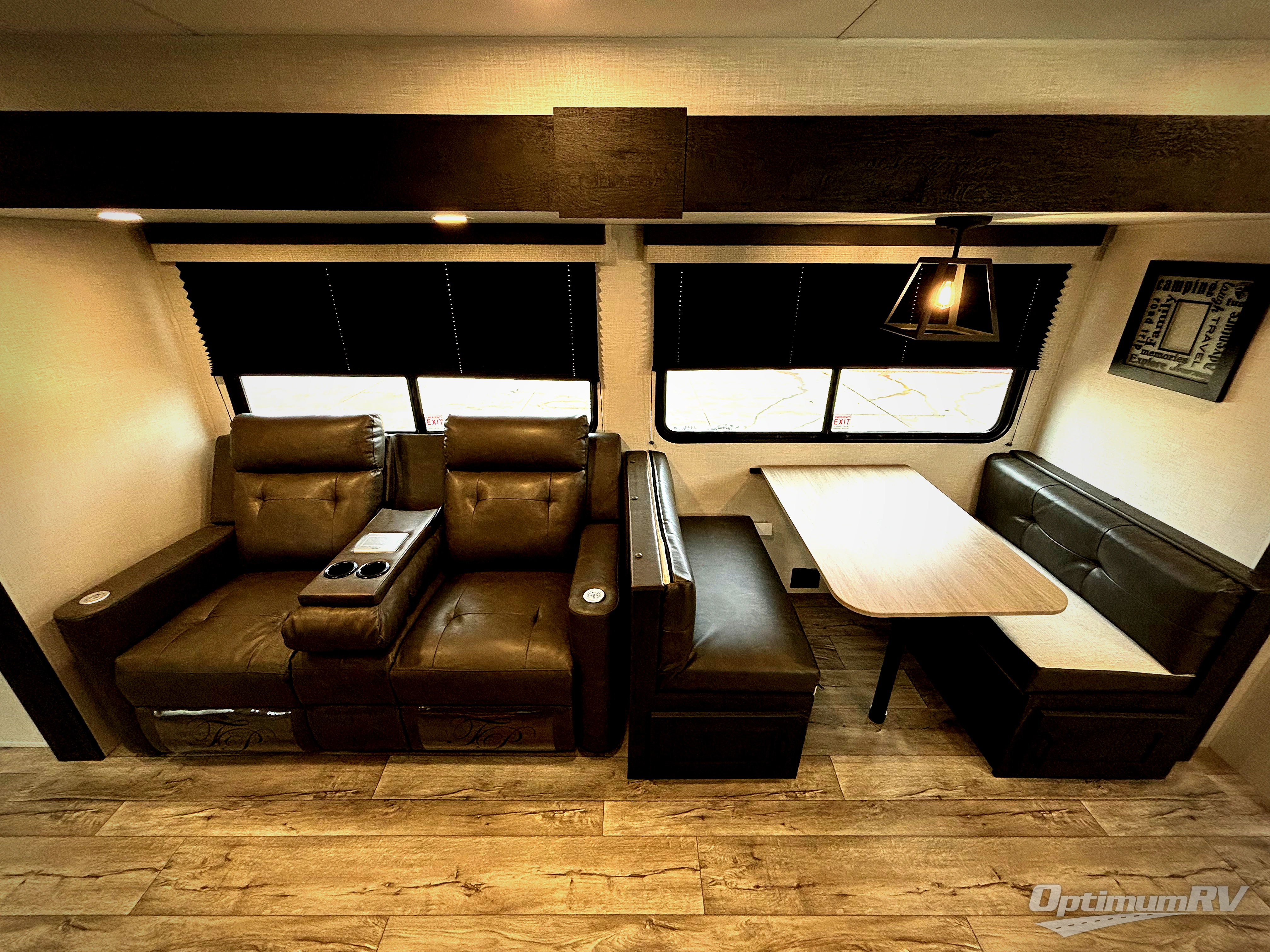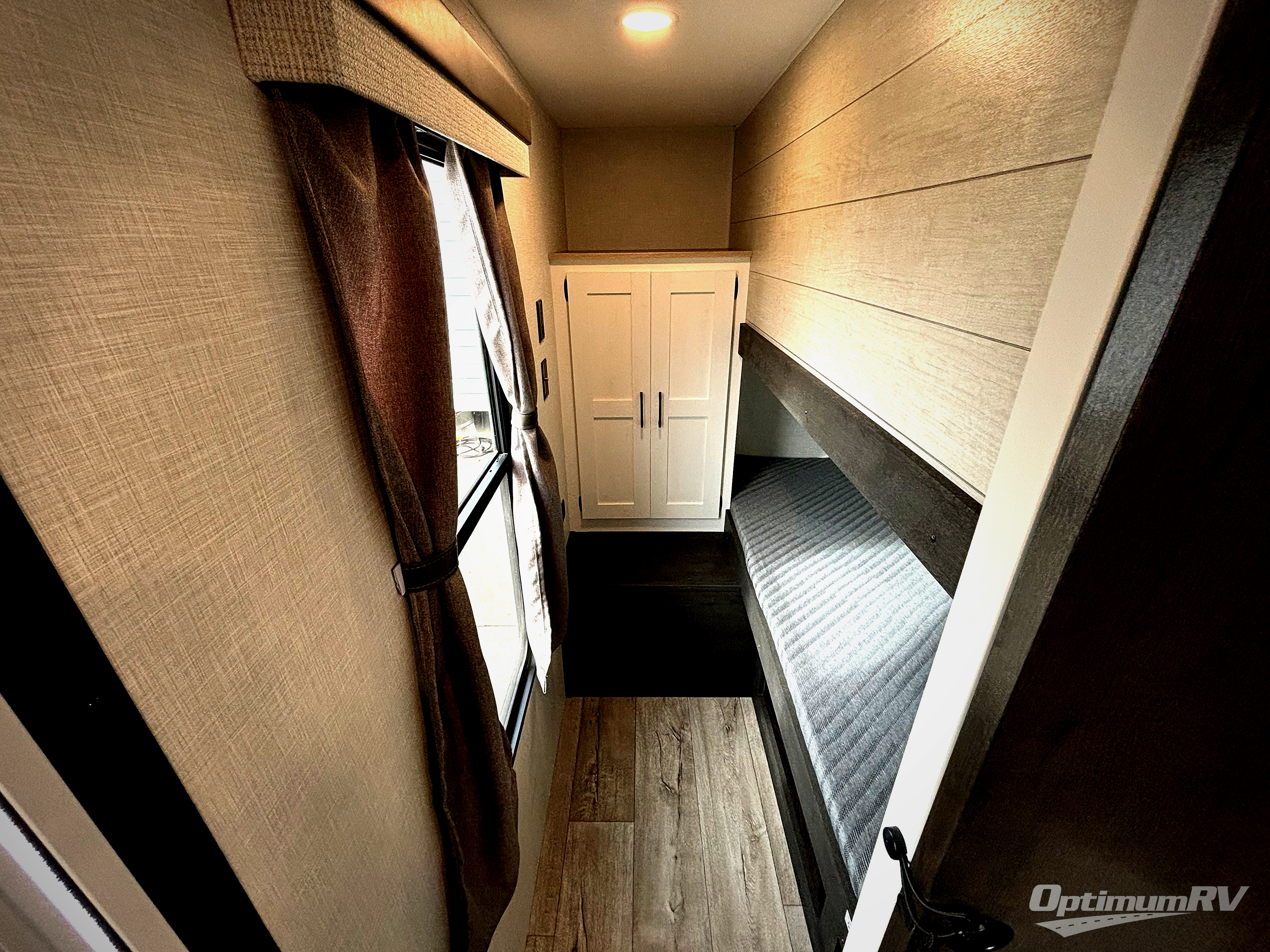 This travel trailer’s bunk beds are perfect for kids, providing ample sleeping space for the whole family. The wardrobes offer plenty of storage for your clothing and essentials.The sofa is a comfortable spot to relax, and the fireplace adds a cozy touch to the interior. The entertainment center is equipped with a 50” TV, perfect for family movie nights or enjoying your favorite shows on the go. The walk-in pantry provides ample storage for your food and snacks, while the 10 cu refrigerator keeps your food and drinks fresh. The sit n’ slide table is a fun and functional spot for meals and adds additional sleeping space. For convenience and comfort the walk-through bath provides easy access and convenience, while the overhead cabinets offer additional storage for your essentials. The front bedroom features a spacious queen bed and overhead cabinet. Head outside and unwind under the shade of the two exterior awnings and store everything you need in the pass-through storage offering ample space for your outdoor gear and equipment.