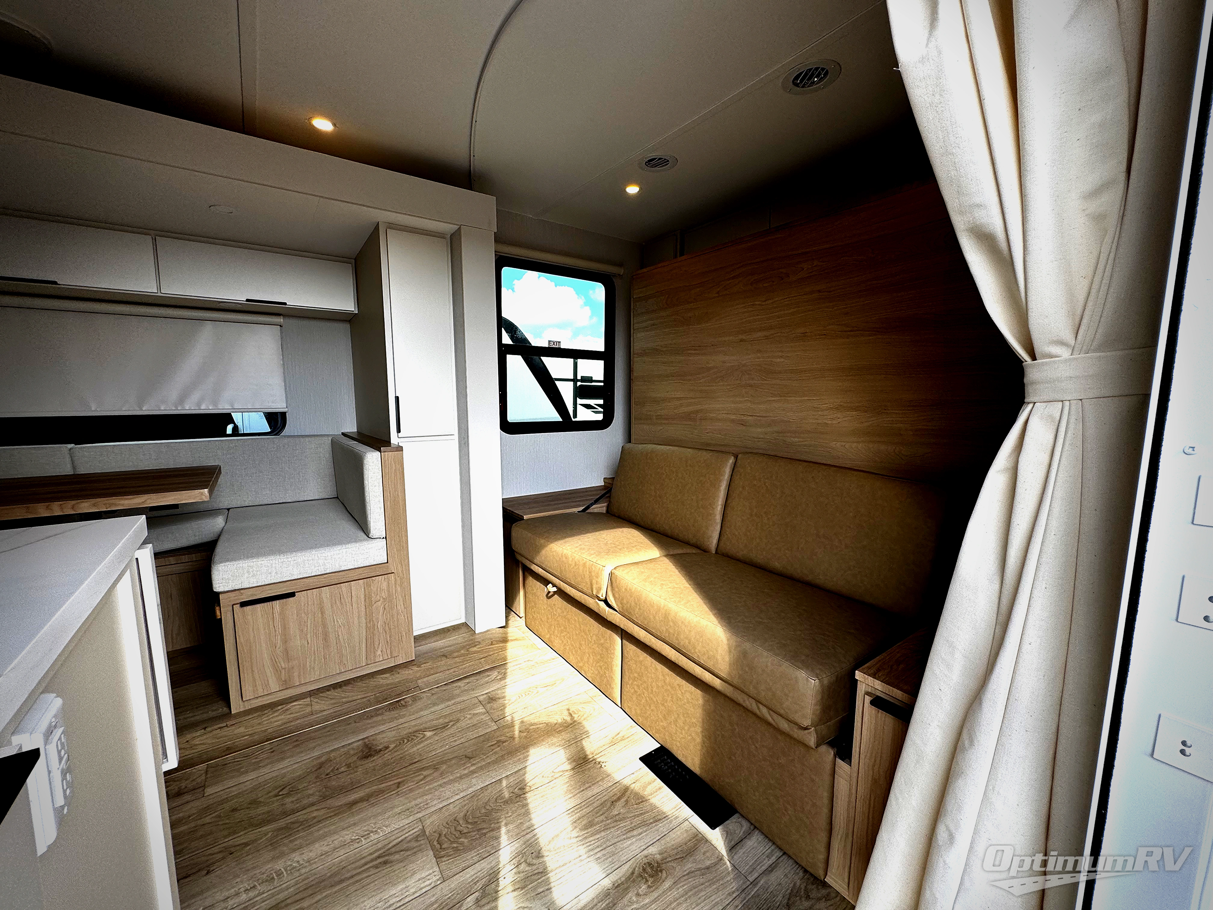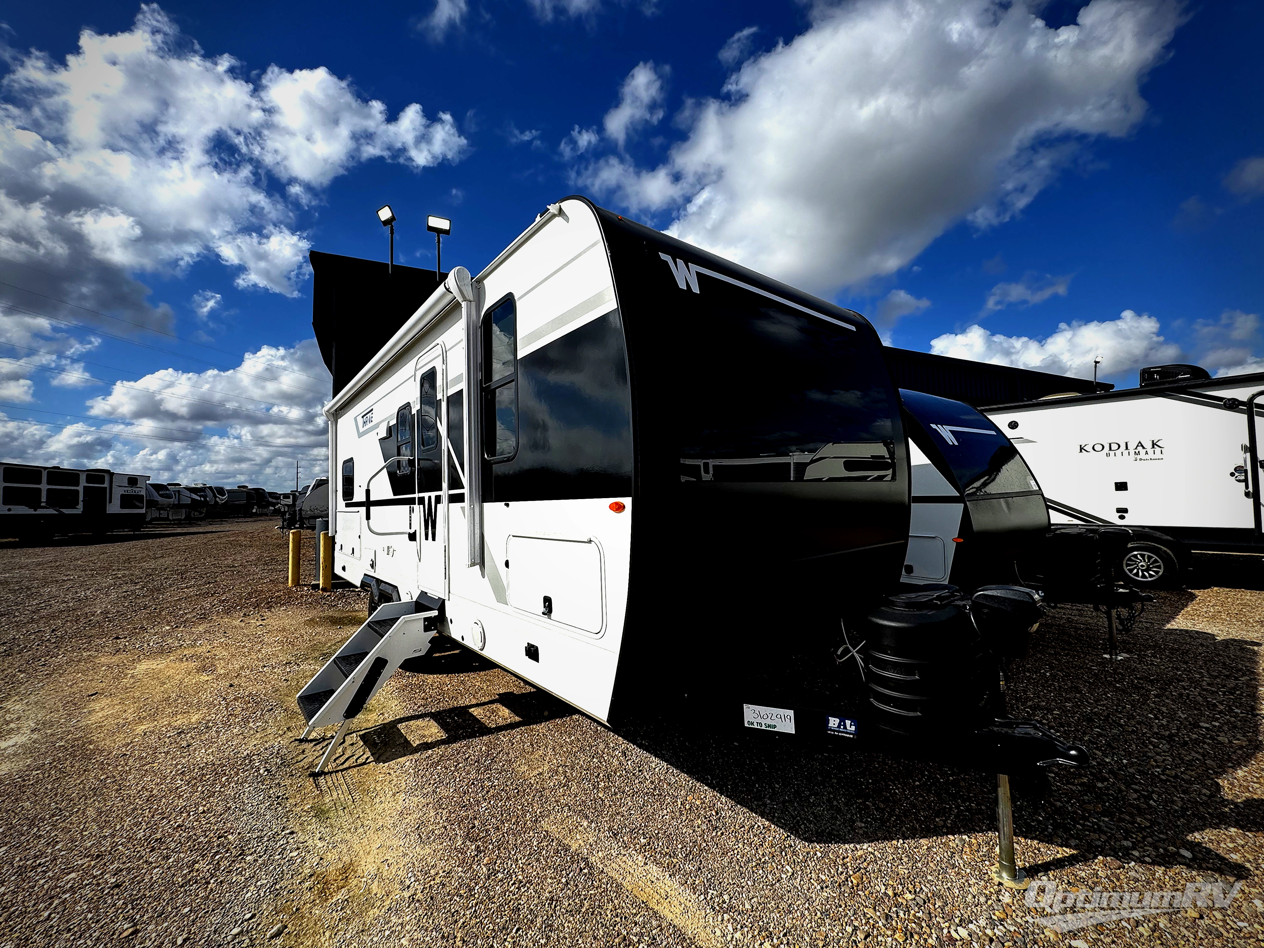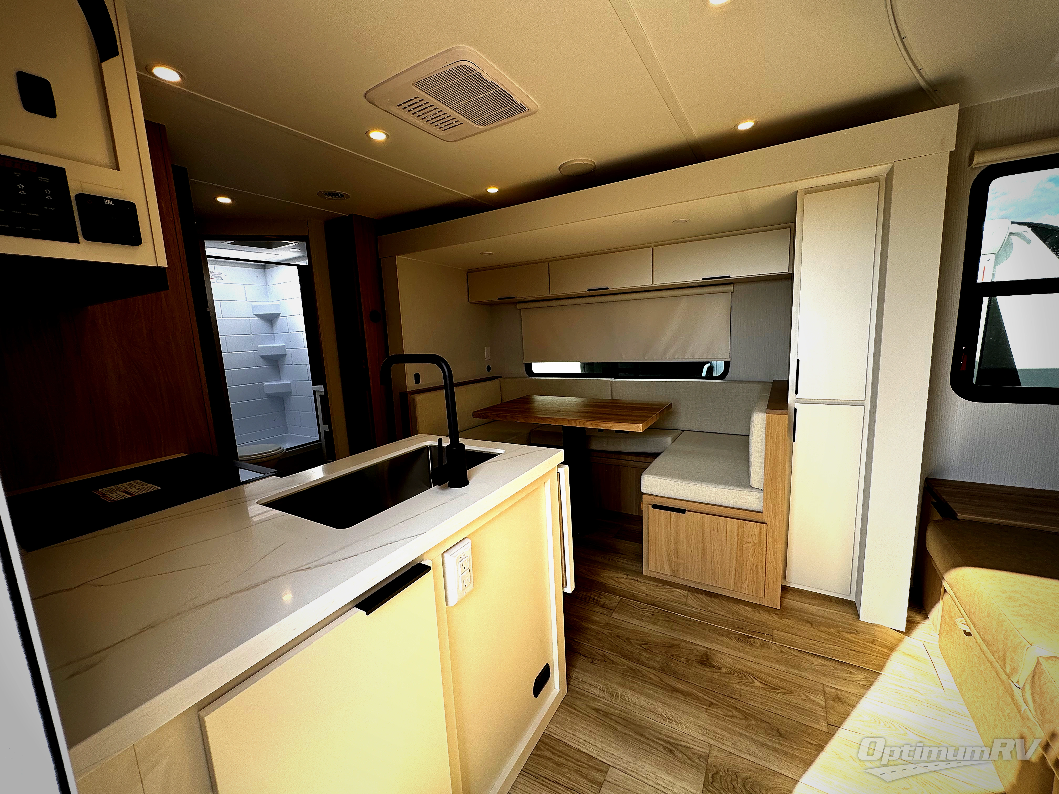 With any Thrive travel trailer by Winnebago, you can camp with functionality, comfort, and convenience! The tinted and frameless front window will be the first thing that catches your eye, and the fiberglass sidewalls with Azdel Onboard provide a durable trailer made to last. There is also an exterior ladder, along with front radius profile lights, power stabilizer jacks, and a powered awning with LED lighting to name a few exterior features. You will stay powered up by the 30-amp power cord and 200-watt solar panel, plus there is a tankless water heater for endless hot showers. Inside, you'll love the custom Winnebago furniture, carpetless side outs, molded fiberglass countertops, and residential recessed ceiling lights to keep your space well lit!