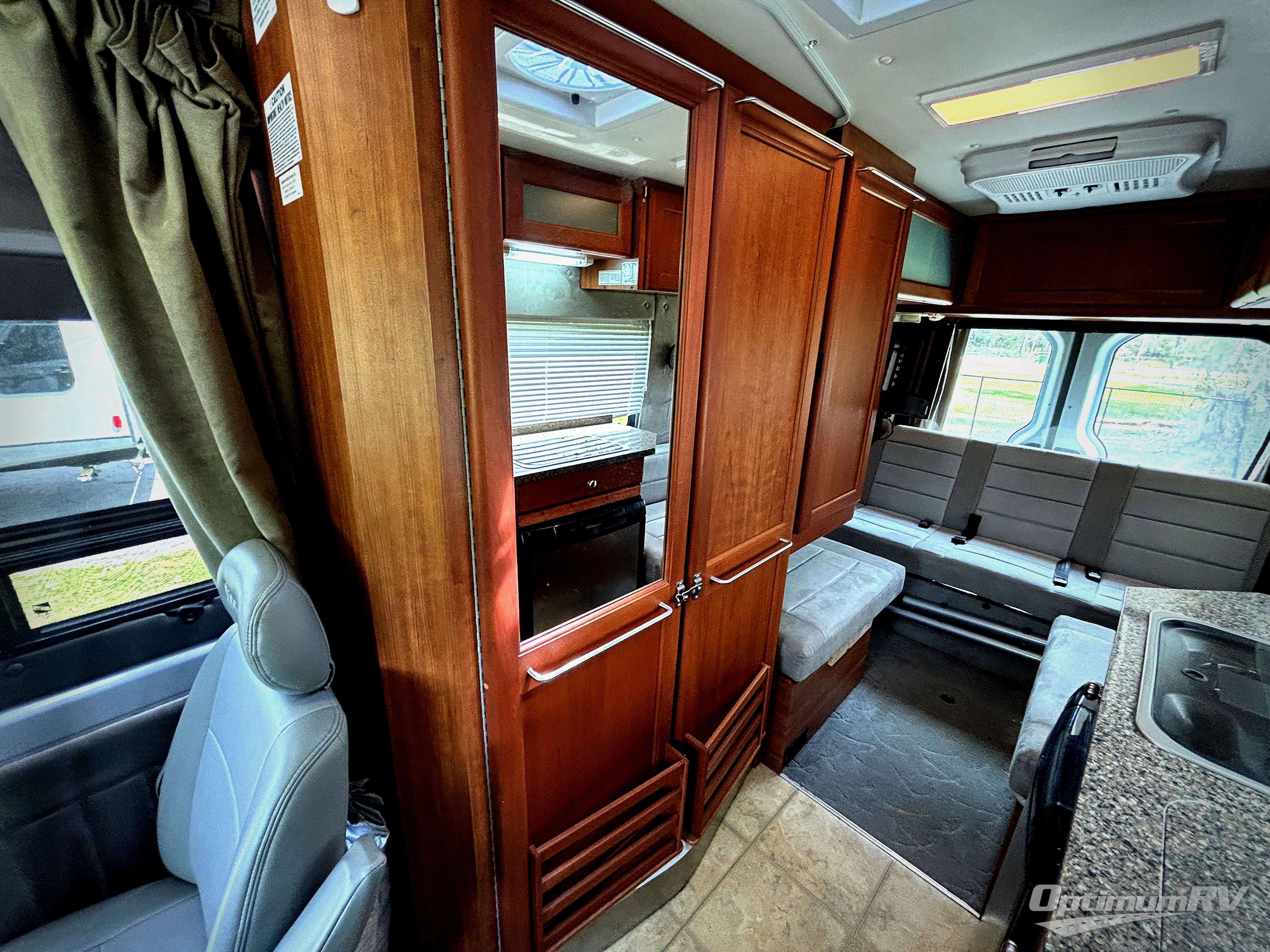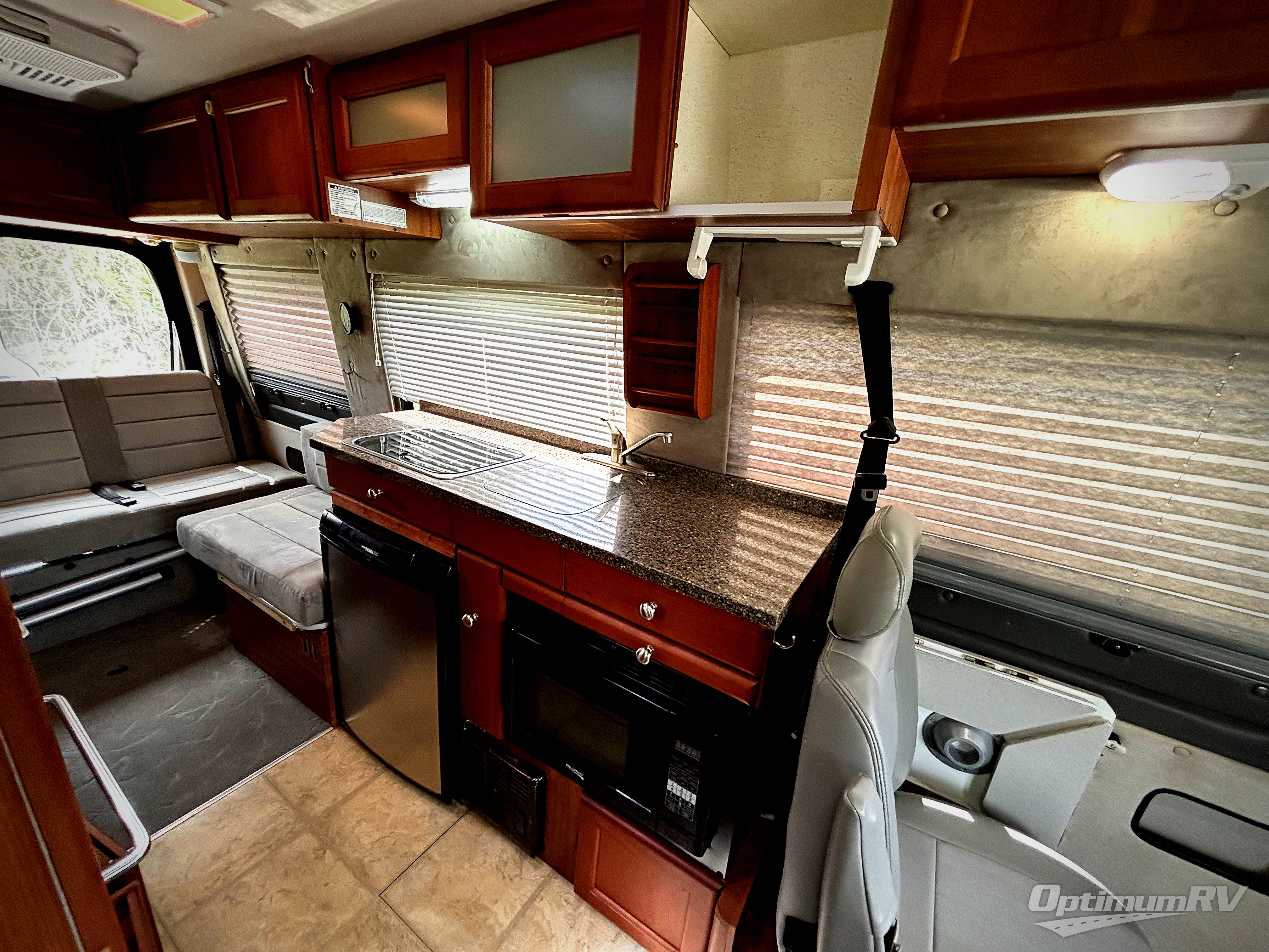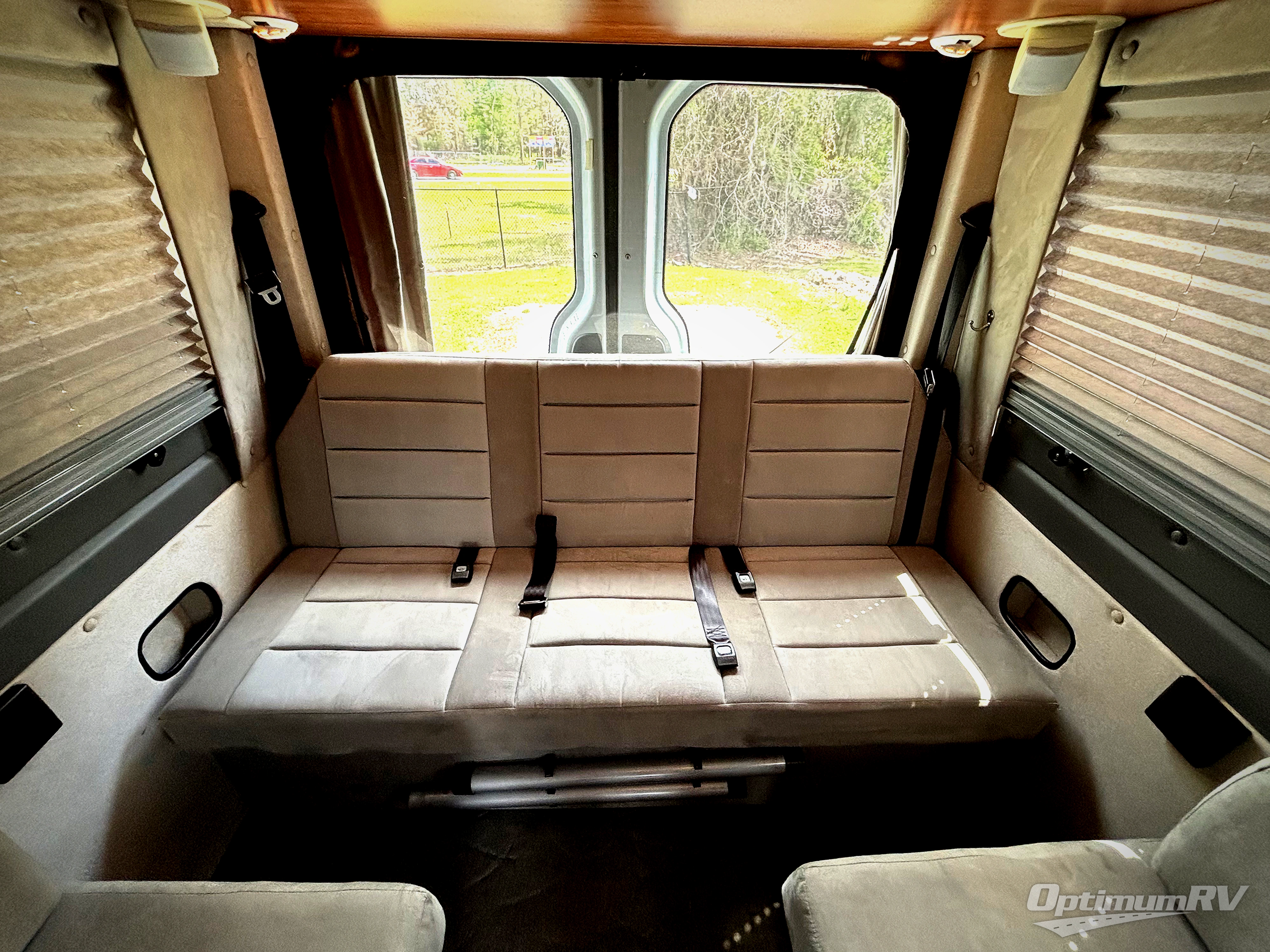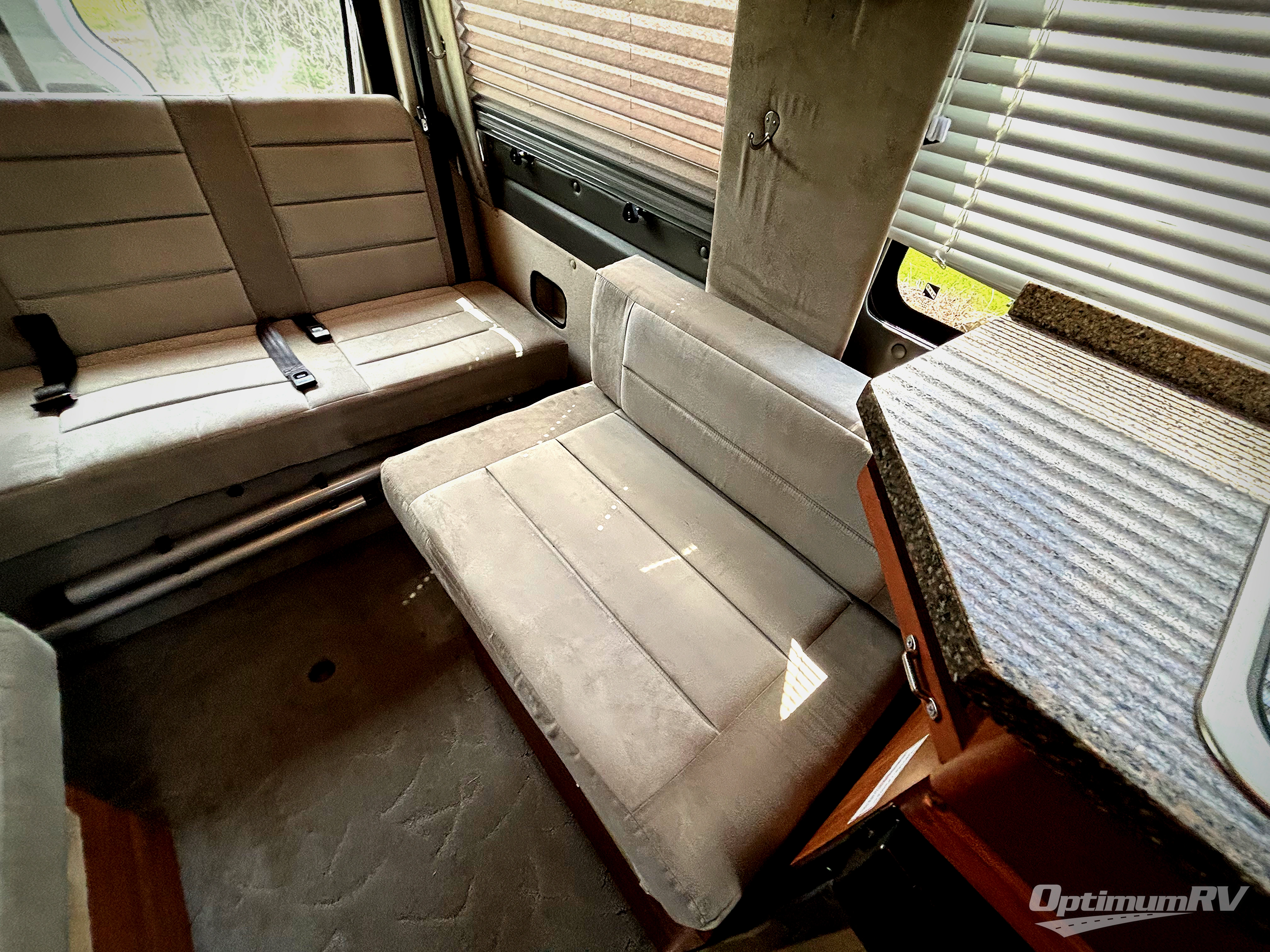 The front offers three comfortable swivel captain's chairs with a table. The passengers' side chairs can be converted to additional sleeping with the optional folding mattress. A toilet, sink and shower are enclosed along the passenger's side. Continuing to the back there is a wardrobe and TV mount.