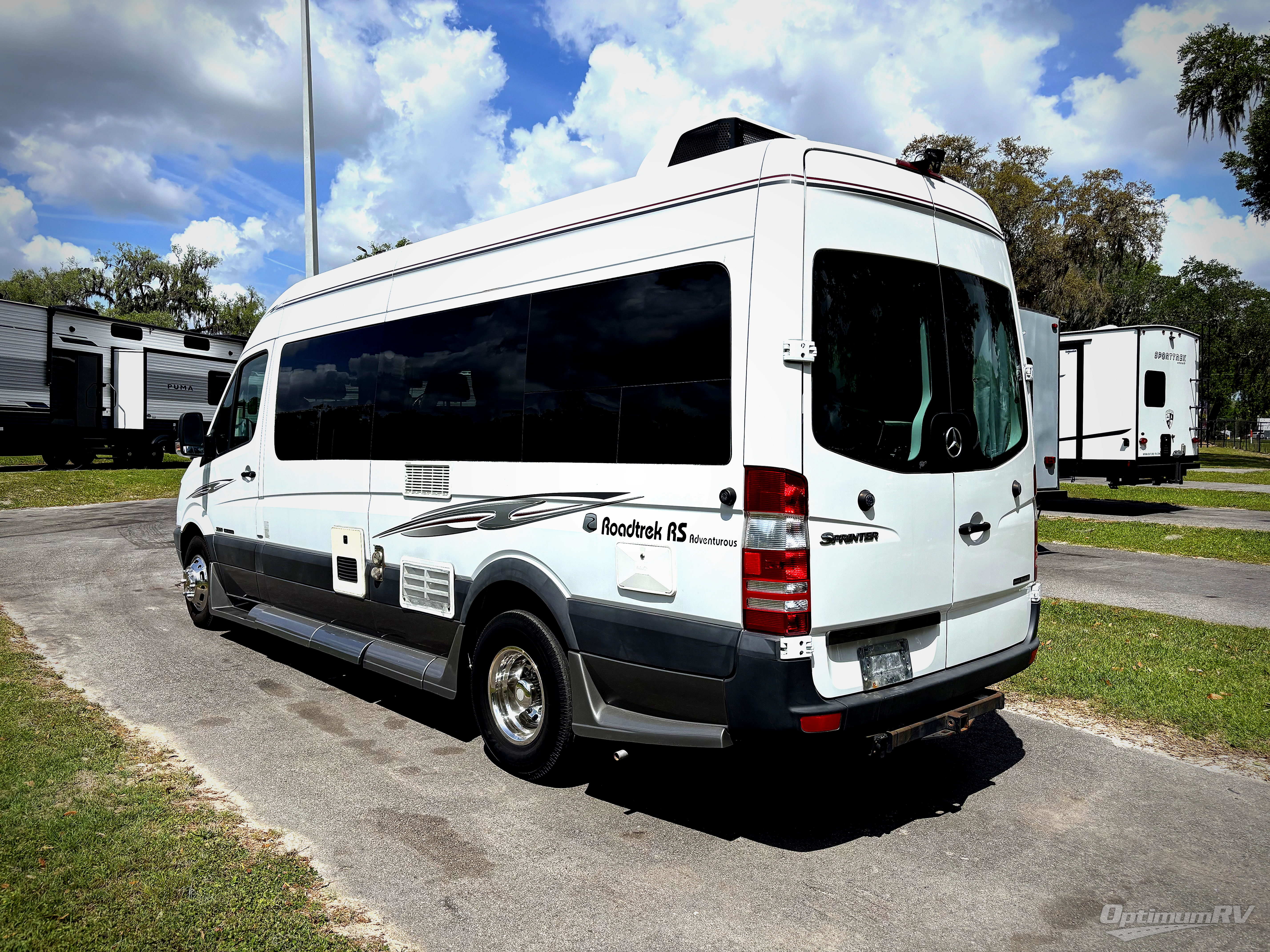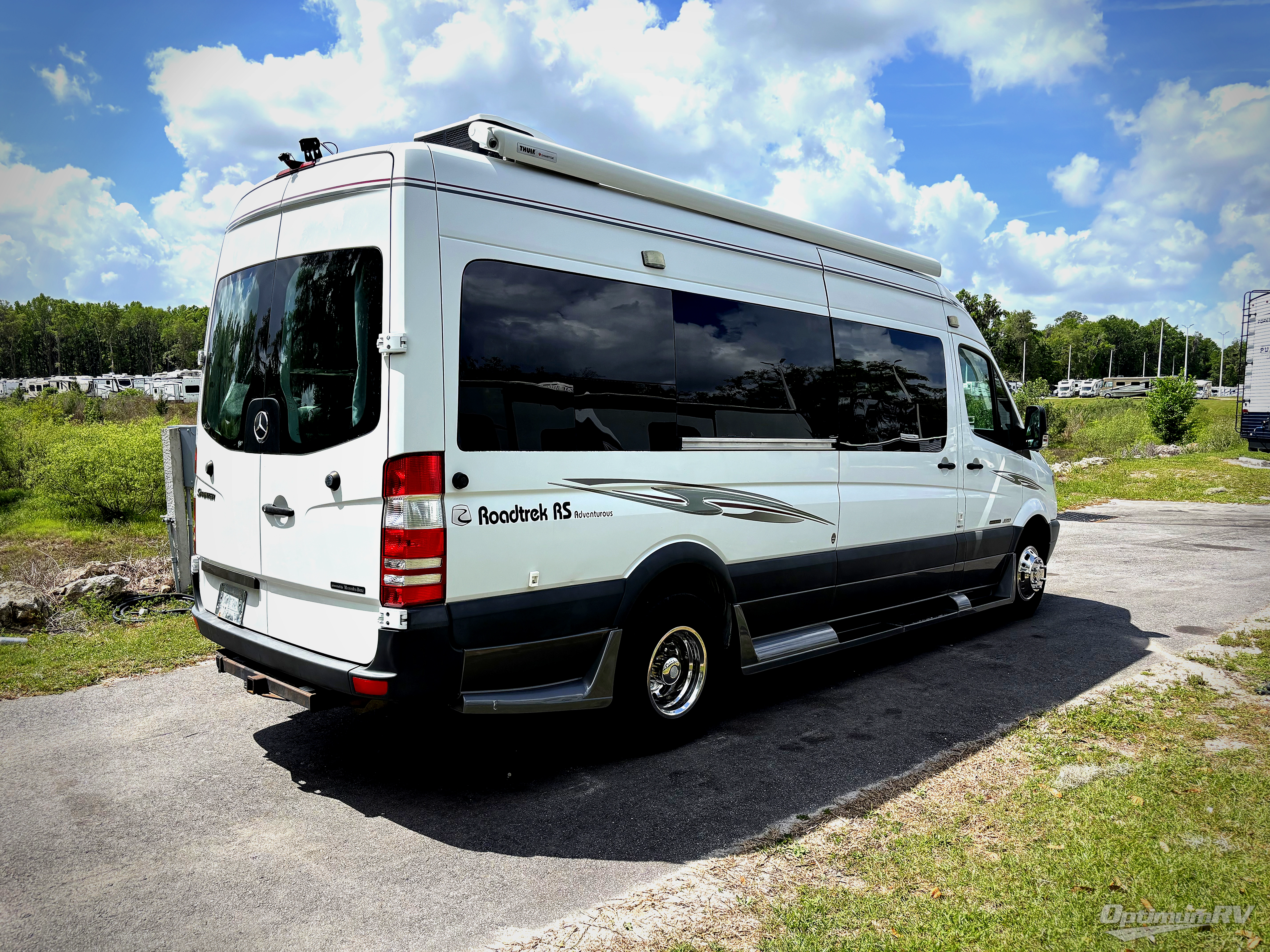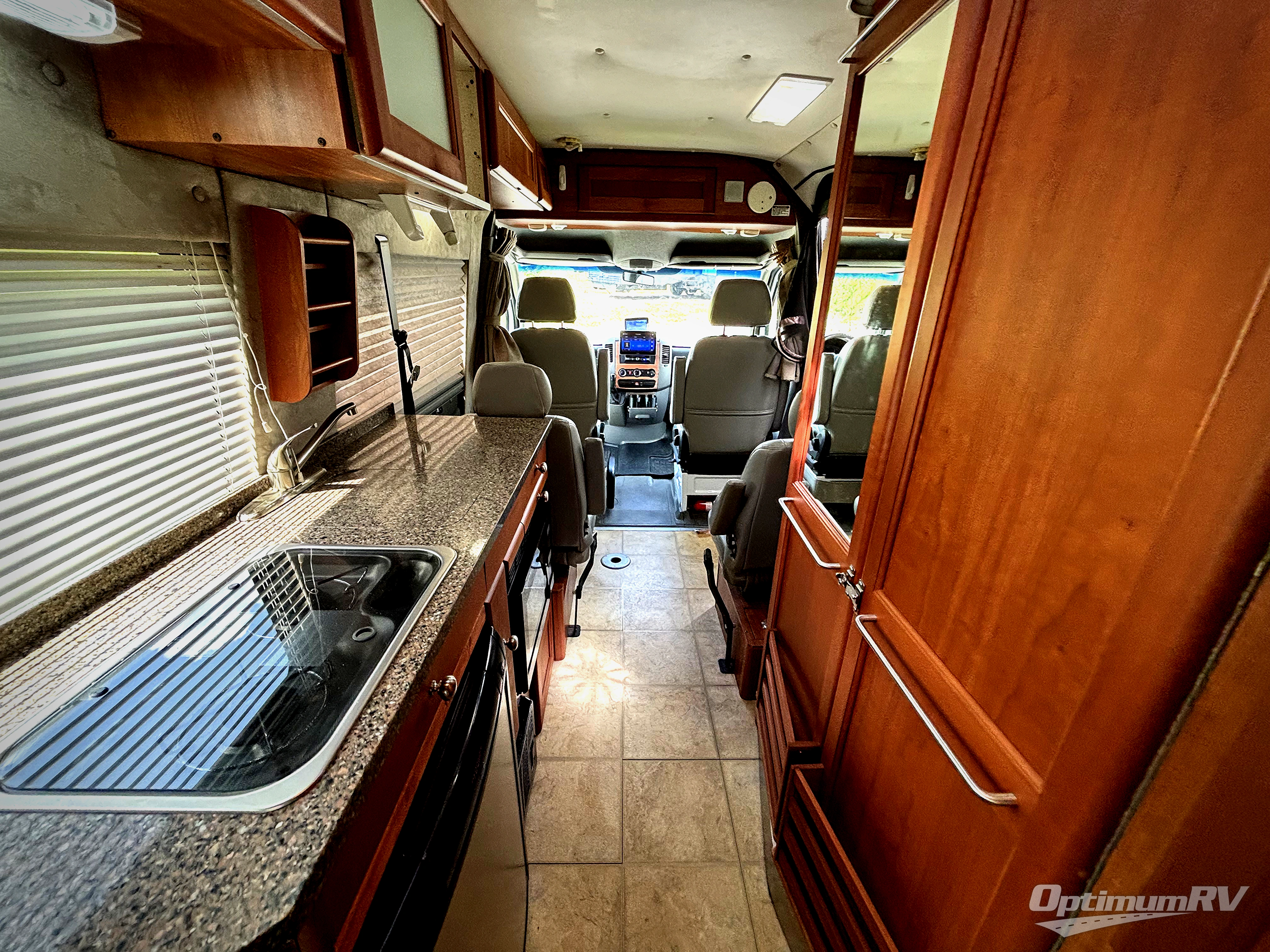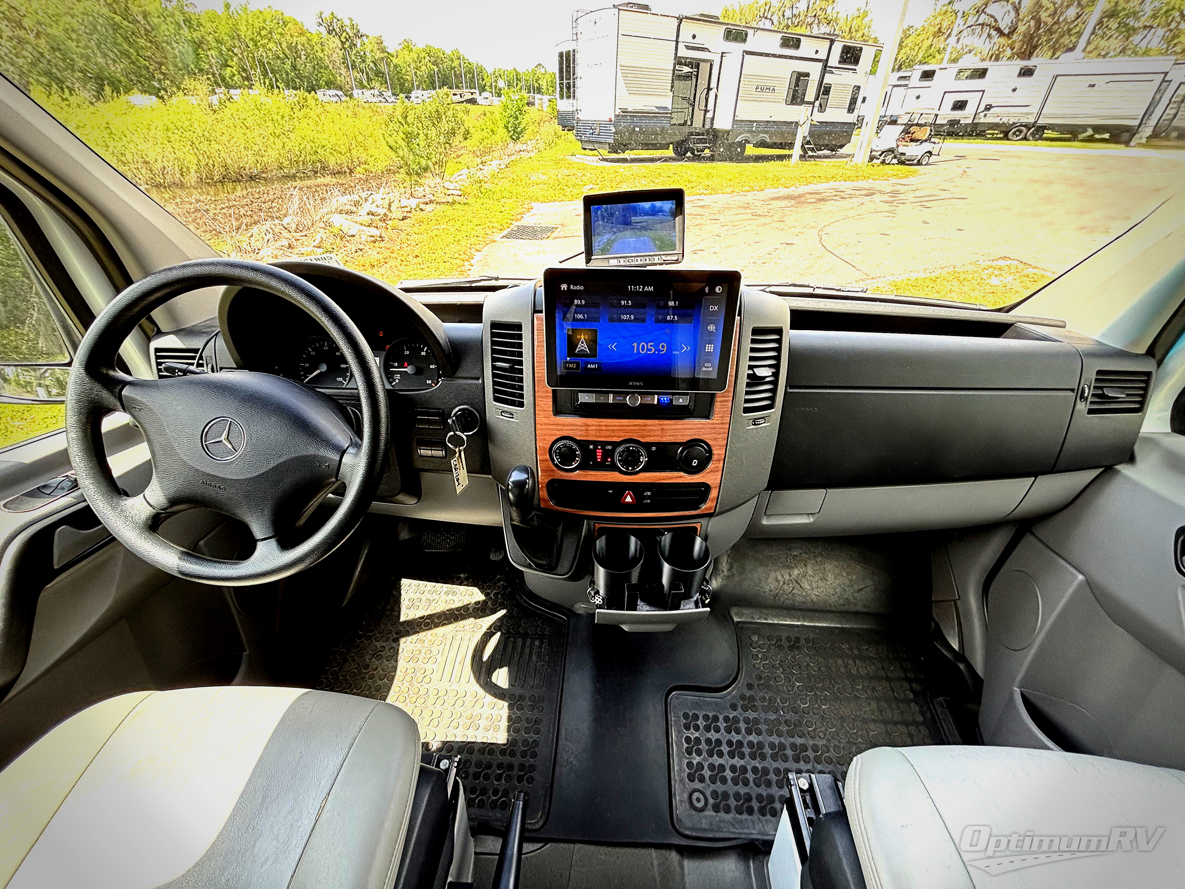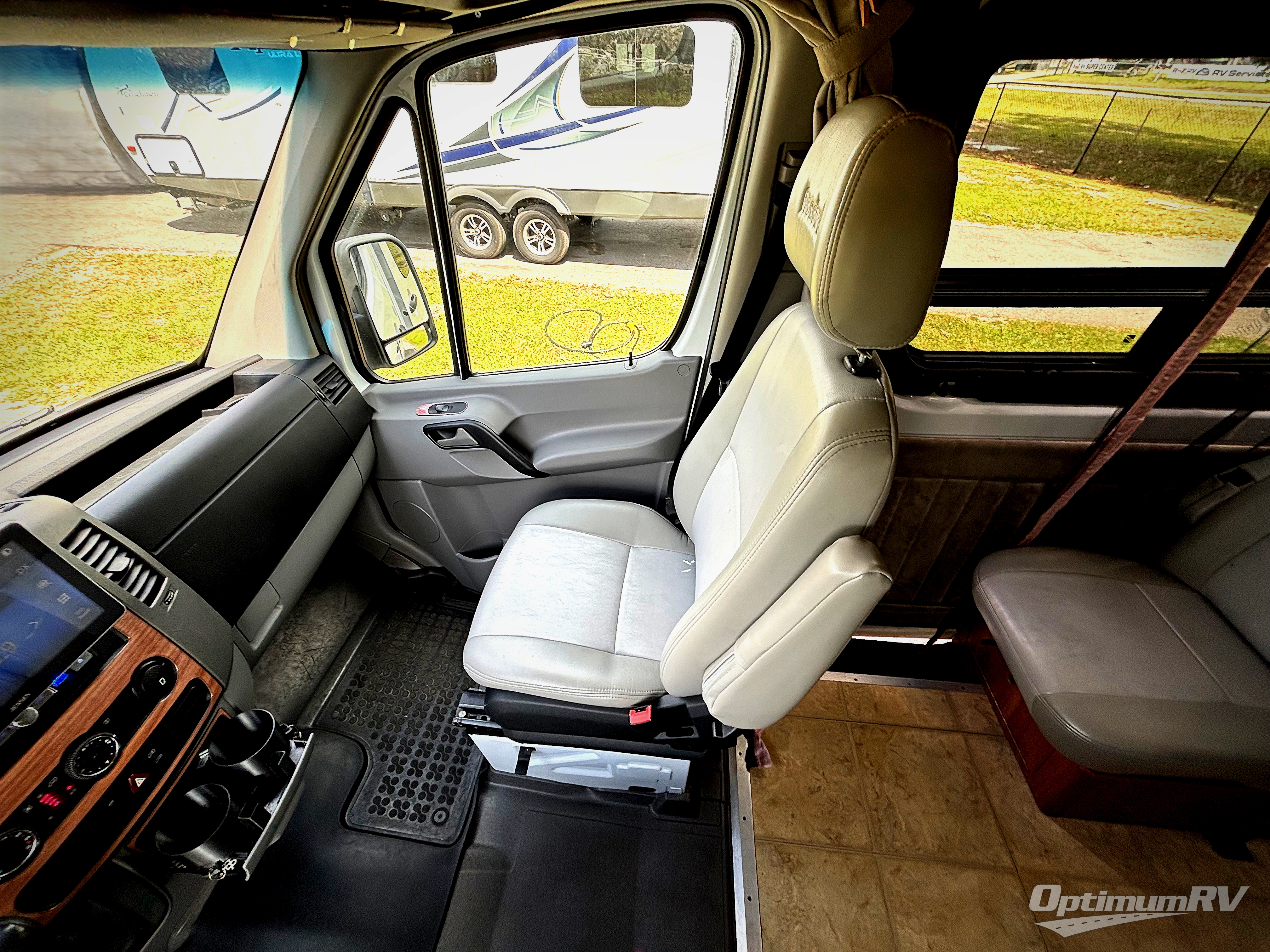 The front offers three comfortable swivel captain's chairs with a table. The passengers' side chairs can be converted to additional sleeping with the optional folding mattress. A toilet, sink and shower are enclosed along the passenger's side. Continuing to the back there is a wardrobe and TV mount.