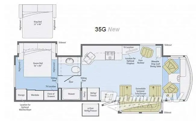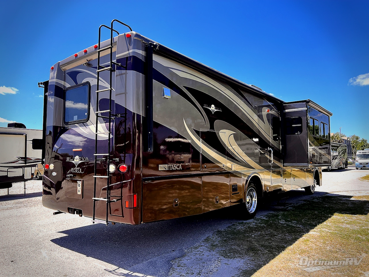 Itasca Sunova Class A Coach w/Rear Queen Bed Slide w/Nightstands, Storage/Wardrobe/Chest of Drawers, Sliding Door Between Bedroom & Bath, Shower, Private Toilet Area w/Vanity & Sink, Sliding Door Between Bath & Living Area, Dbl. Kitchen Sink, 3 Burner Range, 42" LCD TV/Euro Recliner & Moveable Drop Leaf Table Slideout, Extendable Sectional Sofa/Sleeper Slideout, Refrig./Freezer, Pantry and More! Available Options May Include: Washer/Dryer, King Bed, Fireplace, 4-Door Refrig.
