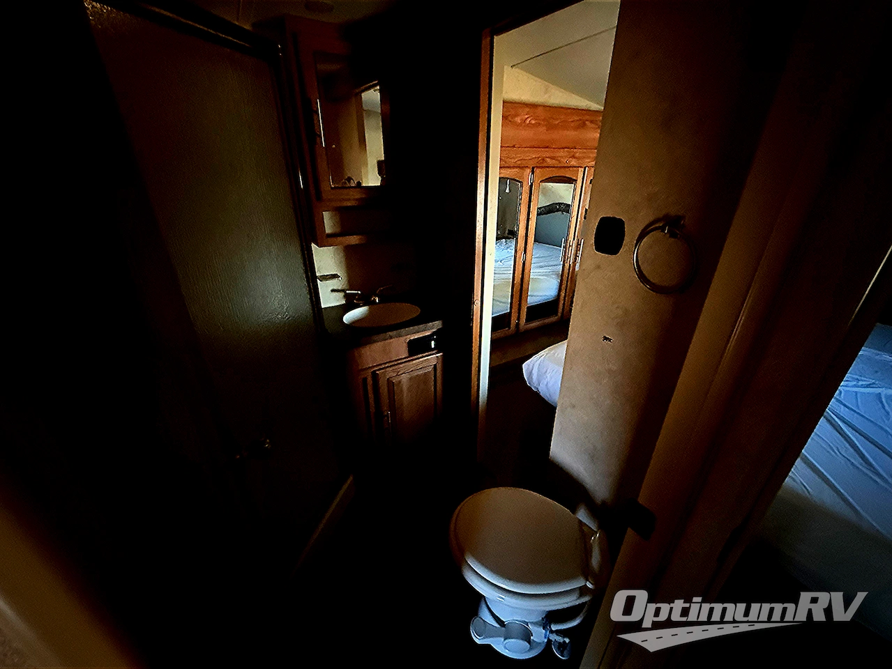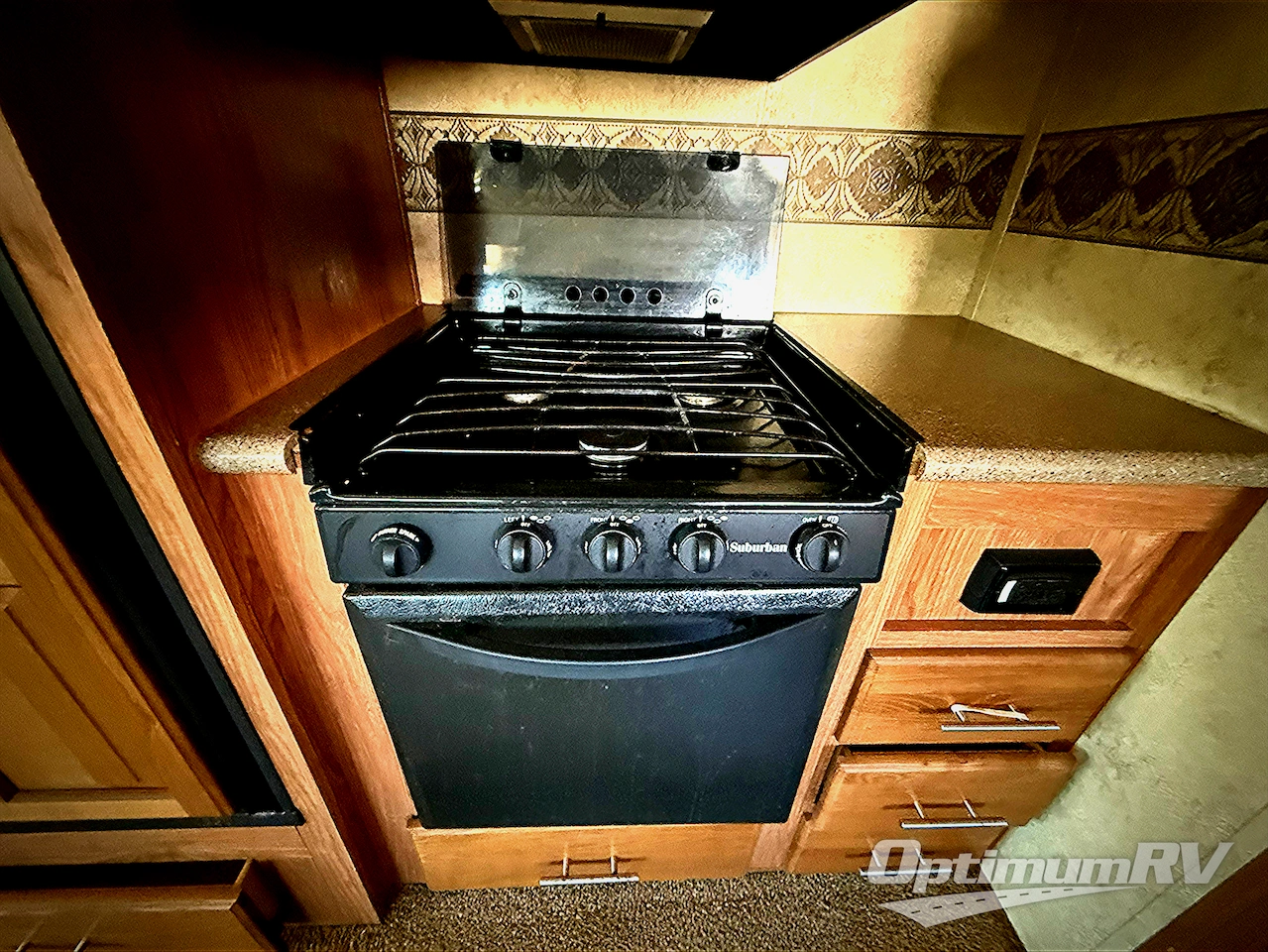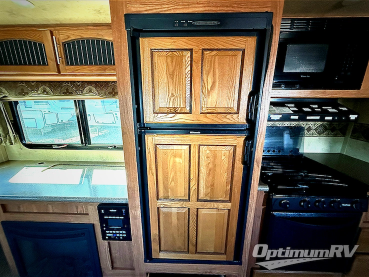 As you enter the fifth wheel, to the left is a storage cabinet. Just past the storage is a slide with two chairs and an end table, or you can choose optional theater seats. Along the rear wall you will find a hide-a-bed sofa. There is another slide in the rear with an entertainment center and optional fireplace, refrigerator, three burner range, and microwave. Along one side you will find extra counter space and a large kitchen sink. In the middle of the kitchen area there is an island with flip up sides and four folding chairs.