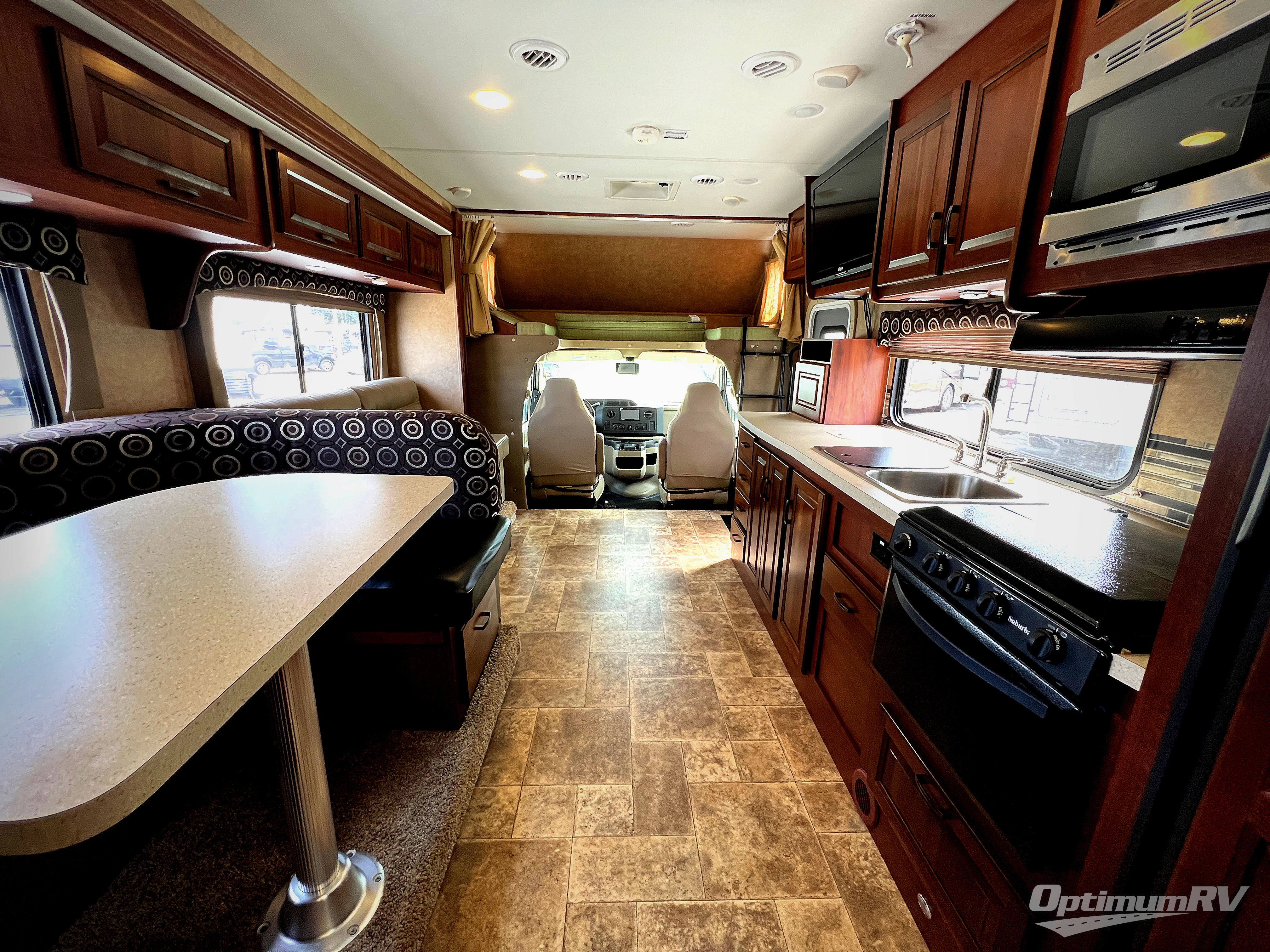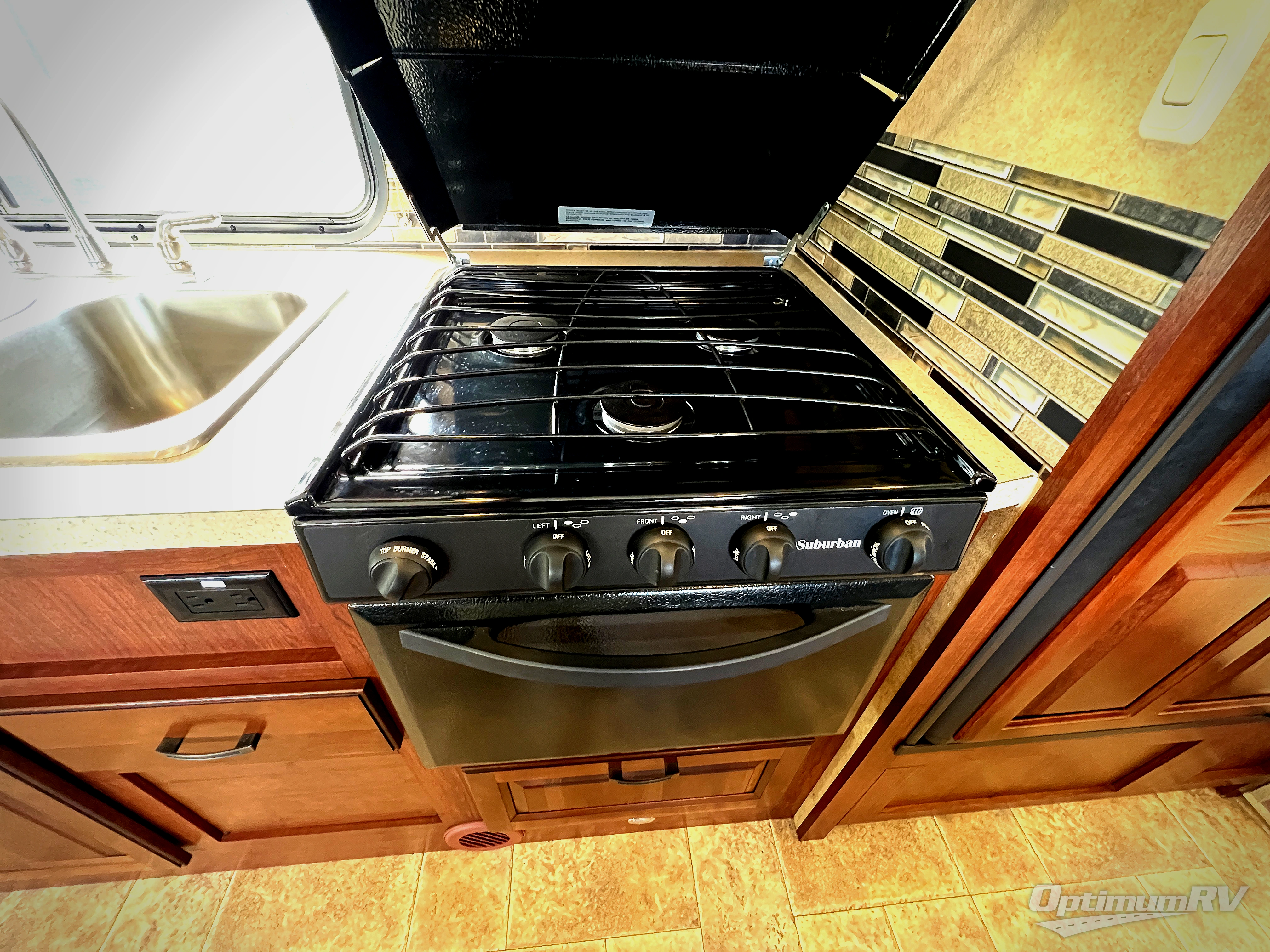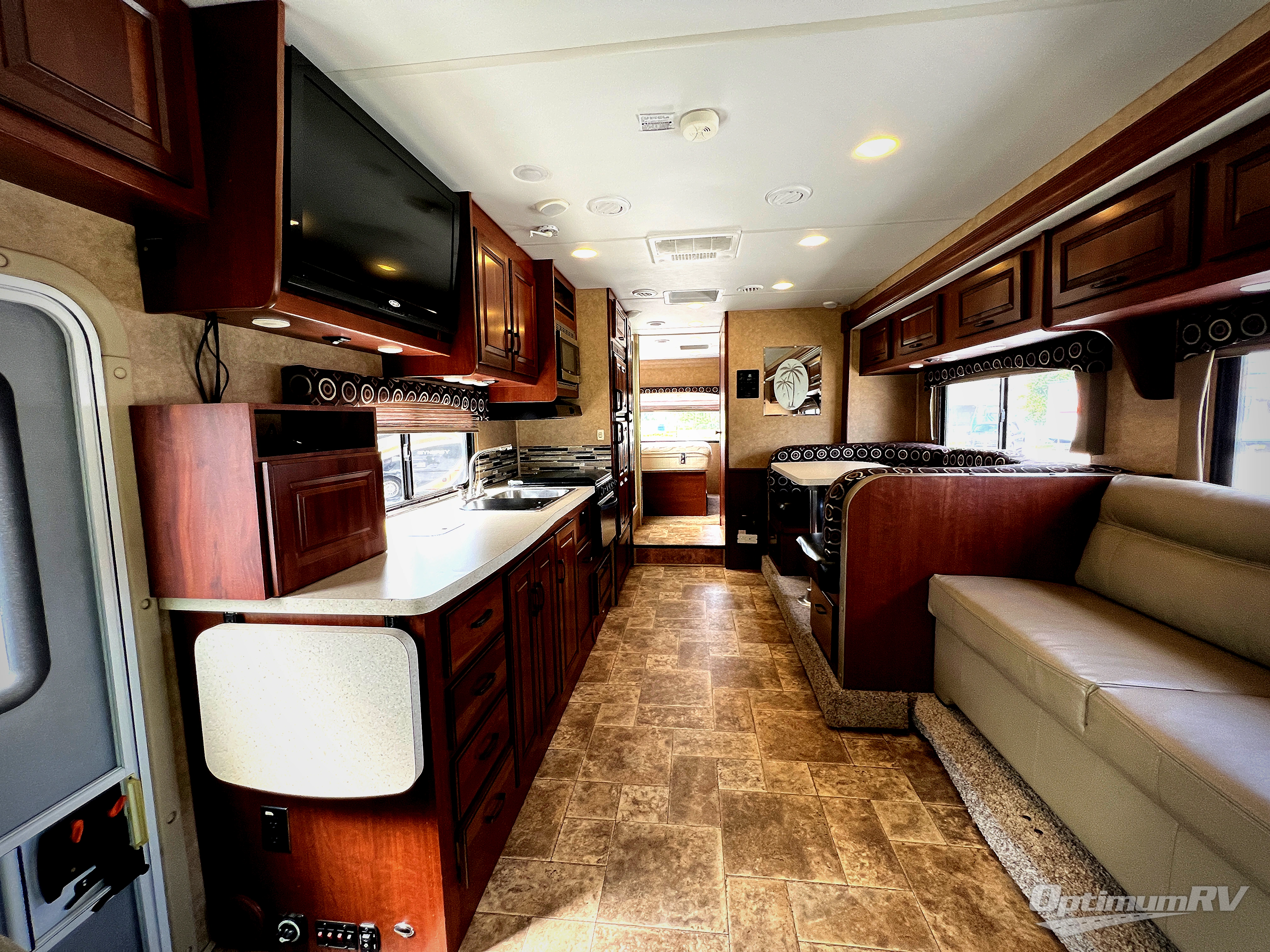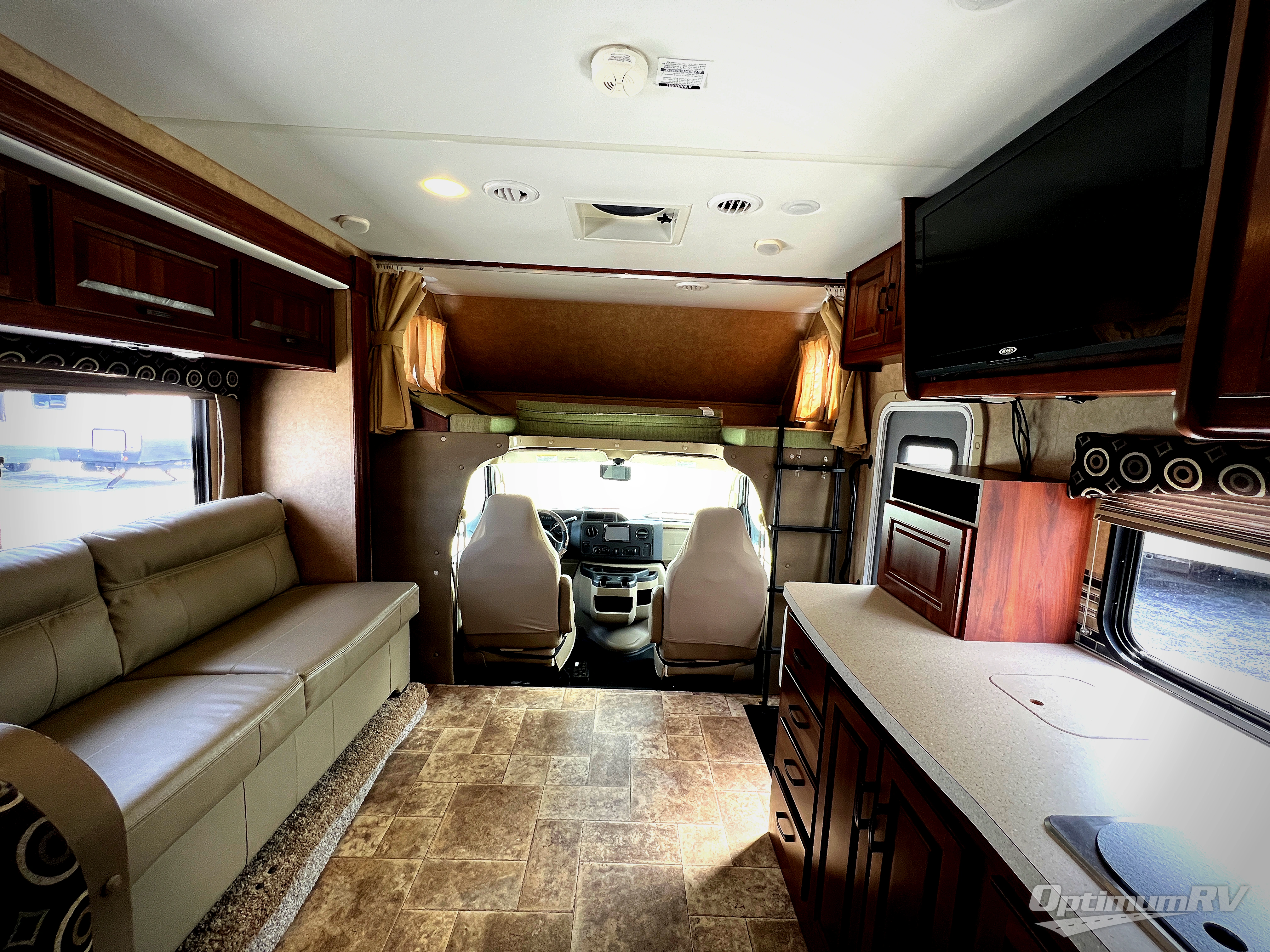 As you enter this class C motor home, to your left is the kitchen. It features a counter space with a flip down counter extension, overhead cabinets, double kitchen sink, three burner stove with overhead microwave, refrigerator and pantry.