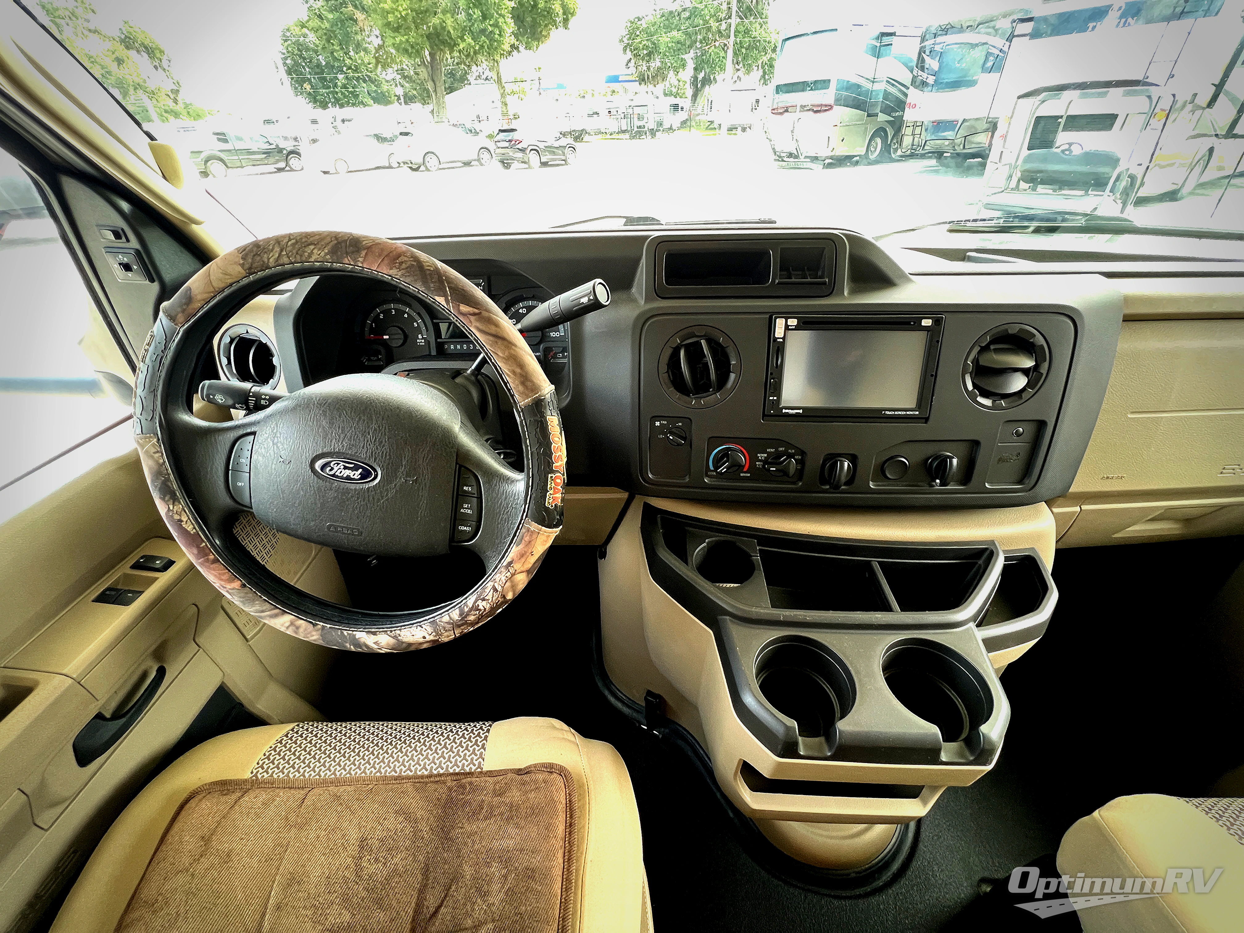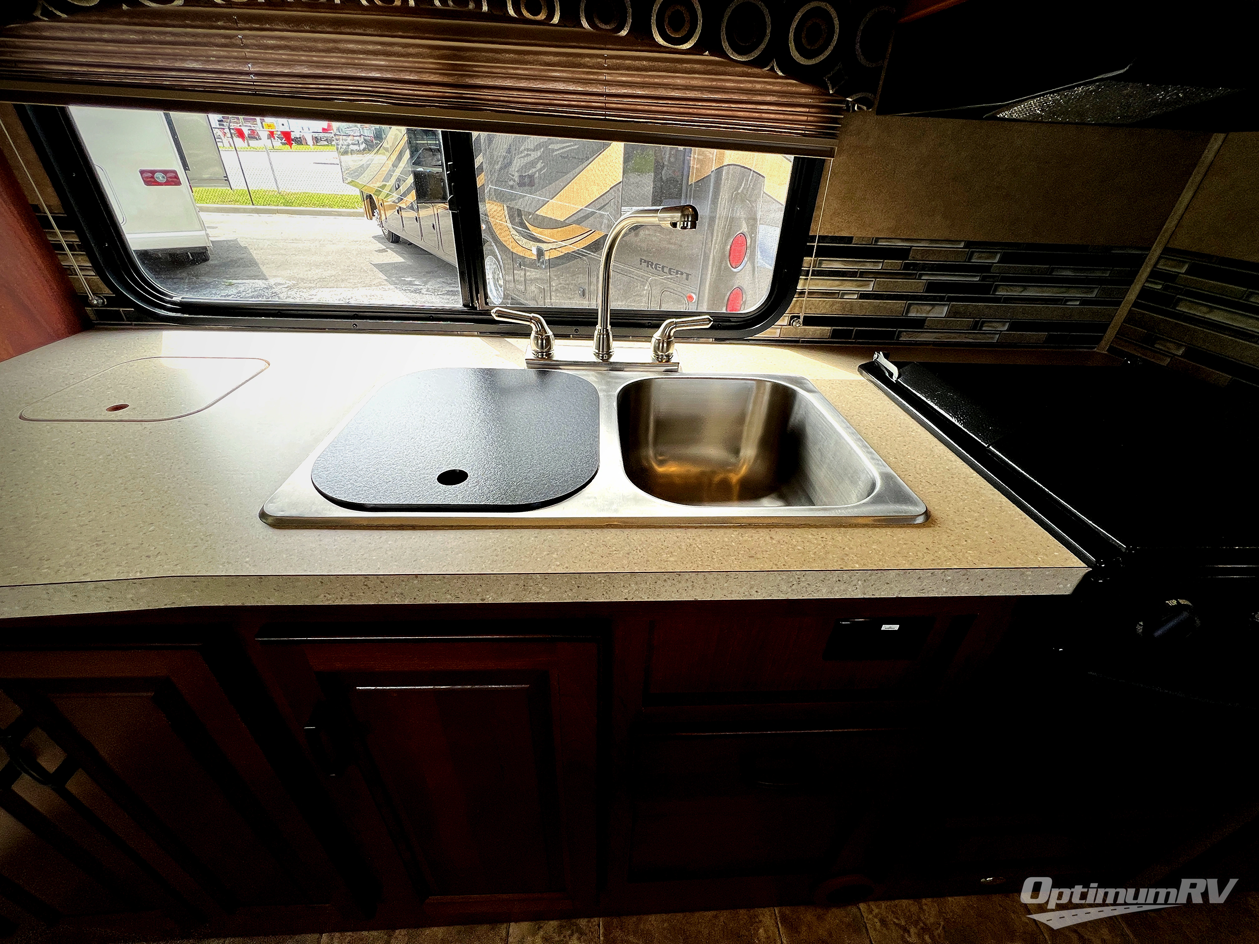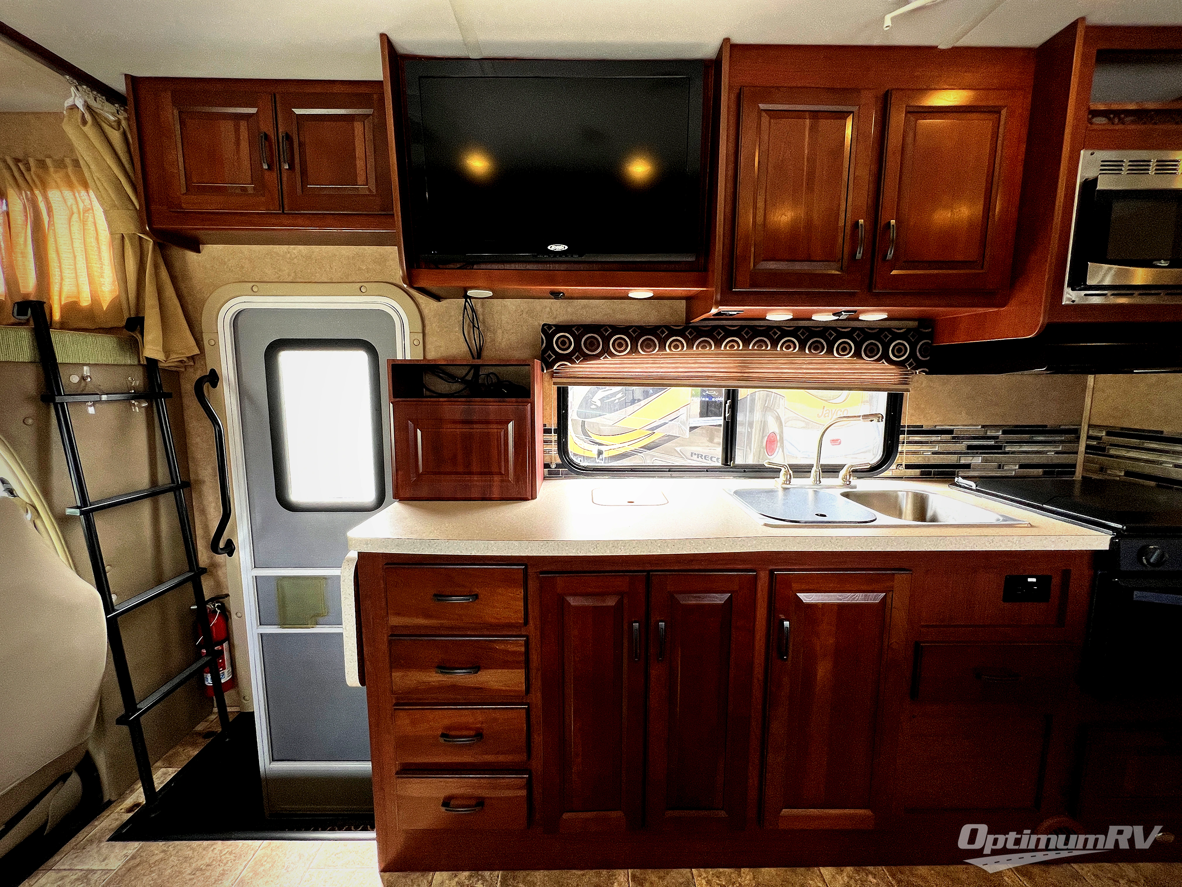 As you enter this class C motor home, to your left is the kitchen. It features a counter space with a flip down counter extension, overhead cabinets, double kitchen sink, three burner stove with overhead microwave, refrigerator and pantry.