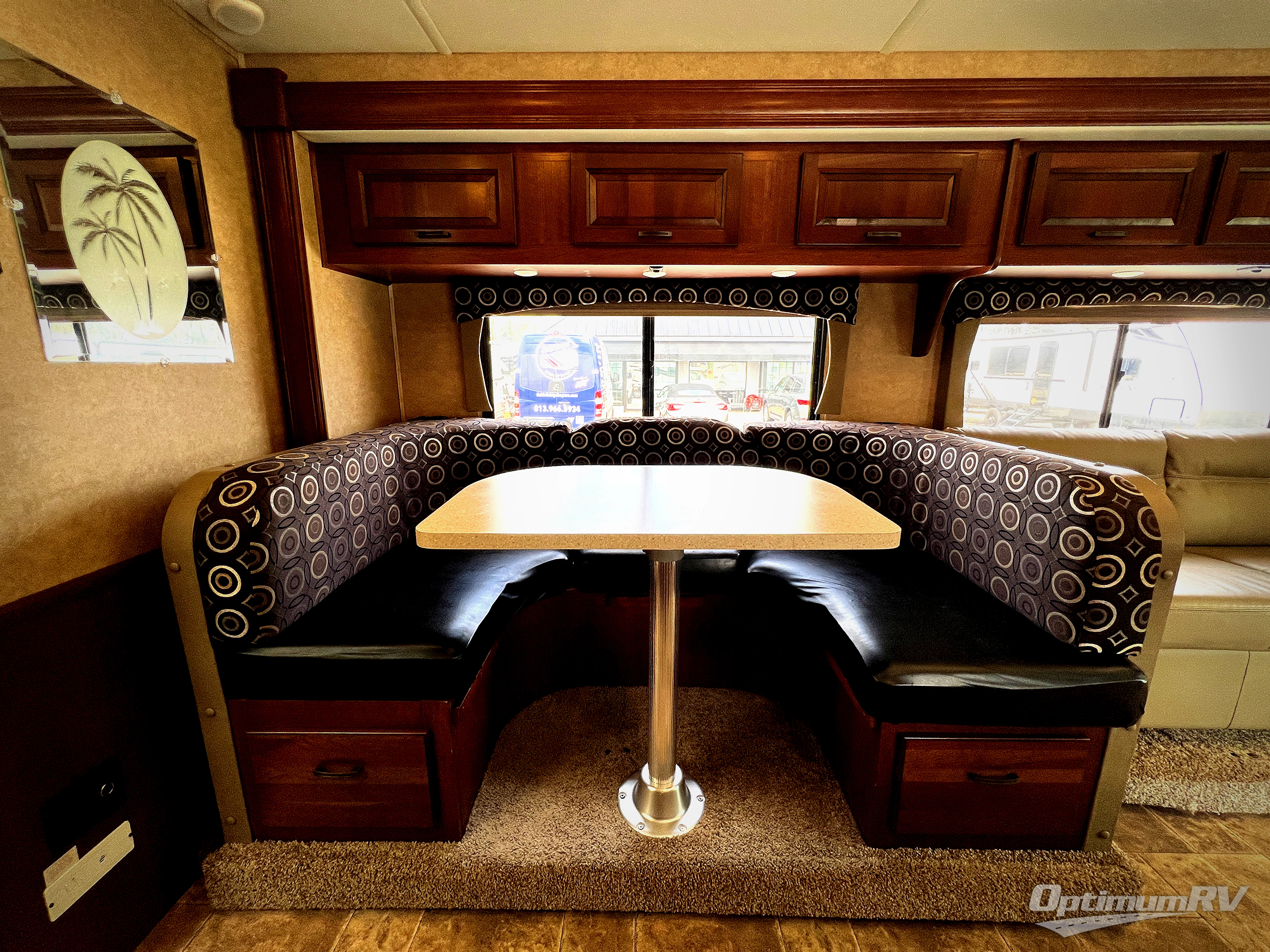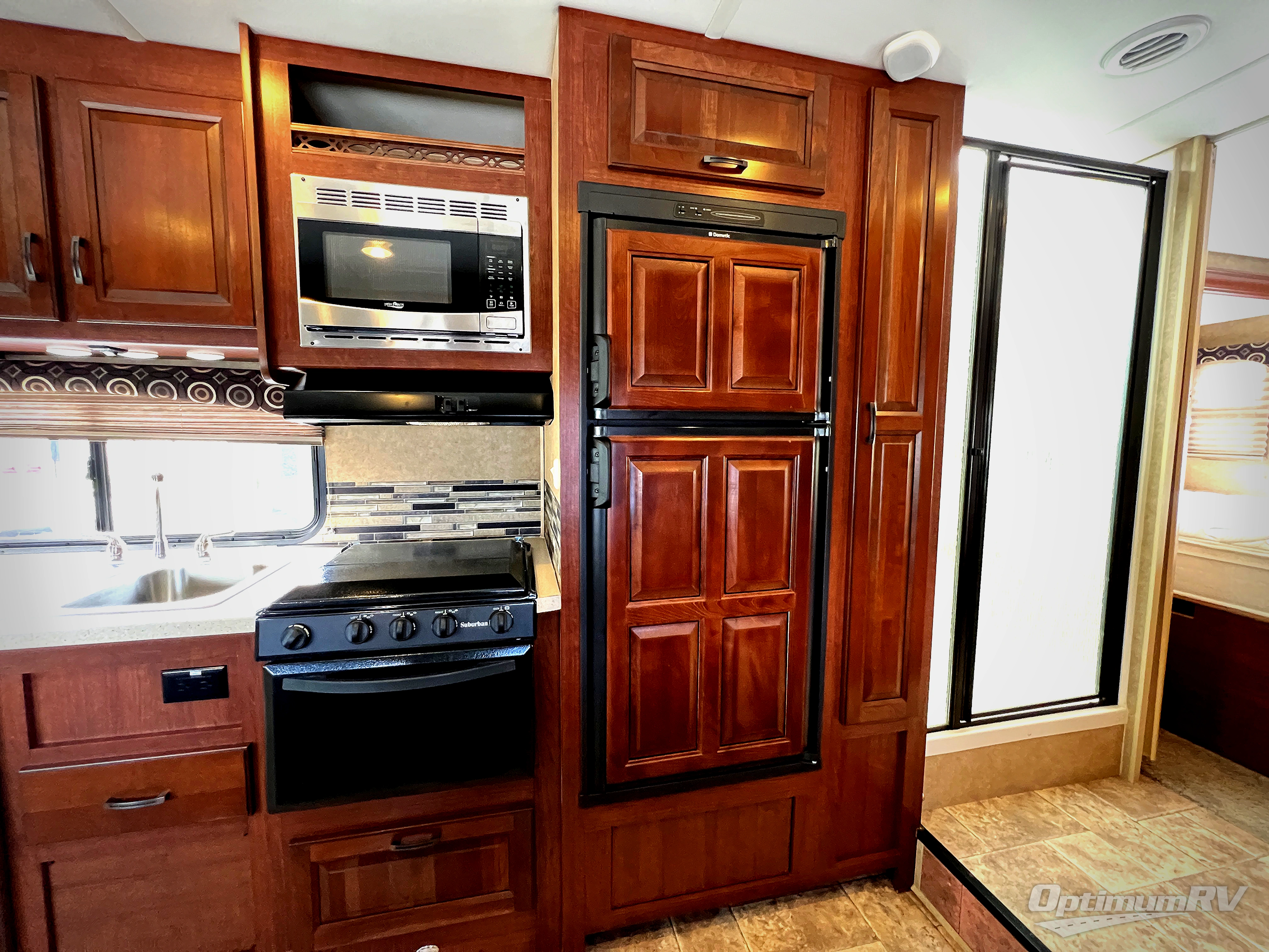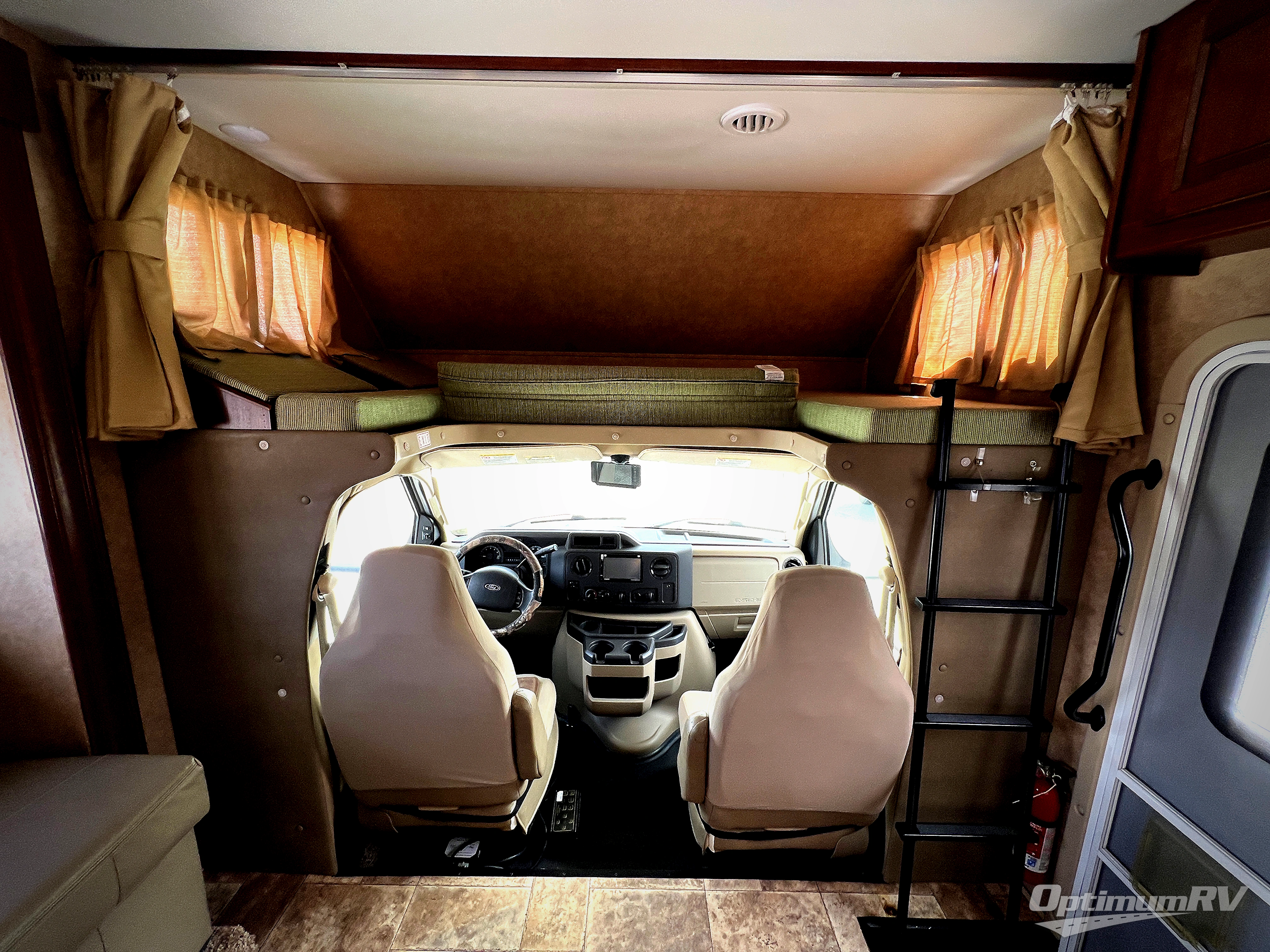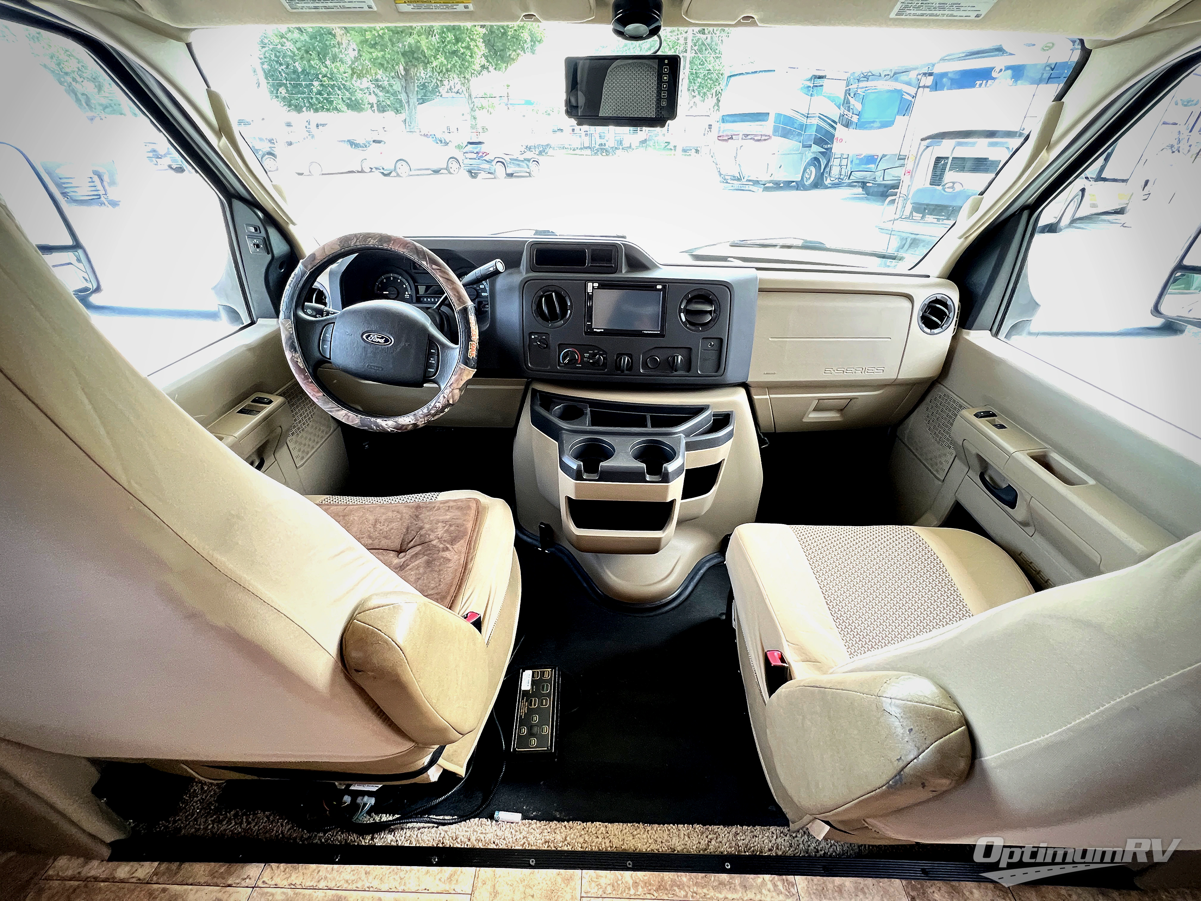 As you enter this class C motor home, to your left is the kitchen. It features a counter space with a flip down counter extension, overhead cabinets, double kitchen sink, three burner stove with overhead microwave, refrigerator and pantry.